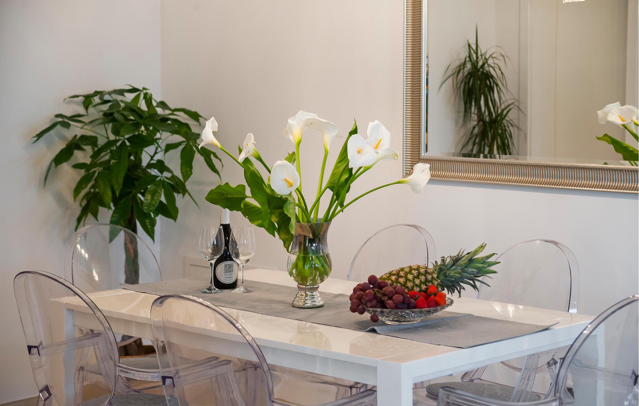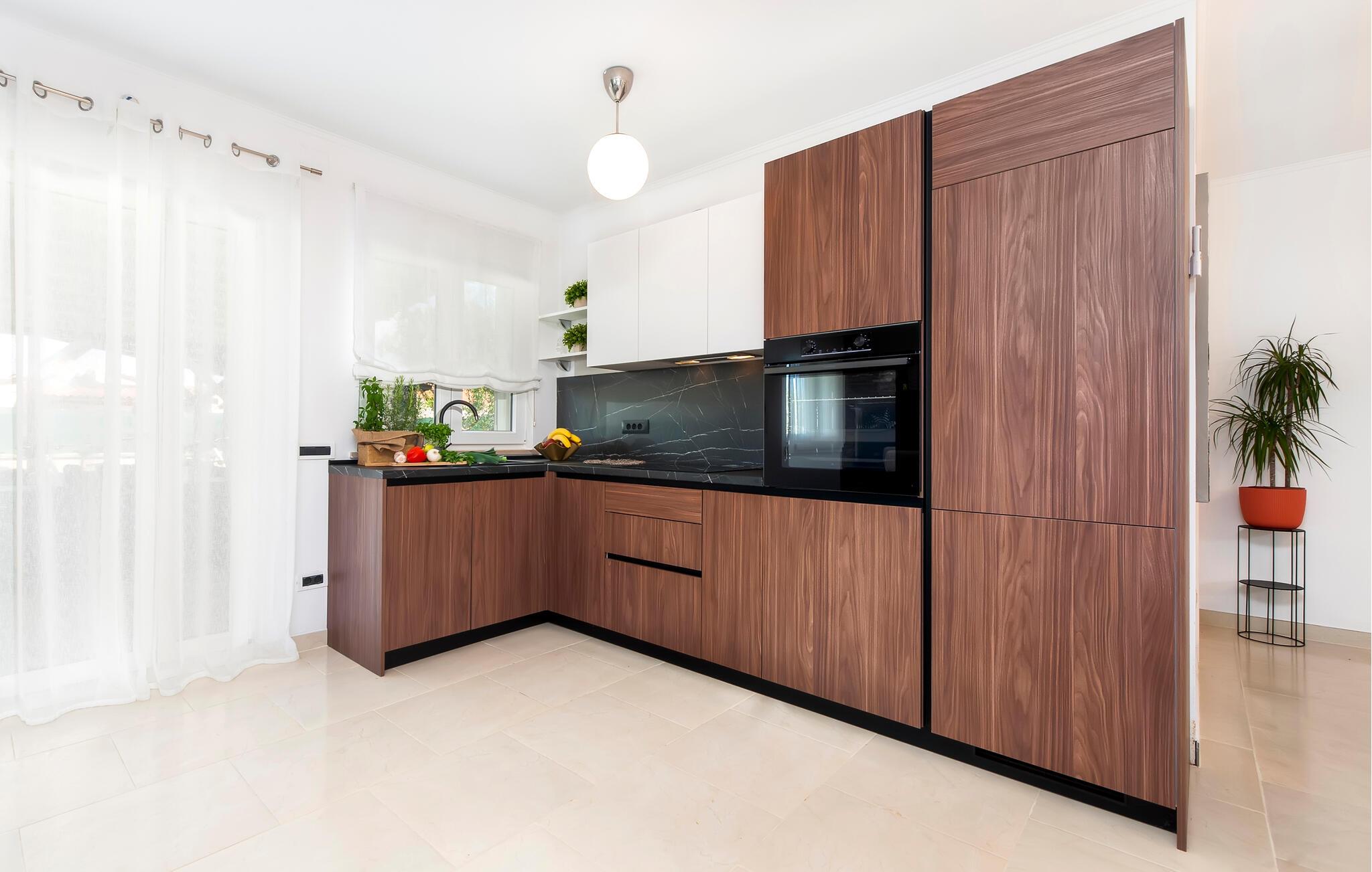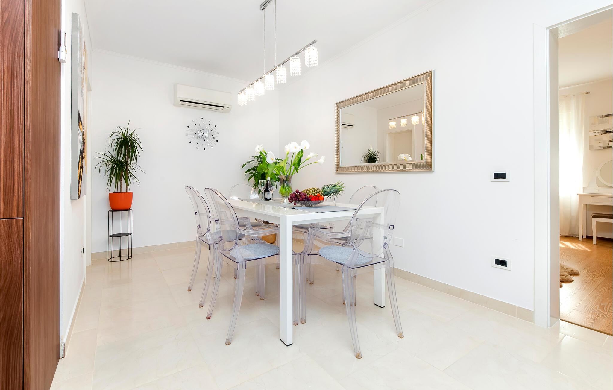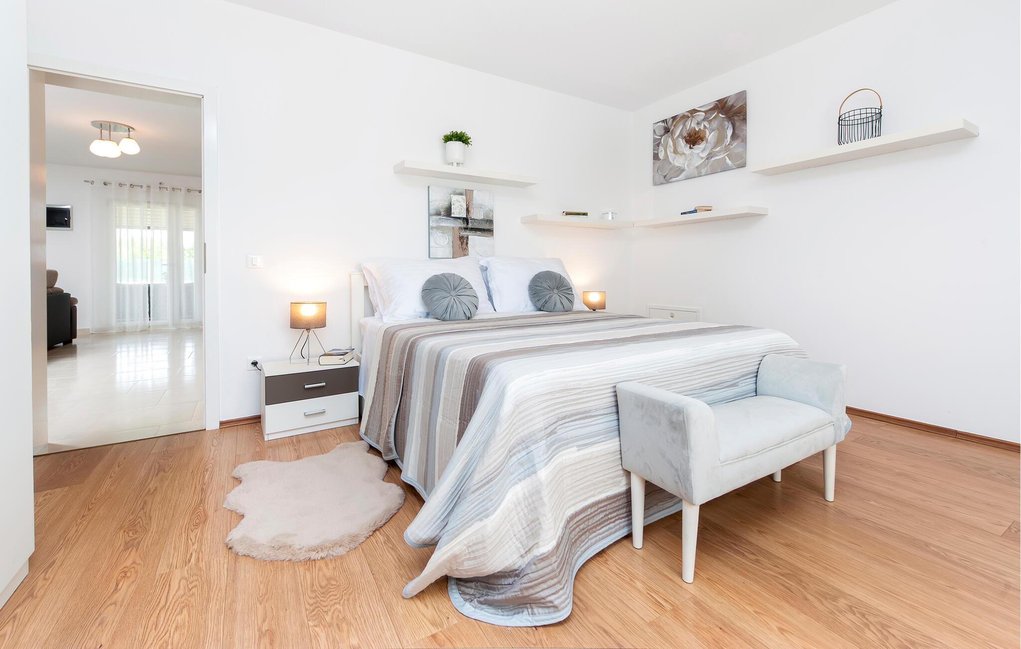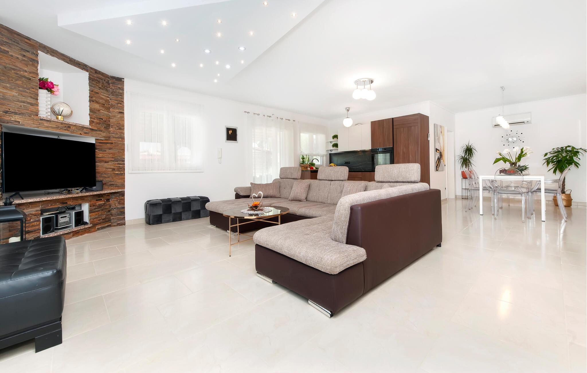 Komfort og elegance forenes harmonisk i dette rummelige hus. Diskrete farver, naturstenselementer og et interessant lysdesign skaber en atmosfære, der hurtigt vil få jer til at føle jer hjemme. Læn jer tilbage i den komfortable sofagruppe med en filmaften eller tilbered et frisk måltid i køkkenet. Det smager især lækkert med et glas fin kroatisk vin.