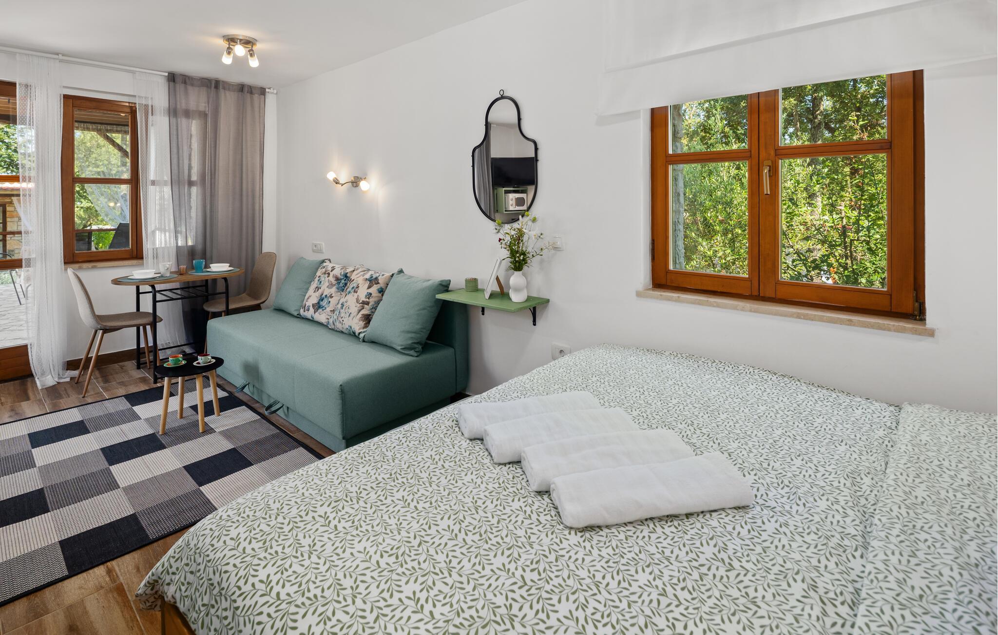 Dette komfortabelt møblerede stenhus byder jer velkommen som en del af et velholdt kompleks og lægger op til afslappende dage omgivet af naturen. Planlæg jeres aktiviteter for den kommende dag med en afslappet morgenmad, og afslut aftenen på den indbydende sofa, stream en film eller nyd et brætspil.