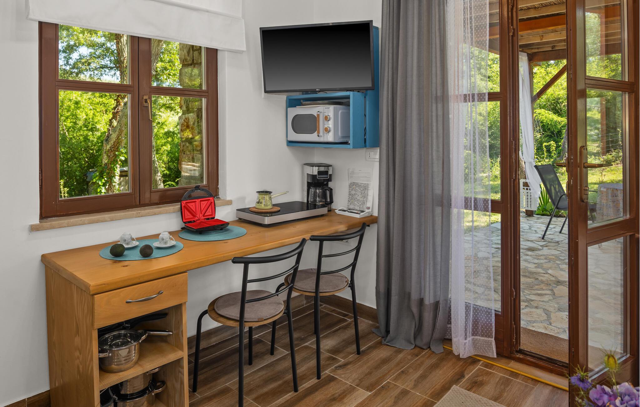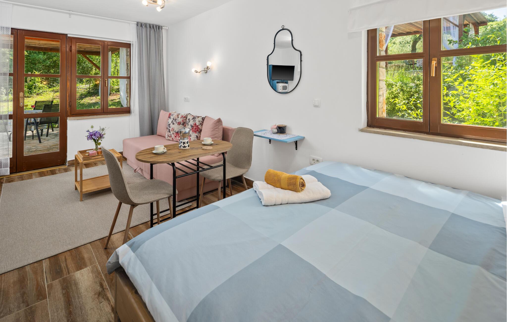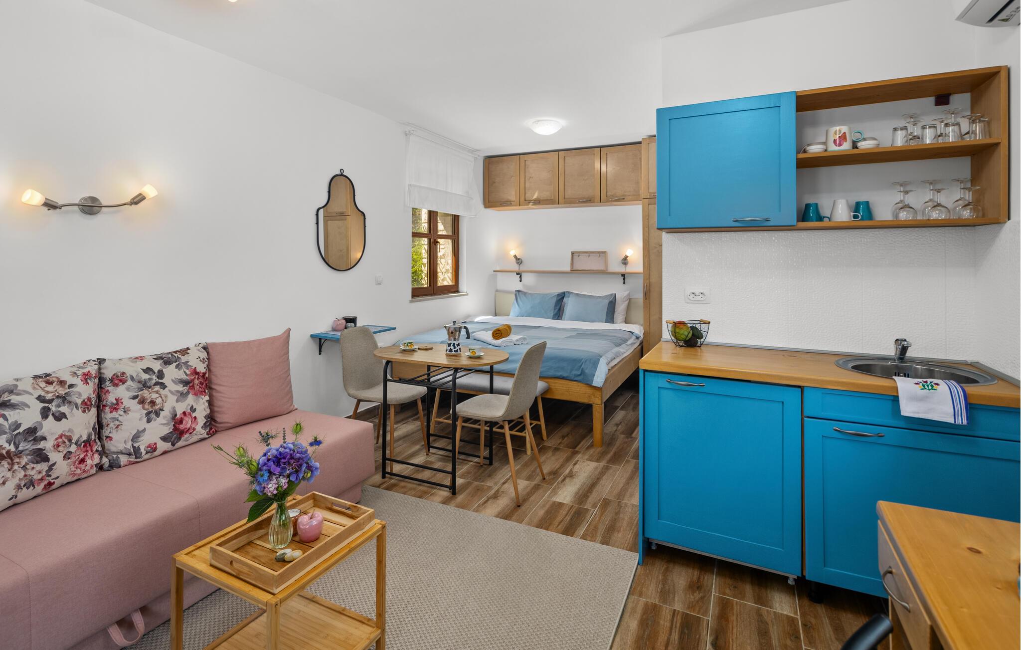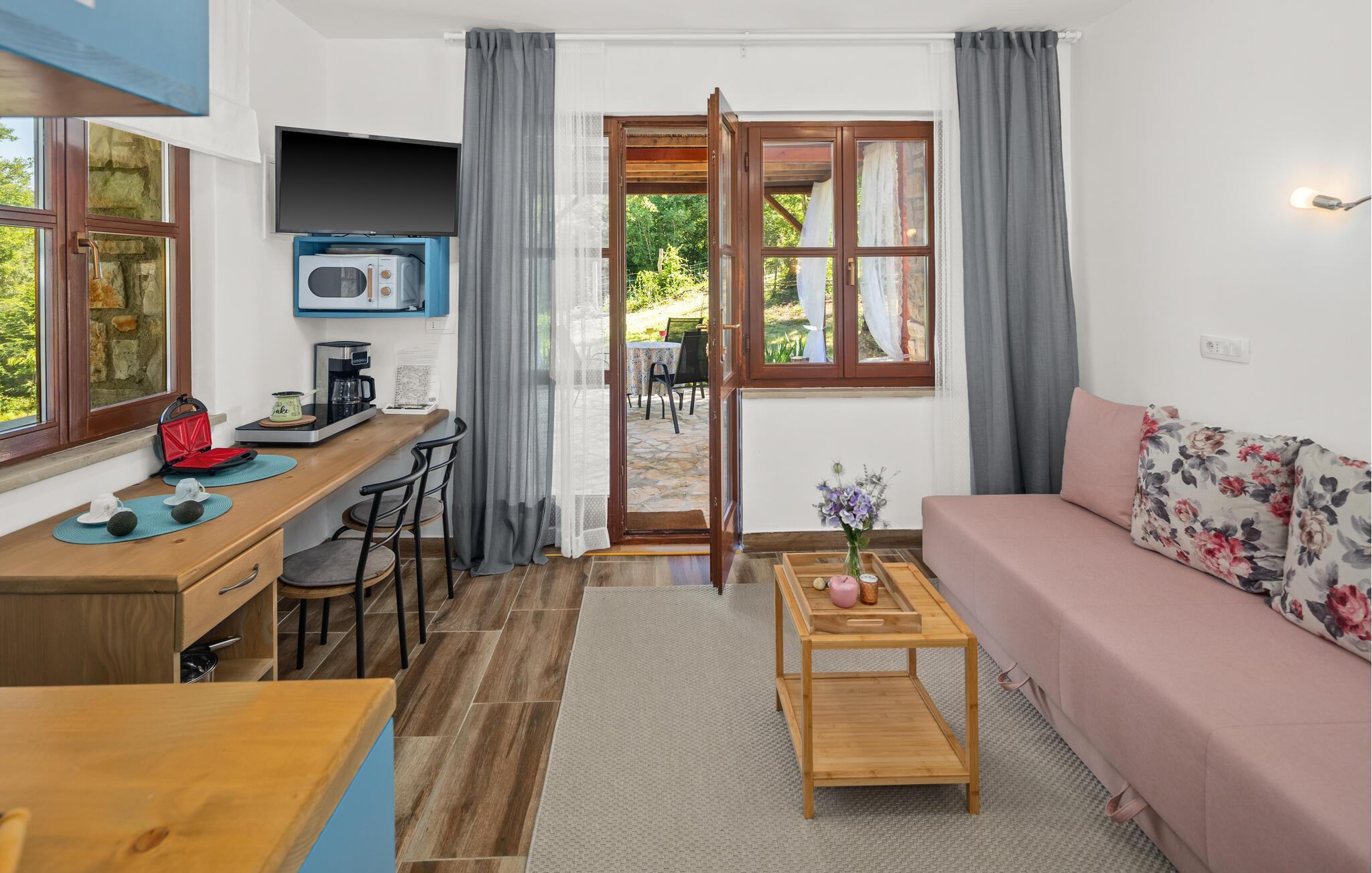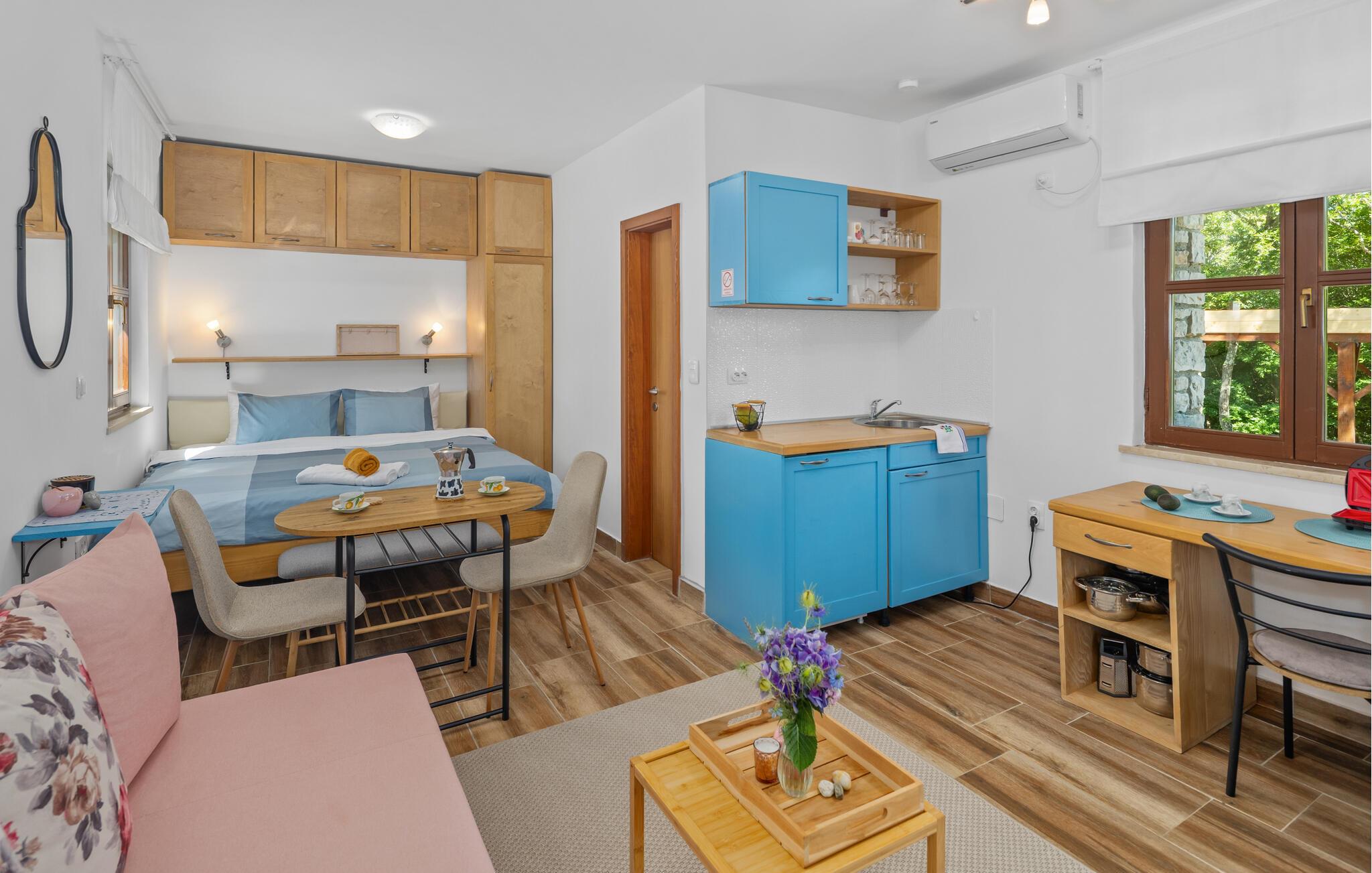 Dette smagfuldt og komfortabelt møblerede studie byder jer velkommen som en del af et velholdt kompleks og lægger op til en fredfyldt pause omgivet af natur. Planlæg jeres aktiviteter for den kommende dag over en afslappende morgenmad, og om aftenen kan I slå jer ned i den indbydende sofa for at streame en film eller tilbringe tid sammen med at spille et brætspil.