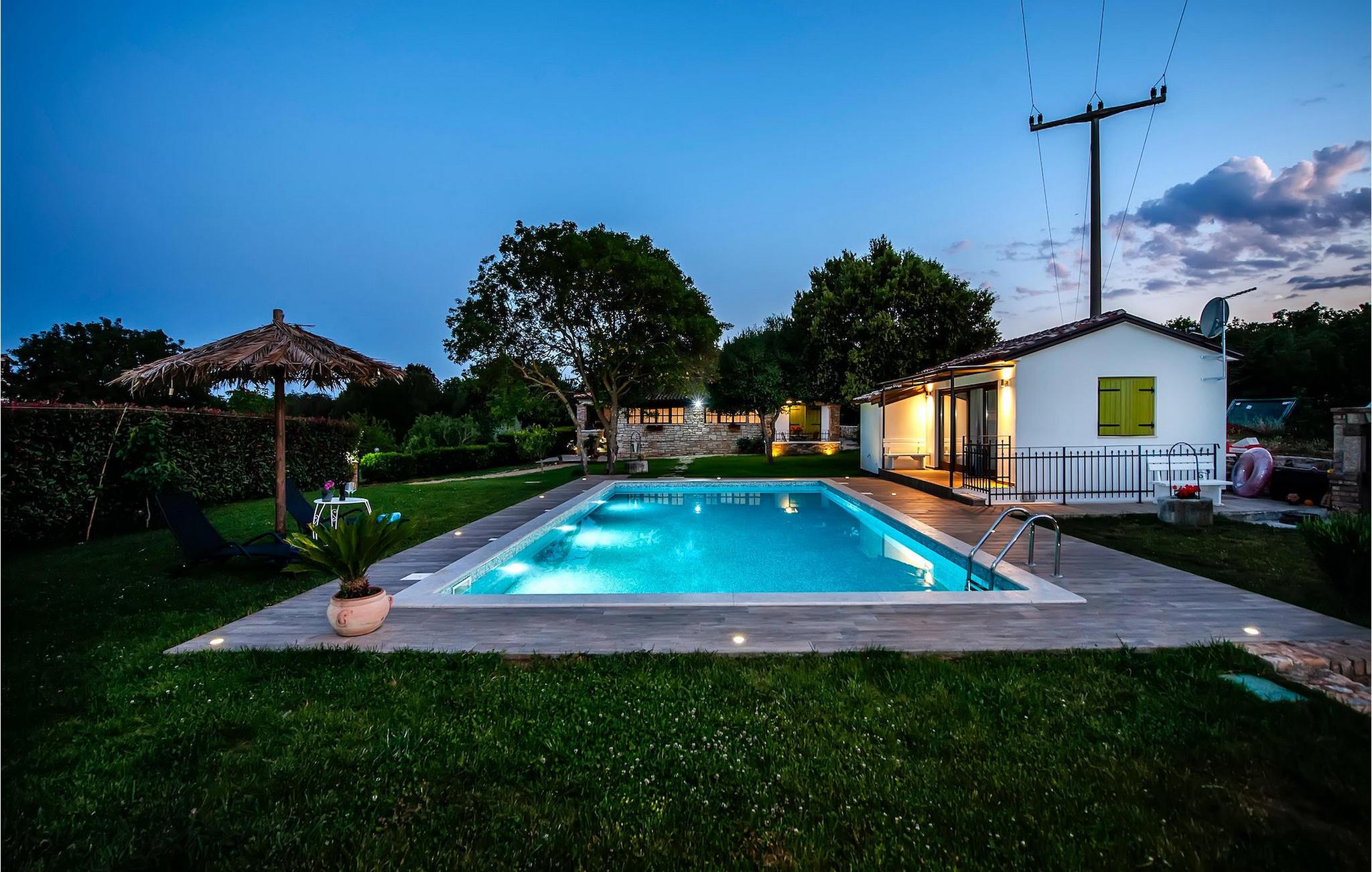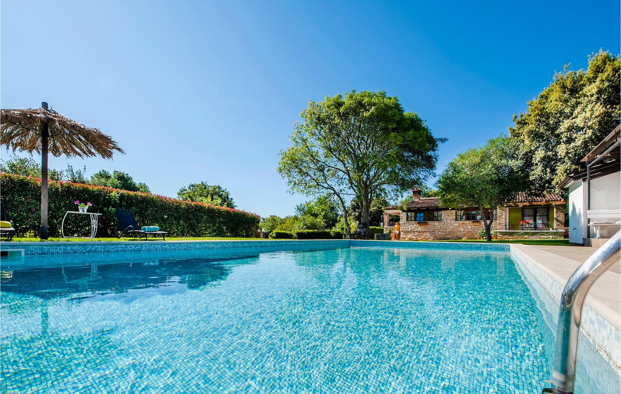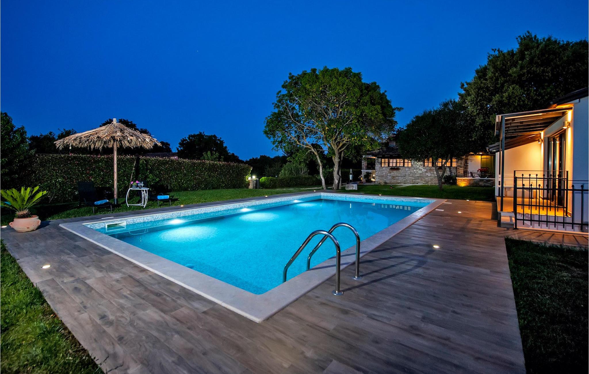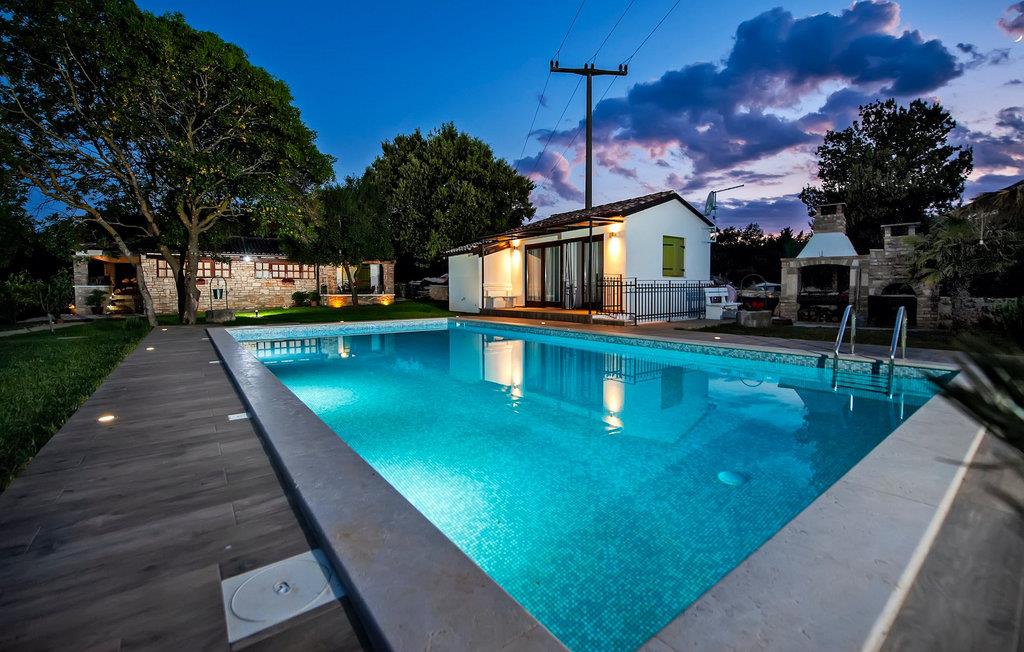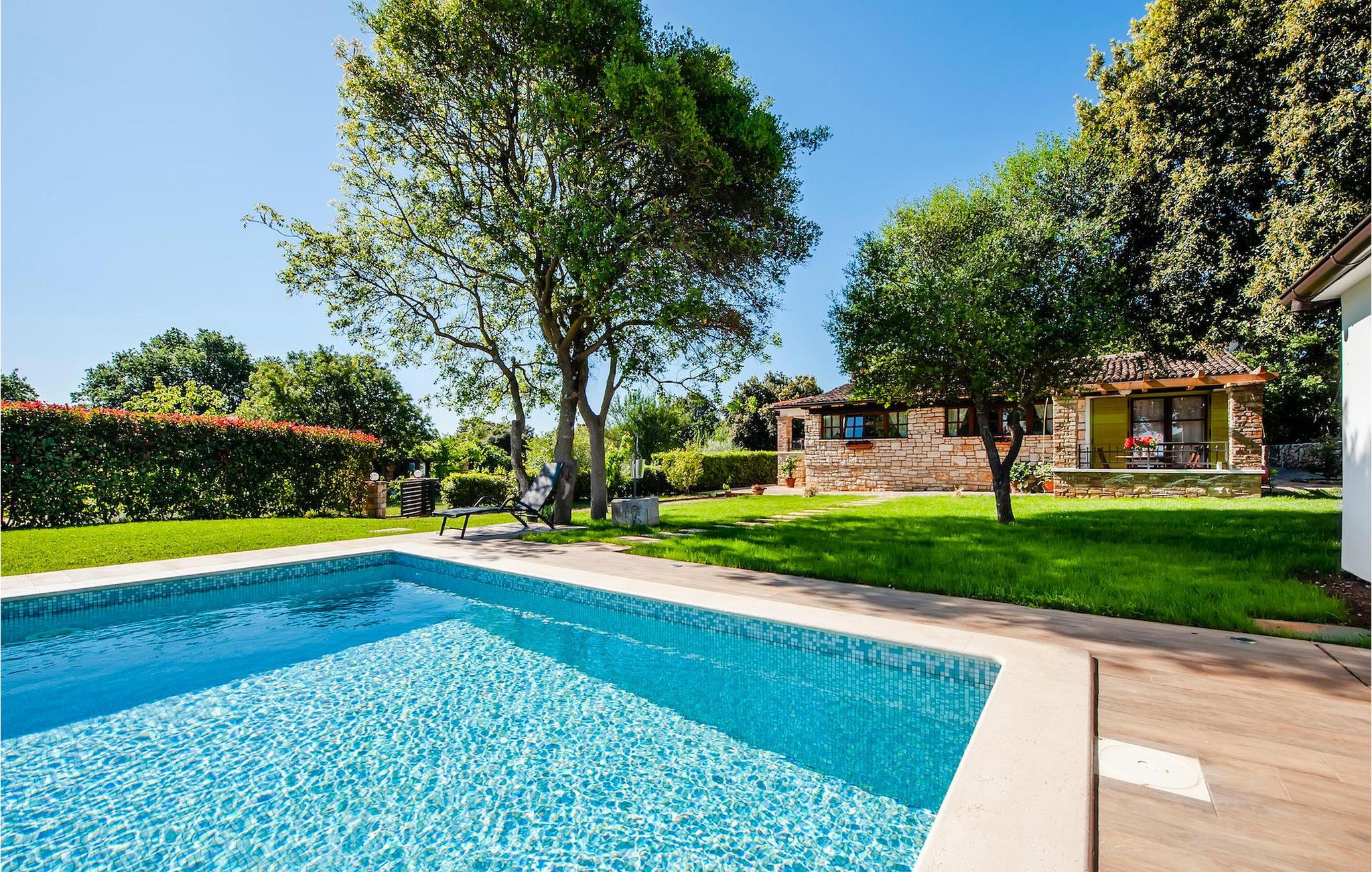 Smukke moderne Villa Antica er beliggende nær havet, i udkanten af den antikke by Rovinj. En af hendes mest fantastiske funktioner er en stor swimmingpool i haven. Den kan rumme op til syv gæster. Det består af to huse, hovedhuset og en studielejlighed. Hovedhuset har en åben stue og spisestue samt tre soveværelser. Et soveværelse har en dobbeltseng, og to soveværelser er udstyret med enkeltsenge. Det giver også et rummeligt badeværelse med badekar, hvor du nemt kan slappe af. Udenfor kan du slappe af med en kold drink på terrassen eller på liggestolene ved poolen, eller tage en svømmetur i en stor 72m2 pool. Du kan også fyre op i grillen til et godt måltid. Studielejligheden tilbyder lidt mere privatliv end hovedhuset. Den har en stue med en dobbeltseng, der kan rumme to gæster og et badeværelse med bruser. Book Villa Antica til din afslappende ferie!Villa Antica er beliggende i en forstad til den antikke by Rovinj, en af de smukkeste og mest romantiske byer i Kroatien. Det er kun få minutters gang fra Polari-stranden og få minutters kørsel fra byens centrum. I centrum kan du udforske det gamle netværk af stengader, der fører til toppen af bakken, hvor den smukke gamle kirke St. Euphemia ligger. Fra toppen af kirketårnet kan du nyde udsigten, der strækker sig over hele byen og ikke efterlader nogen ligeglade. Fra centrum kan du gå mod parkskoven Zlatni Rt, et af de smukkeste landskaber i det vestlige Istrien. Gå ikke glip af turen til Lim-kanalen, en af de mest attraktive naturressourcer i det vestlige Istrien, som ligger kun 15 kilometer uden for Rovinj.