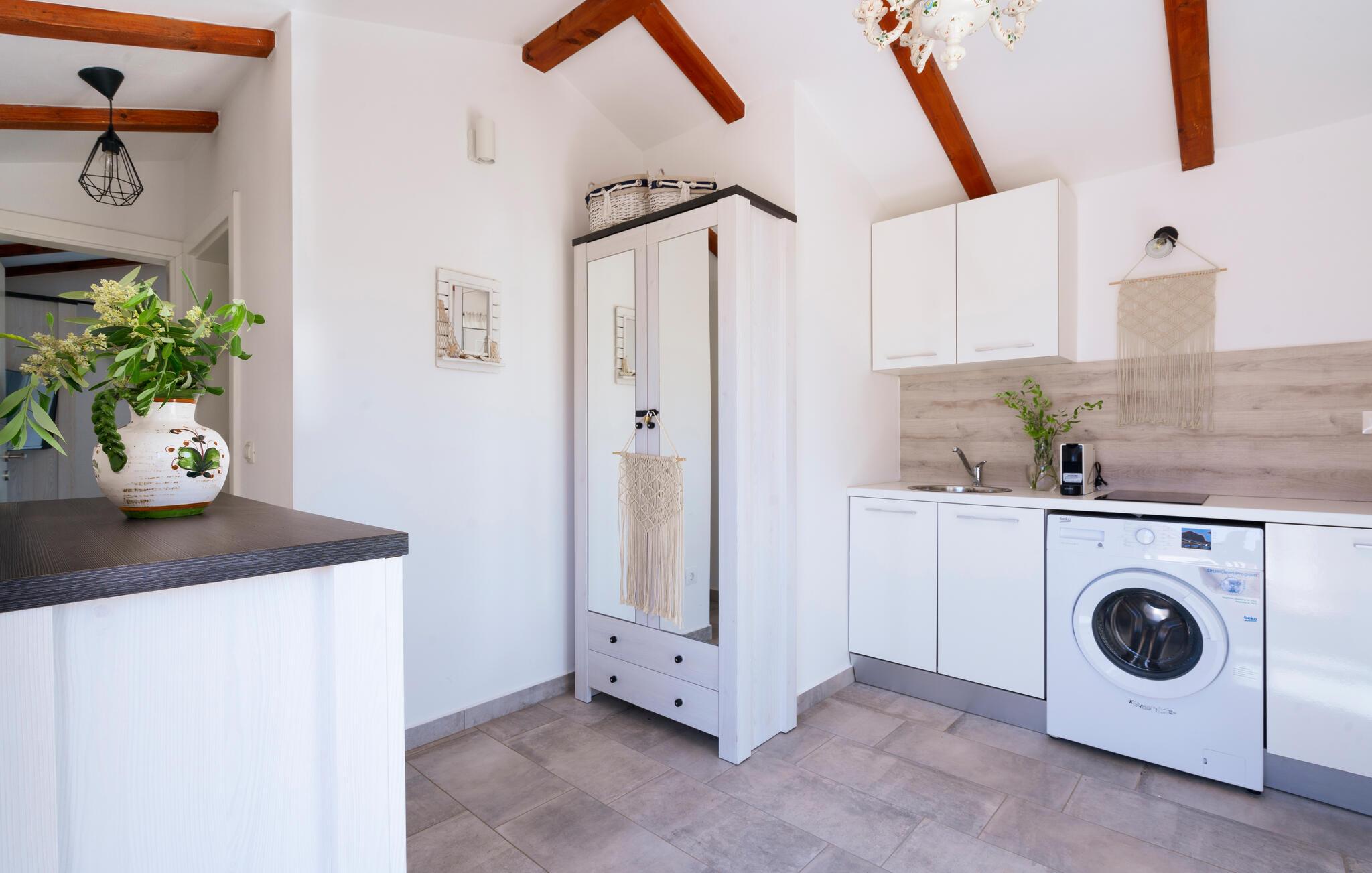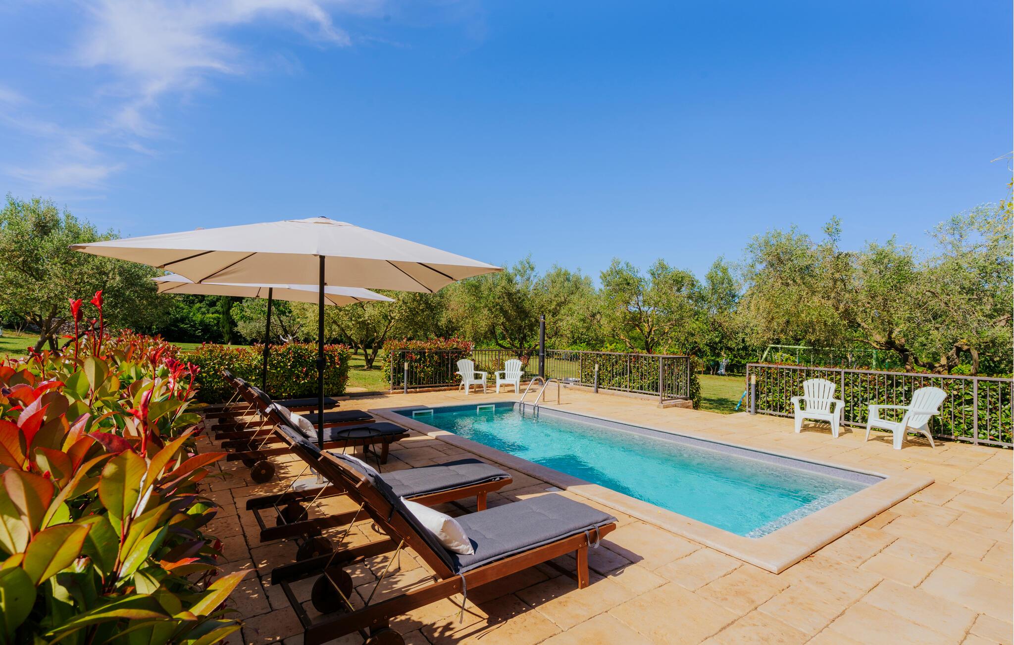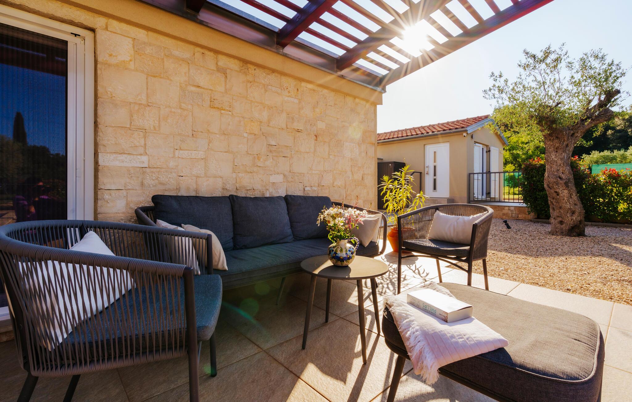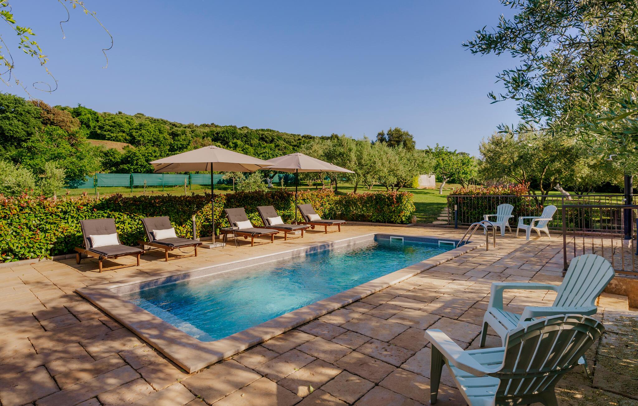 Beliggende i fredelige omgivelser i udkanten af byen Rovinj, har den dejlige Villa Bazilika alt hvad du behøver for en afslappende ferie! Omgivet af uspoleret natur og alligevel kun 1 kilometer væk fra den smukke Adriaterhavskyst, er denne villa en oase af ro nær turisthotspottet Rovinj. Villaens charmerende stenterrasse er domineret af en forfriskende privat pool. Omgivet af hyggelige liggestole og oliventræer vil poolen hurtigt blive dit yndlingssted. Her kan du undslippe sommervarmen og slappe af med en kold drink i hånden, mens børnene slipper dampen ud i den store trampolin. Start din dag med en kop kaffe på Villa Bazilikas dejlige terrasse eller nyd en spændende bog i den hyggelige hængestol. Med i alt to smagfuldt indrettede soveværelser kan Villa Bazilika rumme op til fire personer. Det er det perfekte valg for en familie eller en mindre gruppe venner. Soveværelserne deler et badeværelse. Franske døre bringer rigeligt lys ind i den hyggelige stue, som er det perfekte sted at tilbringe eftermiddagen sammen med din kæreste. Stuen er forbundet med et fuldt udstyret køkken og spiseplads. Book Villa Bazilika og nyd din ferie omfavnet af den istriske sol og oliventræer!Villa Bazilika er beliggende i det maleriske bagland af byen Rovinj, kun en kilometer væk fra det krystalklare blå Adriaterhav. Beliggende i fredelige naturlige omgivelser tilbyder denne villa dig et perfekt tilflugtssted fra hverdagens stress og jag. Byen Rovinj, i dag en af de mest attraktive turistmål i Kroatien, var engang kun en lille fiskerlandsby. Rovinj er berømt for sit yderst gunstige mikroklima. De første "turister" kom til denne by for behandling og rehabilitering. Den gamle bydel er domineret af St. Euphemia-kirken, som anses for at være en af de smukkeste barokbygninger i Istrien. Fra dets tårn kan du nyde en smuk panoramaudsigt over byen og det åbne hav med talrige holme. Gå vild i Rovinjs charmerende smalle gader, mens du udforsker dens rige kulturarv og gastronomiske tilbud. Vi anbefaler alle fans af fritidsaktiviteter ved havet at prøve dykning, snorkling, kajaksejlads, windsurfing eller bare nyde en bådtur rundt om øerne.