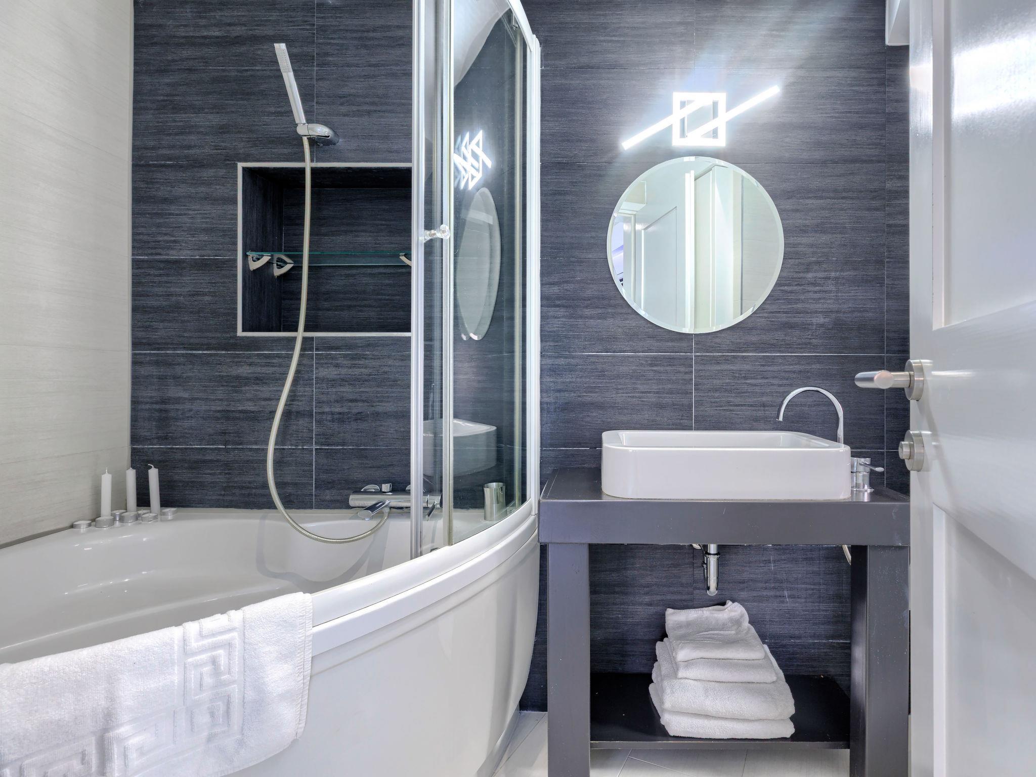 "Ambient", 2-room apartment 45 m2 on 1st floor. Bright, modern and tasteful furnishings: living/dining room with 1 double sofabed (160 cm, length 200 cm), cable TV and air conditioning. 1 room with 1 french bed (160 cm, length 200 cm), cable TV. Open kitchen (dishwasher, 2 ceramic glass hob hotplates, toaster, kettle, microwave, electric coffee machine). Bath/WC with corner bath. Forced-air heating. Facilities: washing machine, safe, iron, hair dryer. Internet (WiFi, free). 1 small pet/ dog allowed.