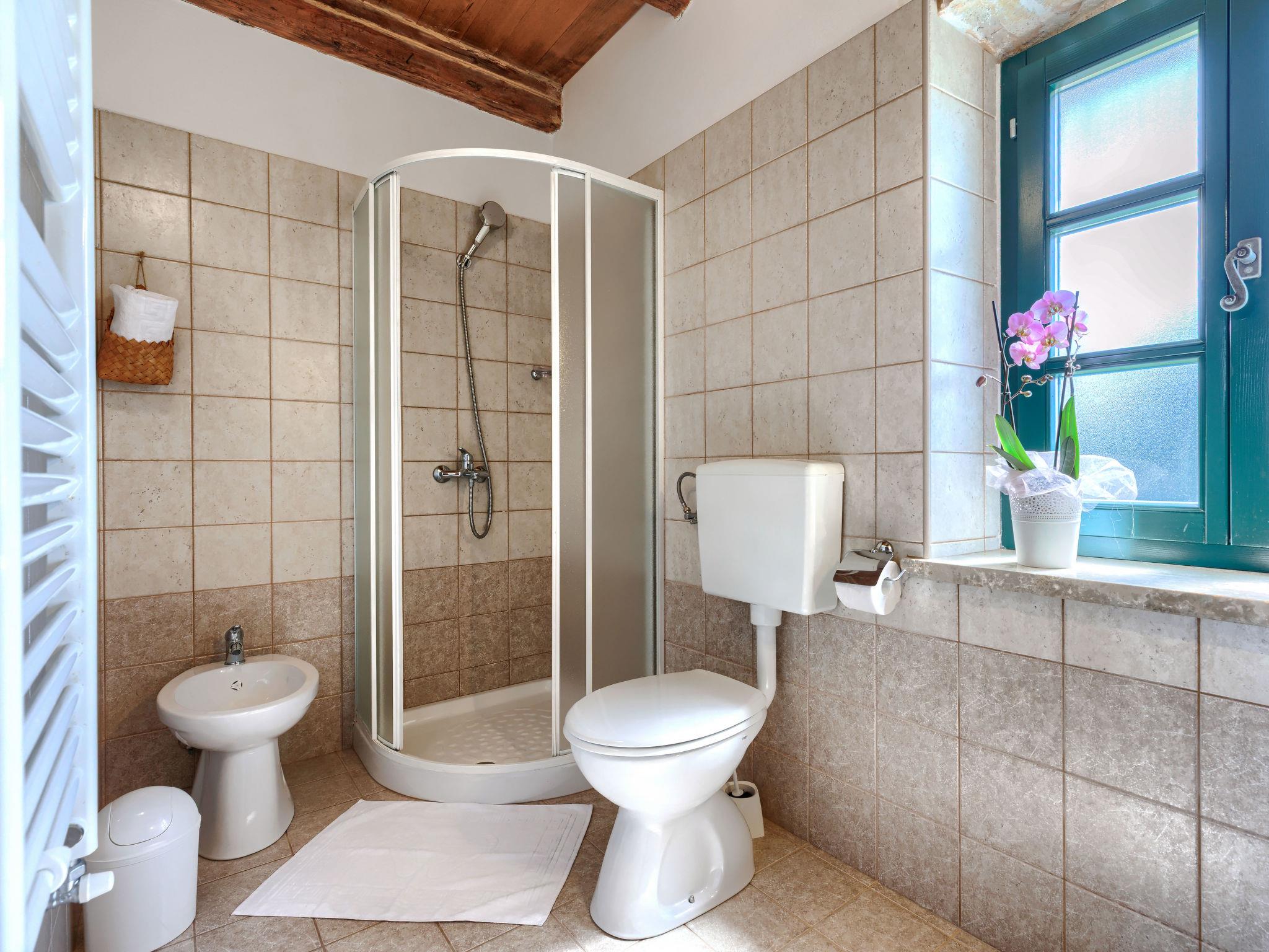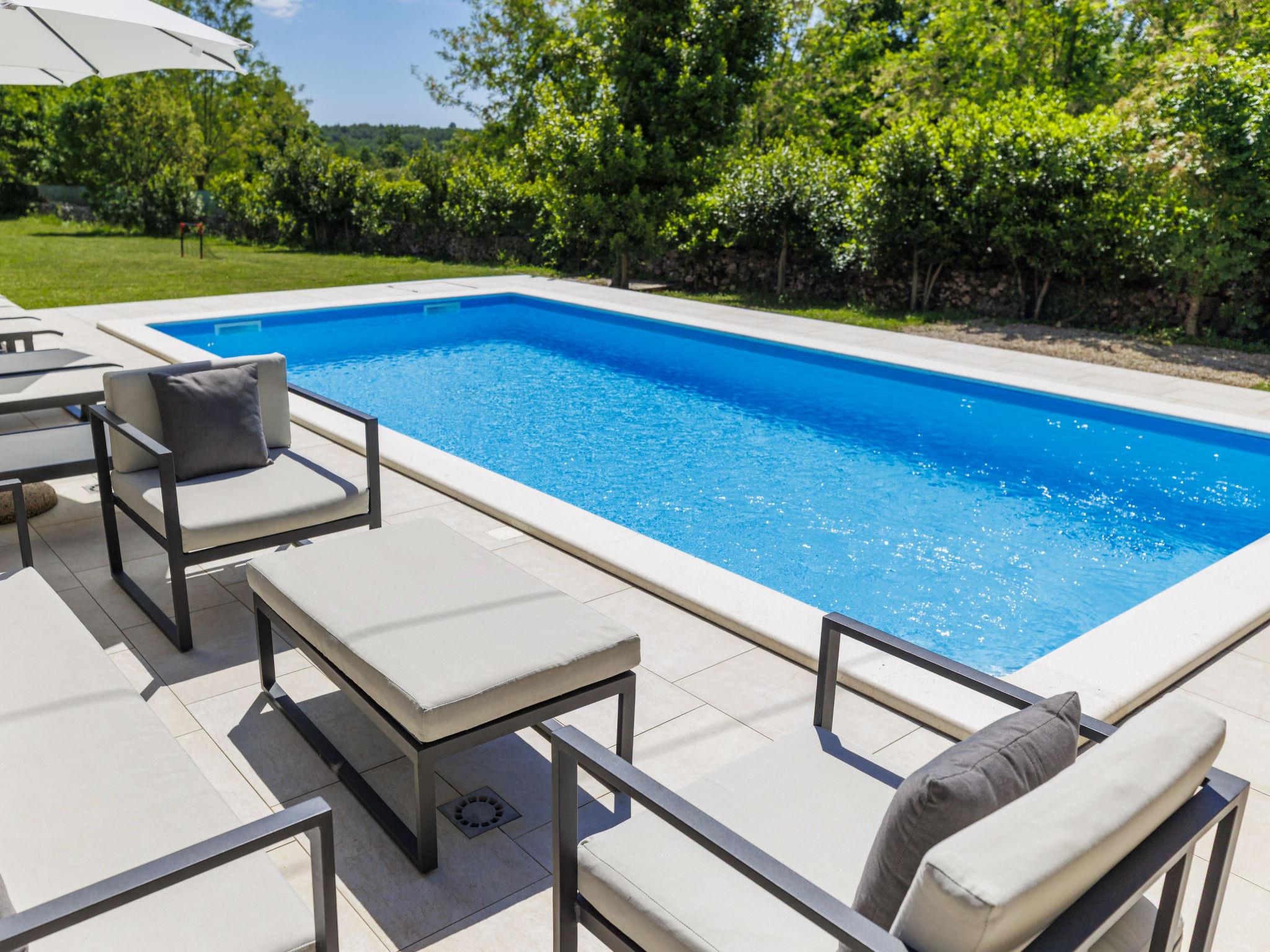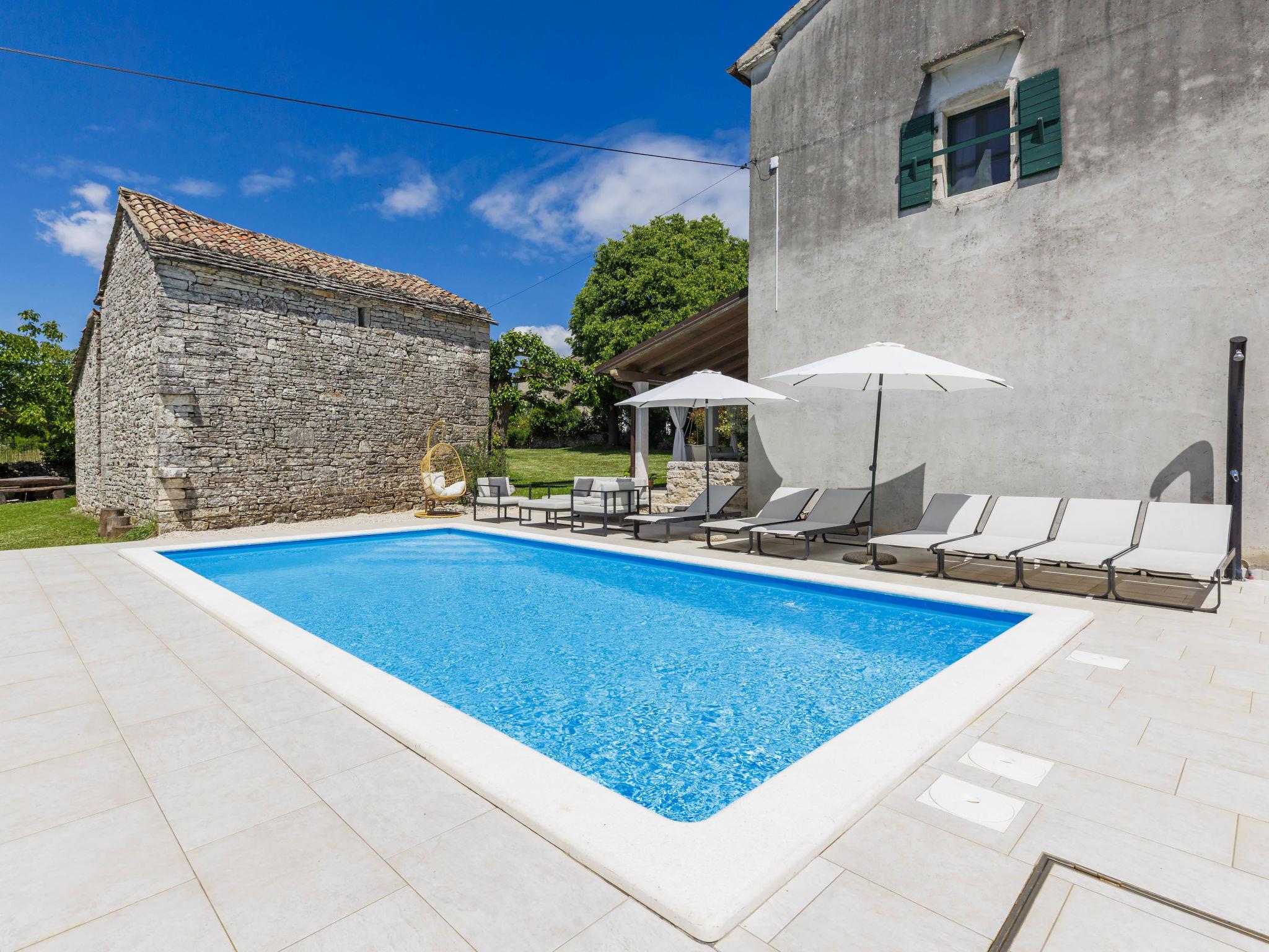 Single-family house "Marija", 3 storeys. In the hamlet Domijanici 5 km from the centre of Žminj, 25 km from the centre of Rovinj, 25 km from the sea. Private: property 5'000 m2, trees, meadow, swimming pool angular (8 x 4 m, depth 140 cm, seasonal availability: 30.Apr. - 01.Oct.) with internal staircase. Outdoor shower, table tennis, garden furniture, barbecue (swing). In the house: internet access, washing machine. Parking (for 5 cars) on the premises. Shop 5 km, restaurant 5 km, bus stop 3.1 km, rocky beach 25 km.