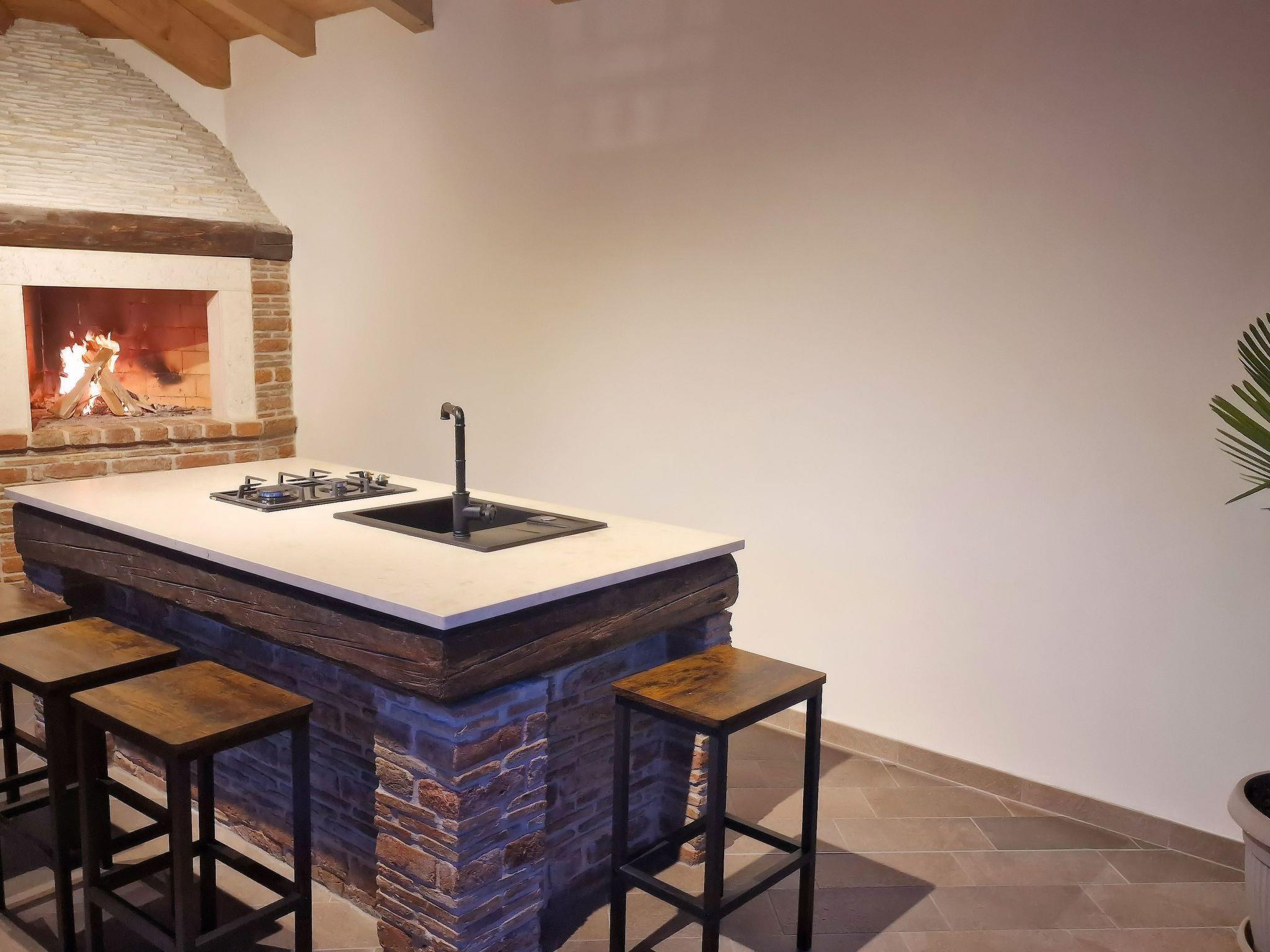 Step outside to discover your personal oasis. The villa features an 8.5-meter long swimming pool for your exclusive enjoyment, complemented by a charming outdoor kitchen with a fireplace, perfect for al fresco dining and entertainment. The garden, reserved solely for your use, spreads around the house offering a generous space for relaxation and outdoor activities. A private parking area ensures ease and security for your vehicle during your stay.