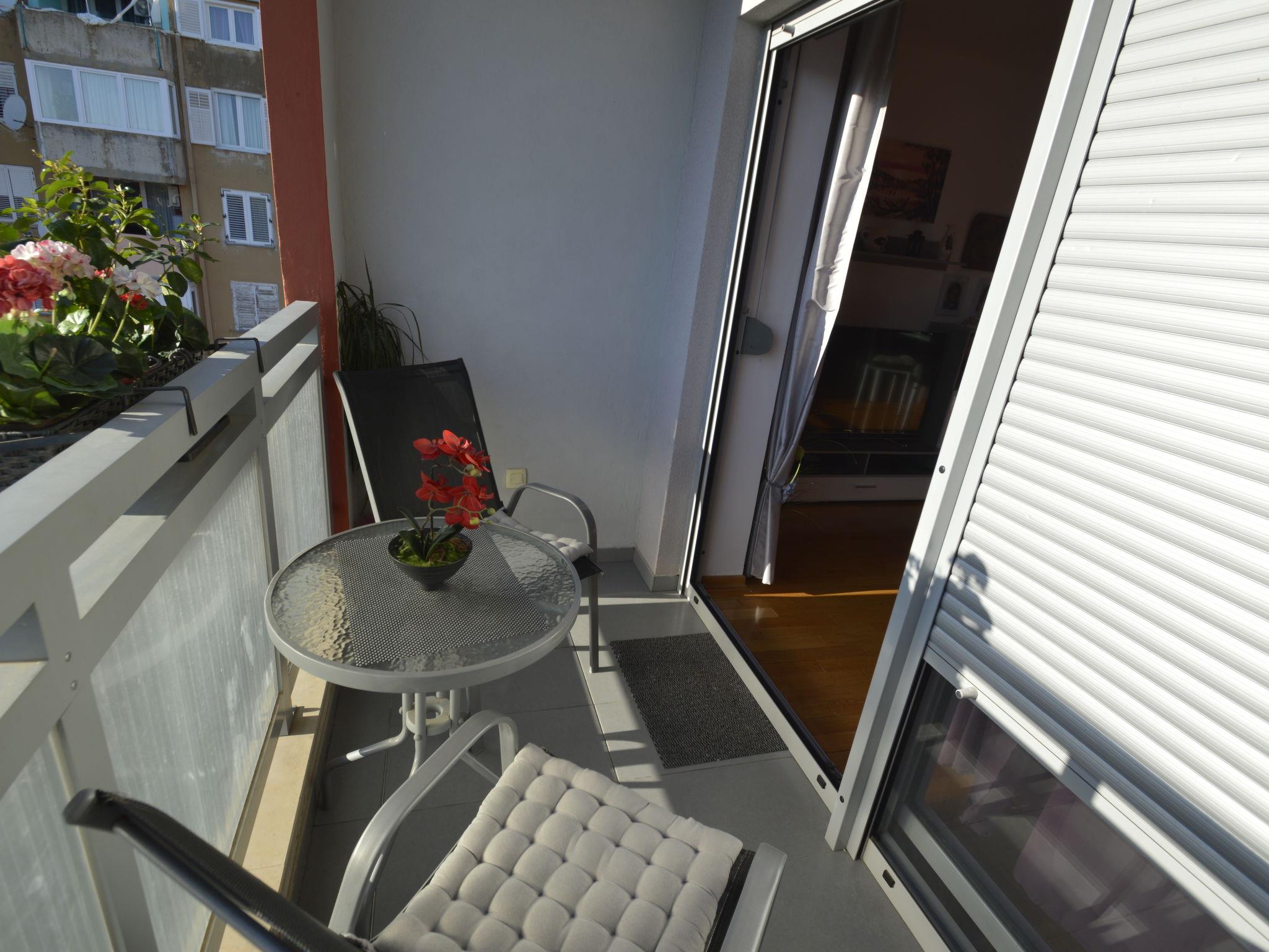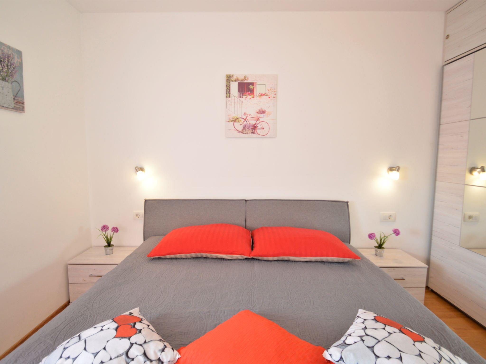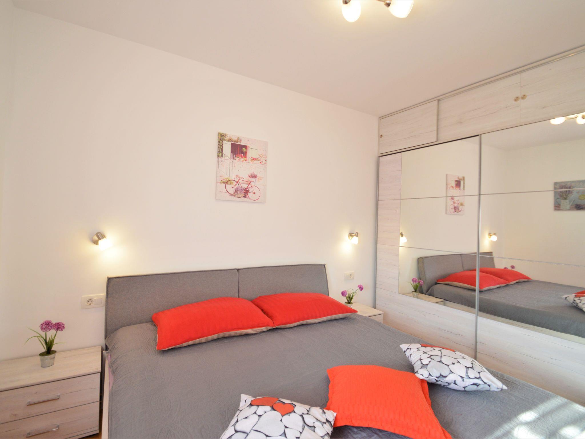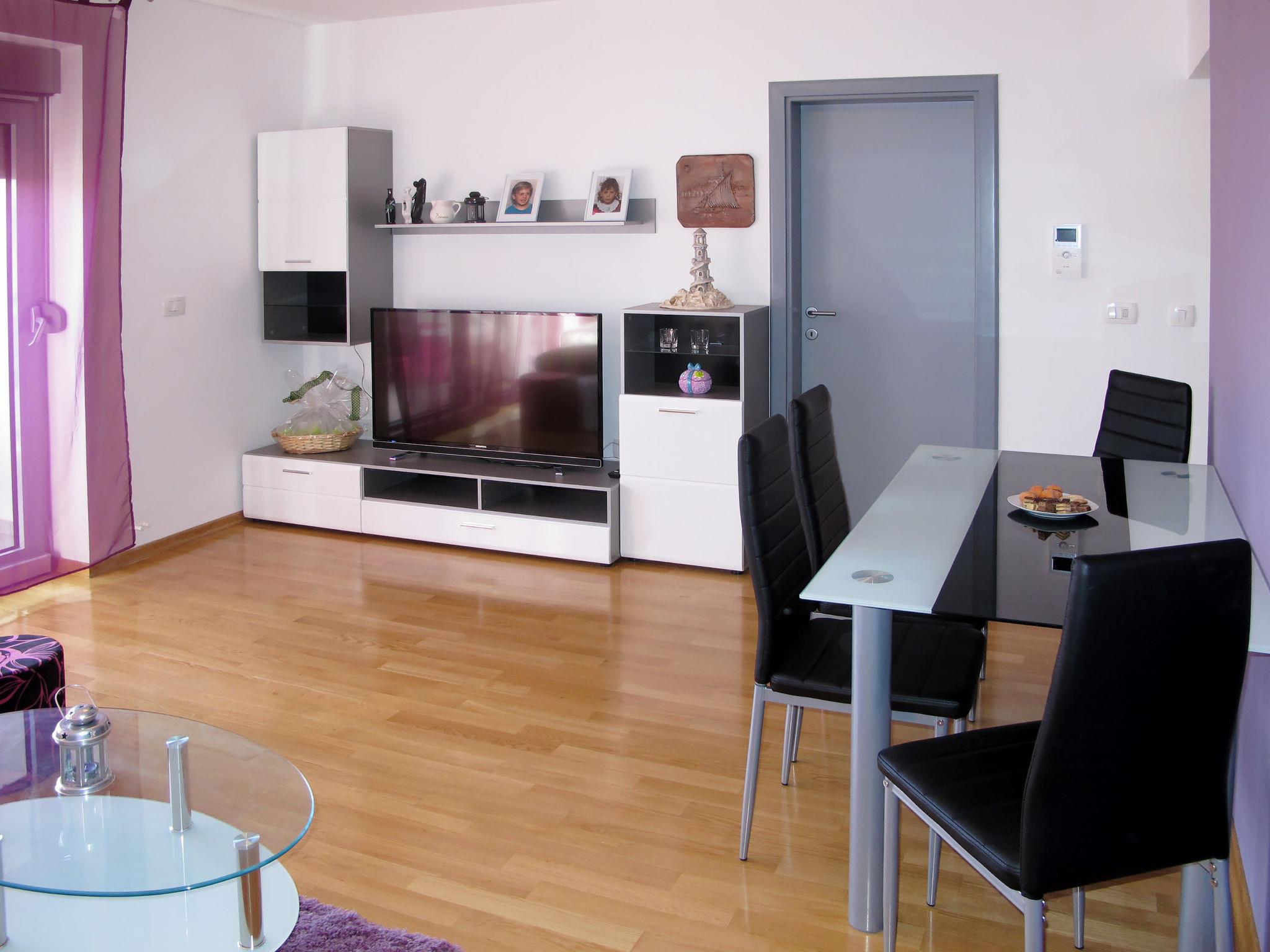 "Pinezic", 2-room apartment 45 m2 on 3rd floor. Living/dining room with 1 double sofabed (135 cm, length 200 cm), satellite TV and air conditioning. Exit to the balcony. 1 room with 1 double bed and air conditioning. Open kitchen (oven, dishwasher, 4 ceramic glass hob hotplates, toaster, kettle, microwave, freezer, electric coffee machine). Shower/WC. No heating option. Balcony 3 m2. Balcony furniture. Facilities: washing machine, iron. Internet (WiFi, free). Please note: non-smoking house.