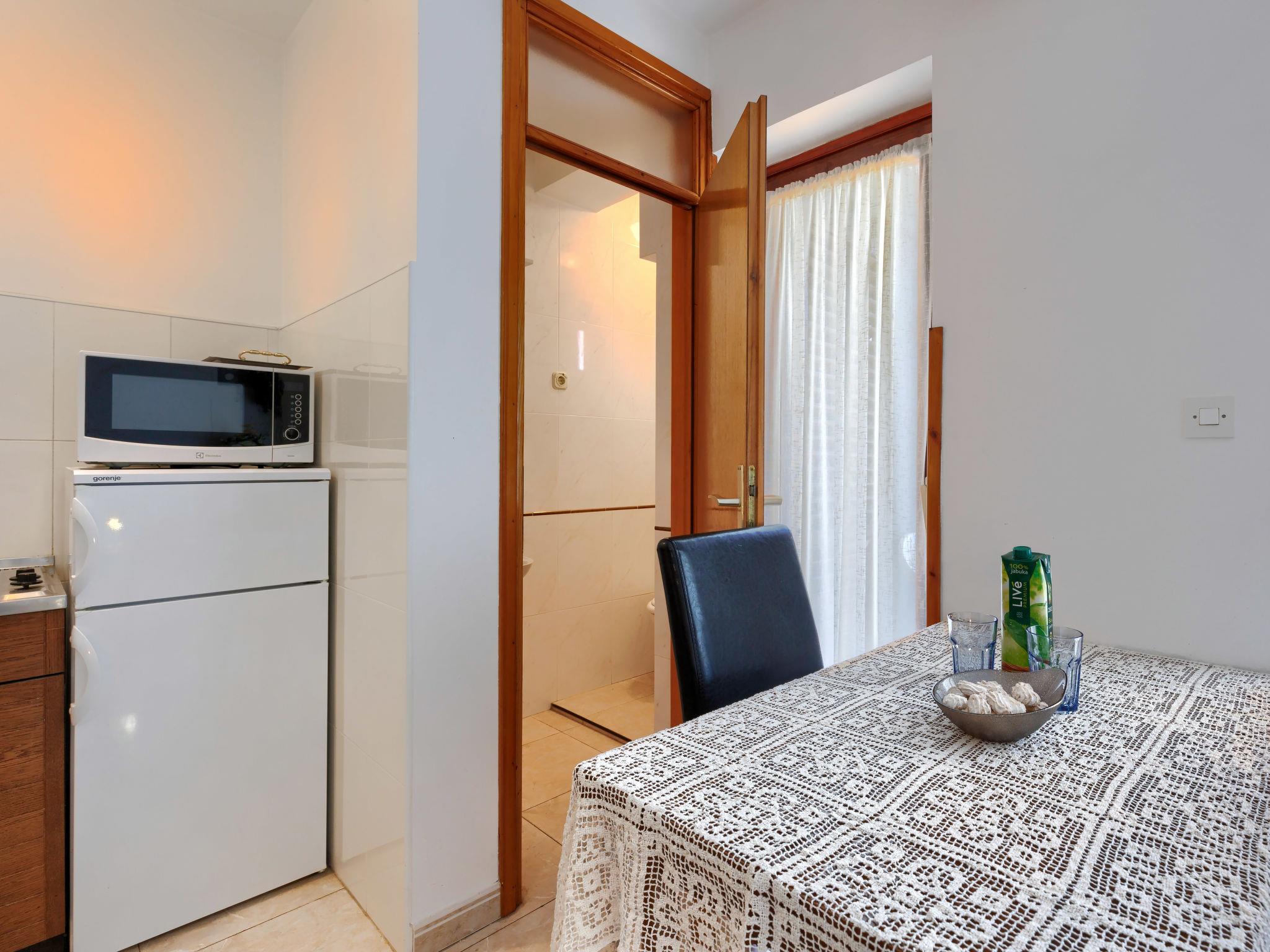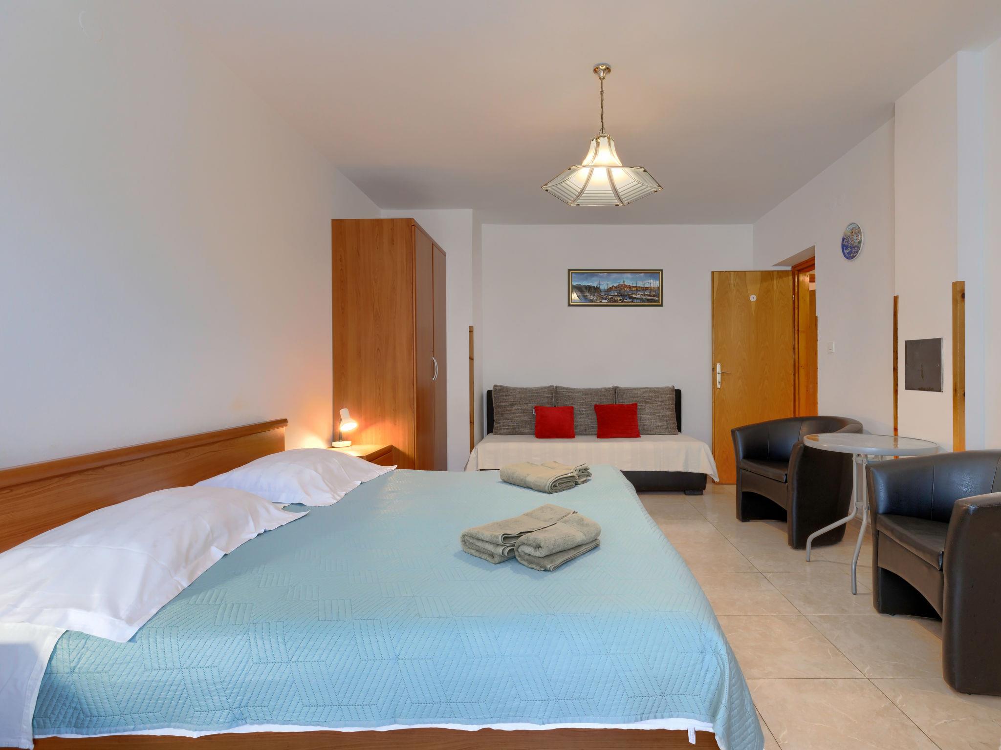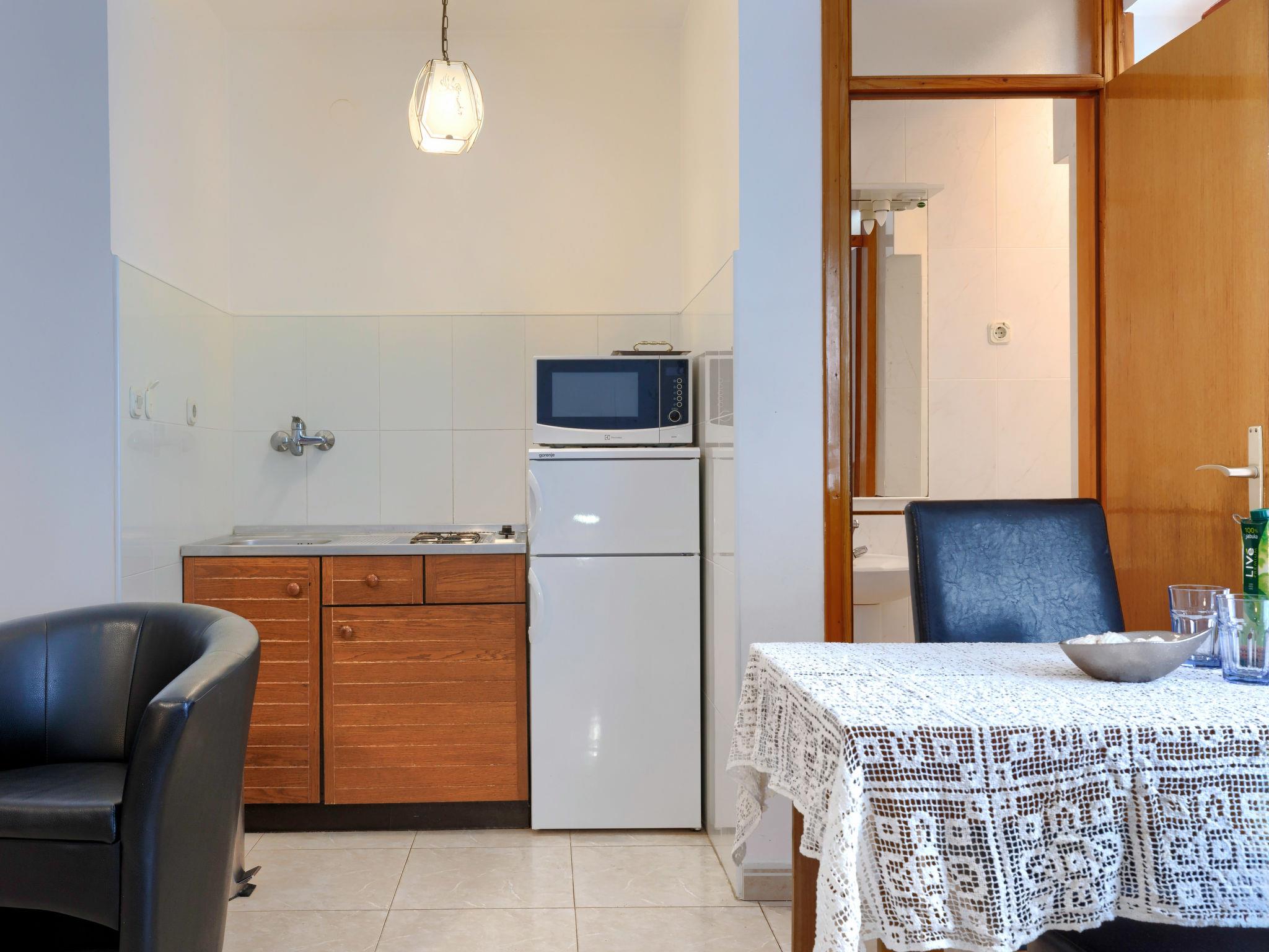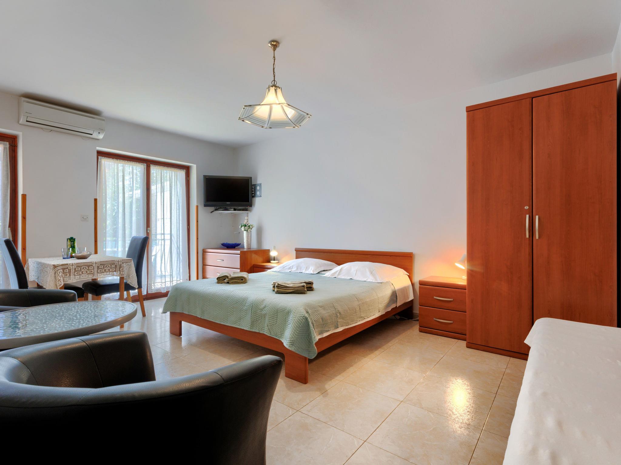 "Alba", 1-room apartment 33 m2 on 1st floor. Studio with 1 sofabed, 1 double bed, satellite TV and air conditioning. Exit to the balcony. Open kitchen (2 hot plates, microwave, electric coffee machine) with dining table. Shower/WC. Air-conditioning, forced-air heating. Balcony 6 m2. Balcony furniture. Facilities: Internet (WiFi, free). Please note: non-smoking house.