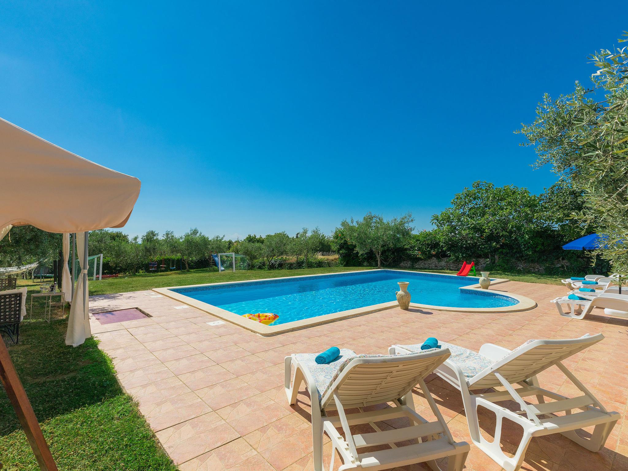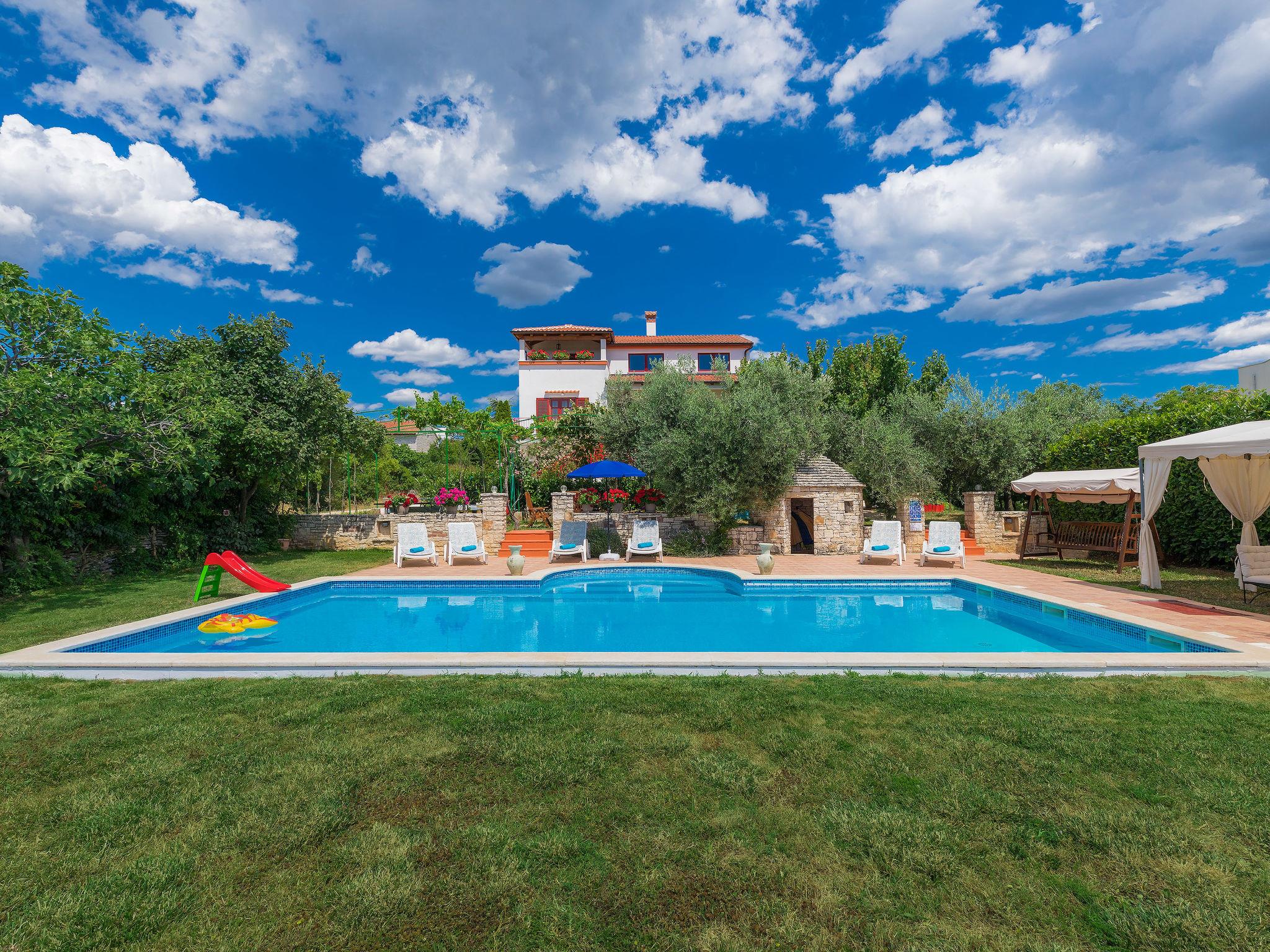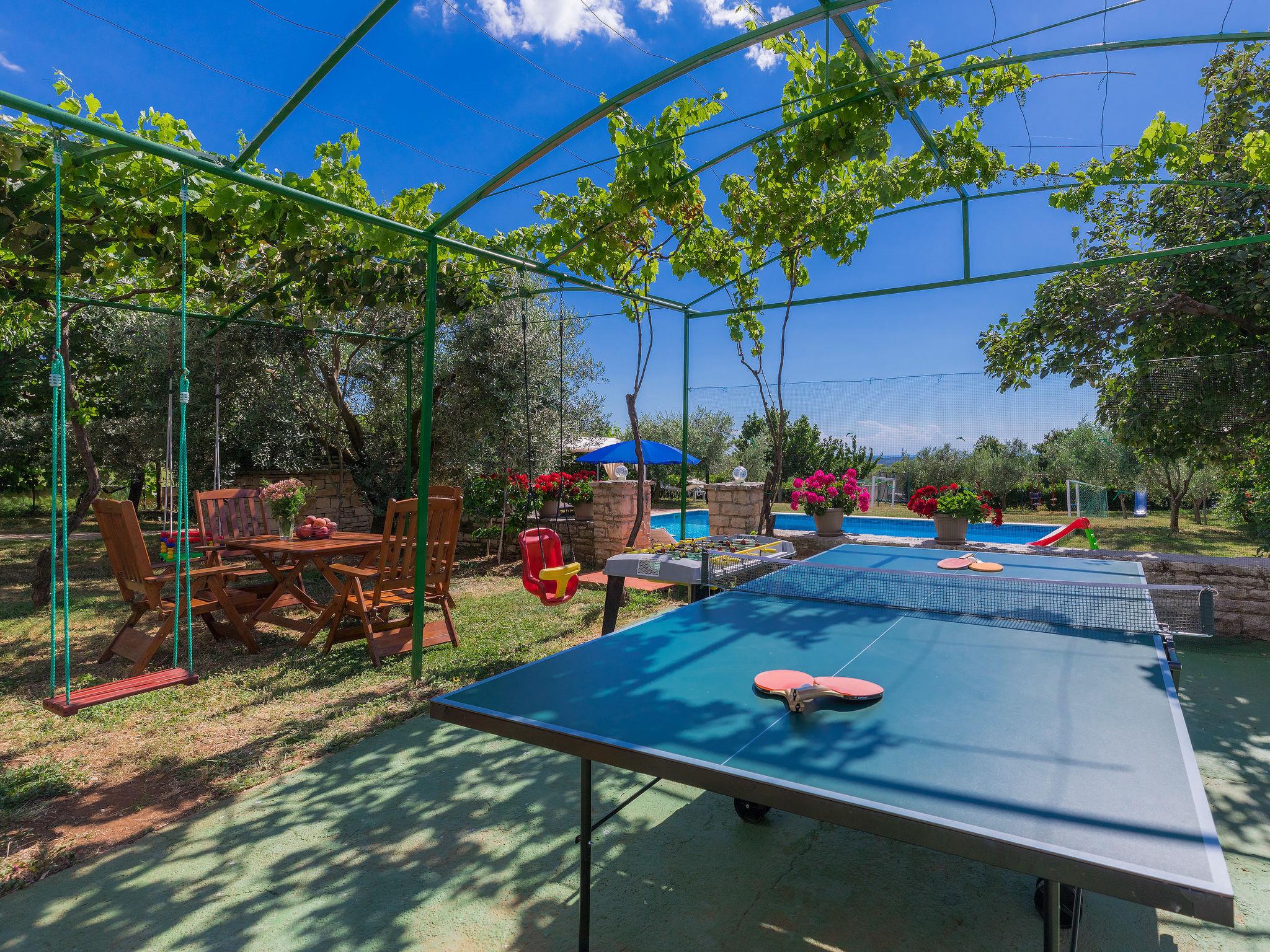 Apartment house "Ivan & Tina". 500 m from the centre of Kanfanar, 17 km from the centre of Rovinj, 17 km from the sea. For shared use: property 3'000 m2 with lawn and trees, swimming pool angular (10 x 5 m, depth 135 cm, seasonal availability: 23.May. - 26.Sep.) with internal staircase. Outdoor shower, table tennis, boccia, volleyball, badminton, arbour, terrace, garden furniture, barbecue (slide, swing, sandbox). In the house: internet access, table football, trampoline, storage room for bicycles. Parking on the premises. Shop 400 m, bus stop 600 m, pebble beach 17 km. Nearby attractions: Lim valley 6 km. The owner offers boat rental, fishing excursions and boat trips (extra charge, arrangements on the spot).