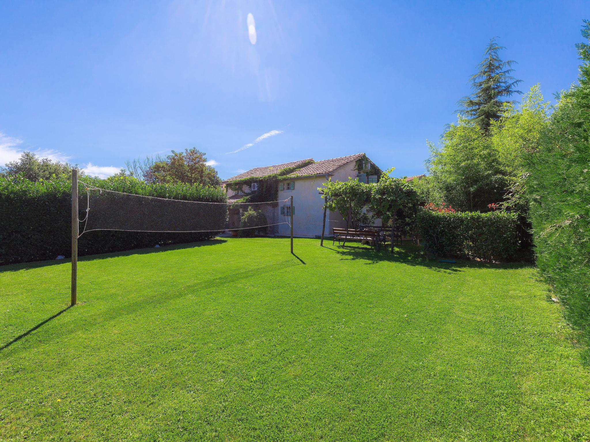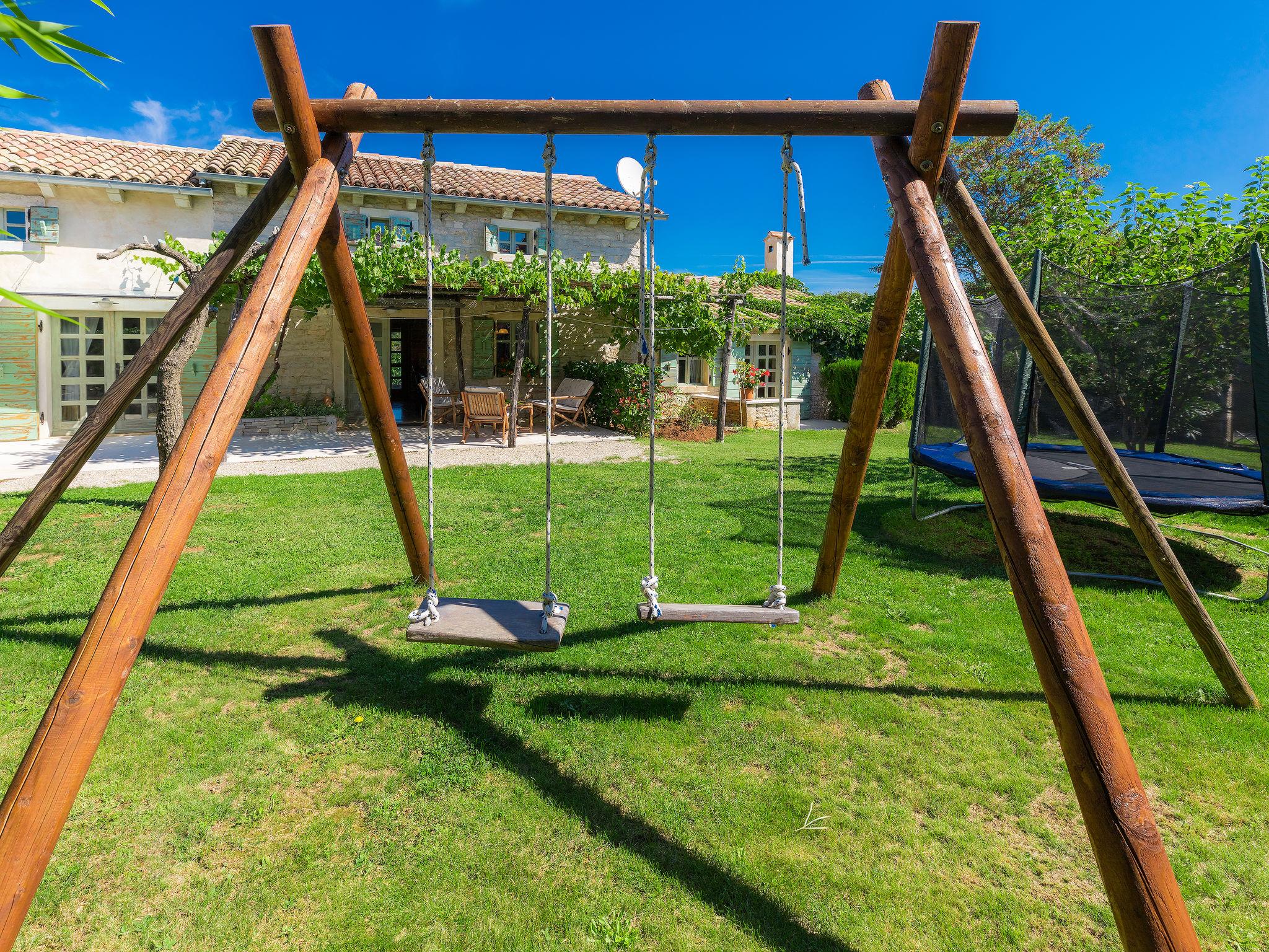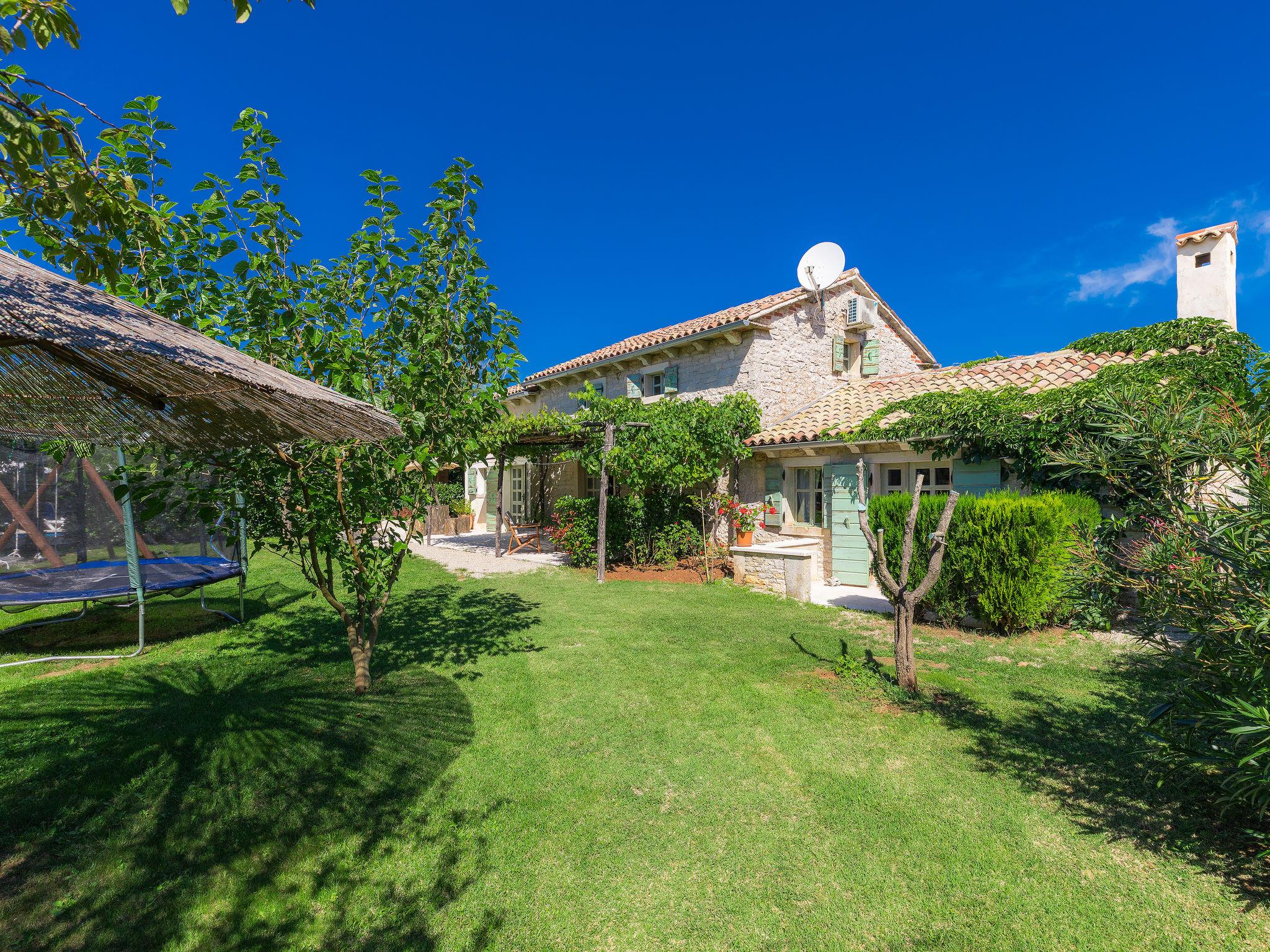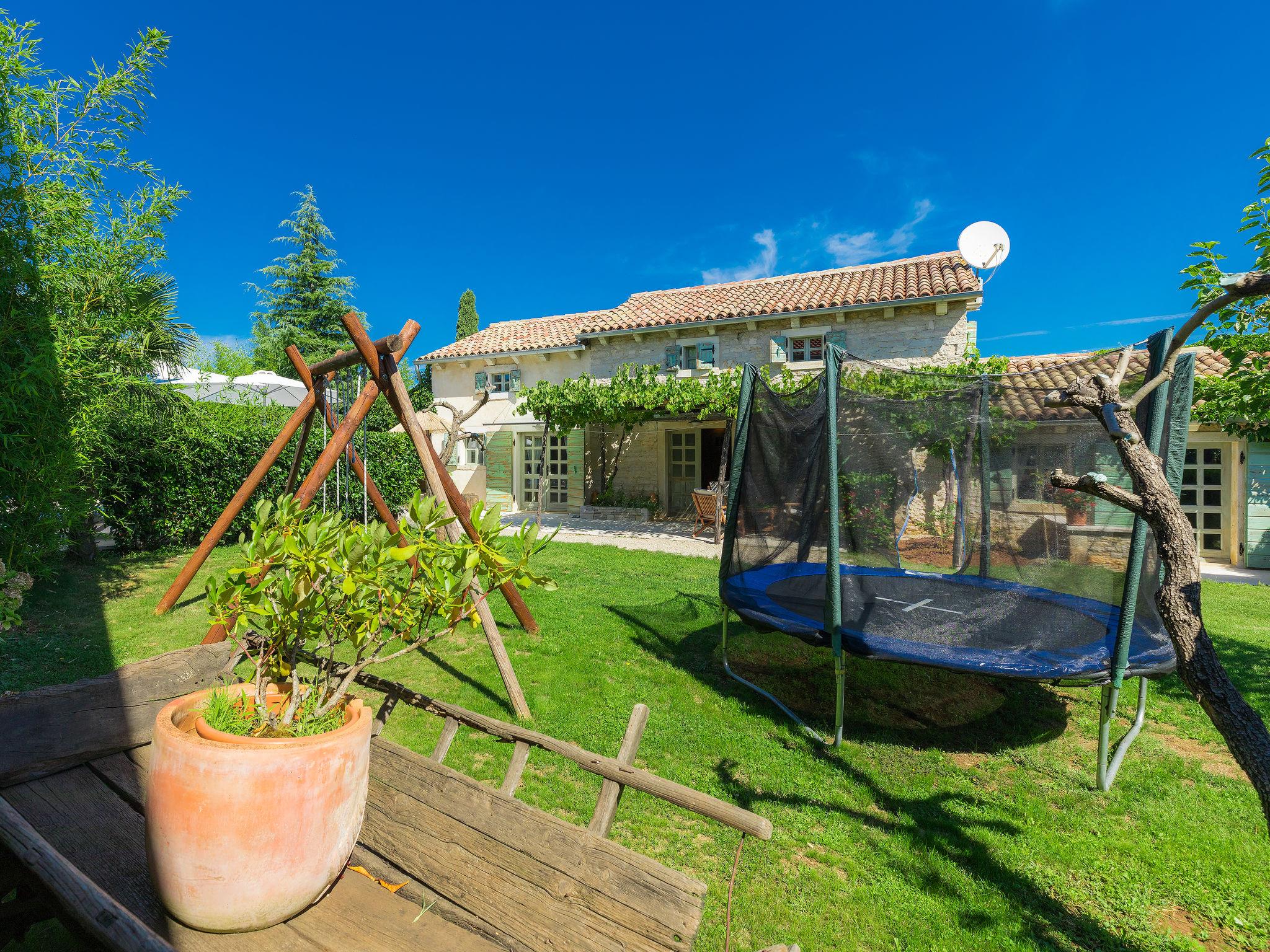 Single-family house "Hrelja". 5 km from the centre of Zminj, 15 km from the centre of Pazin, 25 km from the centre of Rovinj, 25 km from the sea. Private: property 1'800 m2 (fenced) with lawn and trees, swimming pool (7 x 3 m, 24 m2, depth 135 cm, seasonal availability: 01.May. - 05.Nov.). Outdoor shower, table tennis, volleyball, volleyball court, terrace (15 m2), garden furniture, barbecue (swing). In the house: bicycles available. Parking (for 2 cars) on the premises. Shop 1 km, supermarket 6 km, bus stop 6.4 km, rocky beach 25 km. Marina 30 km.