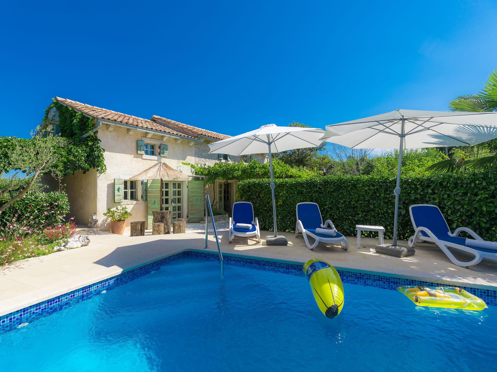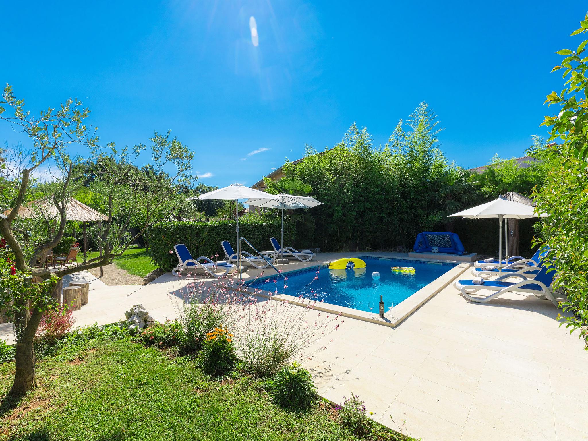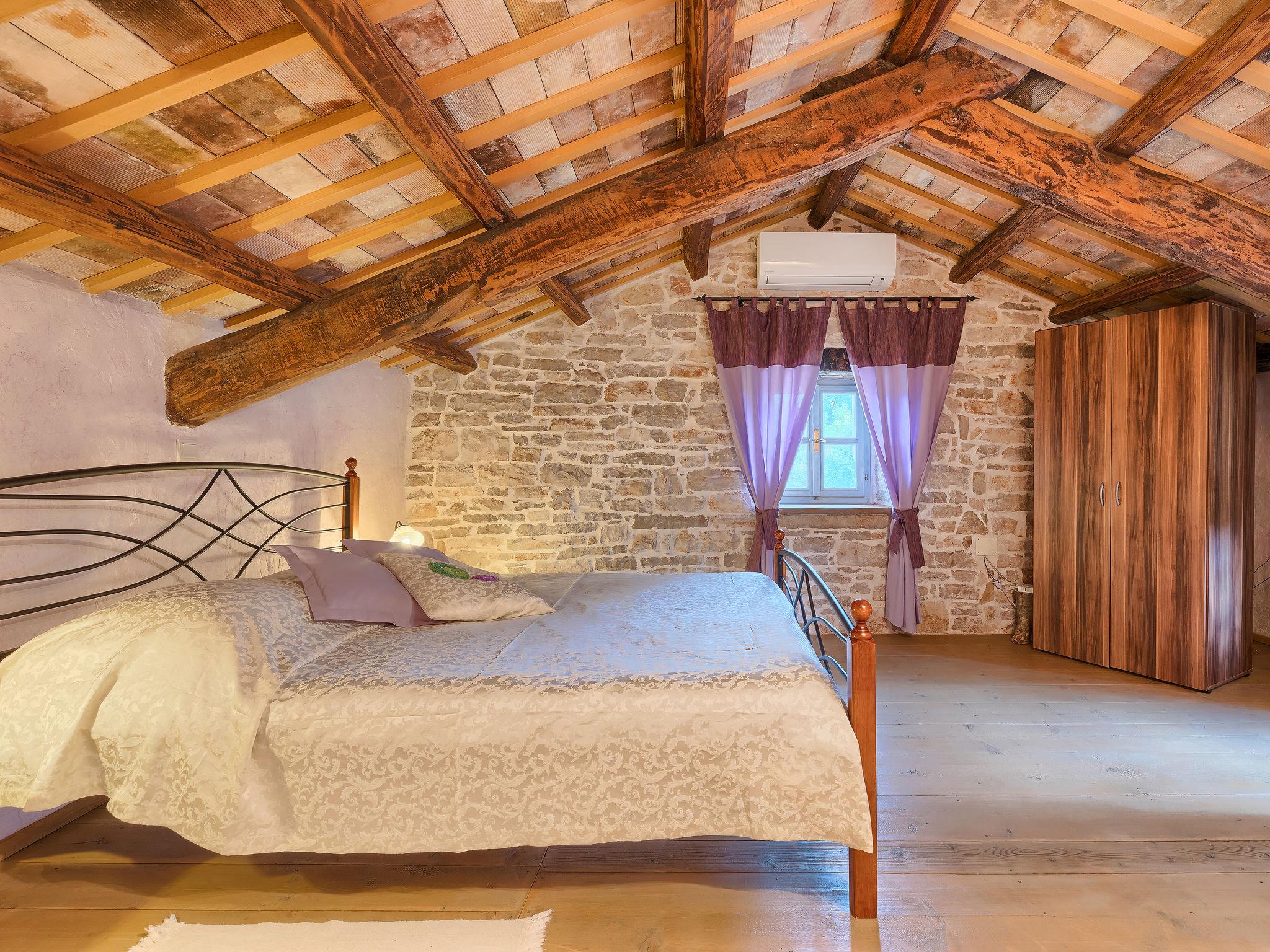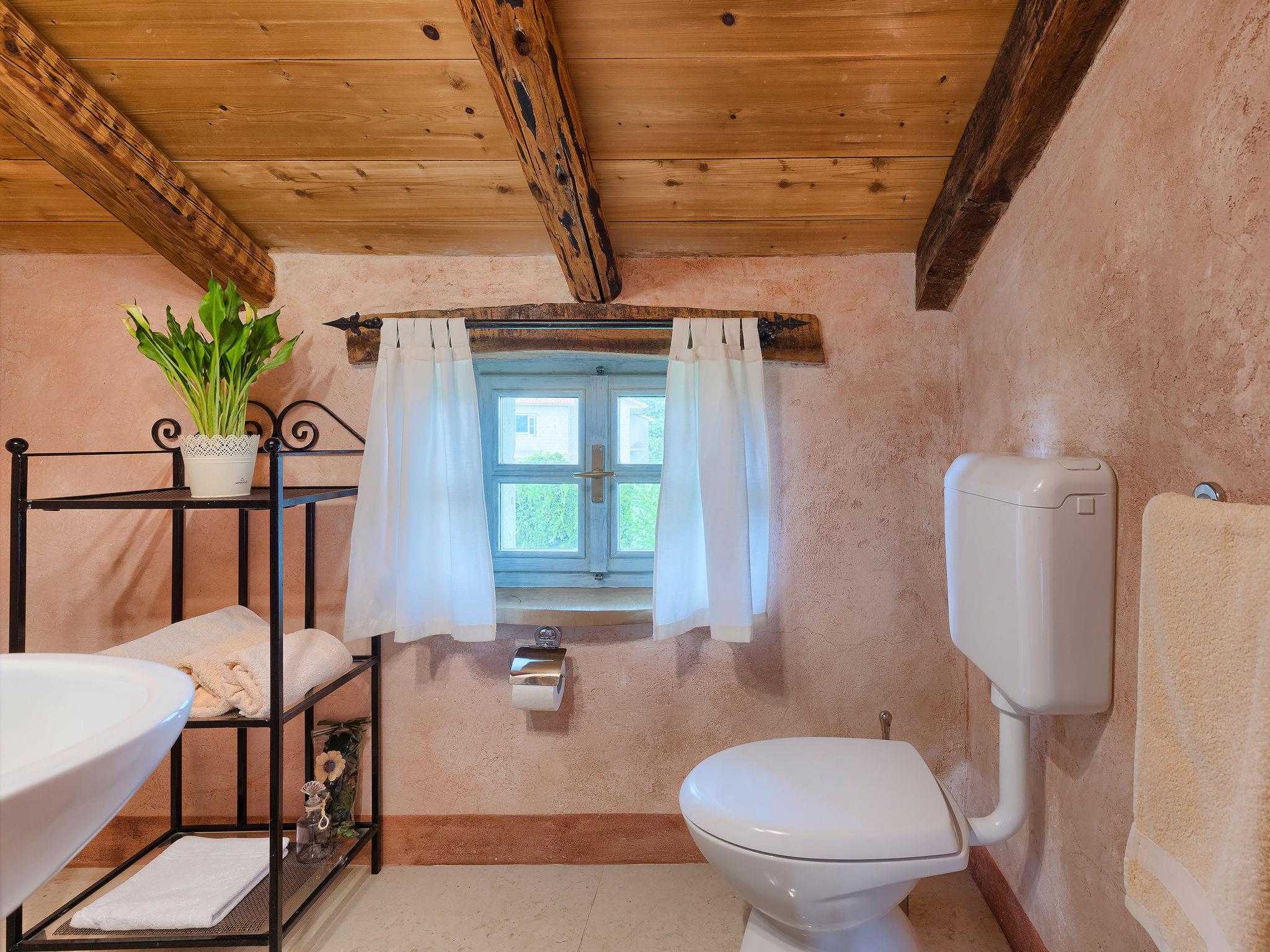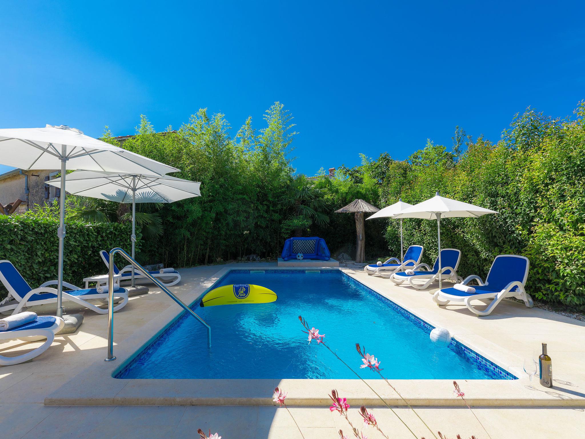 Single-family house "Hrelja". 5 km from the centre of Zminj, 15 km from the centre of Pazin, 25 km from the centre of Rovinj, 25 km from the sea. Private: property 1'800 m2 (fenced) with lawn and trees, swimming pool (7 x 3 m, 24 m2, depth 135 cm, seasonal availability: 01.May. - 05.Nov.). Outdoor shower, table tennis, volleyball, volleyball court, terrace (15 m2), garden furniture, barbecue (swing). In the house: bicycles available. Parking (for 2 cars) on the premises. Shop 1 km, supermarket 6 km, bus stop 6.4 km, rocky beach 25 km. Marina 30 km.