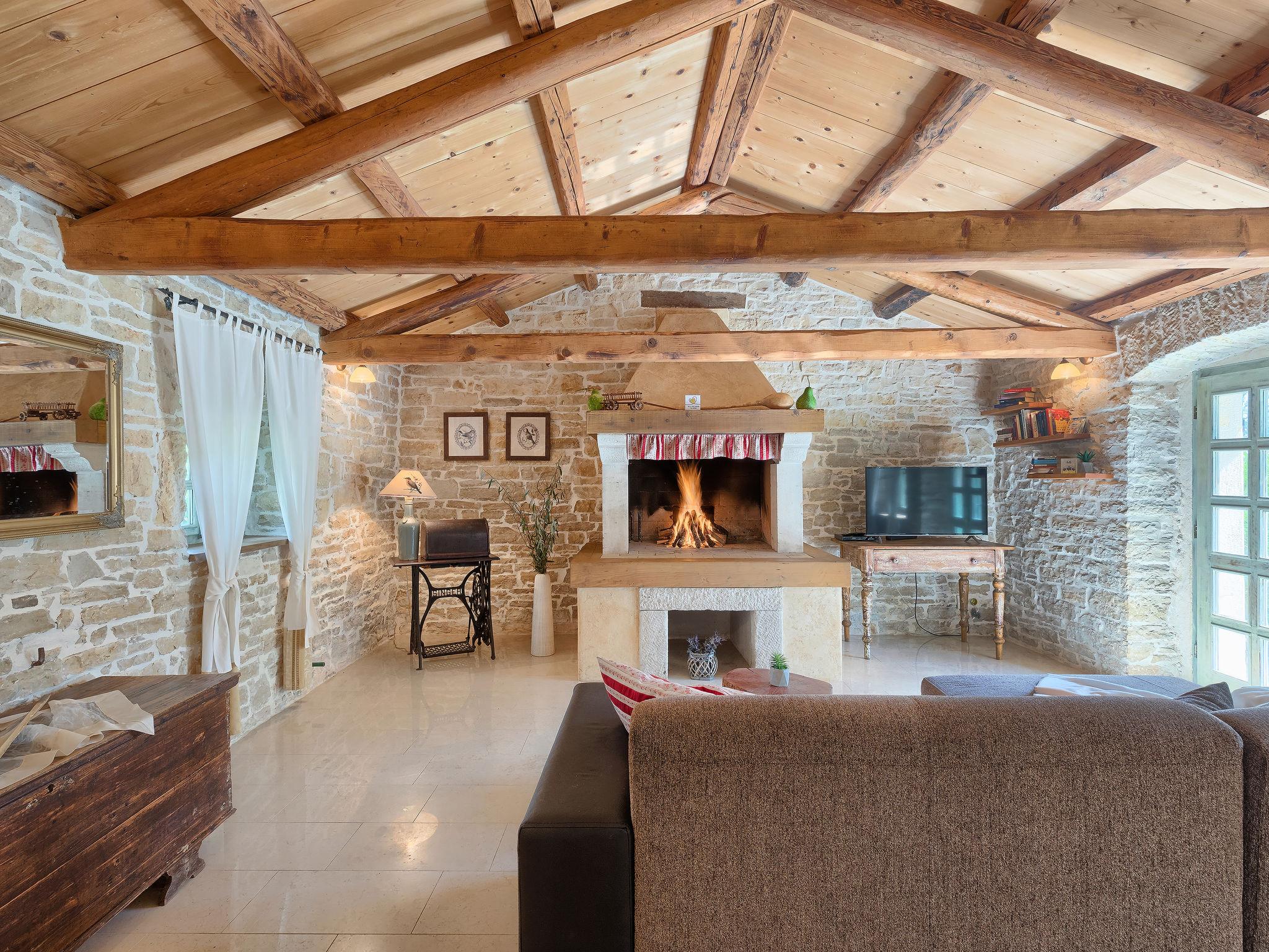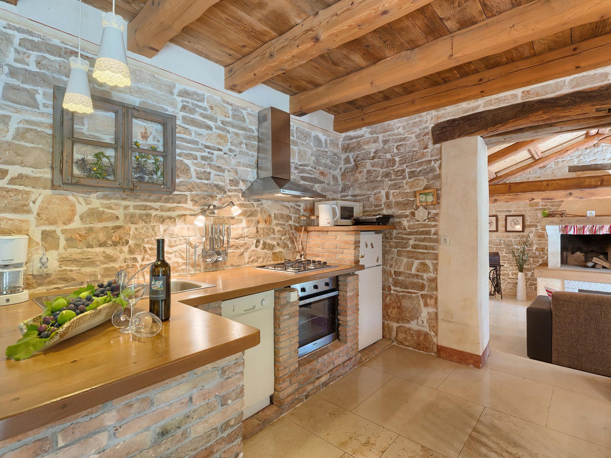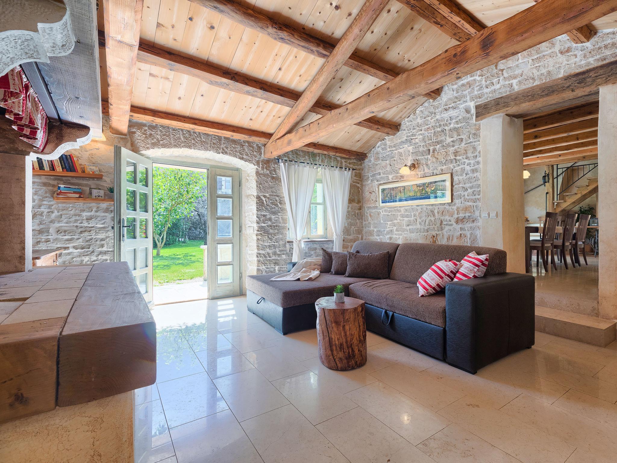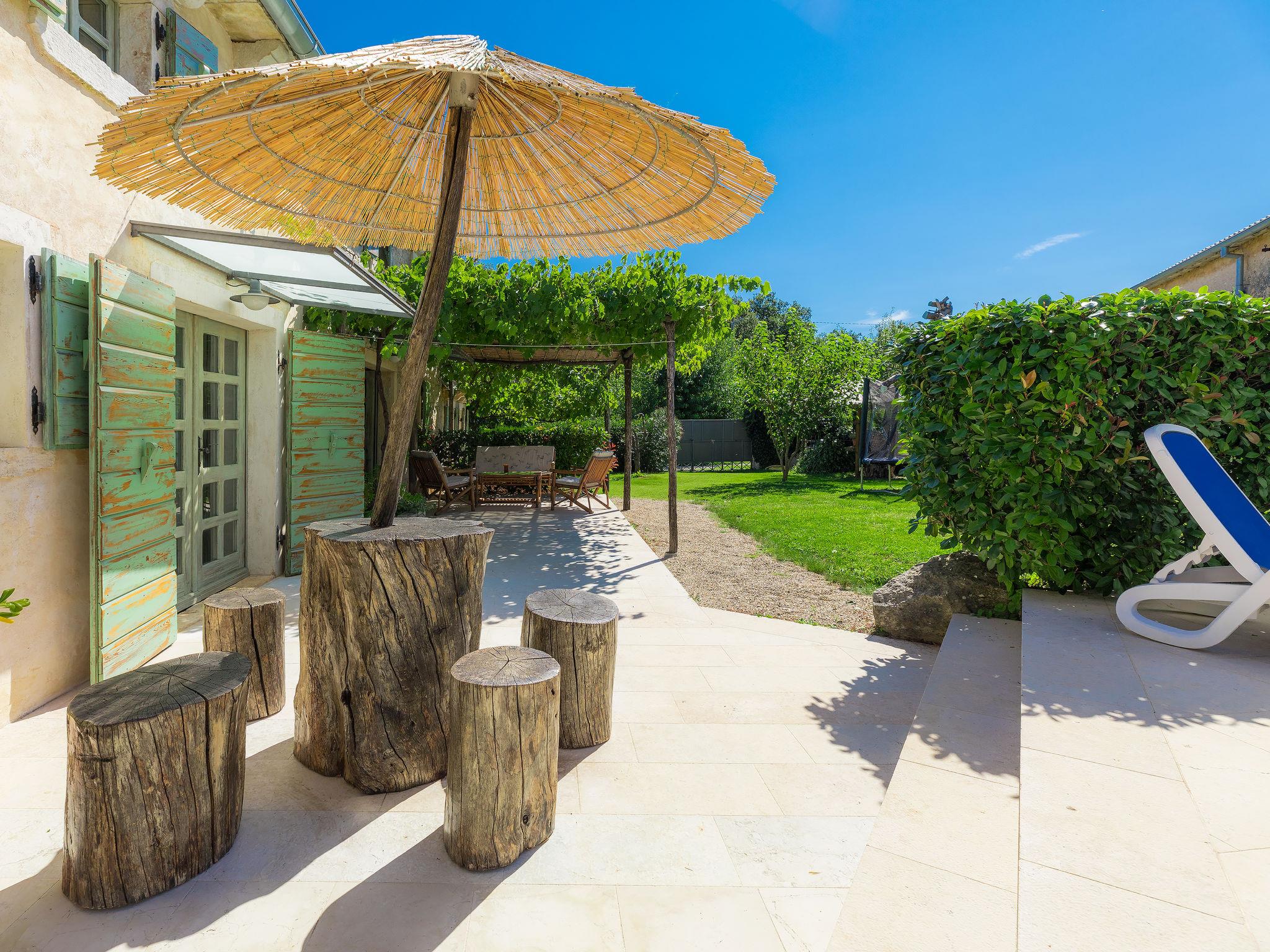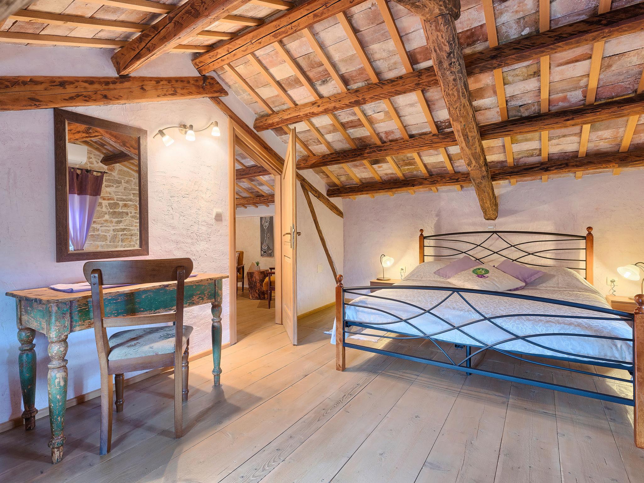 Single-family house "Hrelja". 5 km from the centre of Zminj, 15 km from the centre of Pazin, 25 km from the centre of Rovinj, 25 km from the sea. Private: property 1'800 m2 (fenced) with lawn and trees, swimming pool (7 x 3 m, 24 m2, depth 135 cm, seasonal availability: 01.May. - 05.Nov.). Outdoor shower, table tennis, volleyball, volleyball court, terrace (15 m2), garden furniture, barbecue (swing). In the house: bicycles available. Parking (for 2 cars) on the premises. Shop 1 km, supermarket 6 km, bus stop 6.4 km, rocky beach 25 km. Marina 30 km.