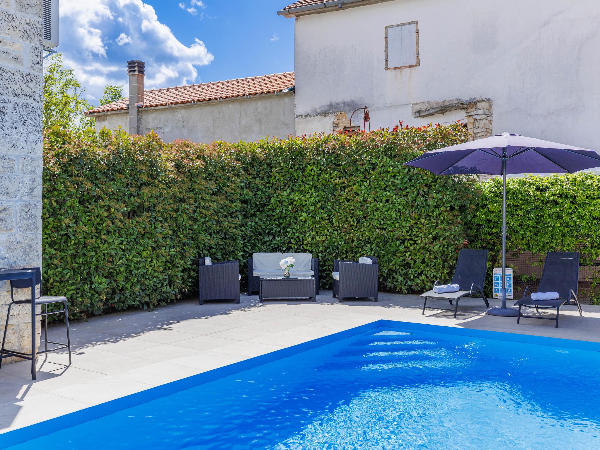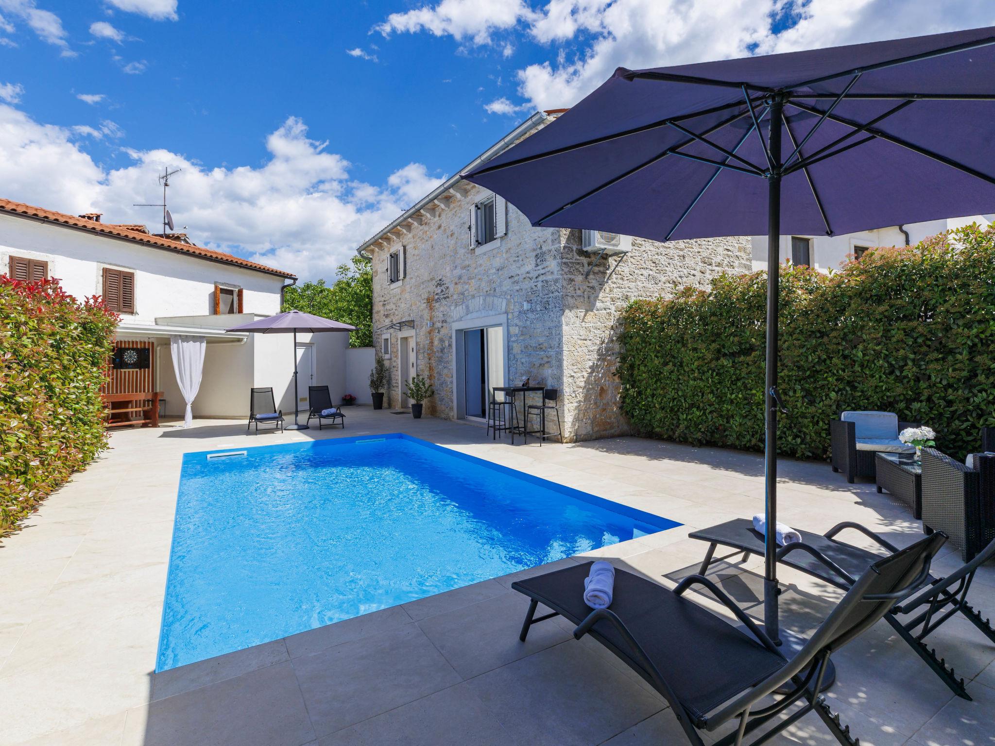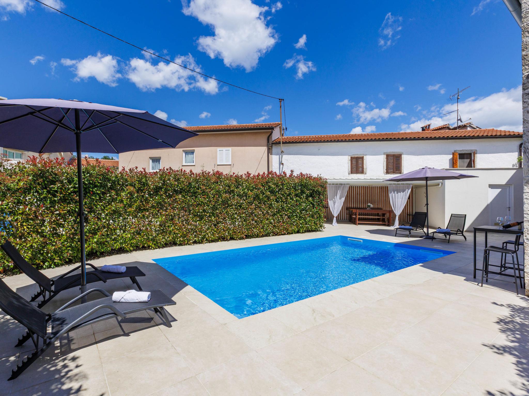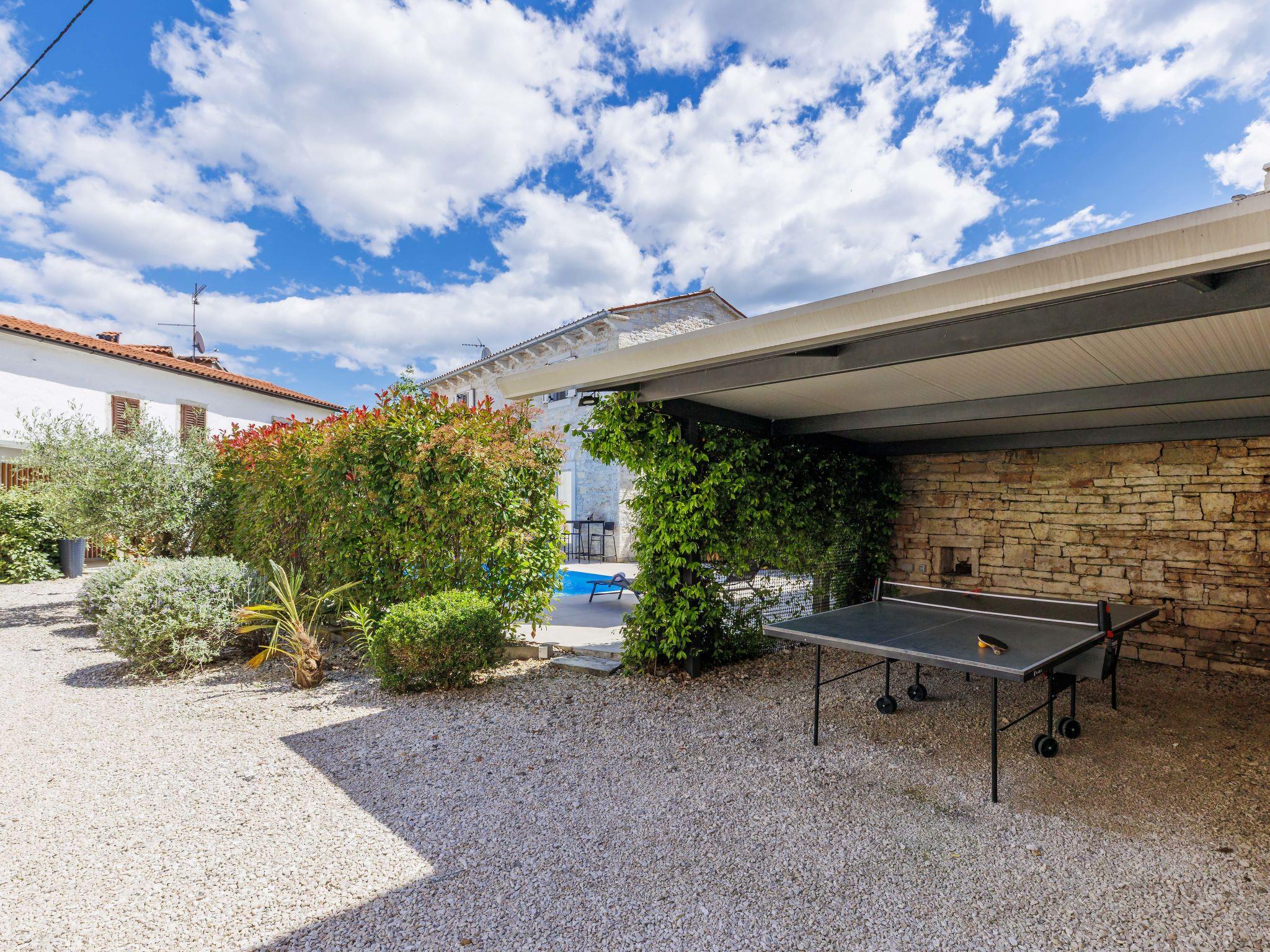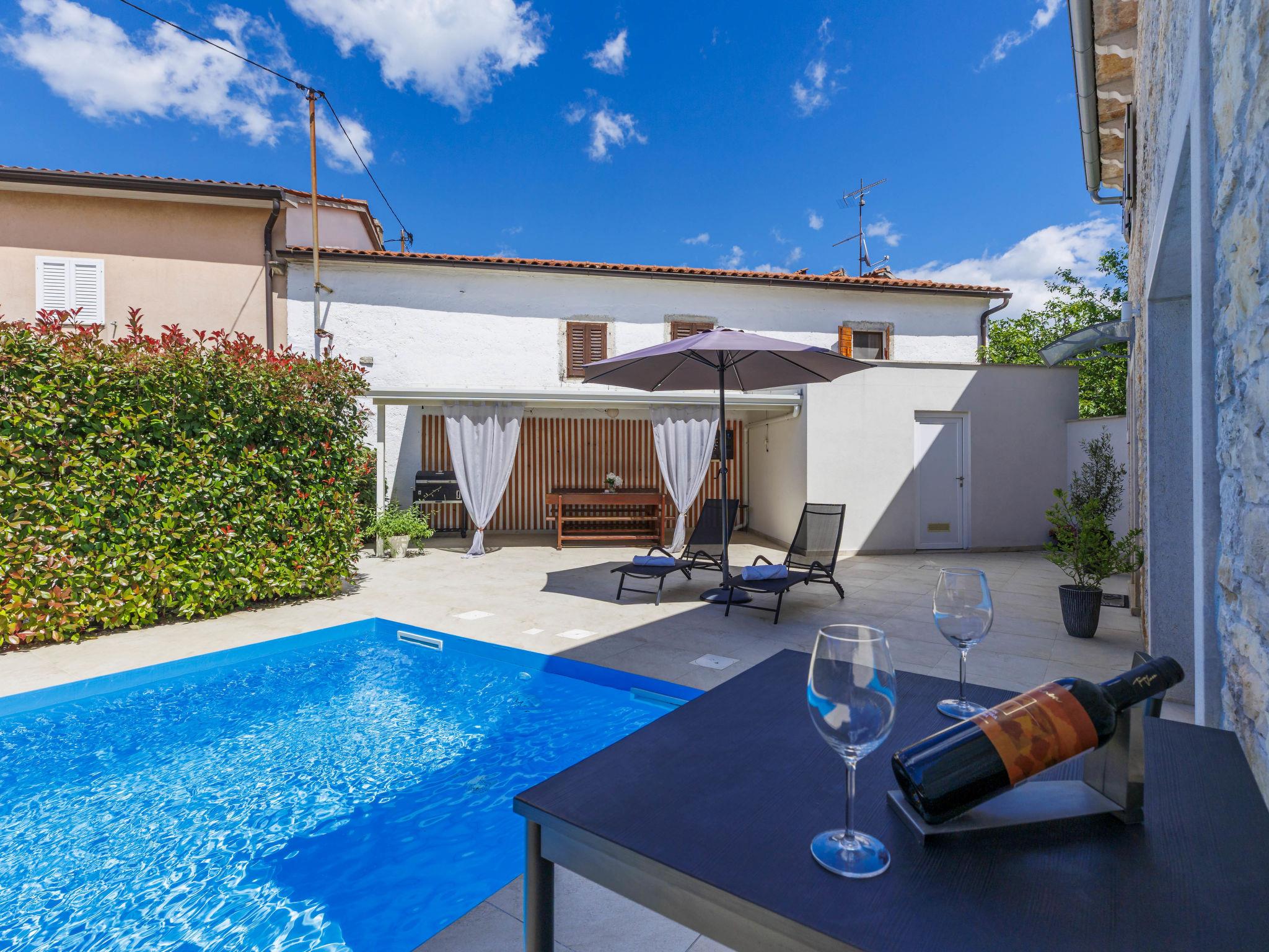 Single-family house "Villa Karmen", 2 storeys, renovated in 2019. In the hamlet Gljušcici 6 km from the centre of Žminj, 30 km from the centre of Rovinj, 28 km from the sea. Private: property 400 m2 (fenced), swimming pool angular (7 x 3 m, 24 m2, depth 130 cm, seasonal availability: 01.May. - 14.Oct.) with internal staircase. Outdoor shower, table tennis, terrace, garden furniture. In the house: internet access, washing machine. Parking (for 3 cars) on the premises. Shop 500 m, restaurant 1 km, bus stop 6.1 km, rocky beach 28 km.