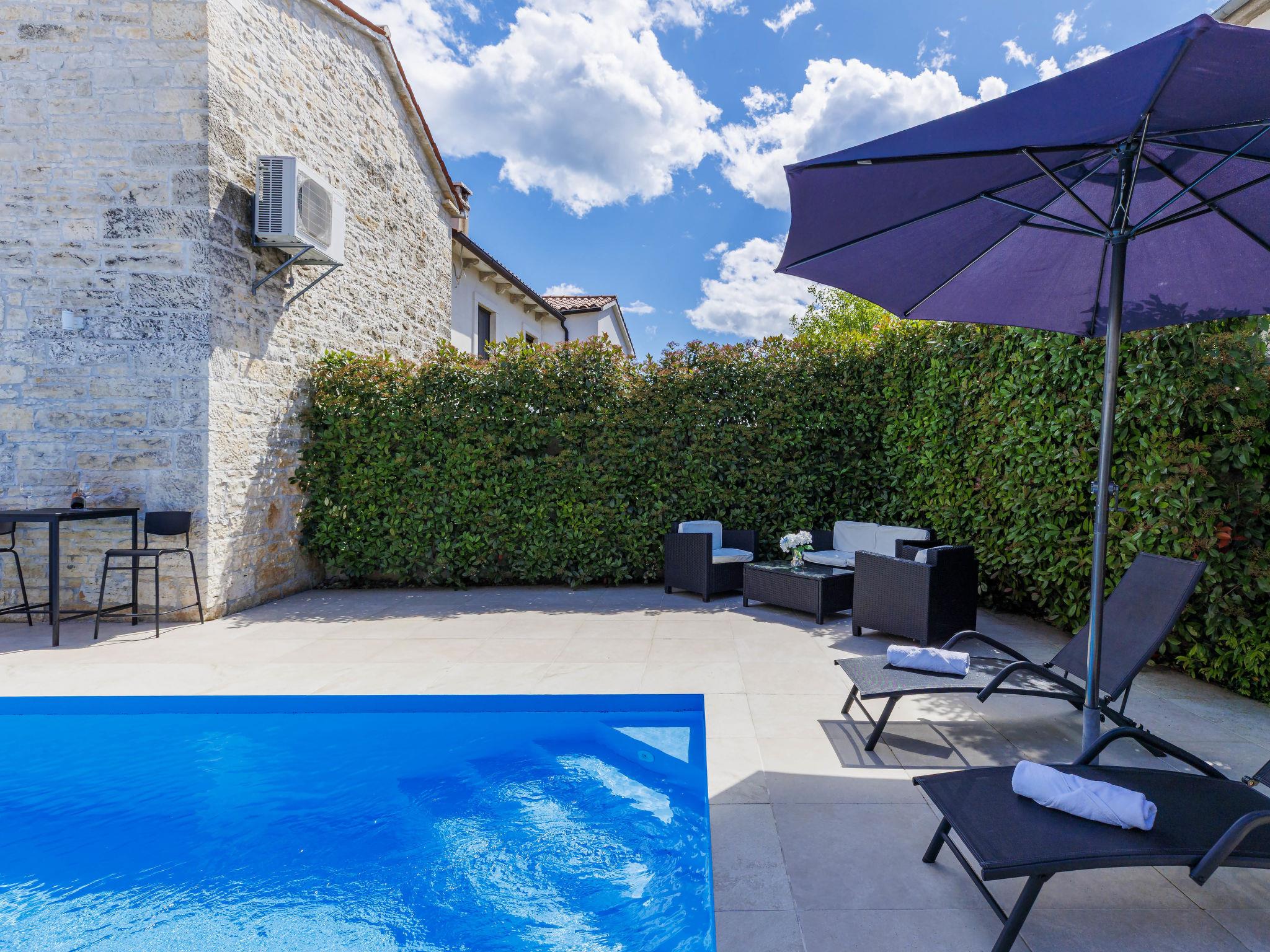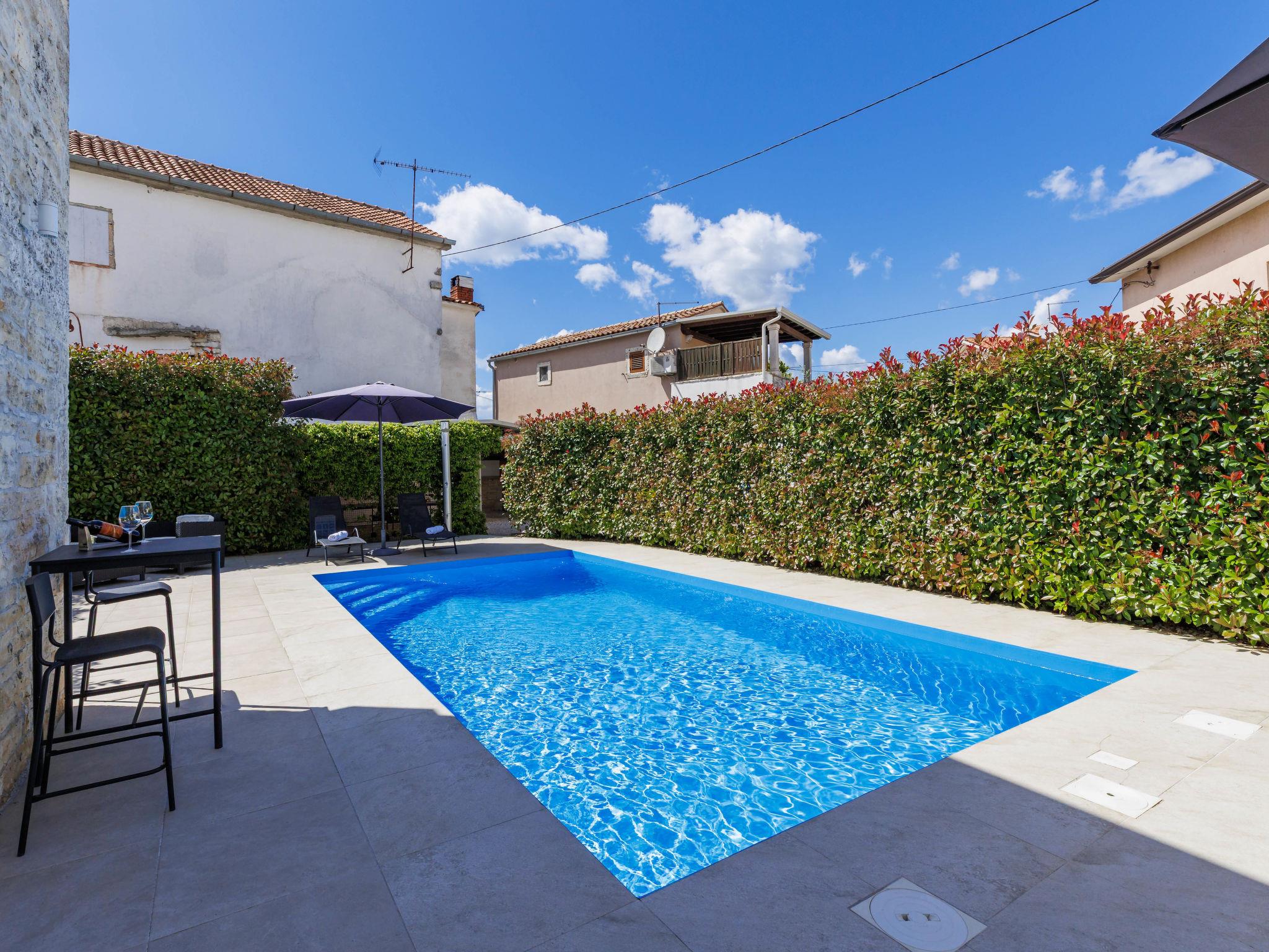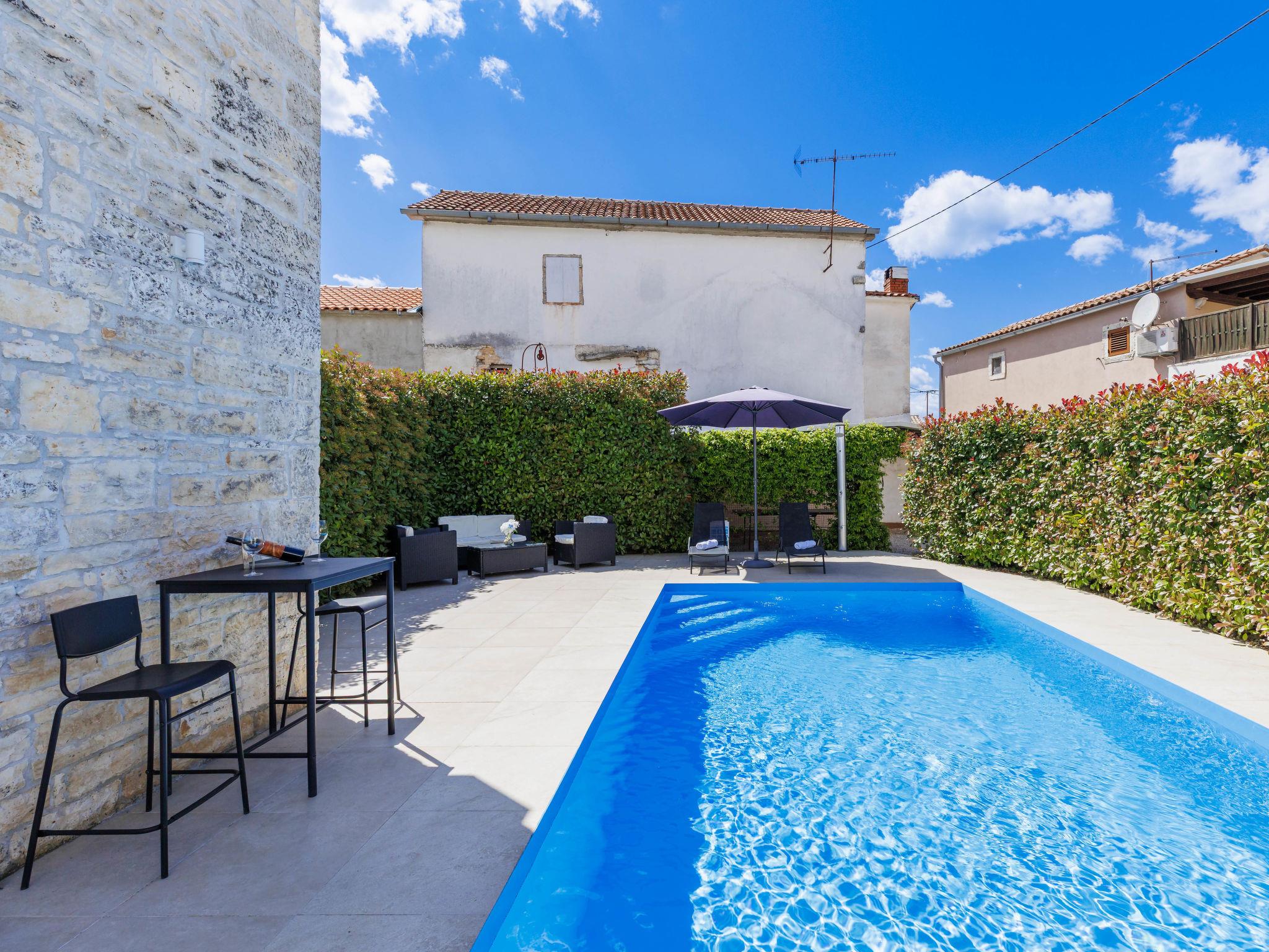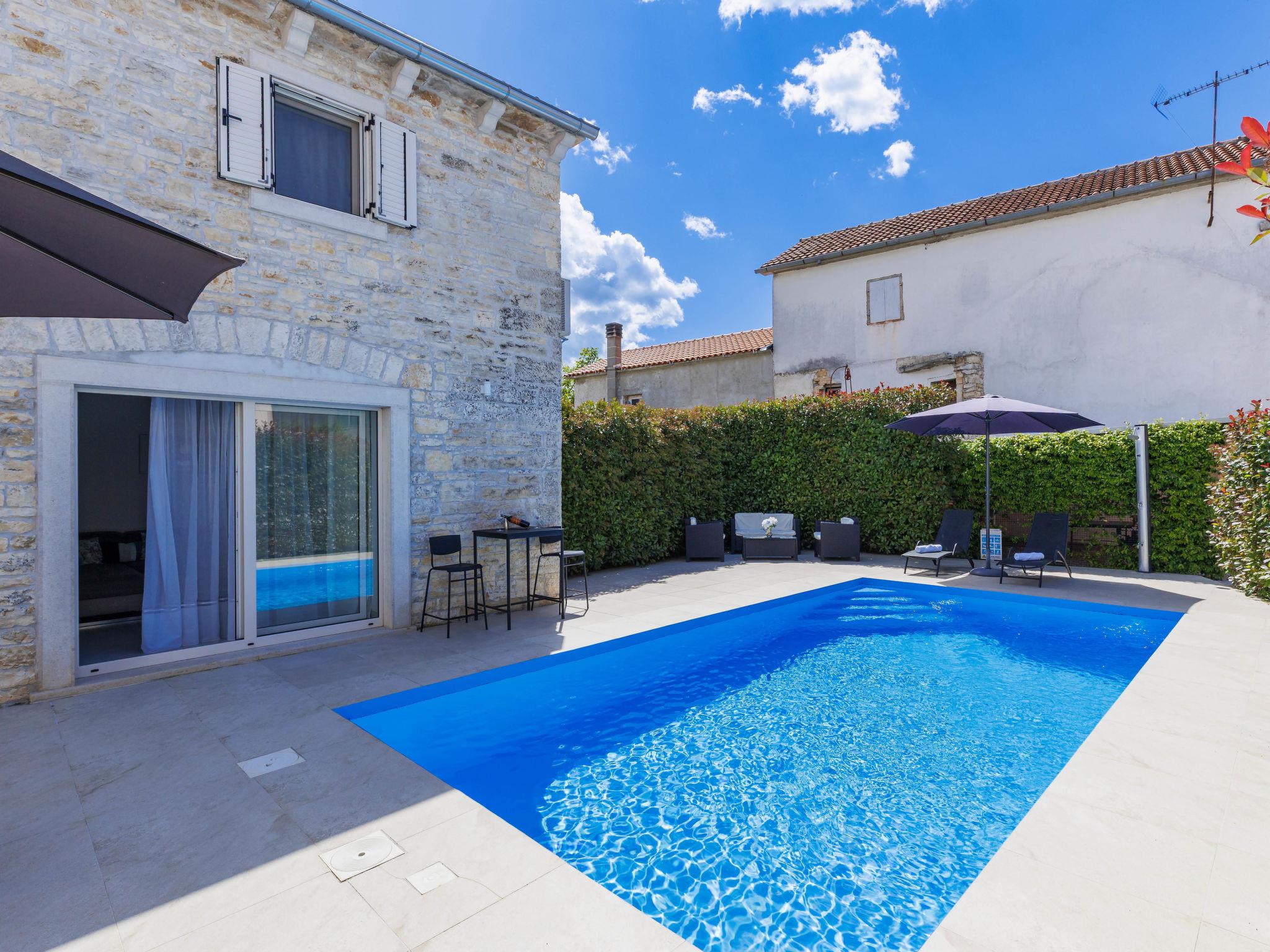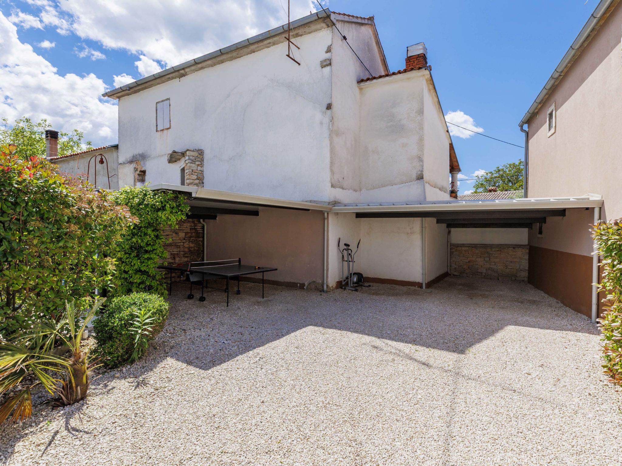 Single-family house "Villa Karmen", 2 storeys, renovated in 2019. In the hamlet Gljušcici 6 km from the centre of Žminj, 30 km from the centre of Rovinj, 28 km from the sea. Private: property 400 m2 (fenced), swimming pool angular (7 x 3 m, 24 m2, depth 130 cm, seasonal availability: 01.May. - 14.Oct.) with internal staircase. Outdoor shower, table tennis, terrace, garden furniture. In the house: internet access, washing machine. Parking (for 3 cars) on the premises. Shop 500 m, restaurant 1 km, bus stop 6.1 km, rocky beach 28 km.