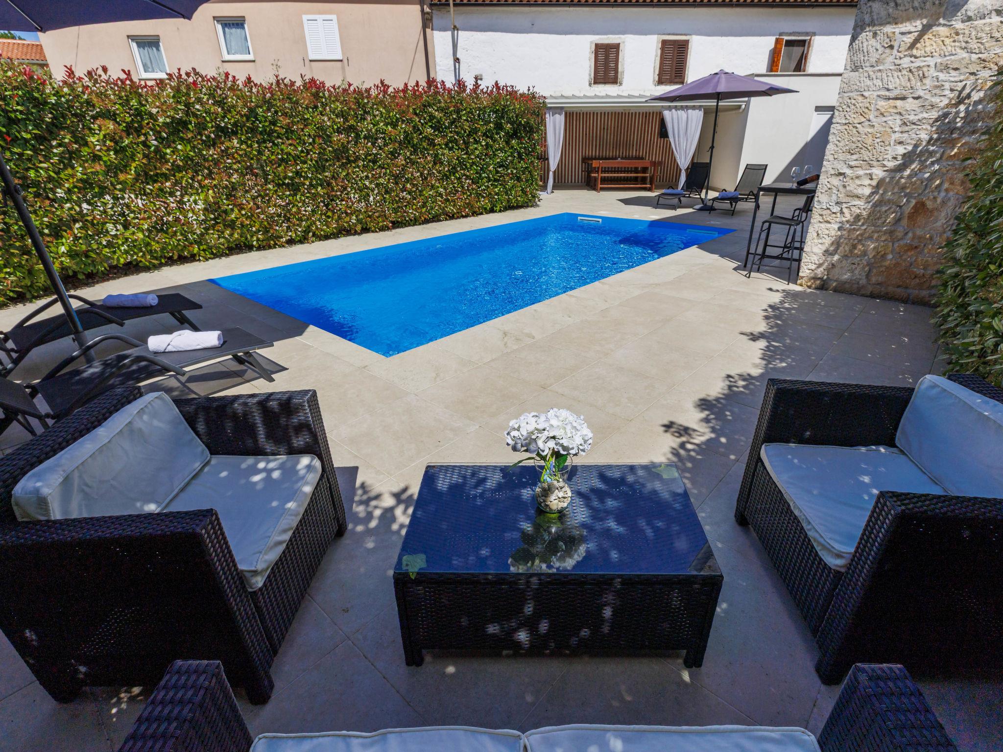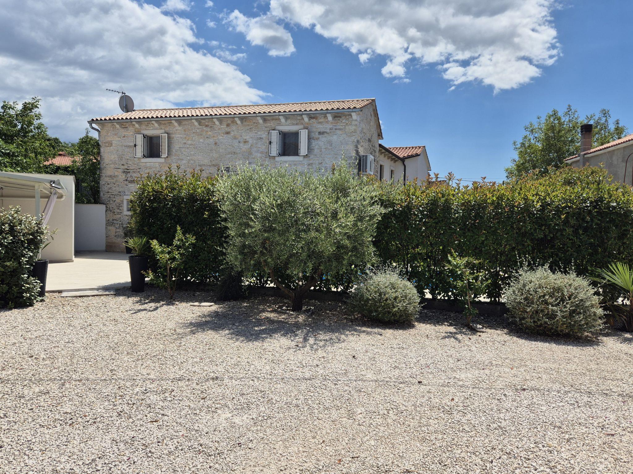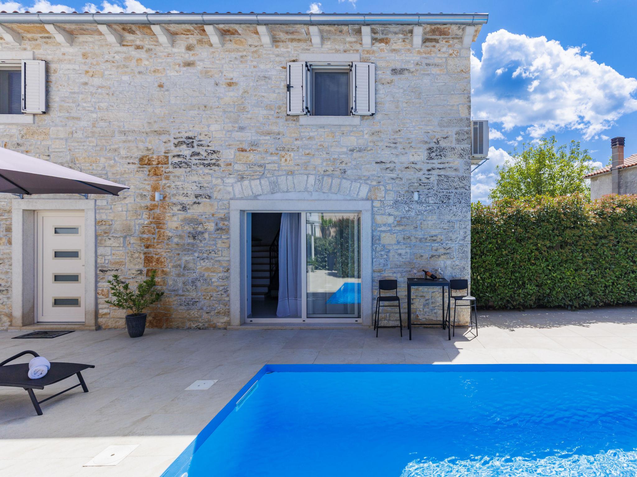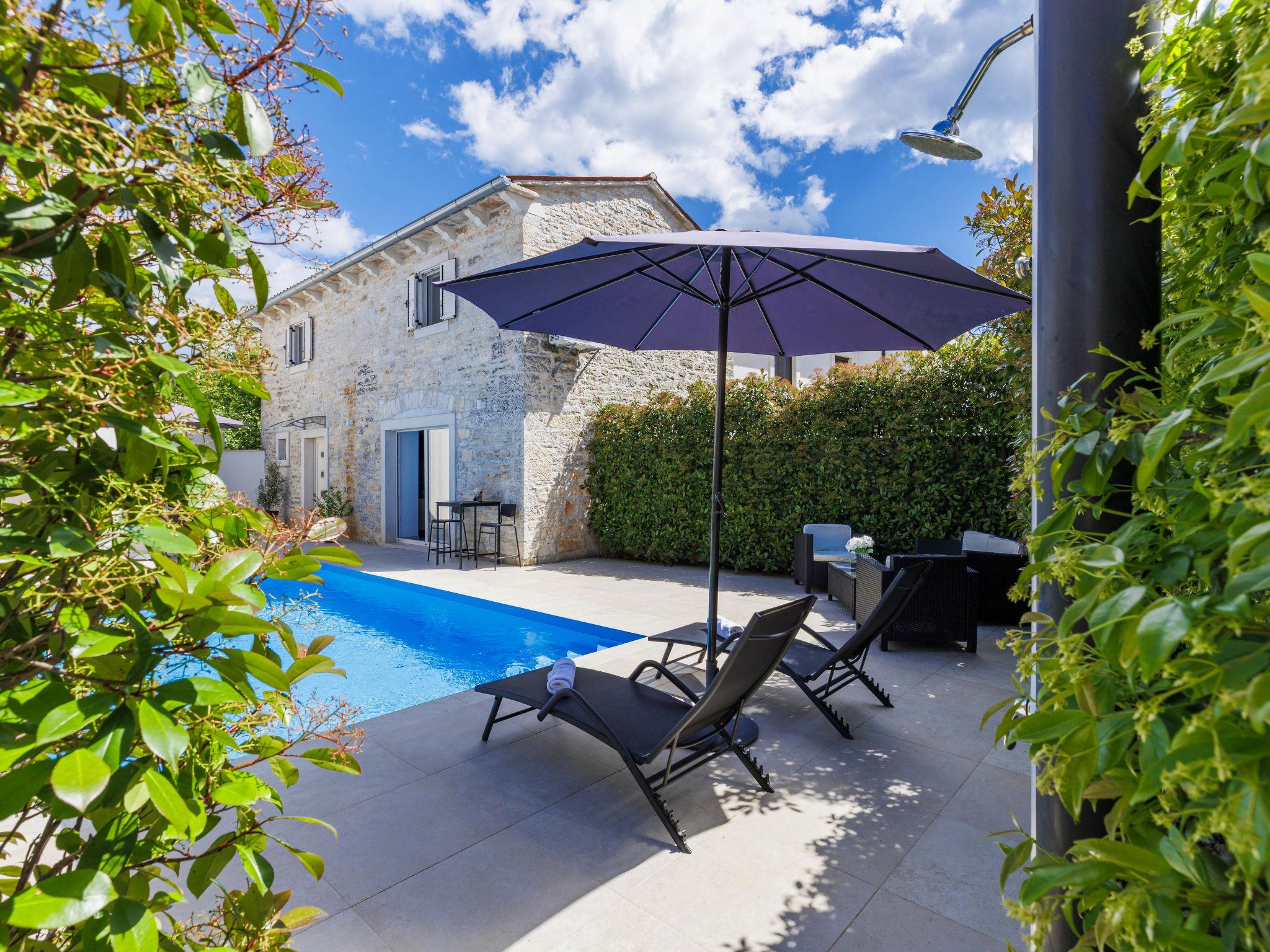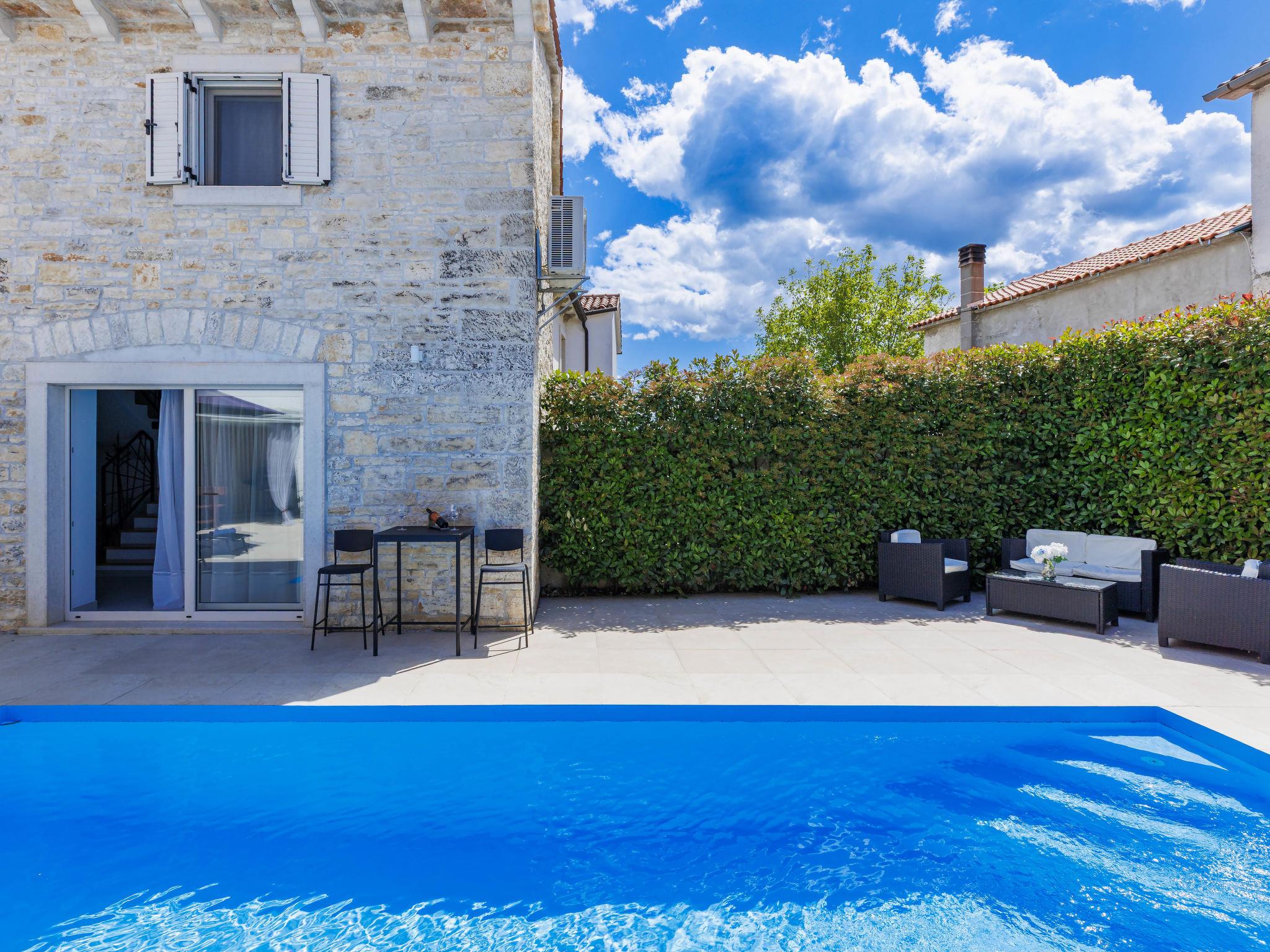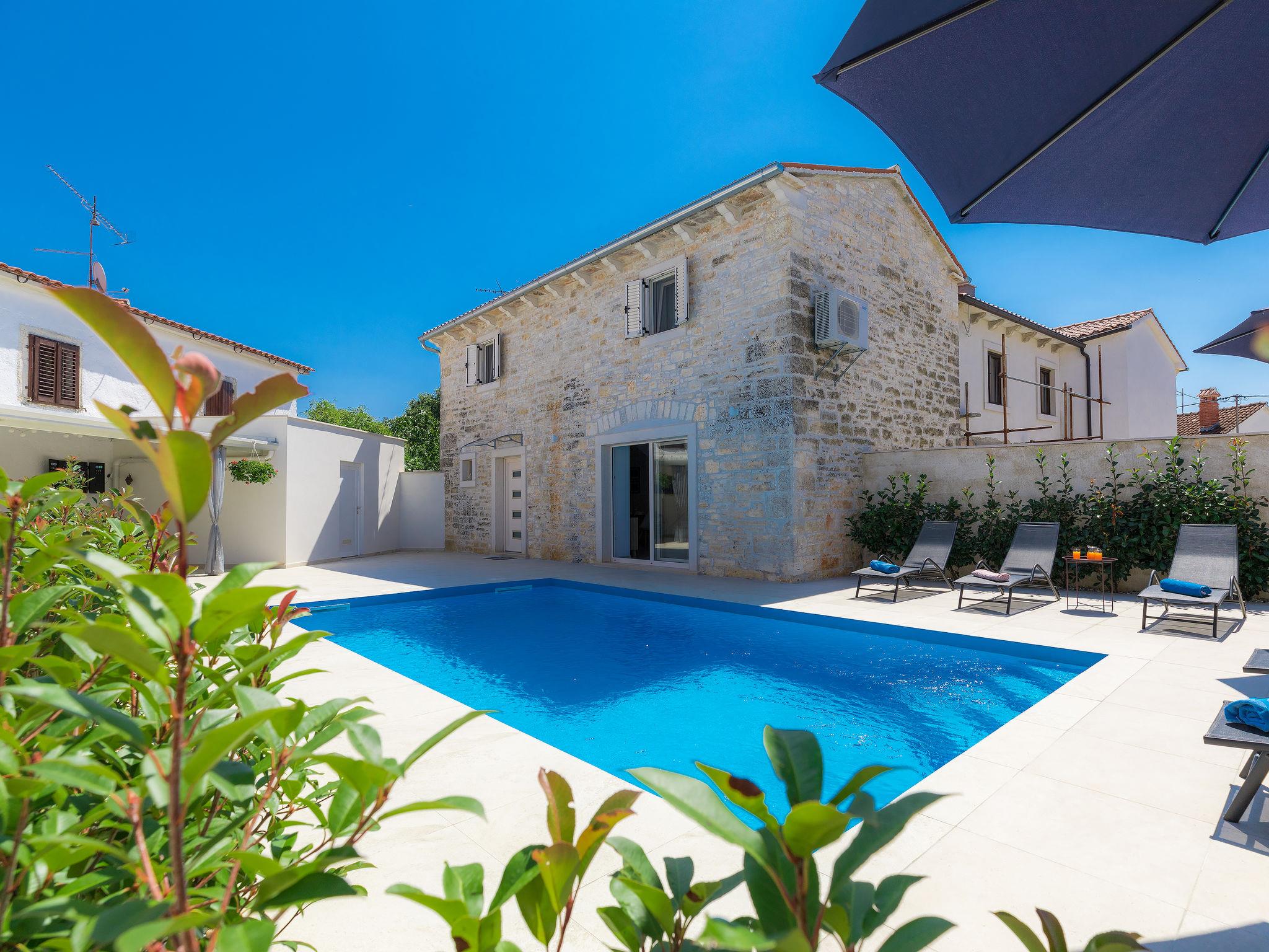 Single-family house "Villa Karmen", 2 storeys, renovated in 2019. In the hamlet Gljušcici 6 km from the centre of Žminj, 30 km from the centre of Rovinj, 28 km from the sea. Private: property 400 m2 (fenced), swimming pool angular (7 x 3 m, 24 m2, depth 130 cm, seasonal availability: 01.May. - 14.Oct.) with internal staircase. Outdoor shower, table tennis, terrace, garden furniture. In the house: internet access, washing machine. Parking (for 3 cars) on the premises. Shop 500 m, restaurant 1 km, bus stop 6.1 km, rocky beach 28 km.