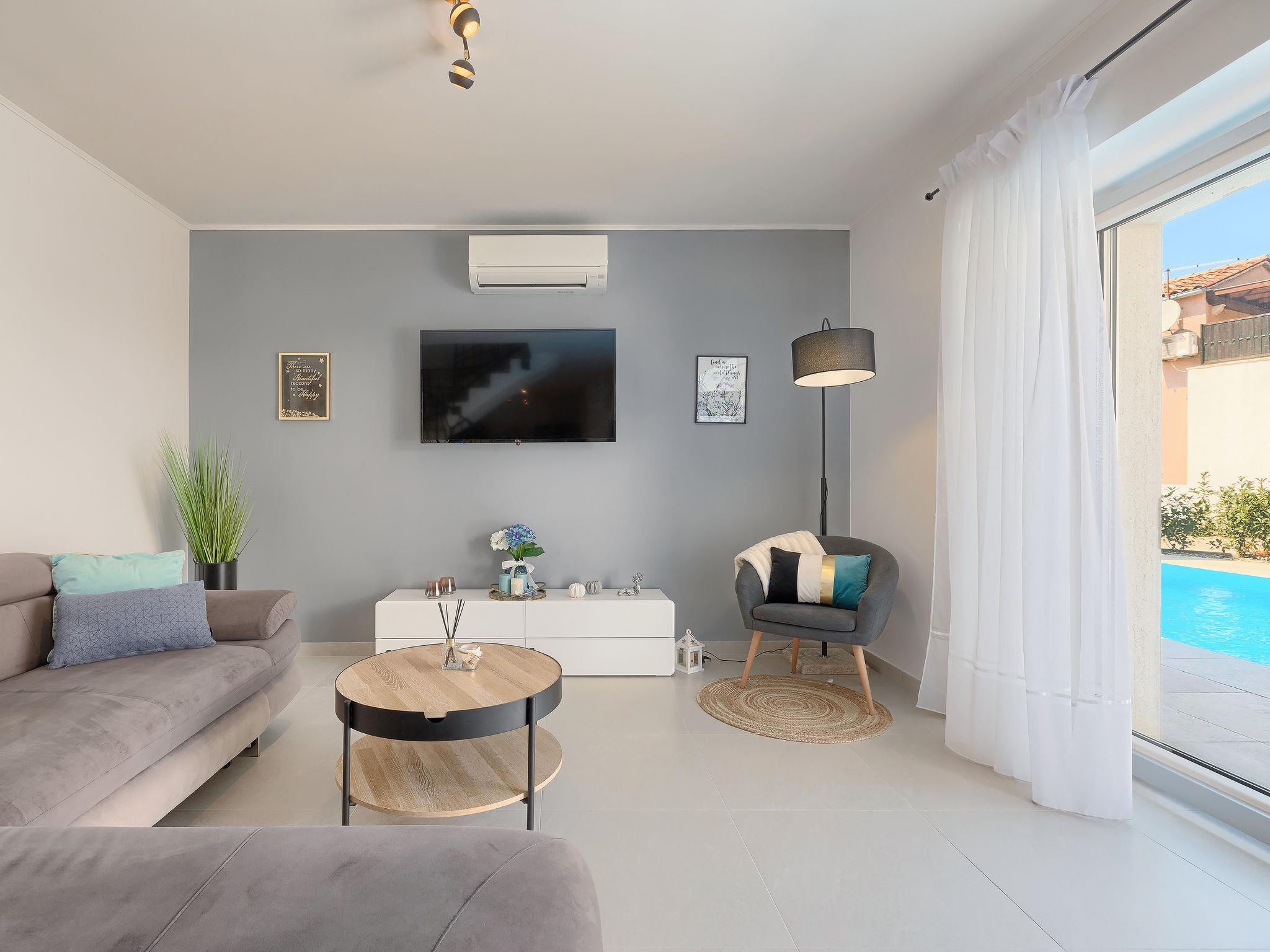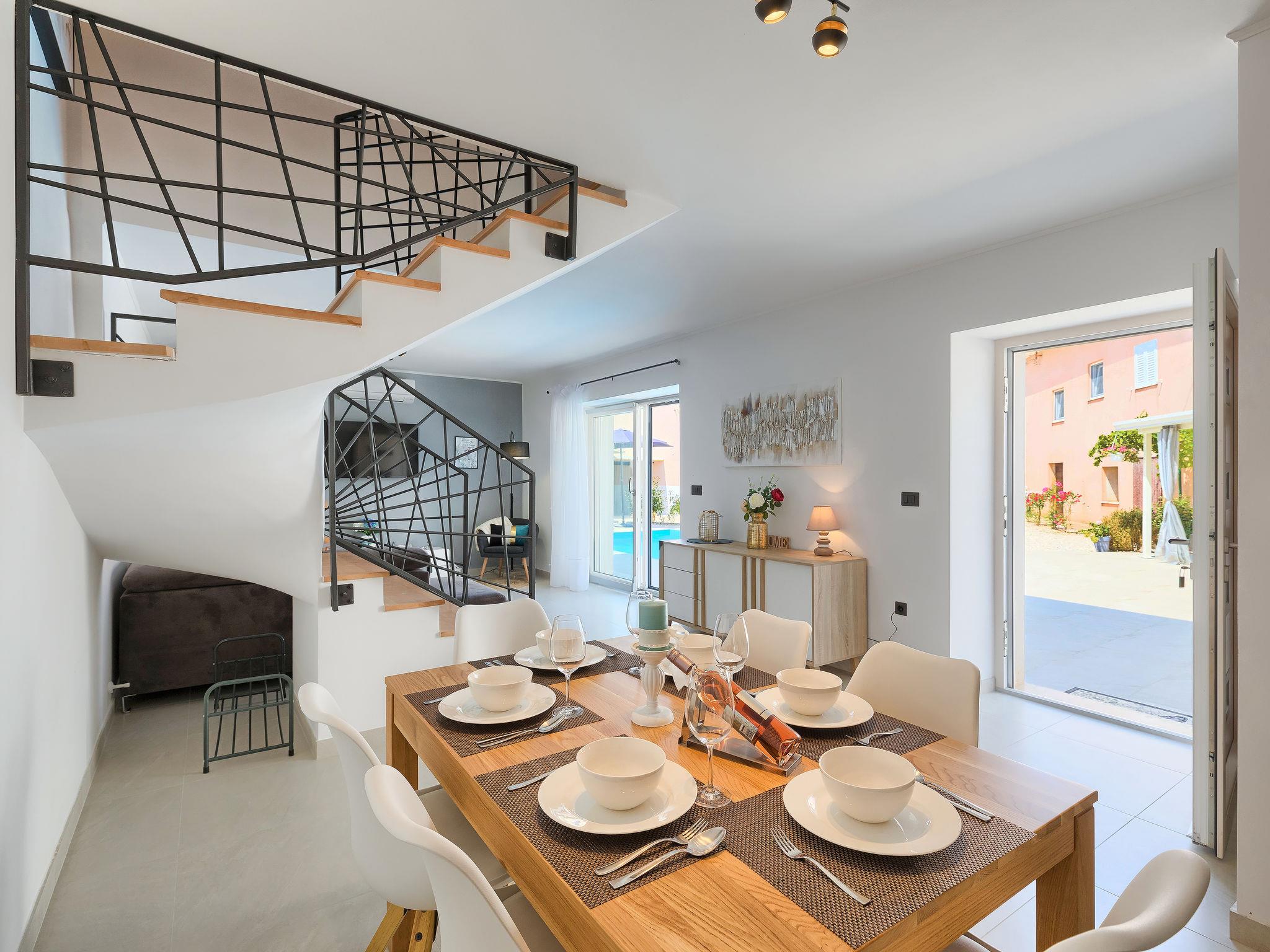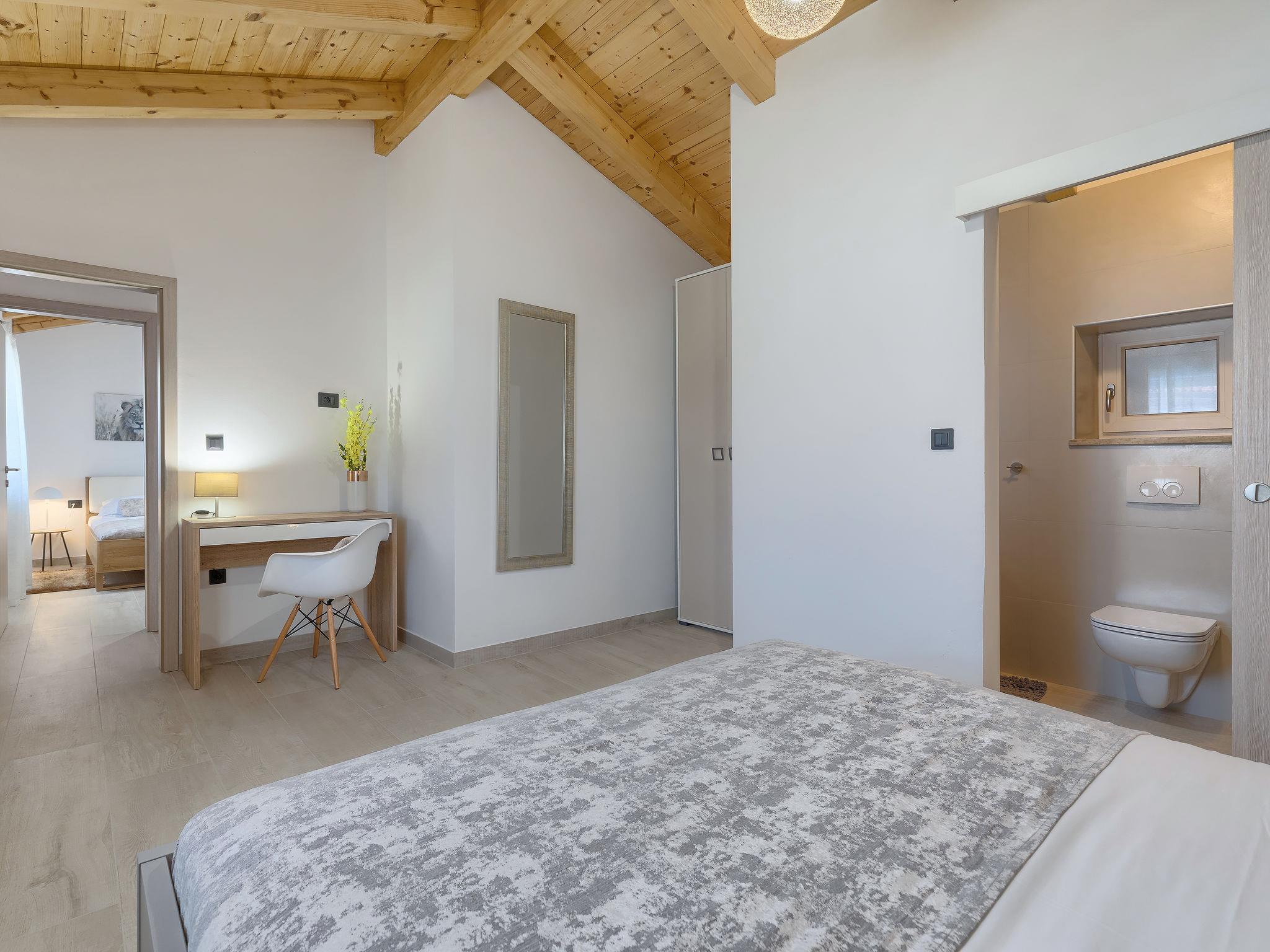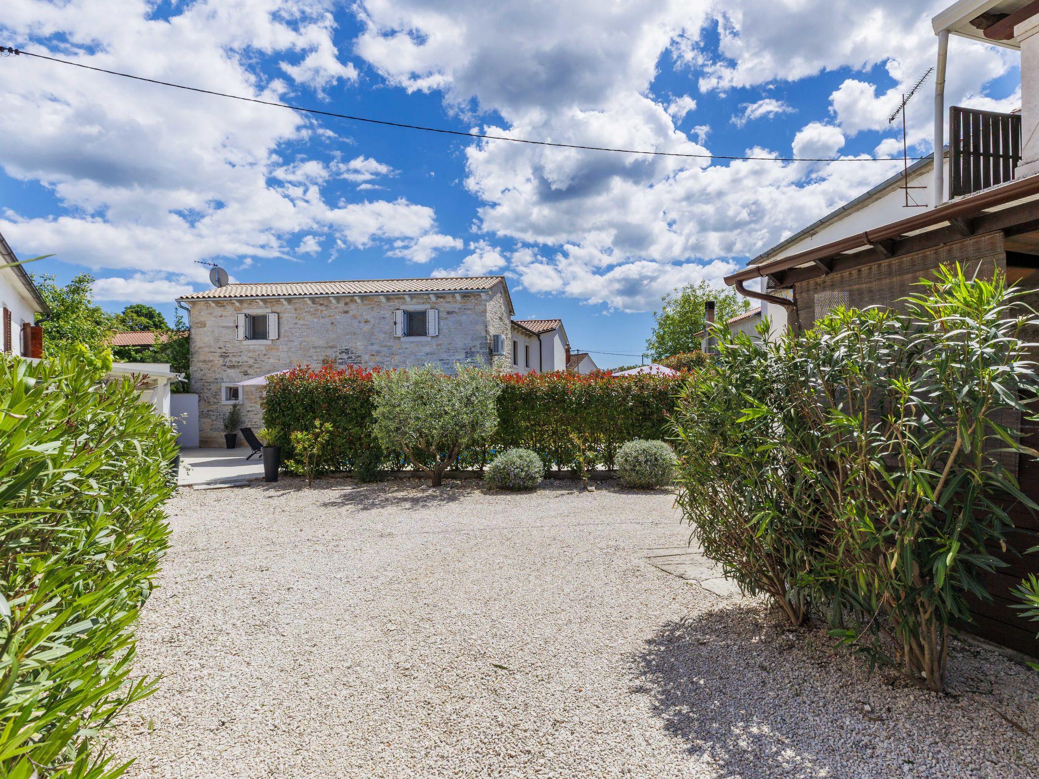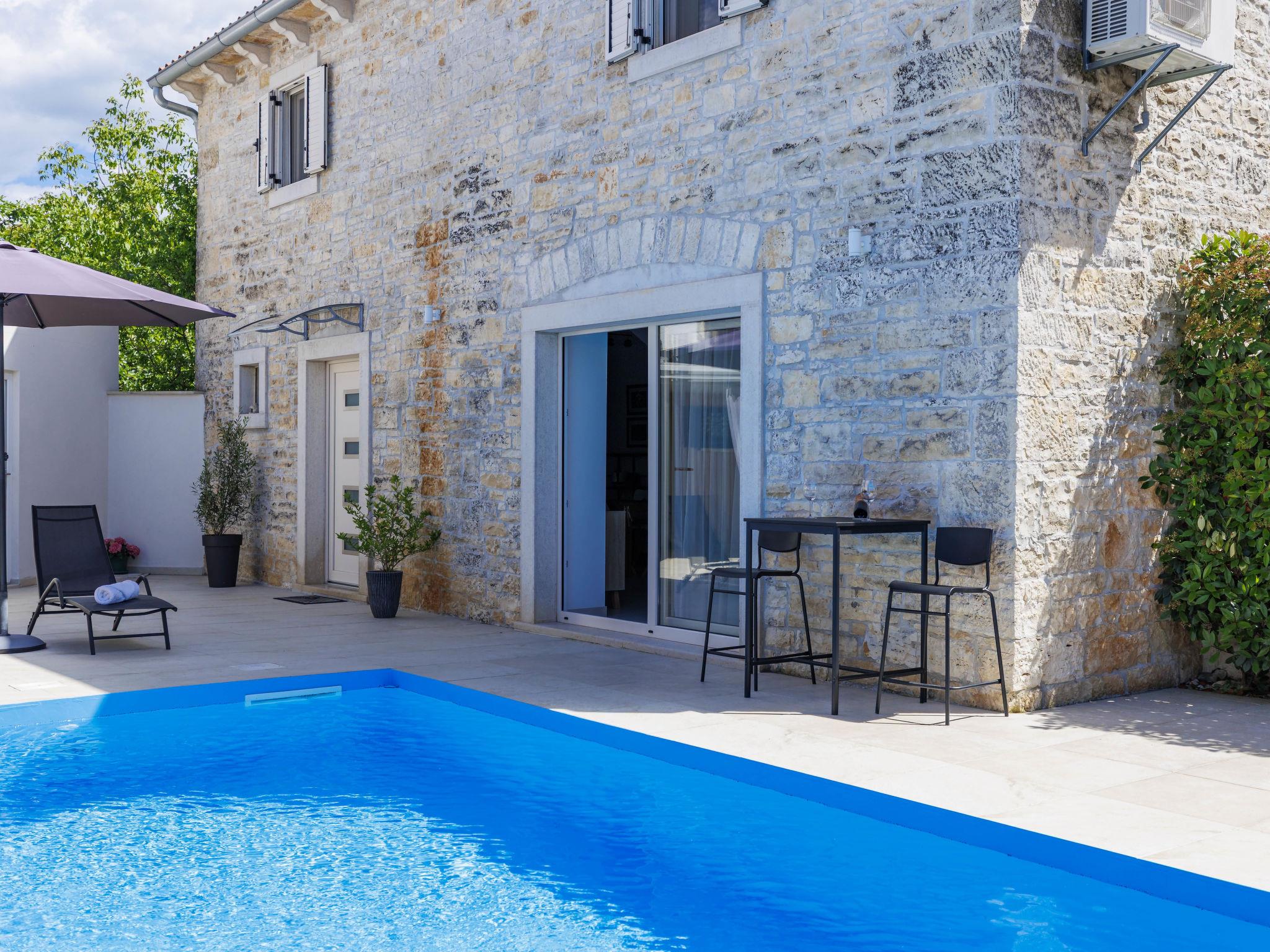 Single-family house "Villa Karmen", 2 storeys, renovated in 2019. In the hamlet Gljušcici 6 km from the centre of Žminj, 30 km from the centre of Rovinj, 28 km from the sea. Private: property 400 m2 (fenced), swimming pool angular (7 x 3 m, 24 m2, depth 130 cm, seasonal availability: 01.May. - 14.Oct.) with internal staircase. Outdoor shower, table tennis, terrace, garden furniture. In the house: internet access, washing machine. Parking (for 3 cars) on the premises. Shop 500 m, restaurant 1 km, bus stop 6.1 km, rocky beach 28 km.