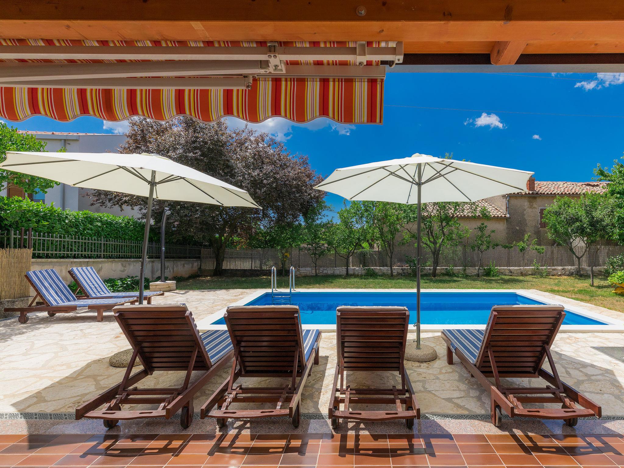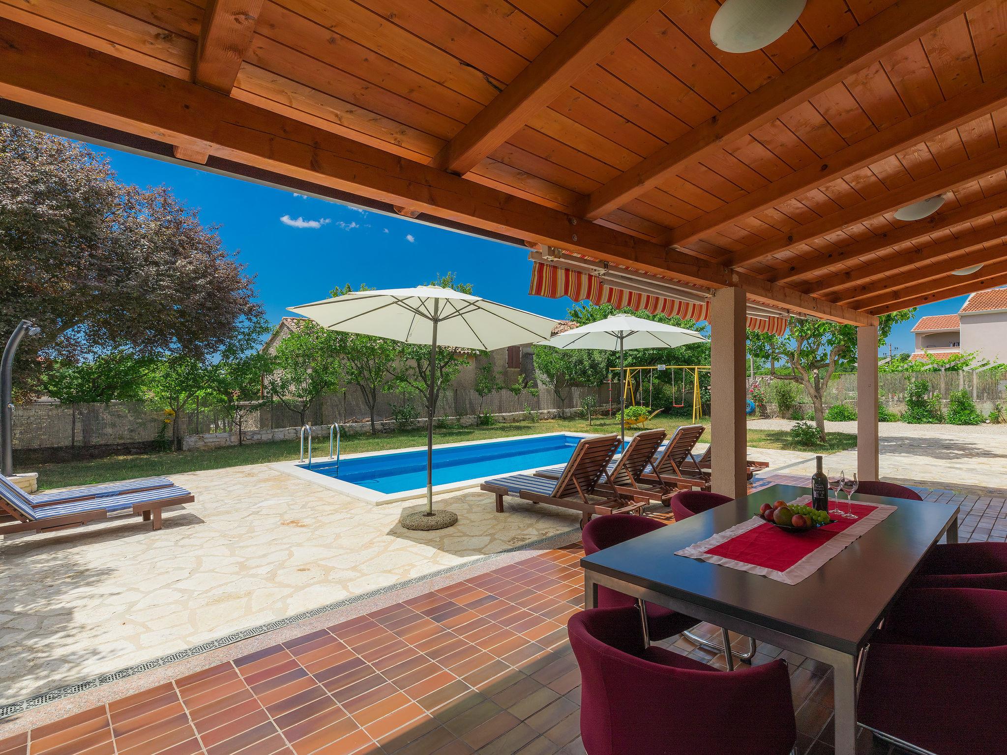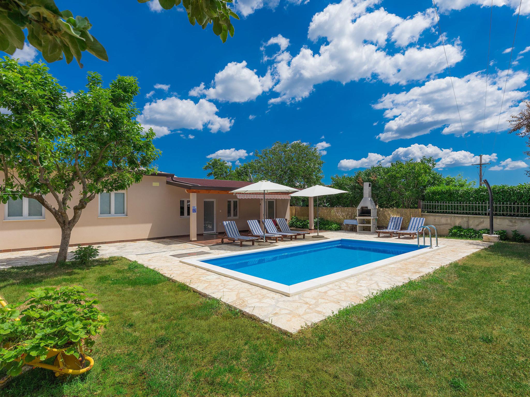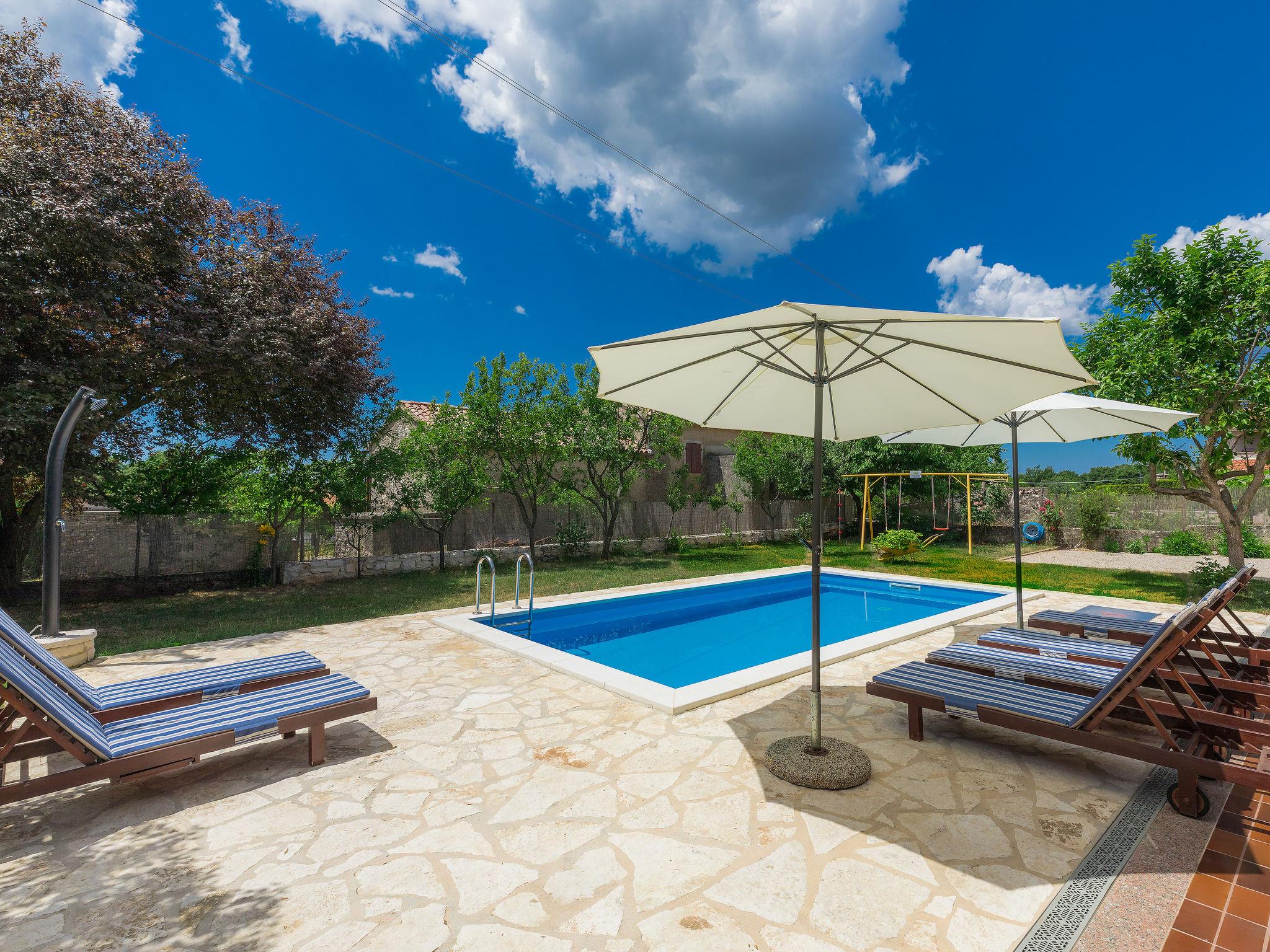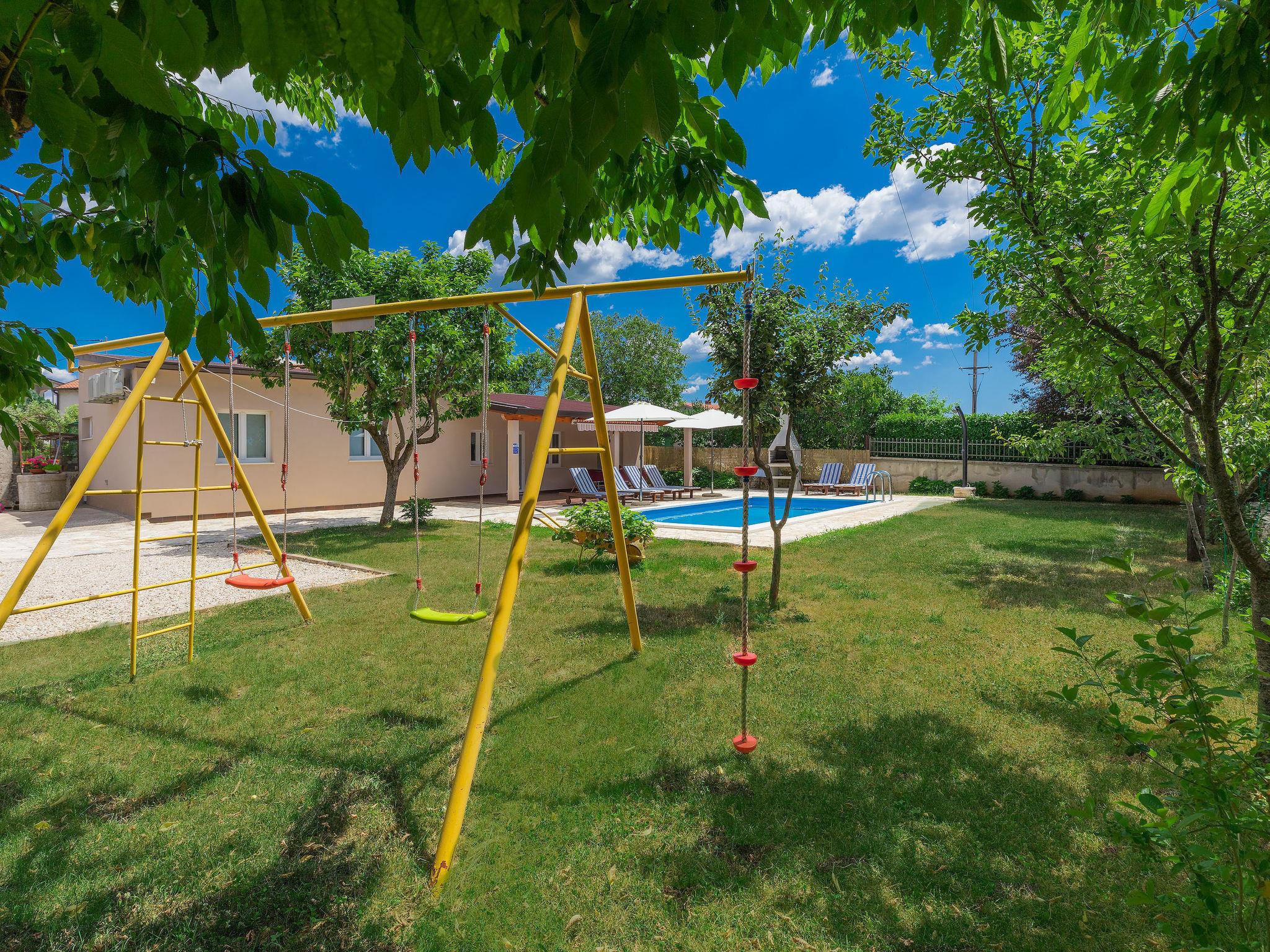 Sveti Petar u Šumi 28 km from Rovinj: Single-family house "Vrt", built in 2018. 600 m from the centre of Sveti Petar u Šumi, 6 km from the centre of Žminj, 28 km from the sea. Private: property 500 m2 (fenced) with lawn and trees, swimming pool angular (7 x 3 m, 24 m2, depth 140 cm, seasonal availability: 01.May. - 28.Oct.). Outdoor shower, terrace (27 m2), garden furniture, barbecue, children's playground (swing). In the house: internet access, washing machine. Parking (for 2 cars) on the premises. Shop 200 m, supermarket 6 km, bus stop 7.1 km, rocky beach 28 km. Please note: airfield 40 km from the property.