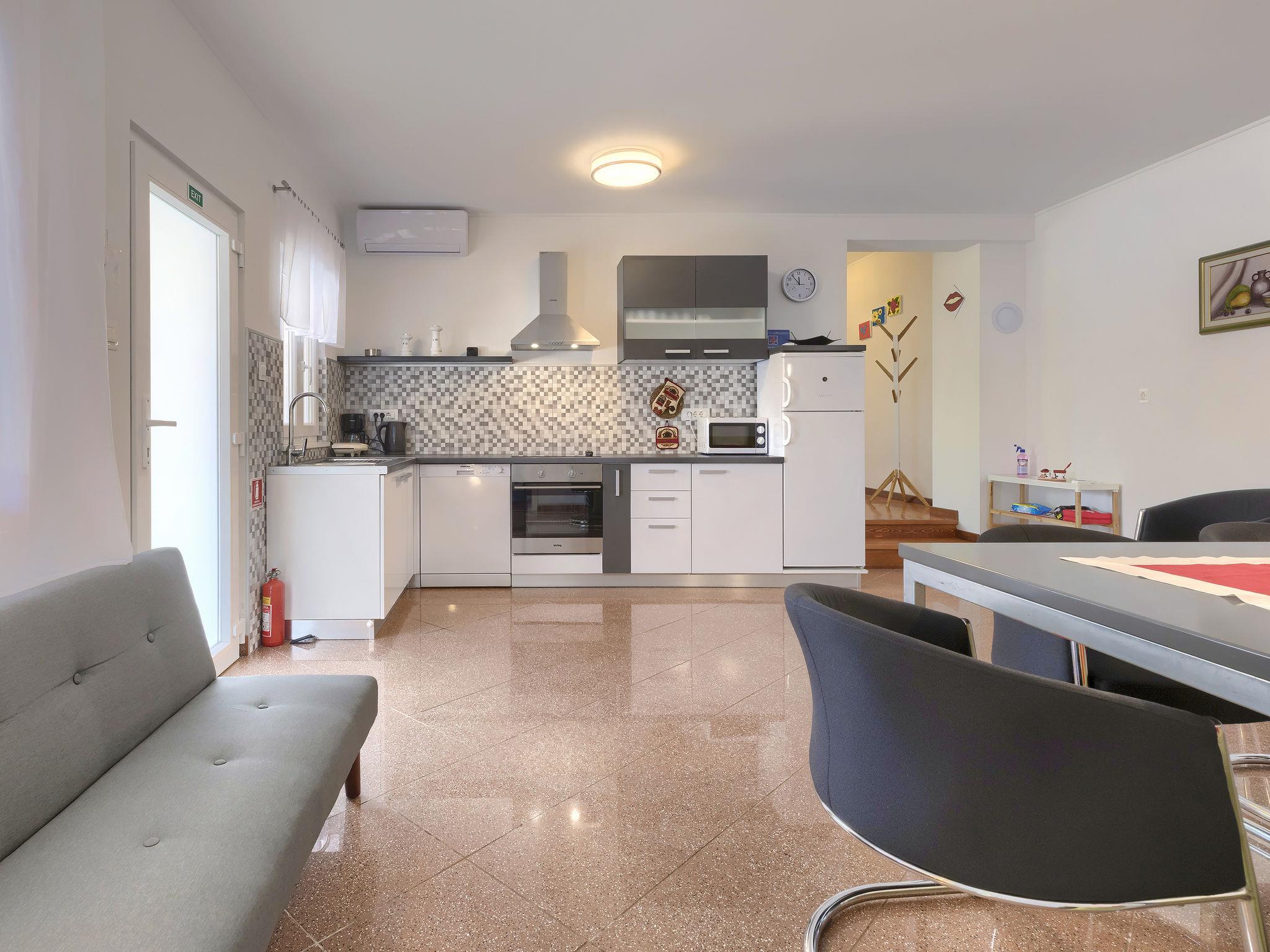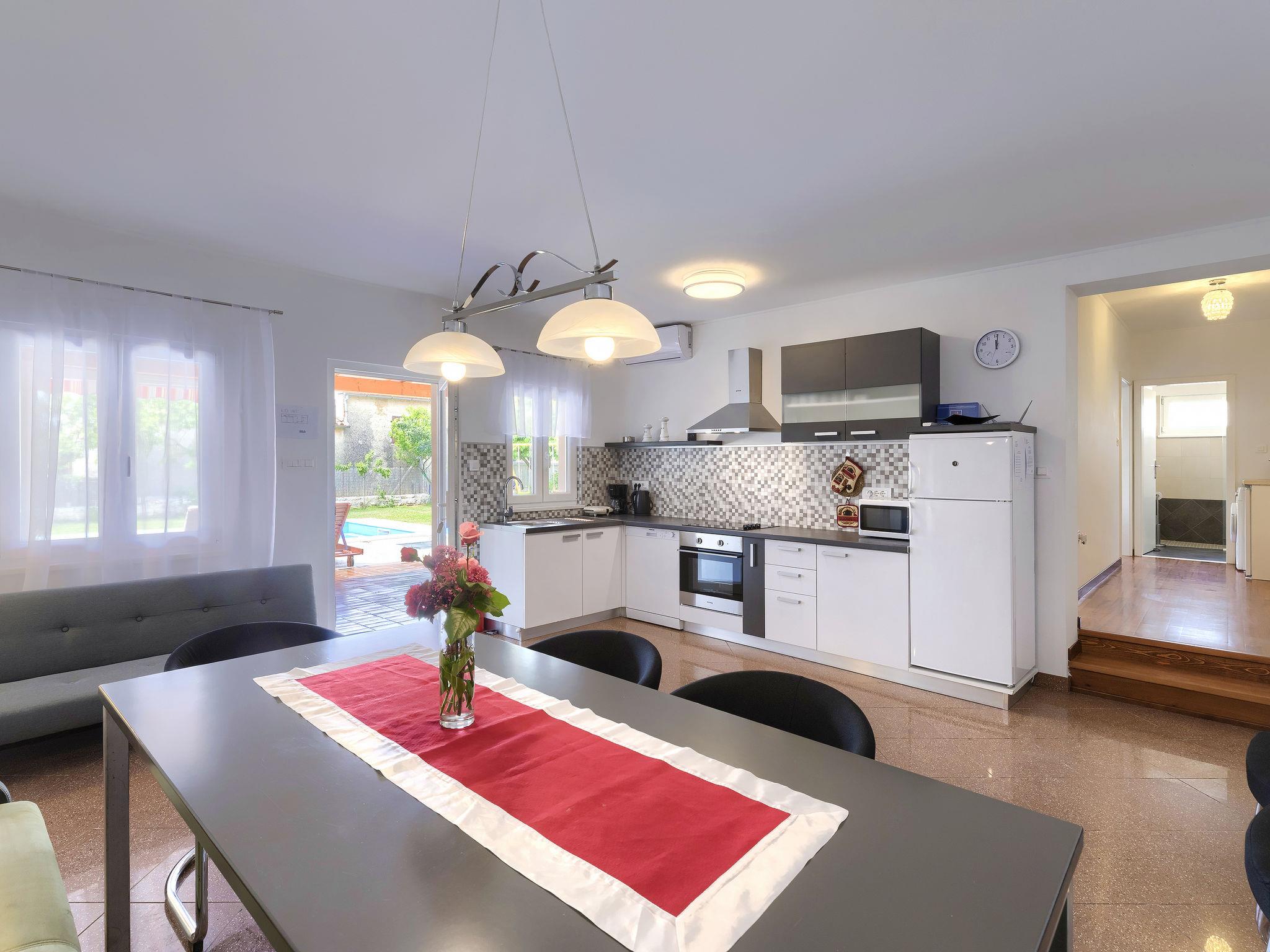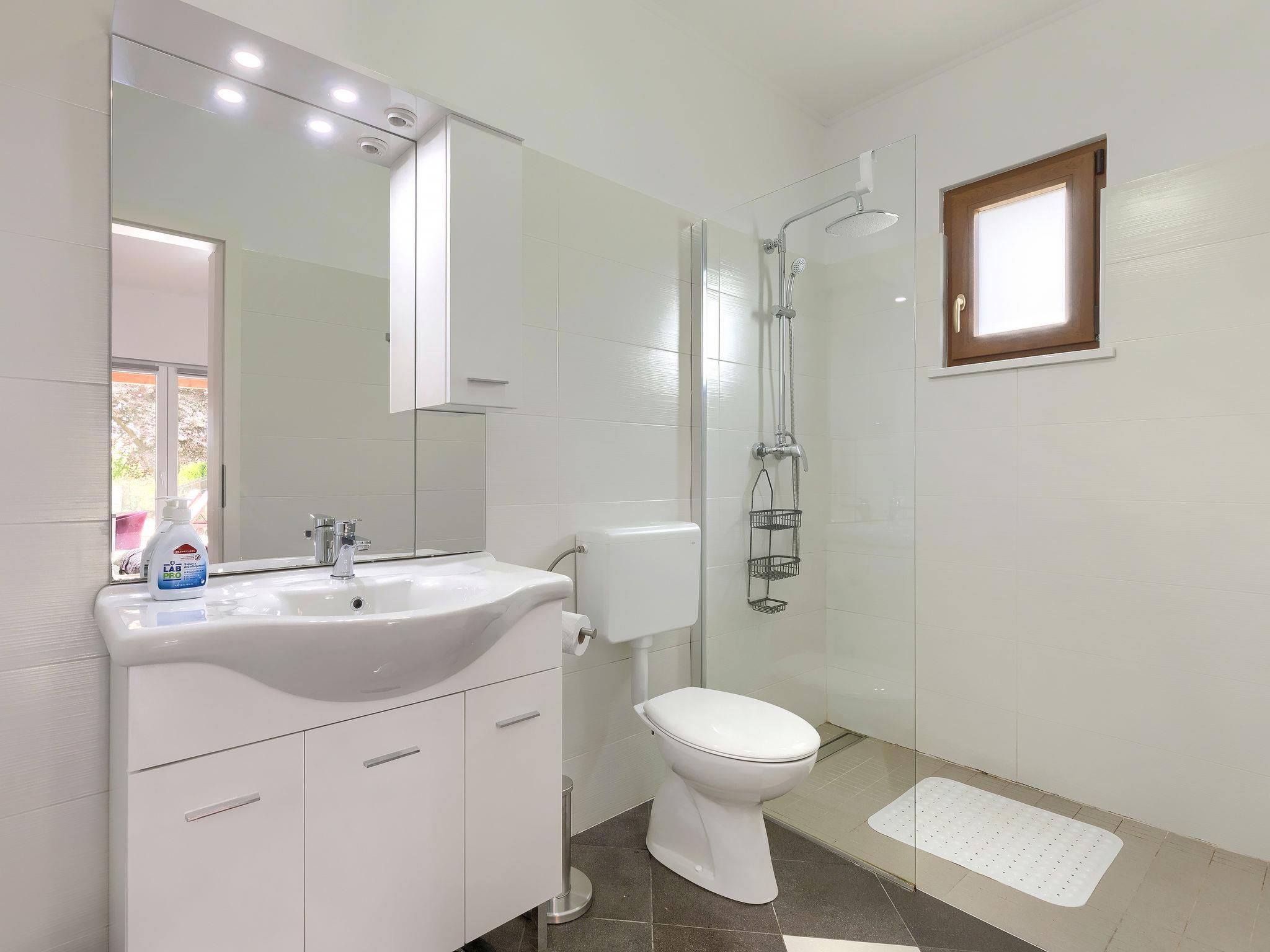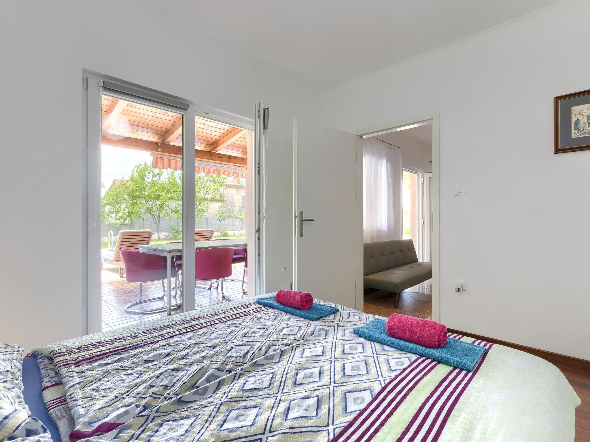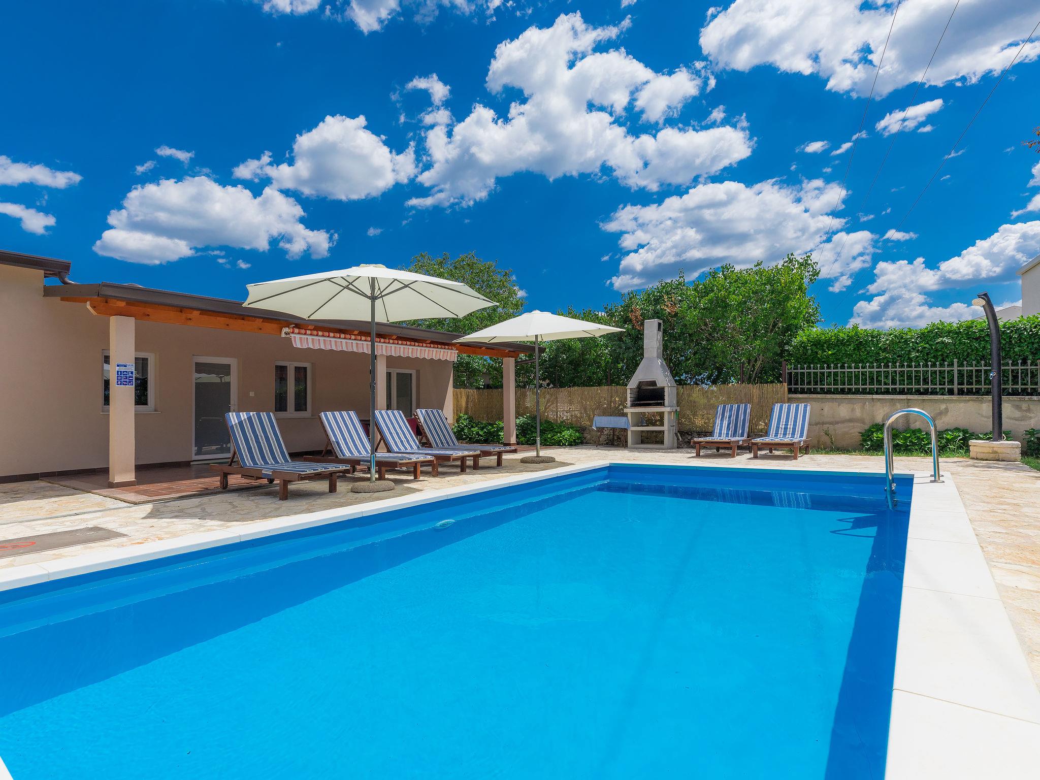 Sveti Petar u Šumi 28 km from Rovinj: Single-family house "Vrt", built in 2018. 600 m from the centre of Sveti Petar u Šumi, 6 km from the centre of Žminj, 28 km from the sea. Private: property 500 m2 (fenced) with lawn and trees, swimming pool angular (7 x 3 m, 24 m2, depth 140 cm, seasonal availability: 01.May. - 28.Oct.). Outdoor shower, terrace (27 m2), garden furniture, barbecue, children's playground (swing). In the house: internet access, washing machine. Parking (for 2 cars) on the premises. Shop 200 m, supermarket 6 km, bus stop 7.1 km, rocky beach 28 km. Please note: airfield 40 km from the property.