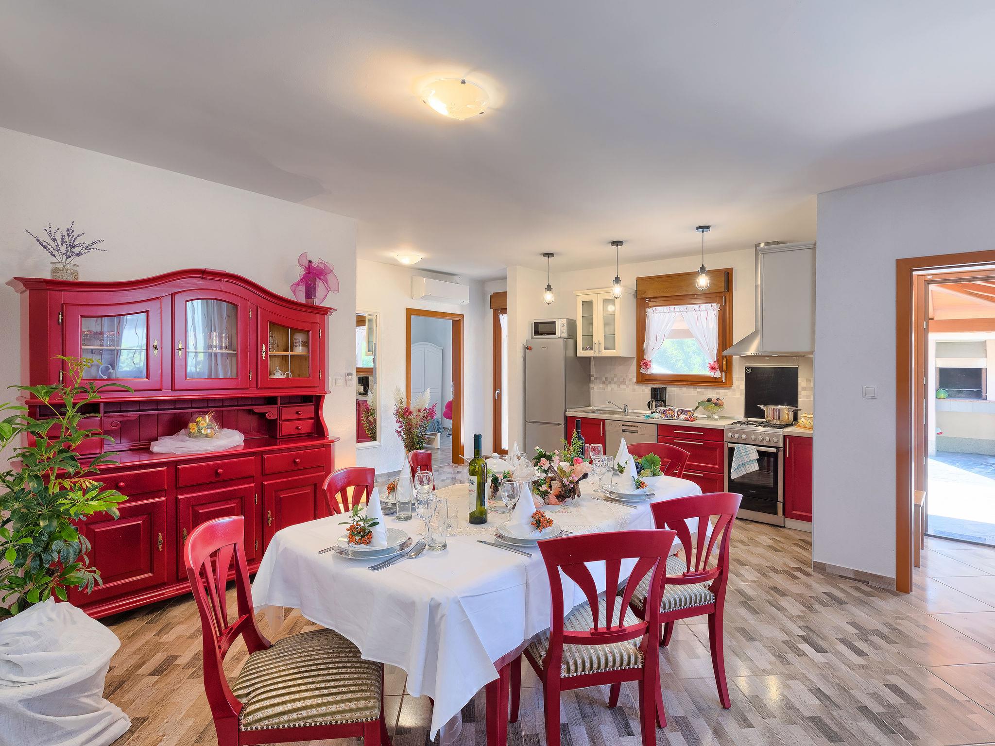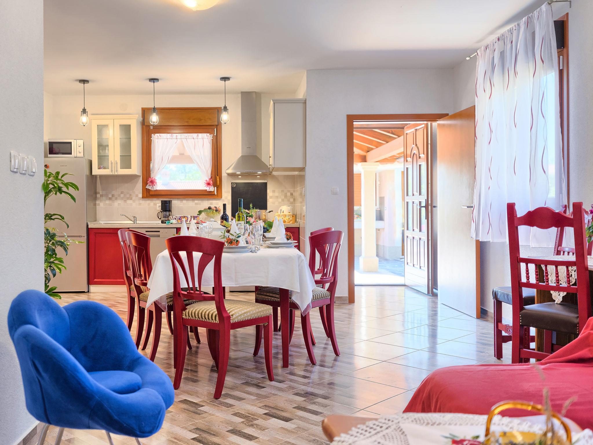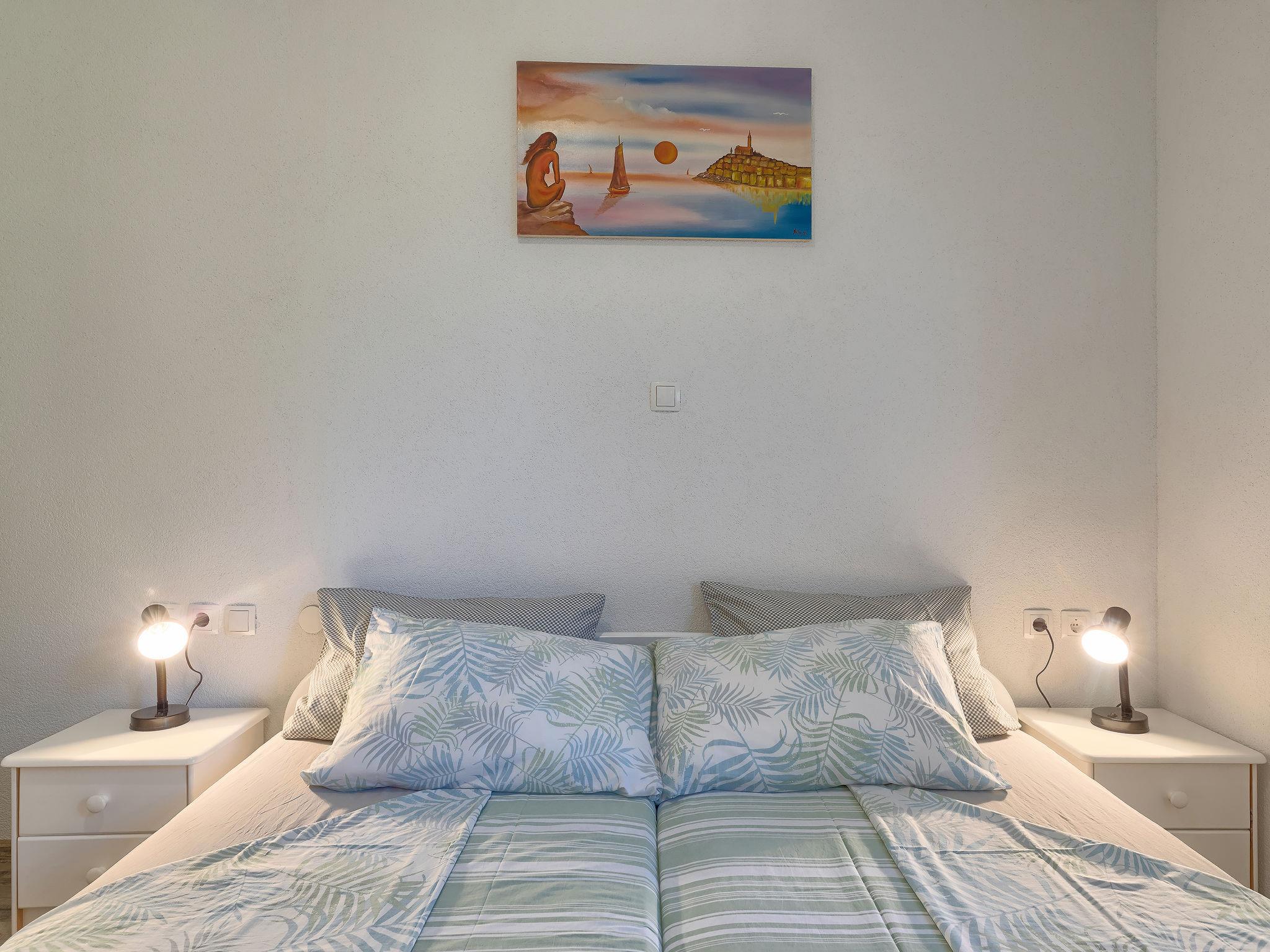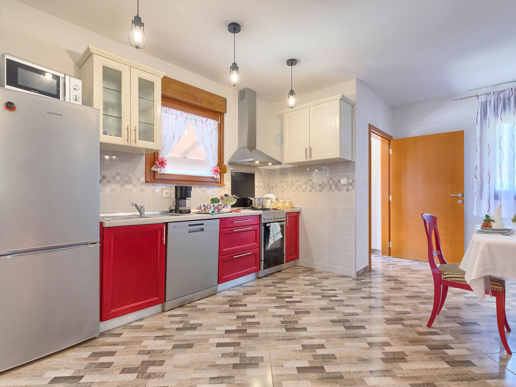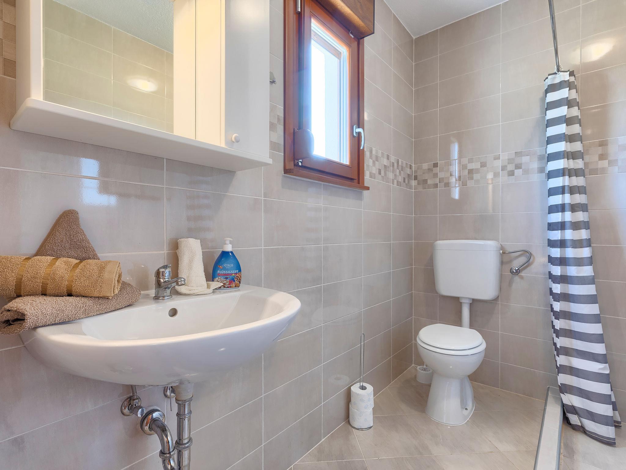 4-room house 95 m2. Living/dining room with satellite TV (flat screen), air conditioning. Exit to the terrace. 3 rooms, each room with 1 double bed and shower/WC. Open kitchen (1 hot plate, oven, dishwasher, 3 gas rings, toaster, kettle, microwave, freezer, electric coffee machine). Sep. WC. No heating option. Terrace 22 m2, roofed. Terrace furniture, deck chairs. Facilities: children's high chair, baby cot. Internet (WiFi, free). Please note: non-smoking house. Maximum 2 pets/ dogs allowed.