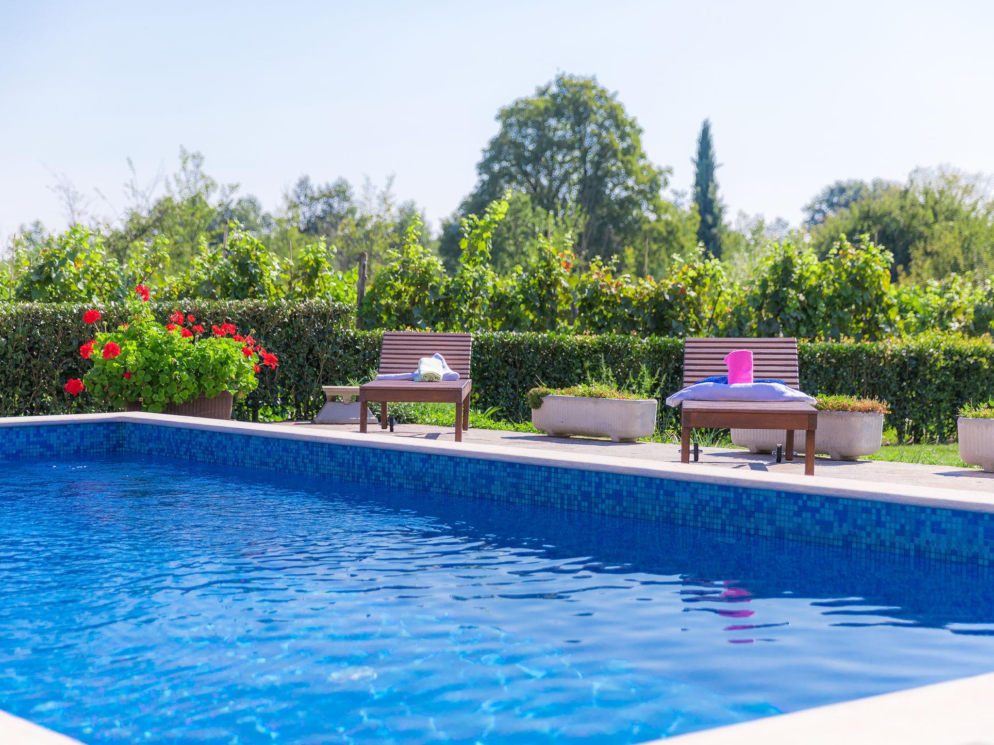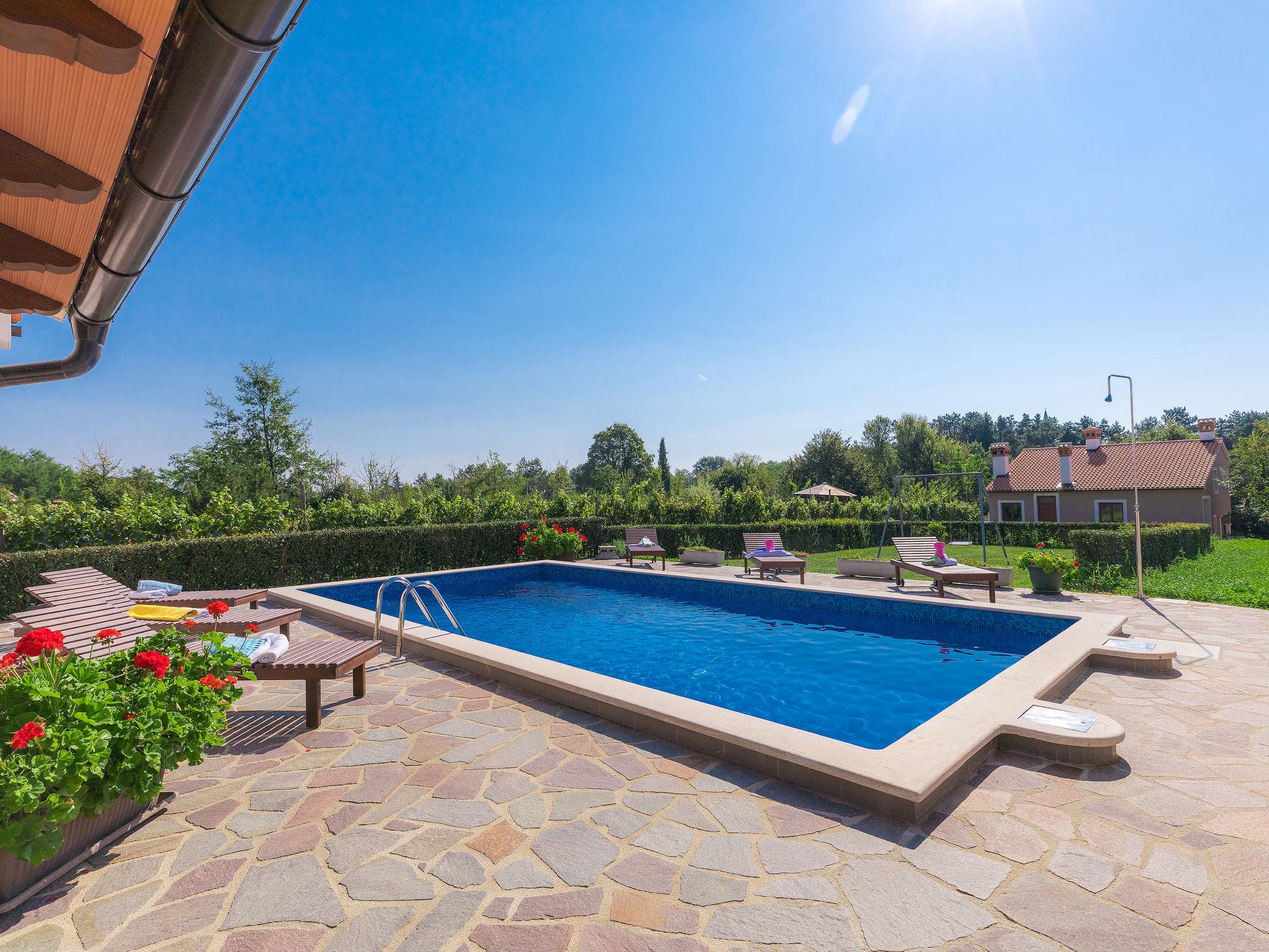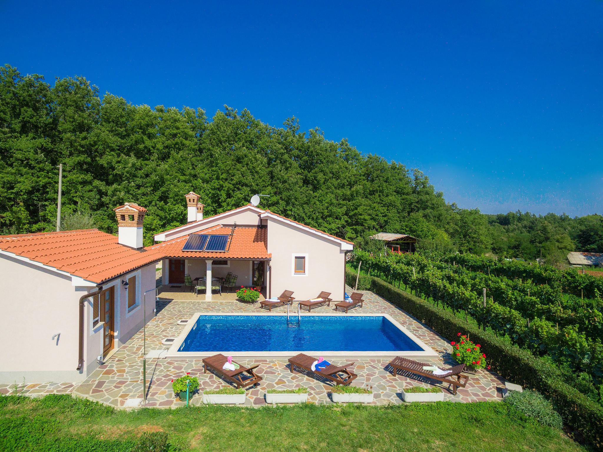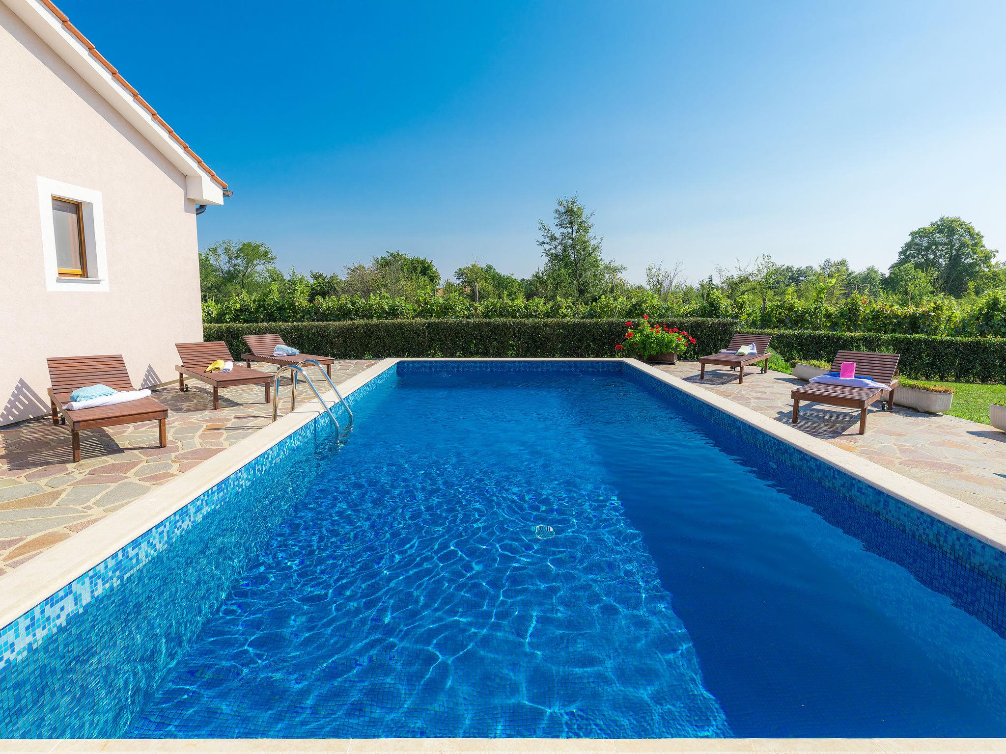 Single-family house "Villa Mihael", built in 2019. In the hamlet Laginji 1.4 km from the centre of Žminj, 25 km from the centre of Rovinj, 27 km from the sea. Private: property 600 m2 with lawn, swimming pool angular (8 x 4 m, depth 140 cm, seasonal availability: 15.May. - 07.Oct.). Outdoor shower, terrace, barbecue. In the house: internet access, washing machine. Parking (for 2 cars) on the premises. Shop 1.4 km, restaurant 1.4 km, bus stop 1.7 km, pebble beach 27 km. Marina 25 km. Please note: airfield 38 km from the property.