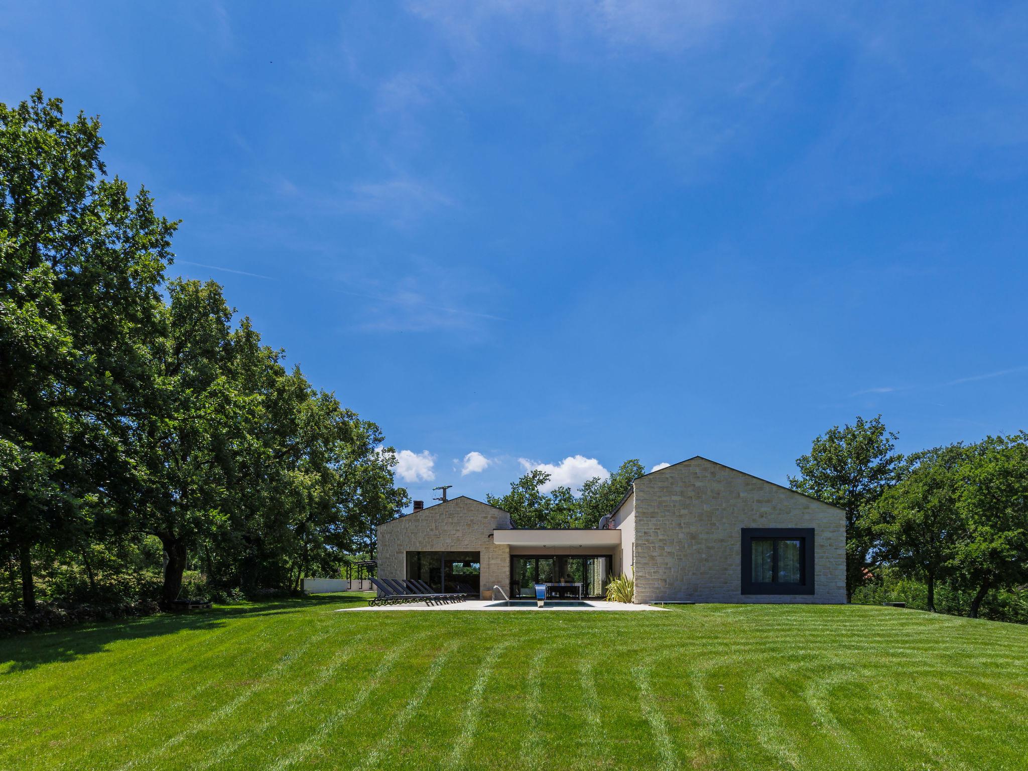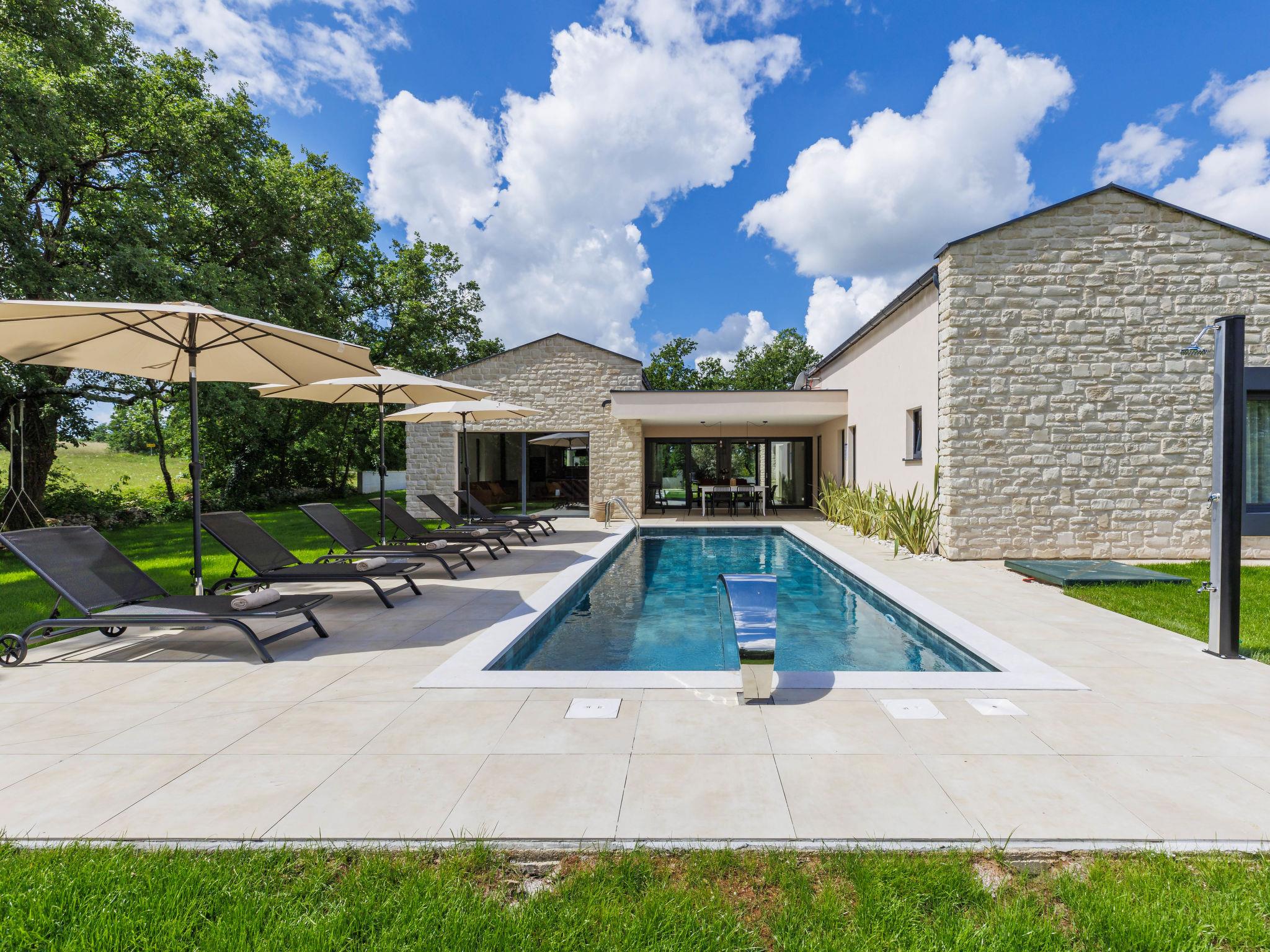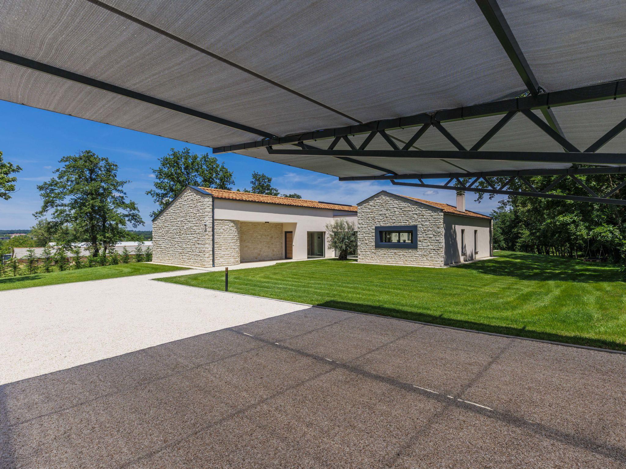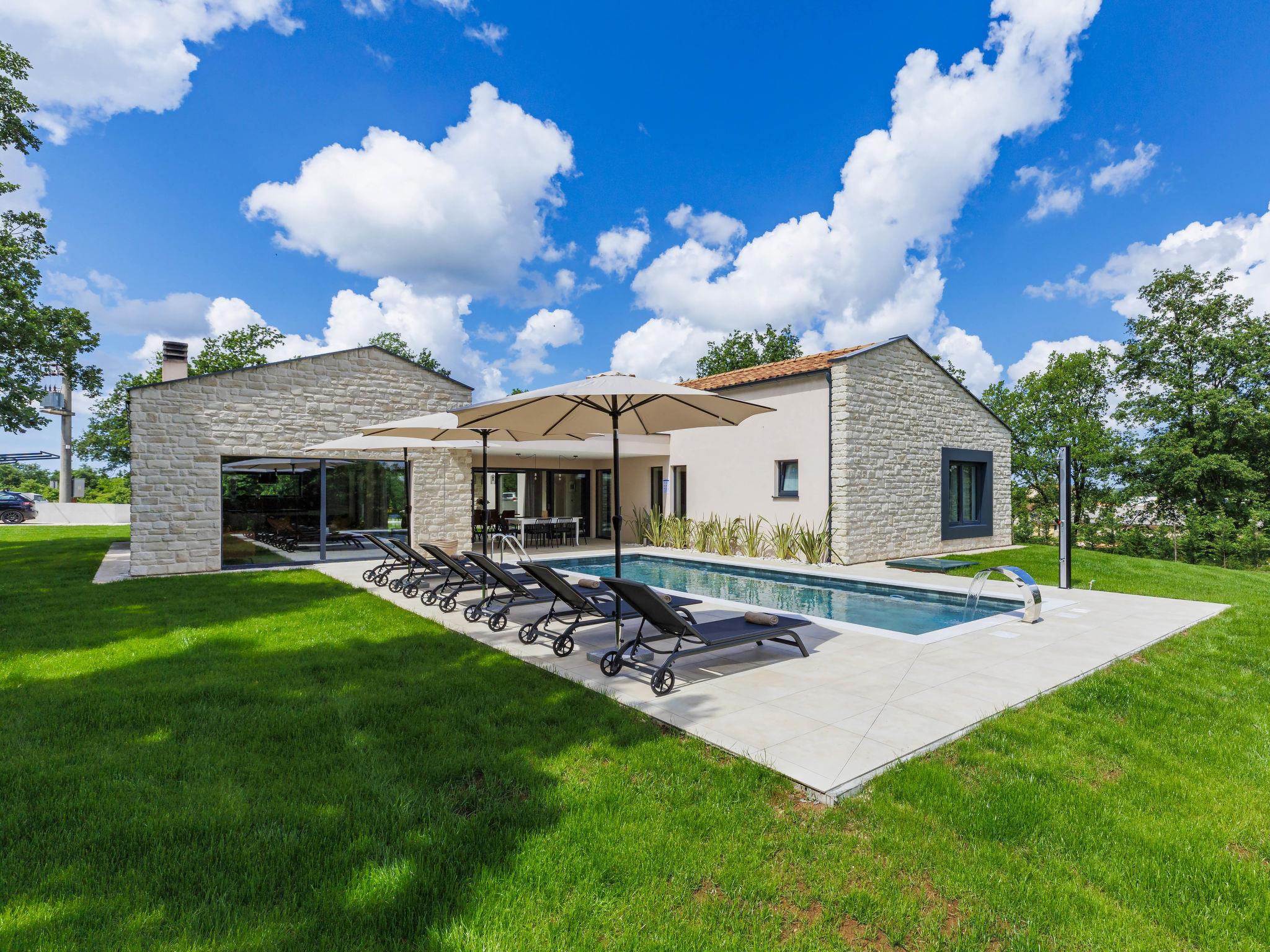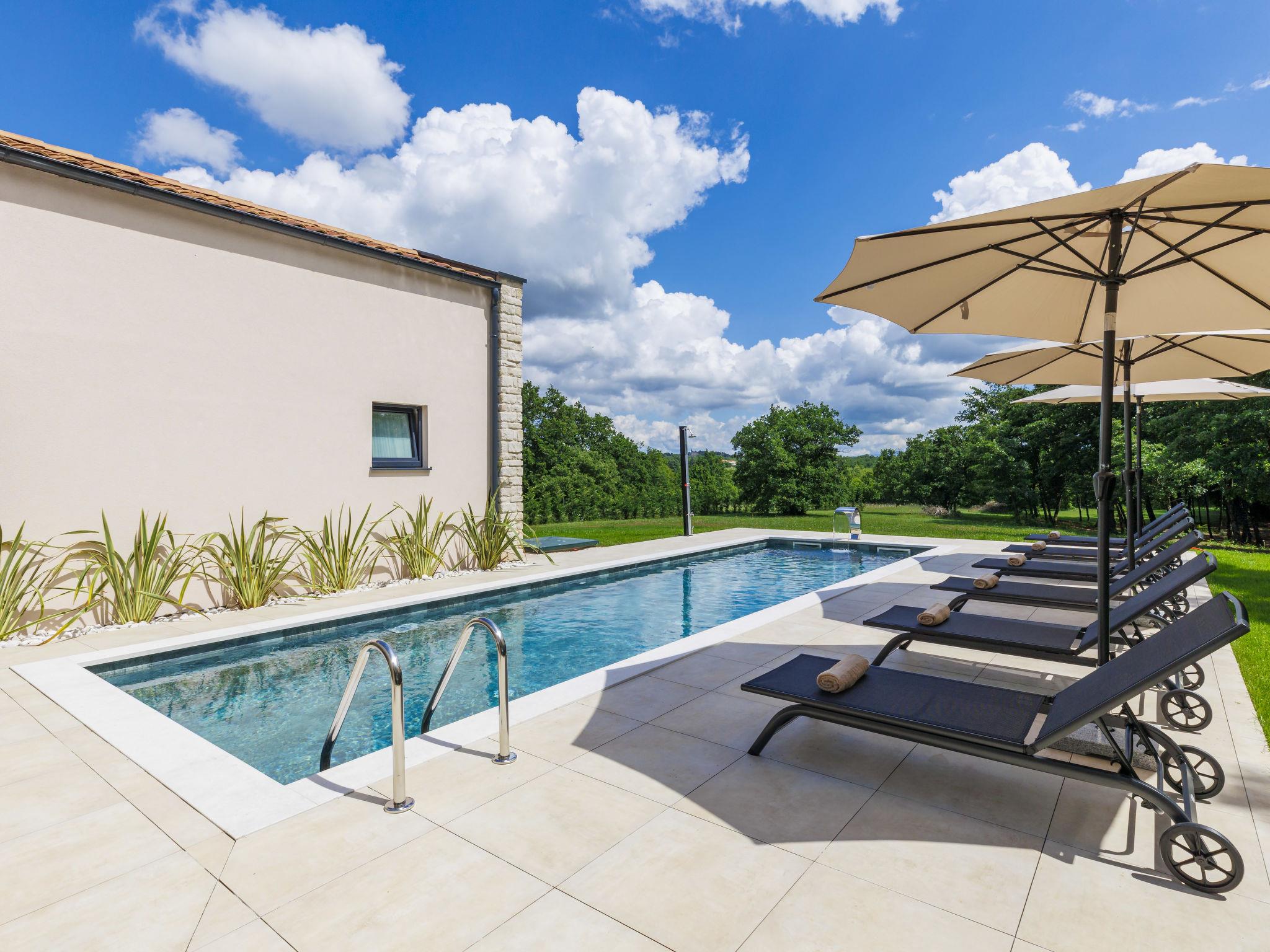 Luxurious villa "Ana", detached, built in 2023. In a hamlet 1.4 km from the centre of Žminj, 25 km from the centre of Rovinj, 25 km from the sea. Private: property 7'200 m2, swimming pool angular (10 x 3 m, 32 m2, seasonal availability: 11.May. - 28.Sep.) with internal staircase. Outdoor shower, garden furniture, barbecue. In the house: internet access, washing machine. Parking (for 2 cars) at the house on the premises. Shop 1.4 km, supermarket 2.5 km, restaurant 1.4 km, bus stop 1.7 km, pebble beach 25 km. Marina 25 km. Please note: airfield 38 km from the property.