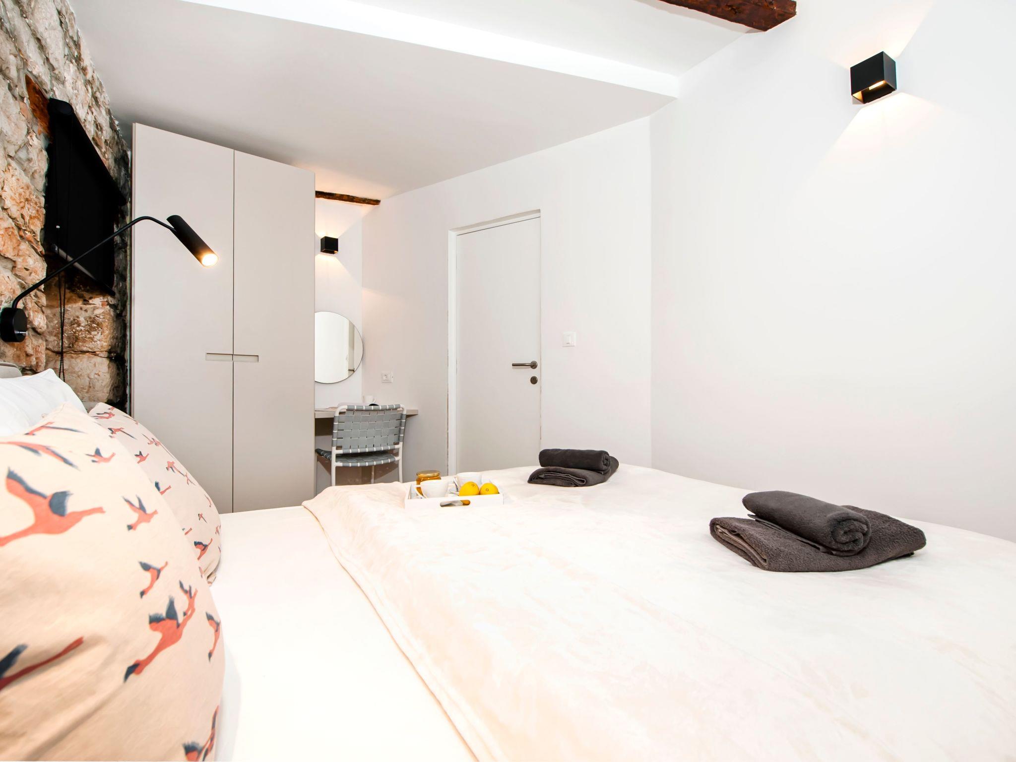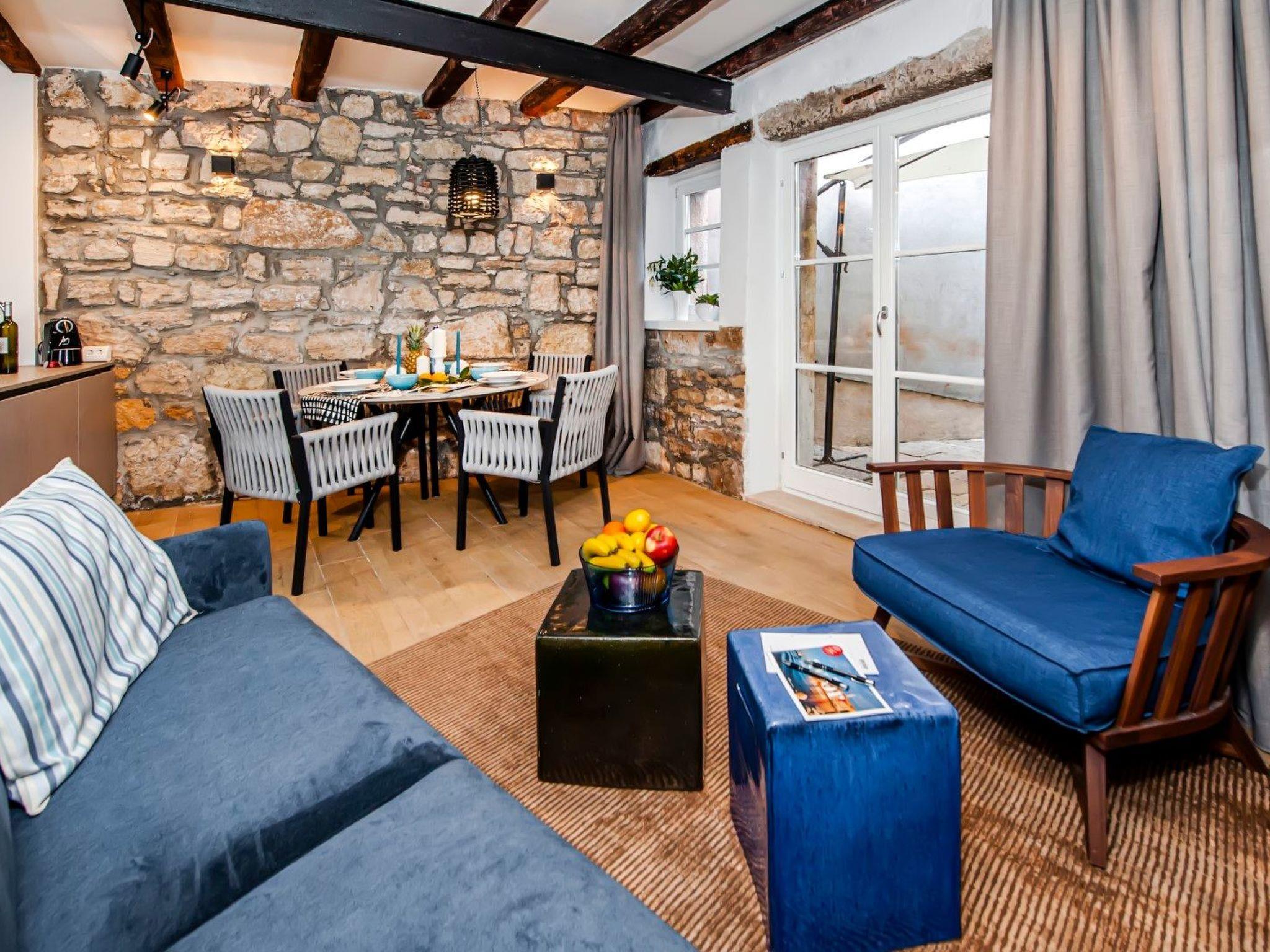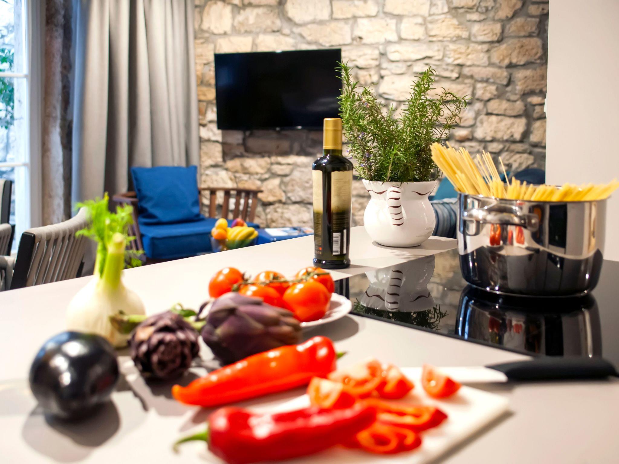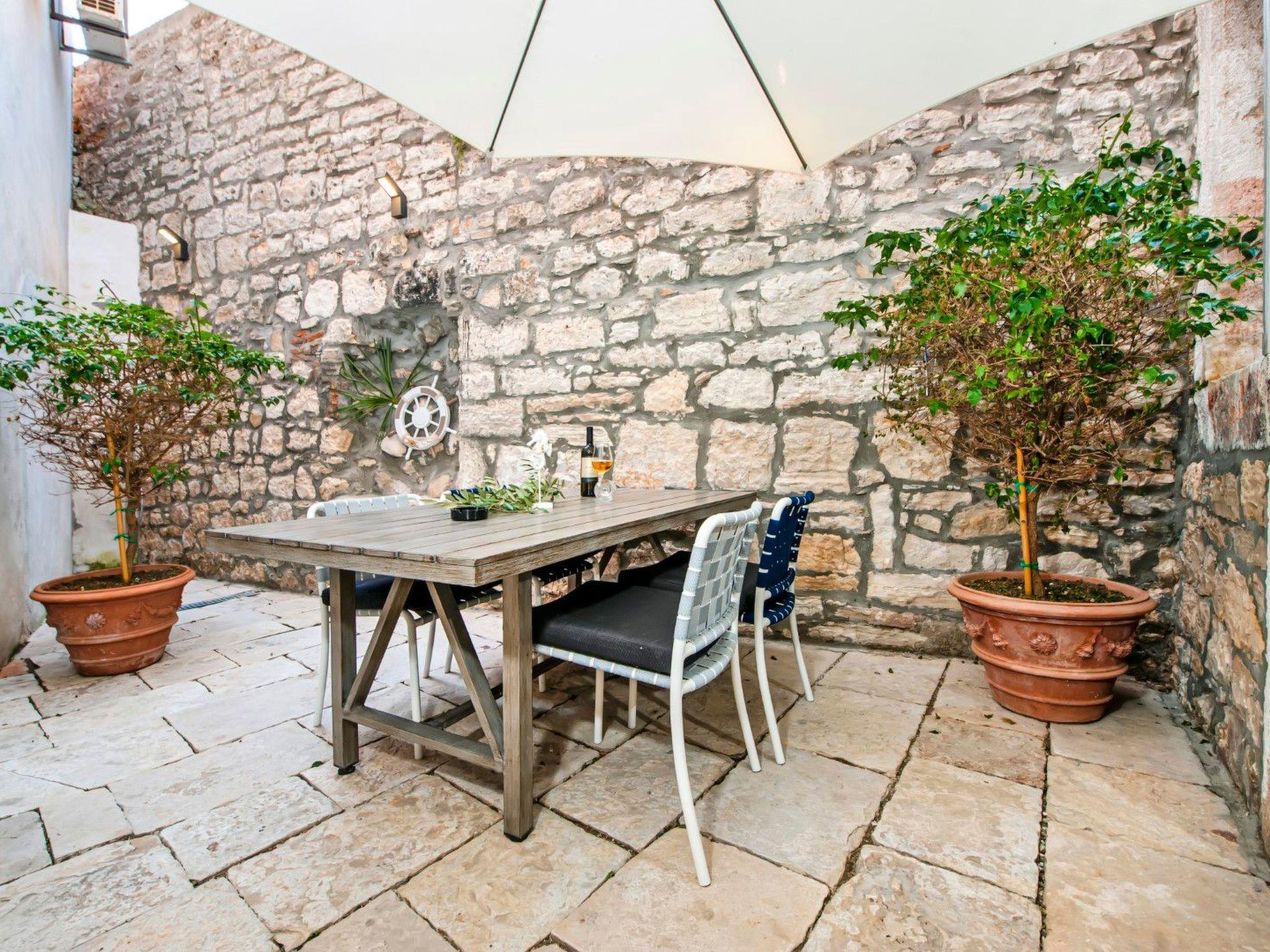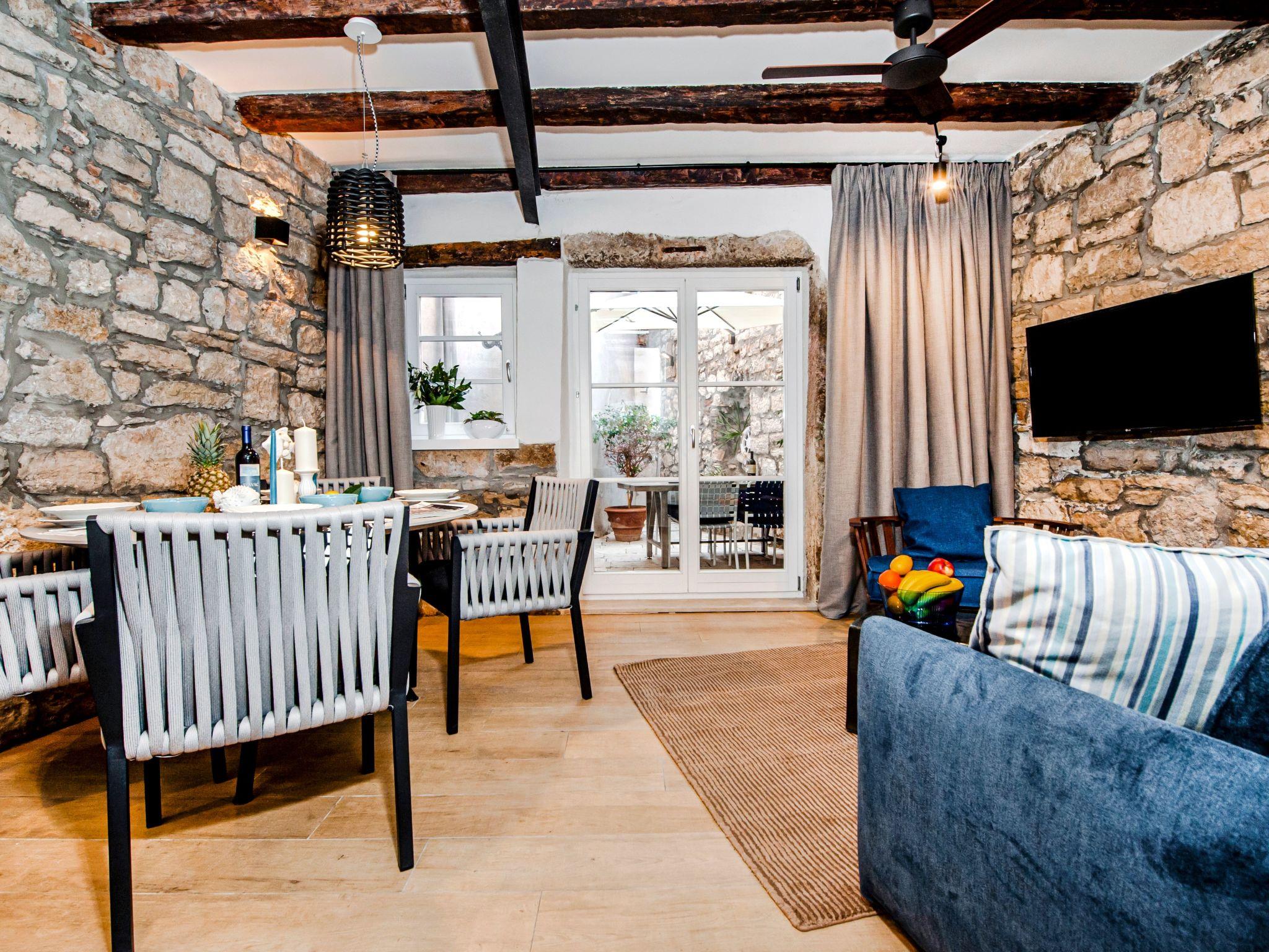 The apartment's exterior is equally impressive, boasting a beautifully preserved terrace. Here, the original stone floors, dating back to the time when the space was used for storing freshly caught fish, invite guests to step back in time. This historical detail adds an authentic touch to outdoor gatherings, making every moment spent here truly memorable.