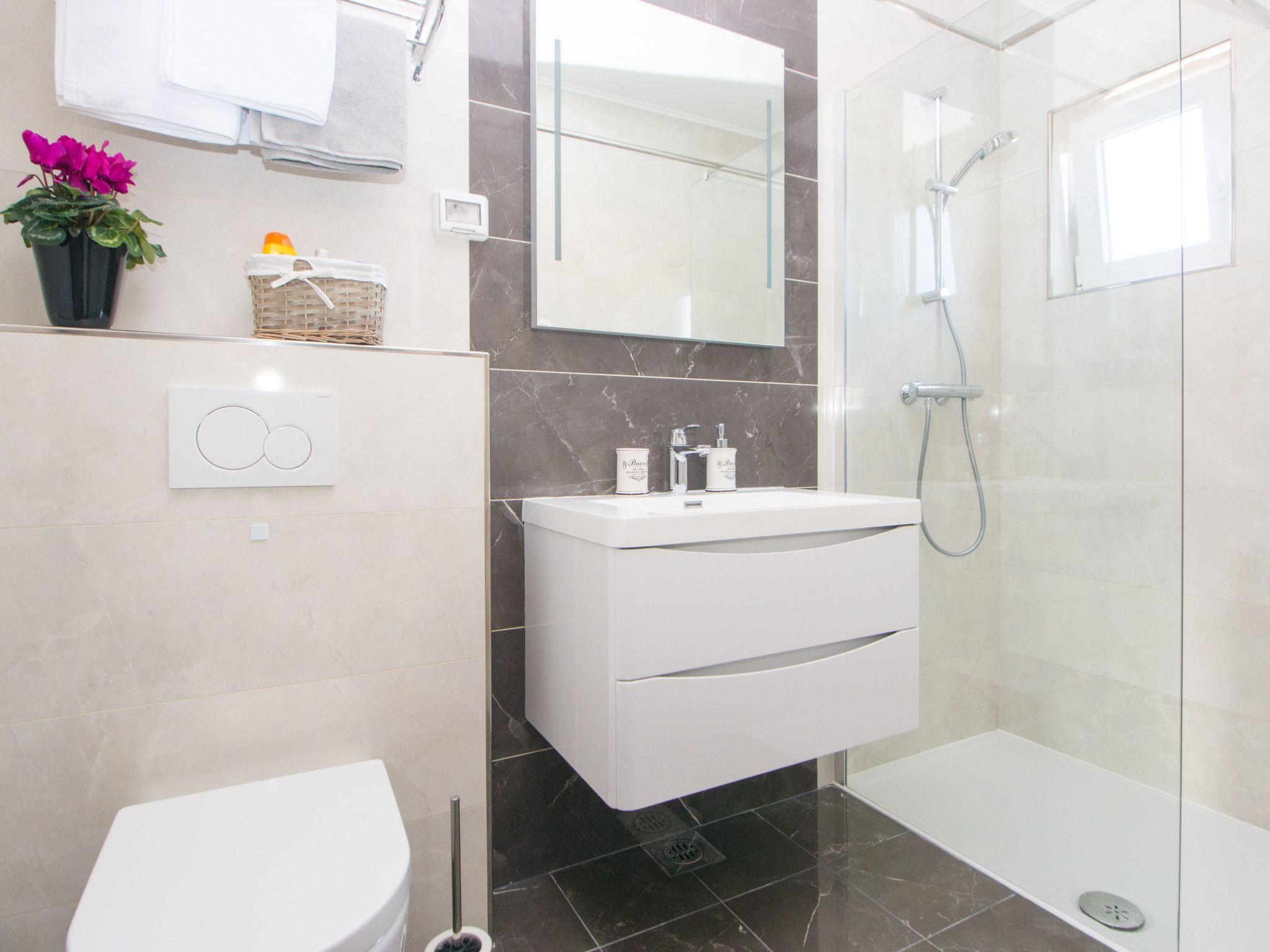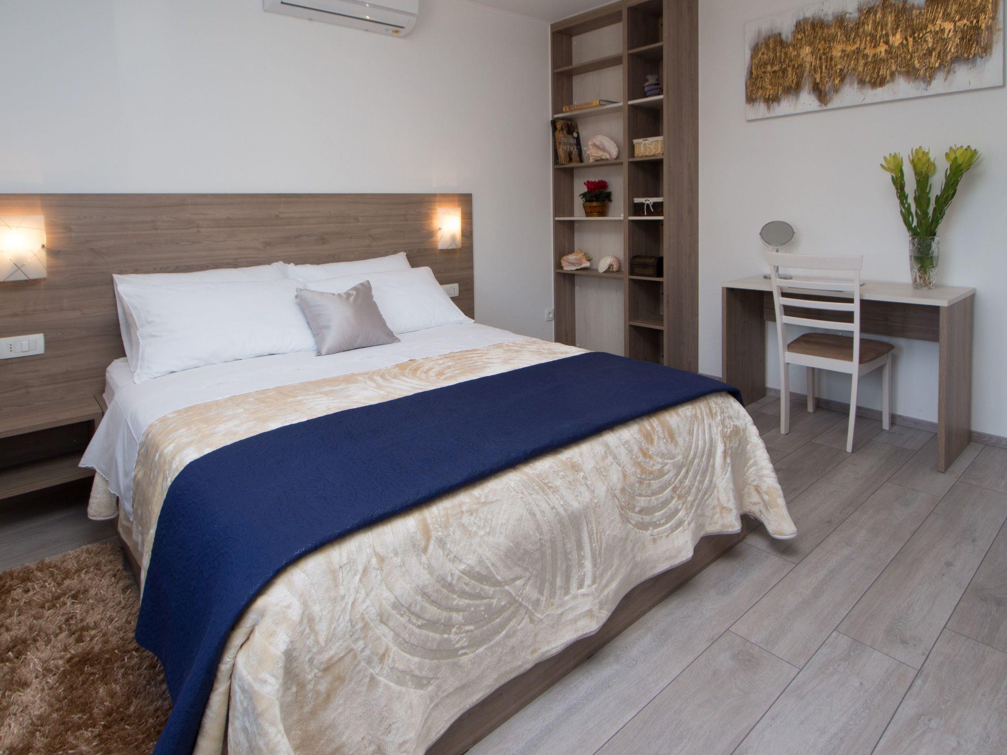 The 55m² holiday apartment is on the upper floor of a two-storey residential house. The lower floor is occupied by a Croatian family, while the owner lives in the apartment next door. Fully renovated just recently in 2019, the apartment offers all modern amenities, including air conditioning units in the living room and bedroom and WiFi Internet access in all rooms. The apartment consists of an open-plan living and dining room with an integrated, fully-equipped kitchen and a bedroom with a top modern bathroom. The living room provides a comfortable sofa, an armchair, a flat-screen TV with satellite channels and a stereo system. The sofa can be converted into a bed for a third guest (approx. 120 x 200cm). Next to the dining space is an adjoining modern built-in kitchen with only the latest of appliances: ceramic hob (induction) with a cooker hood, a fridge with a freezer compartment, a kettle and a coffee machine. The bedroom is furnished with a double bed (160 x 200cm), a wall cupboard with ample storage space for your clothing and luggage, as well as a desk and a large mirror. The top modern, tasteful cream/brown tiled bathroom has a generous walk-in shower cubicle, a washbasin with a cupboard underneath and a wall mirror, a hairdryer and a toilet.