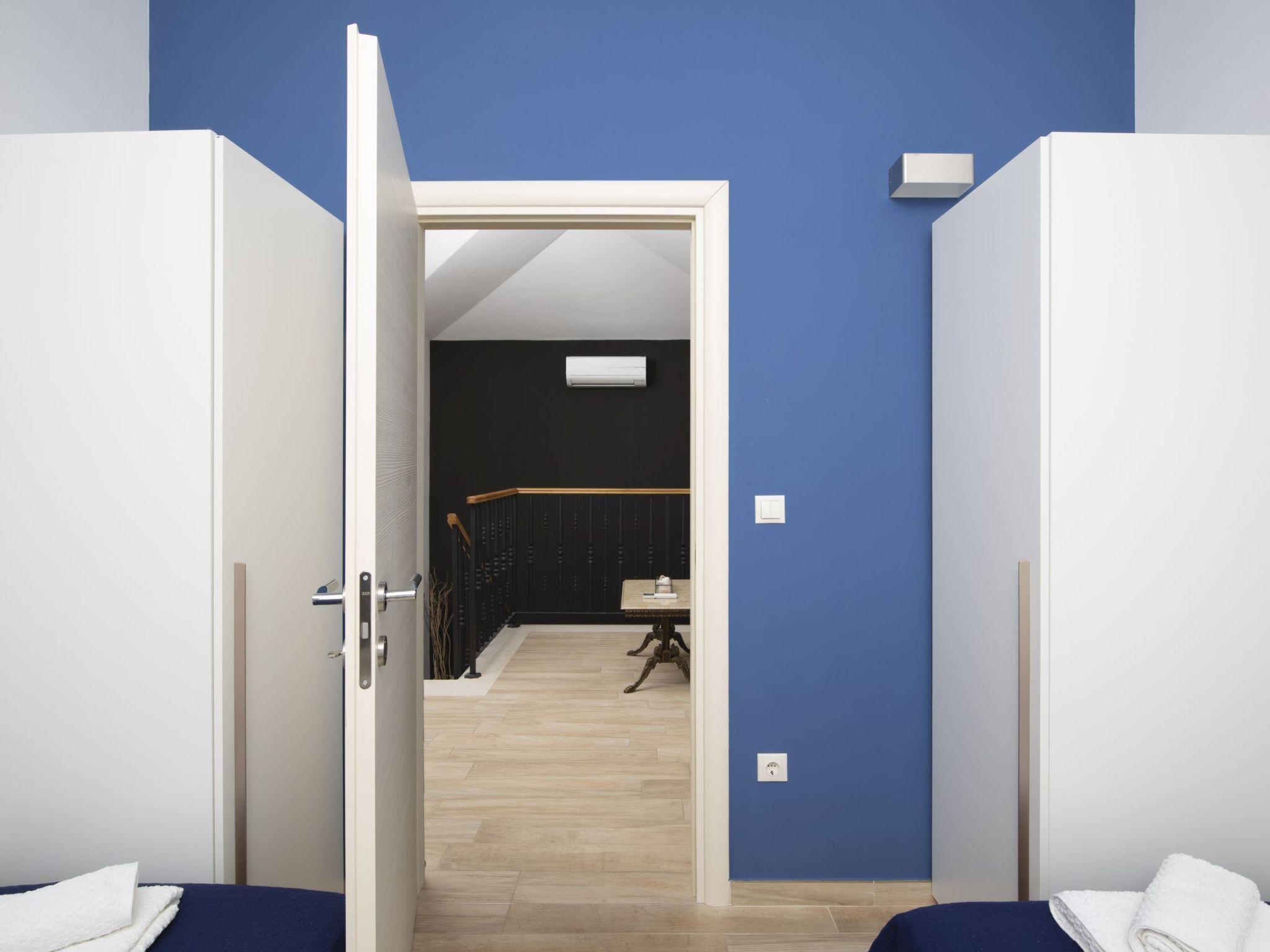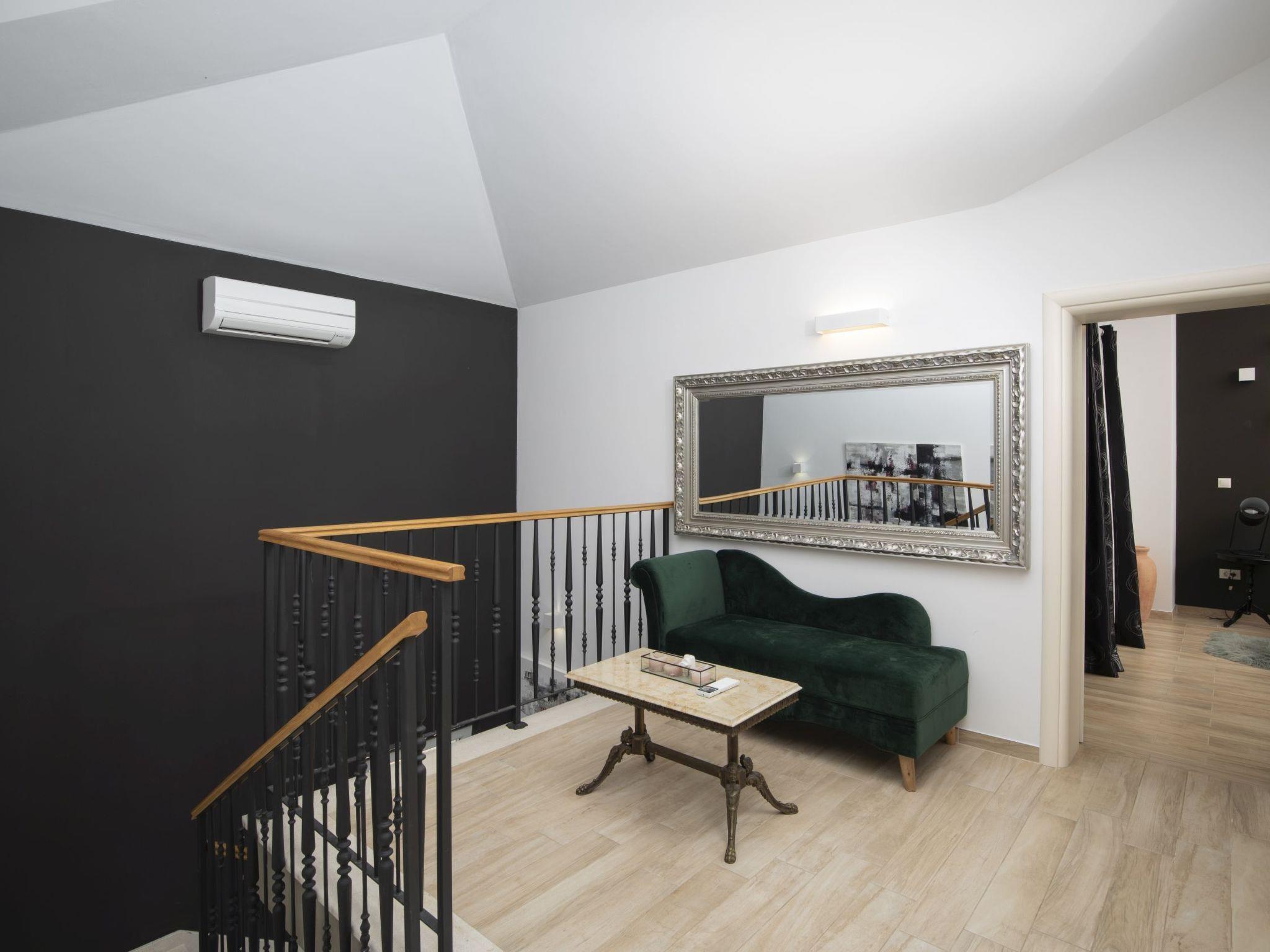 The villa is equipped with three air conditioning units: one in the poolside bedroom, one in the ground-floor living room, and one on the first floor.