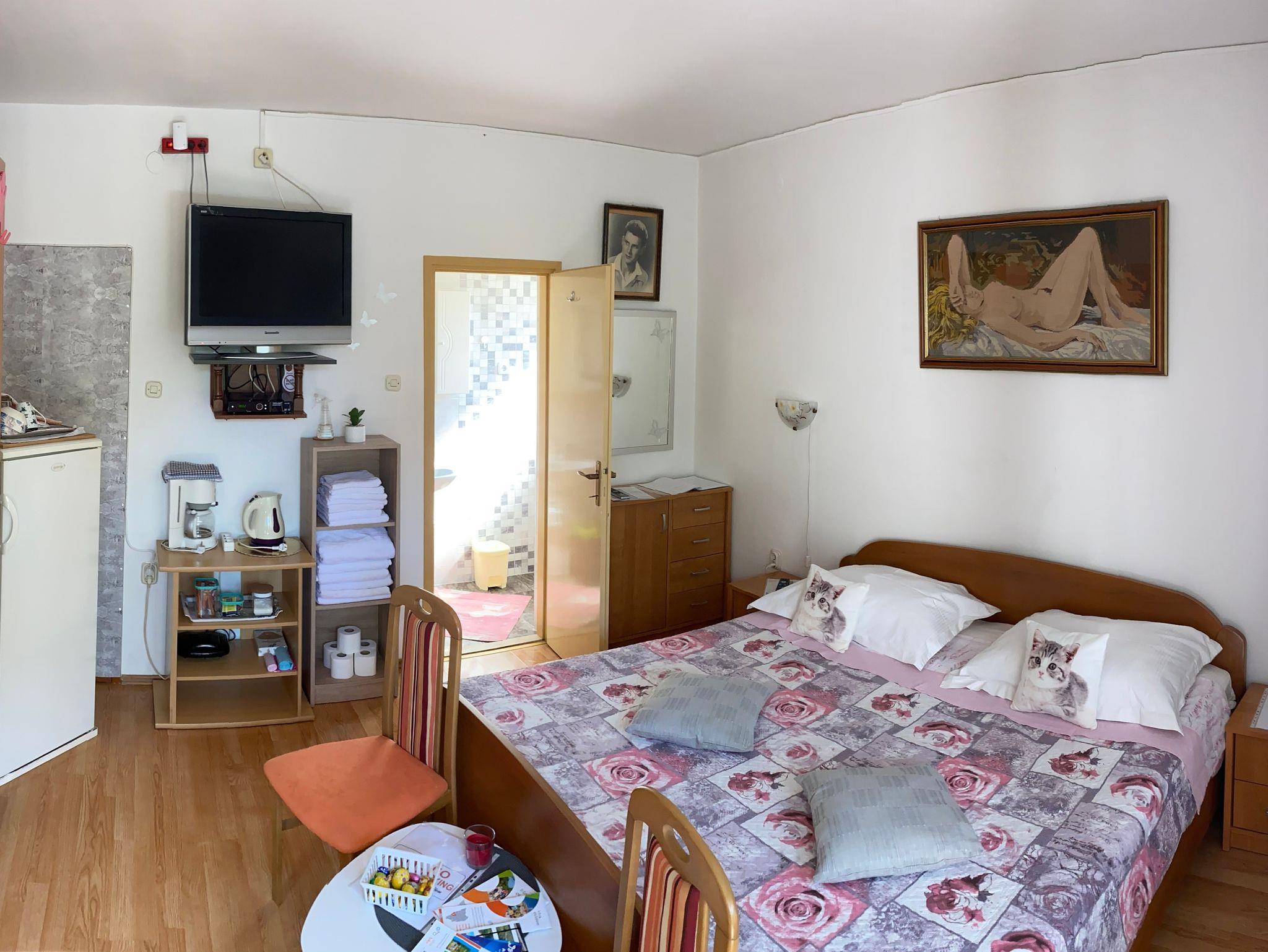 Zimmer bietet Platz für 2 Gäste. Die Betten sind in Schlafzimmern, die es 1 gibt, innerhalb einer Gesamtfläche von 20m2, angeordnet. Die Gäste haben eine eigene Terrasse zur Verfügung, auf der sie in warmen Sommernächten genießen können. Es ist erlaubt, Speisen auf dem Gemeinschafts-Grill vorzubereiten. Die reservierte Unterkunftseinheit ist ein Zimmer mit eigenem Badezimmer ohne die Möglichkeit der Nutzung einer Küche. IM PREIS INBEGRIFFEN: Kurtaxe, Endreinigung, Parkplatz, Internet, Bügeleisen, Föhn. Die Verfügbarkeit zusätzlicher Dienstleistungen in Ihrem reservierten Termin und die Preise derselben (falls nicht aufgeführt) müssen im Voraus überprüft werden. Zusätzliche Dienstleistungen die in der Zahlungsaufforderung nicht aufgeführt sind werden direkt beim Vermieter bezahlt, angenommen der Gast nutzt auch diese.