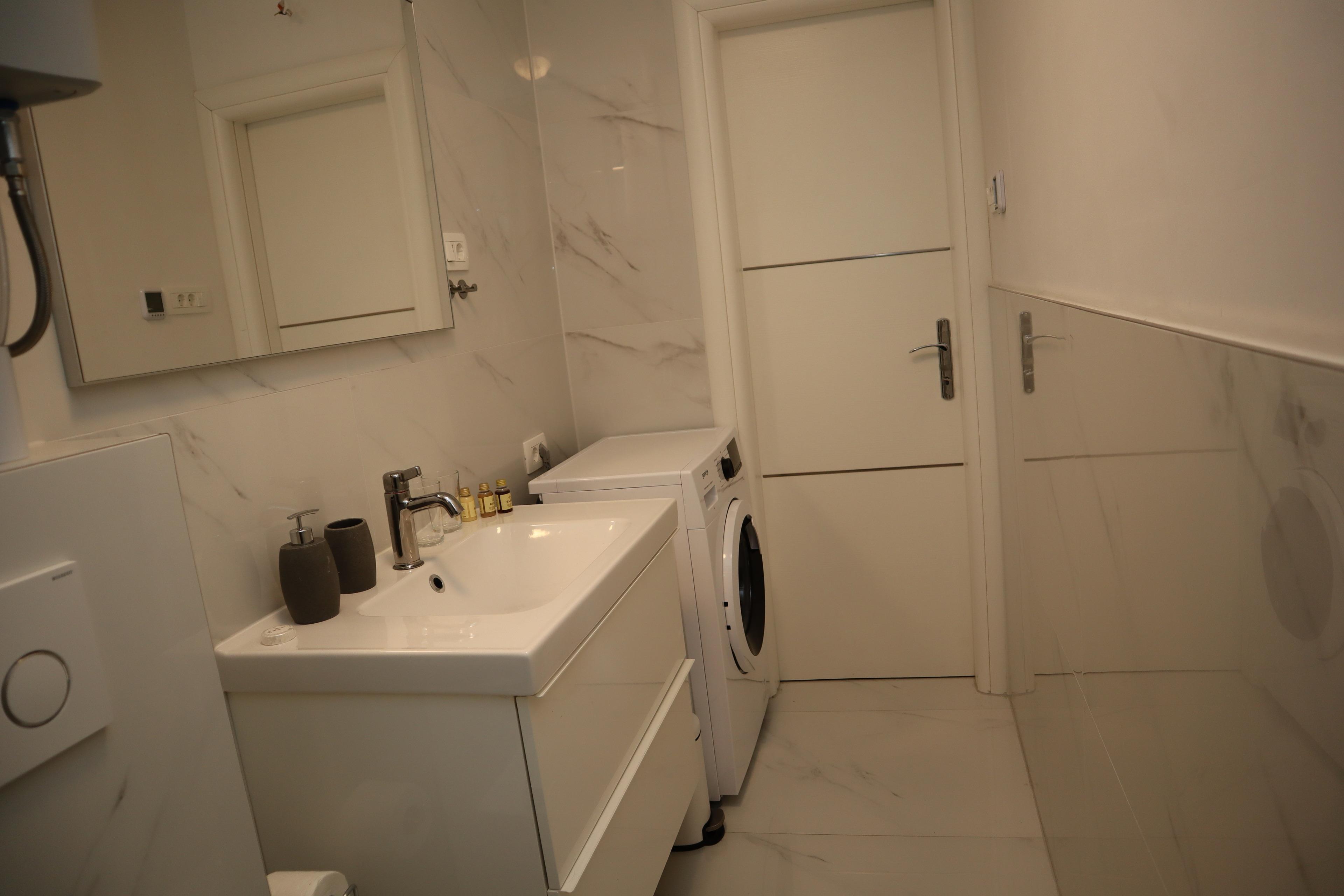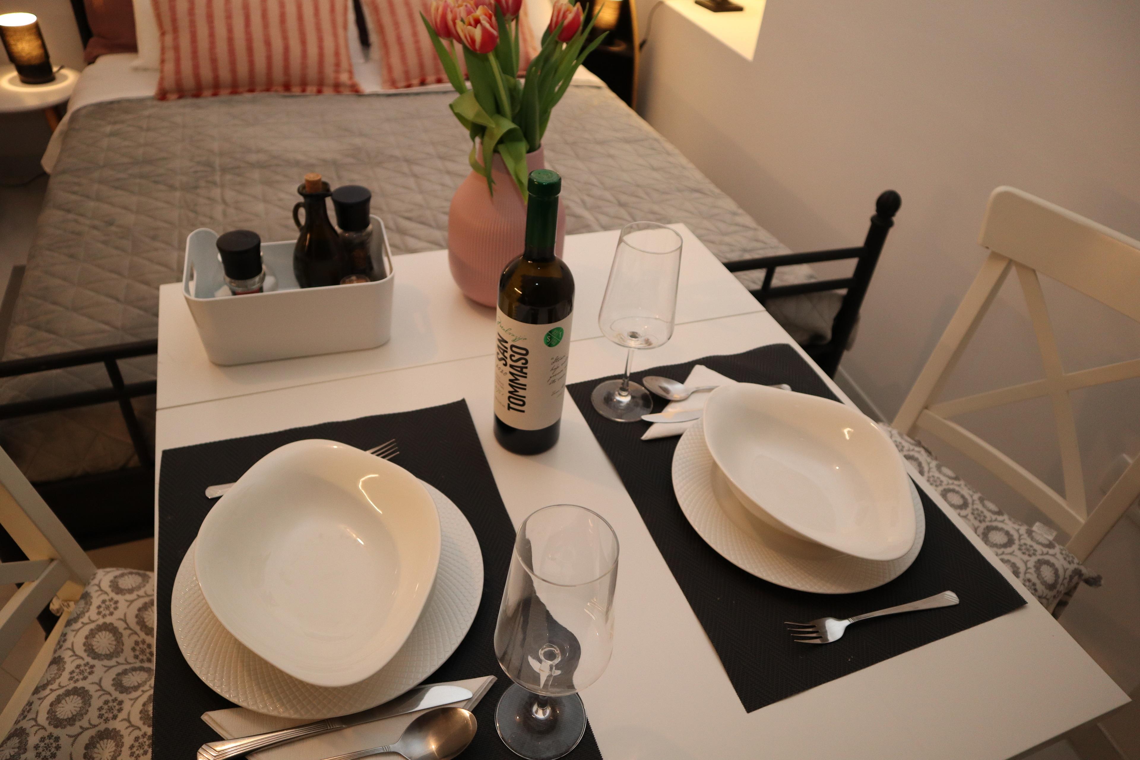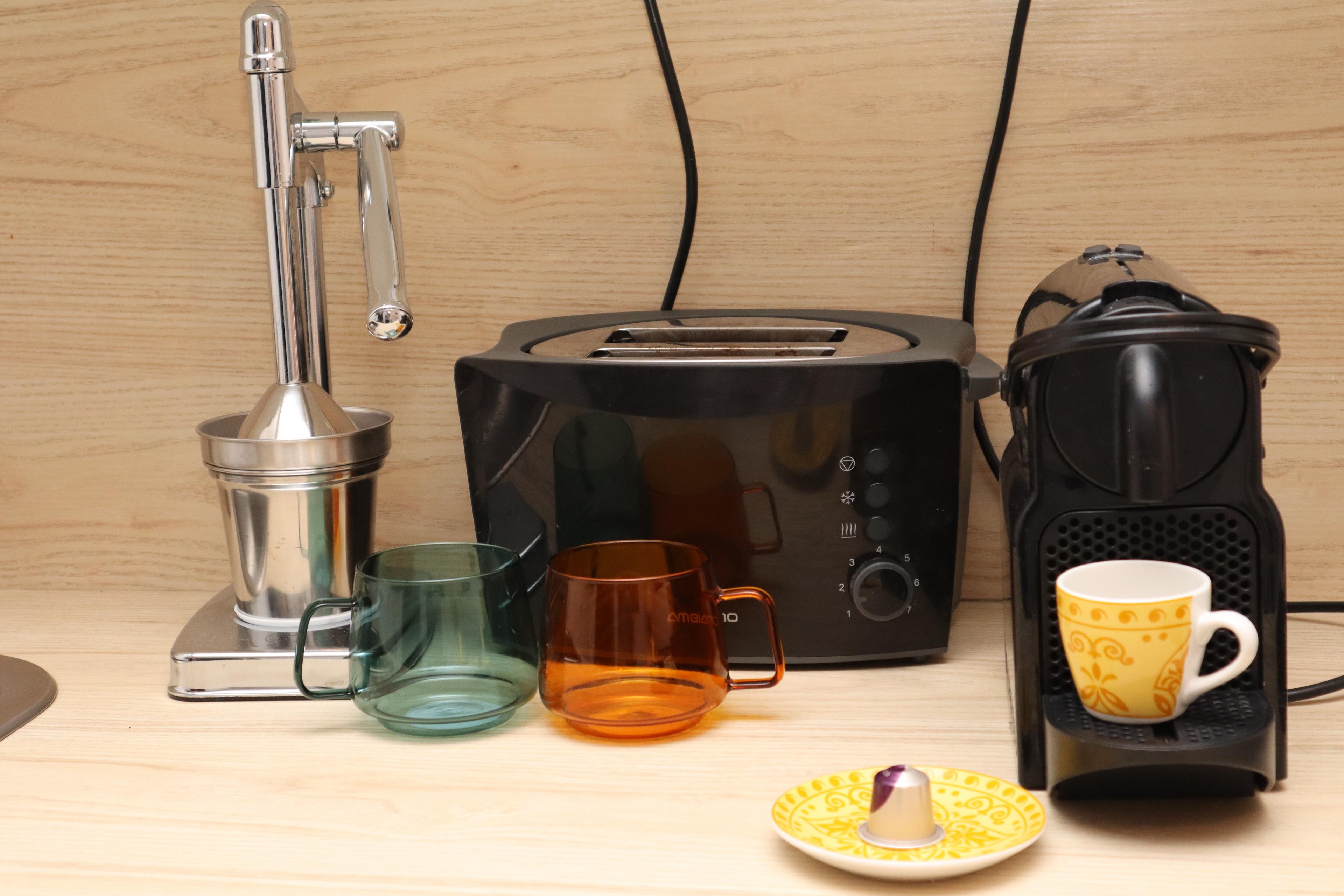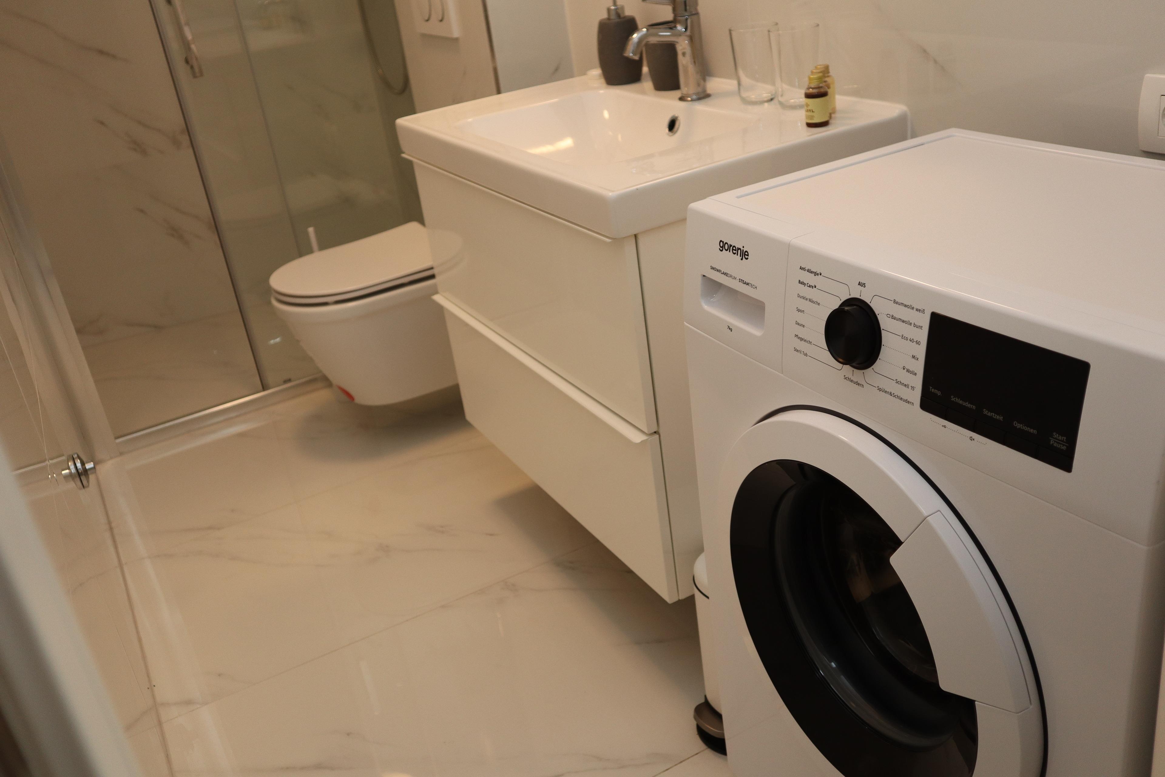 Das Apartment verfügt über einen Flachbild-TV mit Satellitenempfang . Die Küche ist mit einem Geschirrspüler, einer Mikrowelle, einem Kühlschrank, einem Wasserkocher und einer Kaffeemaschine ausgestattet.