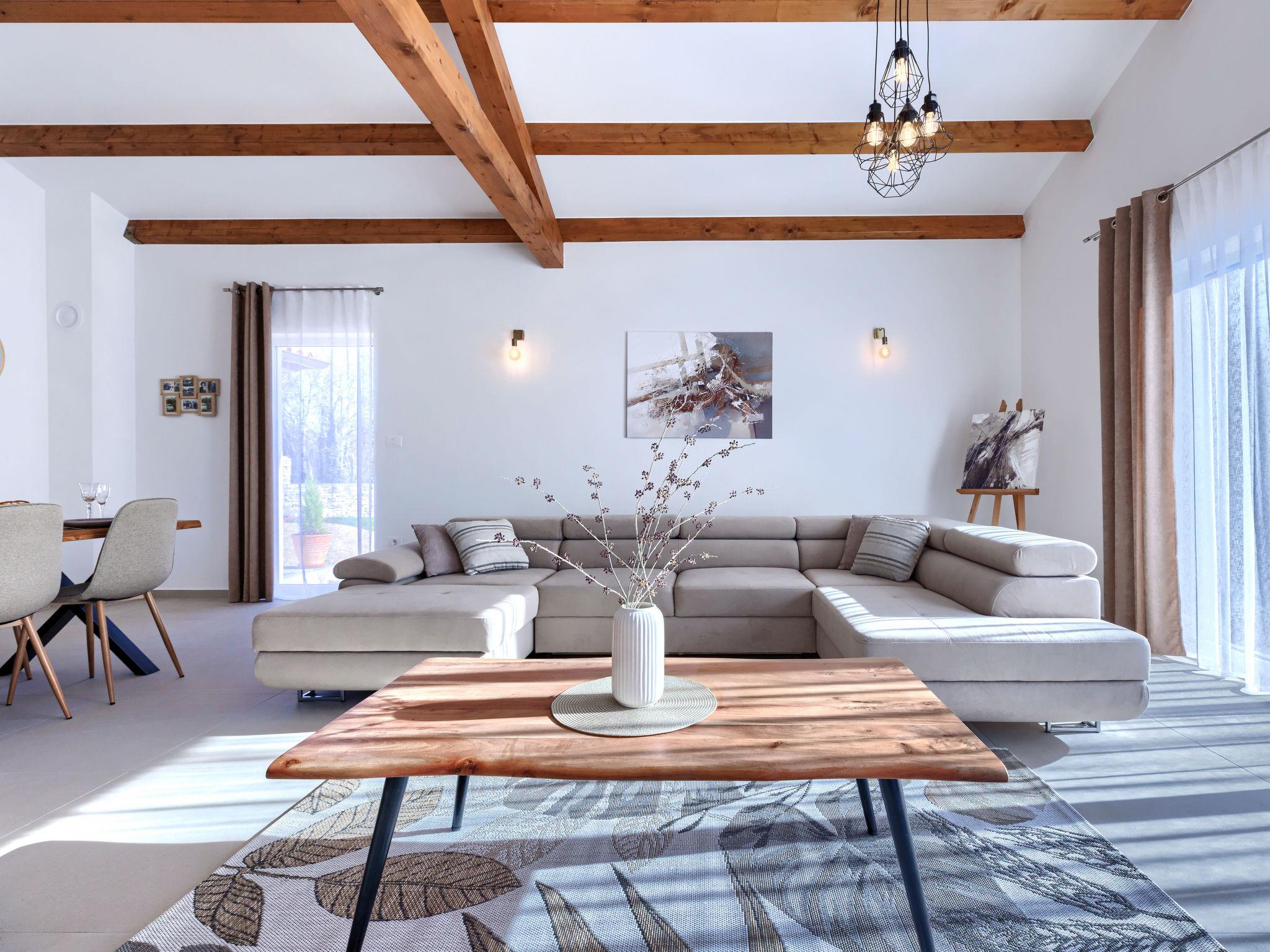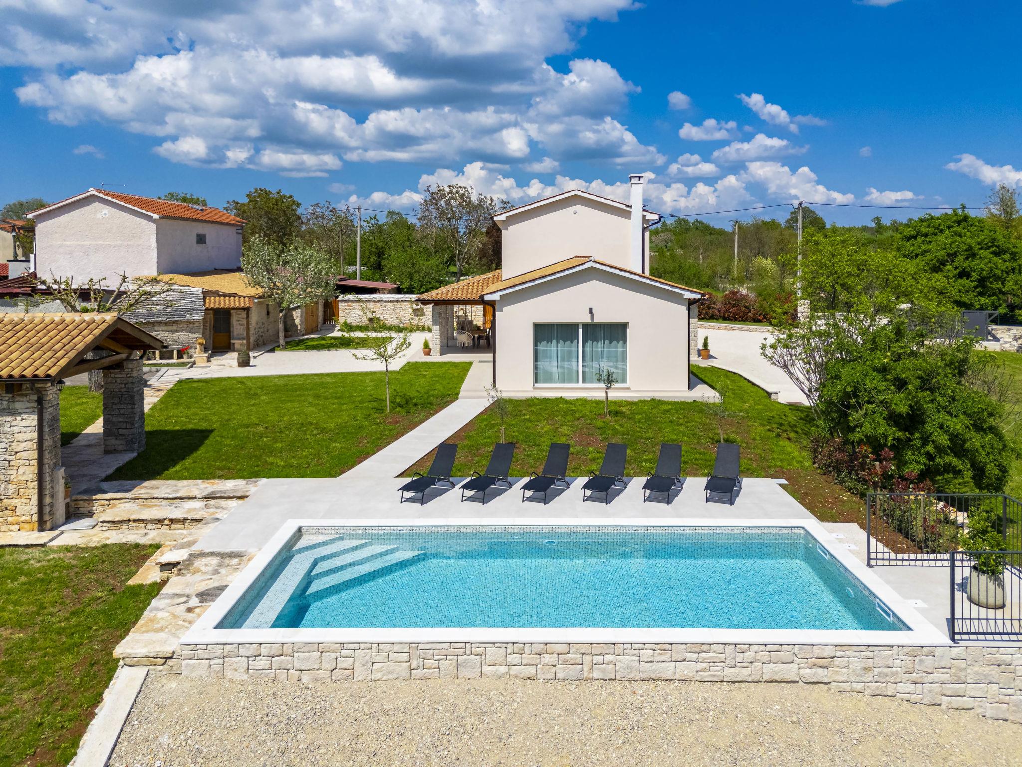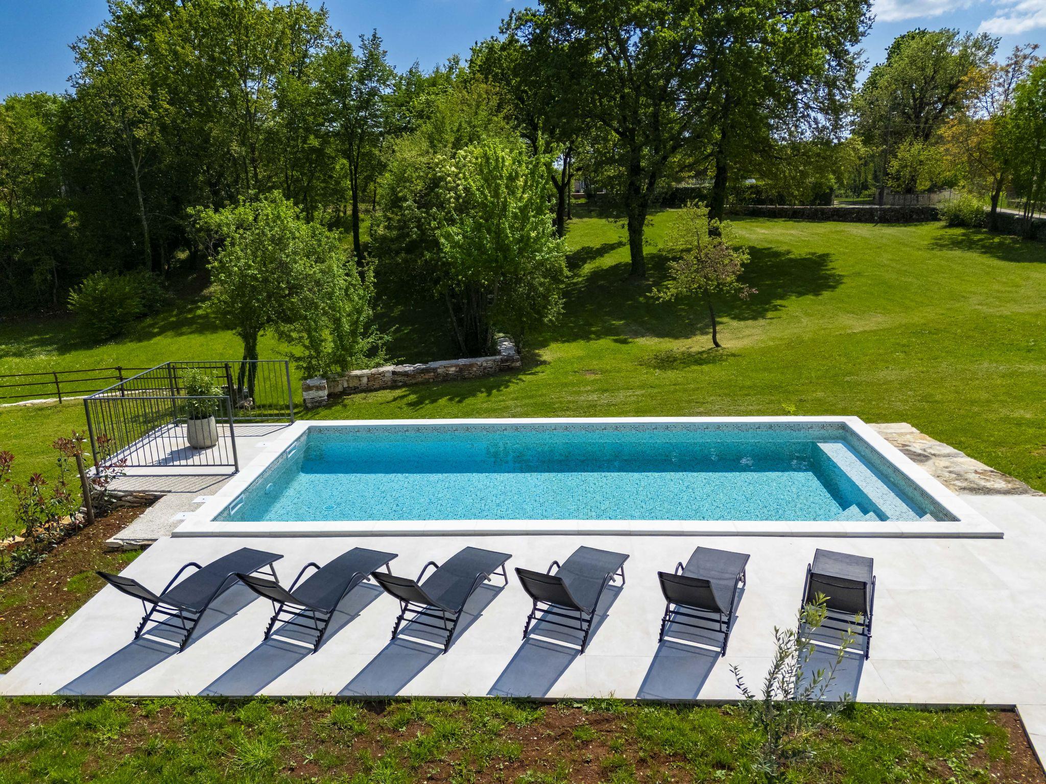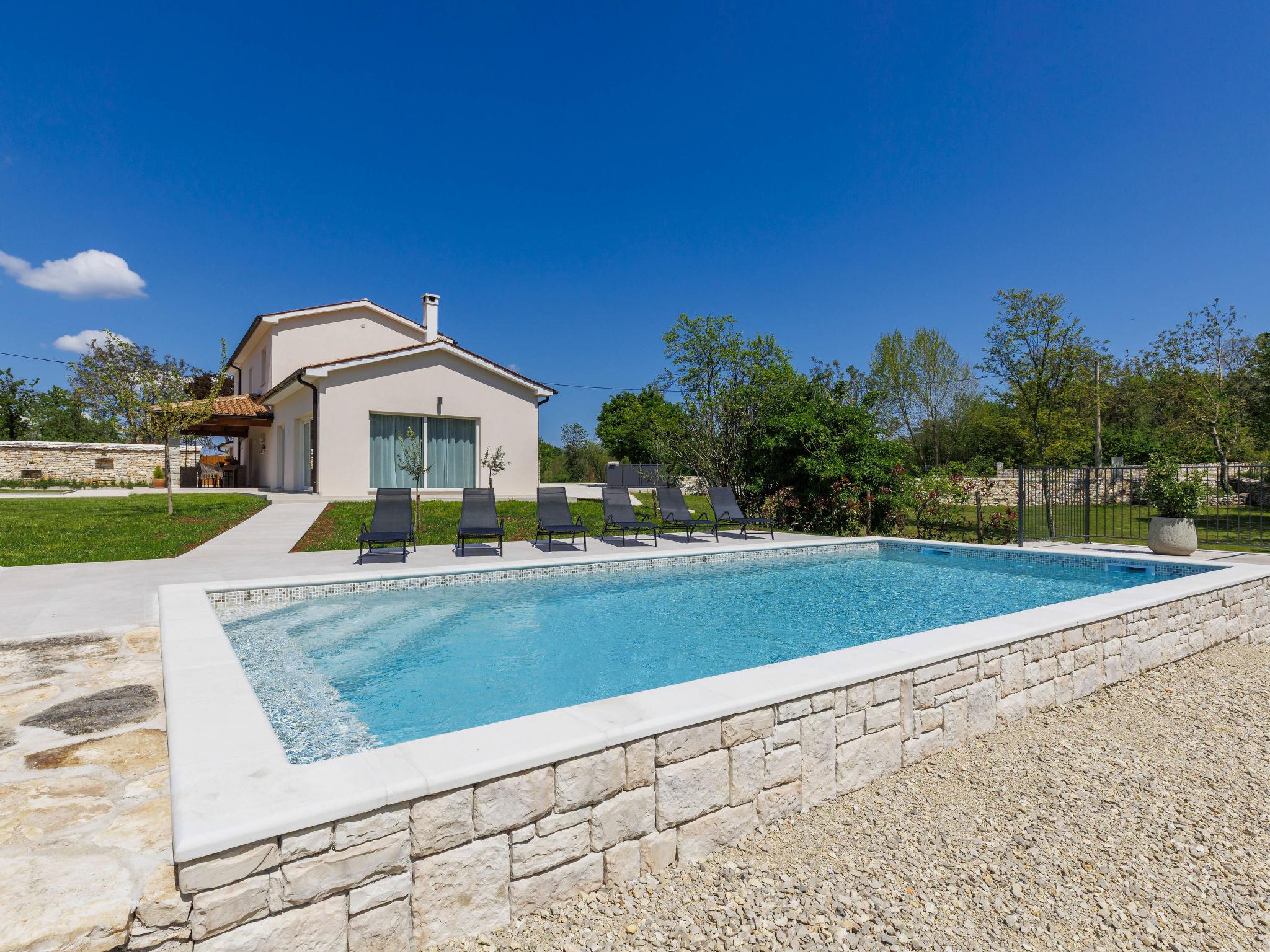 Modern, luxurious villa "Jolanda", 2 storeys, built in 2024. In the hamlet Pamici 4 km from the centre of Žminj, 25 km from the sea, 25 km from the beach. Private: property 7'000 m2 with lawn and trees, swimming pool angular (9 x 4 m, 36 m2, depth 140 cm, seasonal availability: 01.May. - 01.Oct.) with internal staircase. Outdoor shower, barbecue, barbecue house, children's playground (swing). In the house: internet access, washing machine. Parking (for 4 cars) at the house on the premises. Shop 2.8 km, supermarket 2.8 km, restaurant 3 km, bus stop 3.9 km, pebble beach 25 km. Nearby attractions: adventure park 20 km, zip line 15 km.