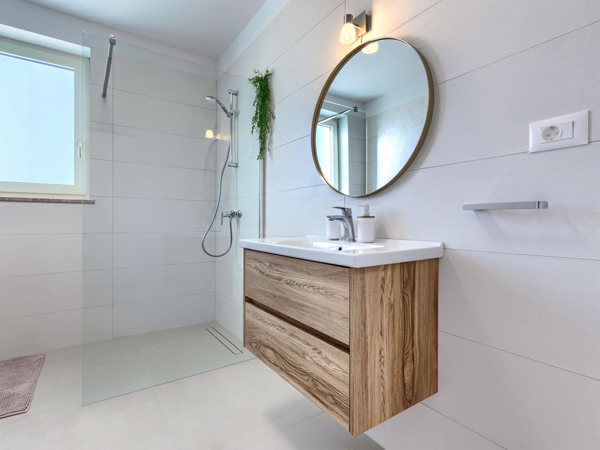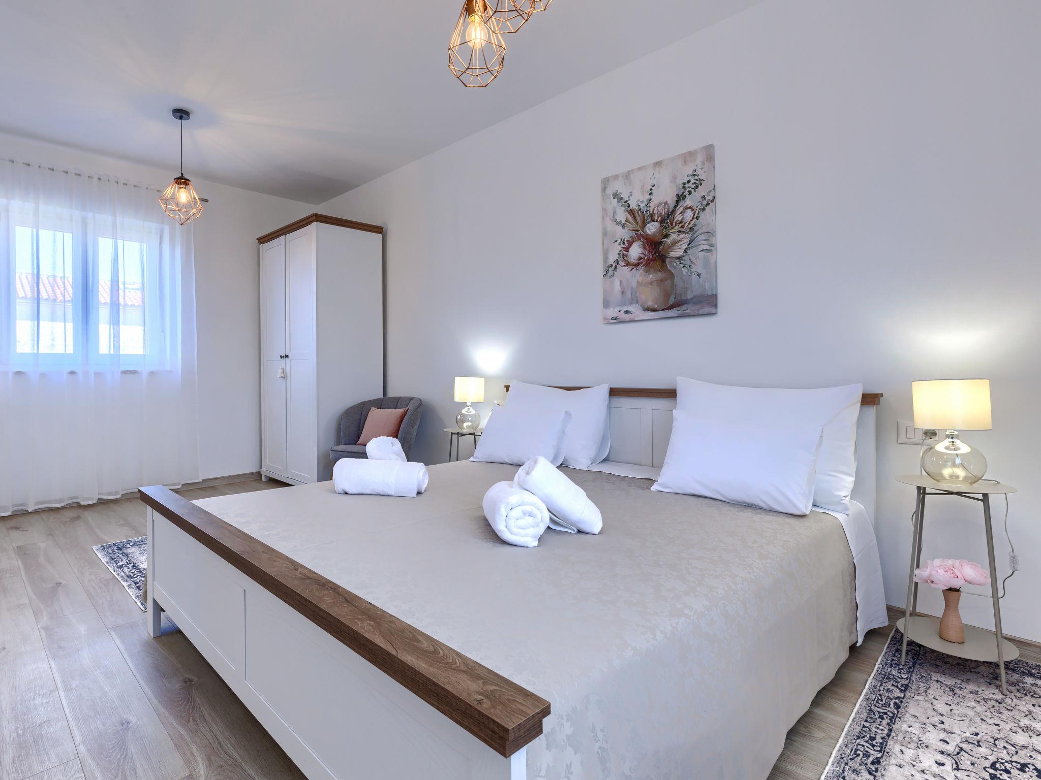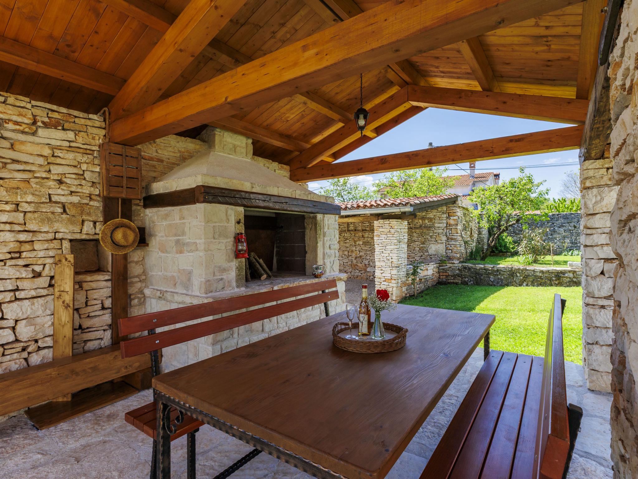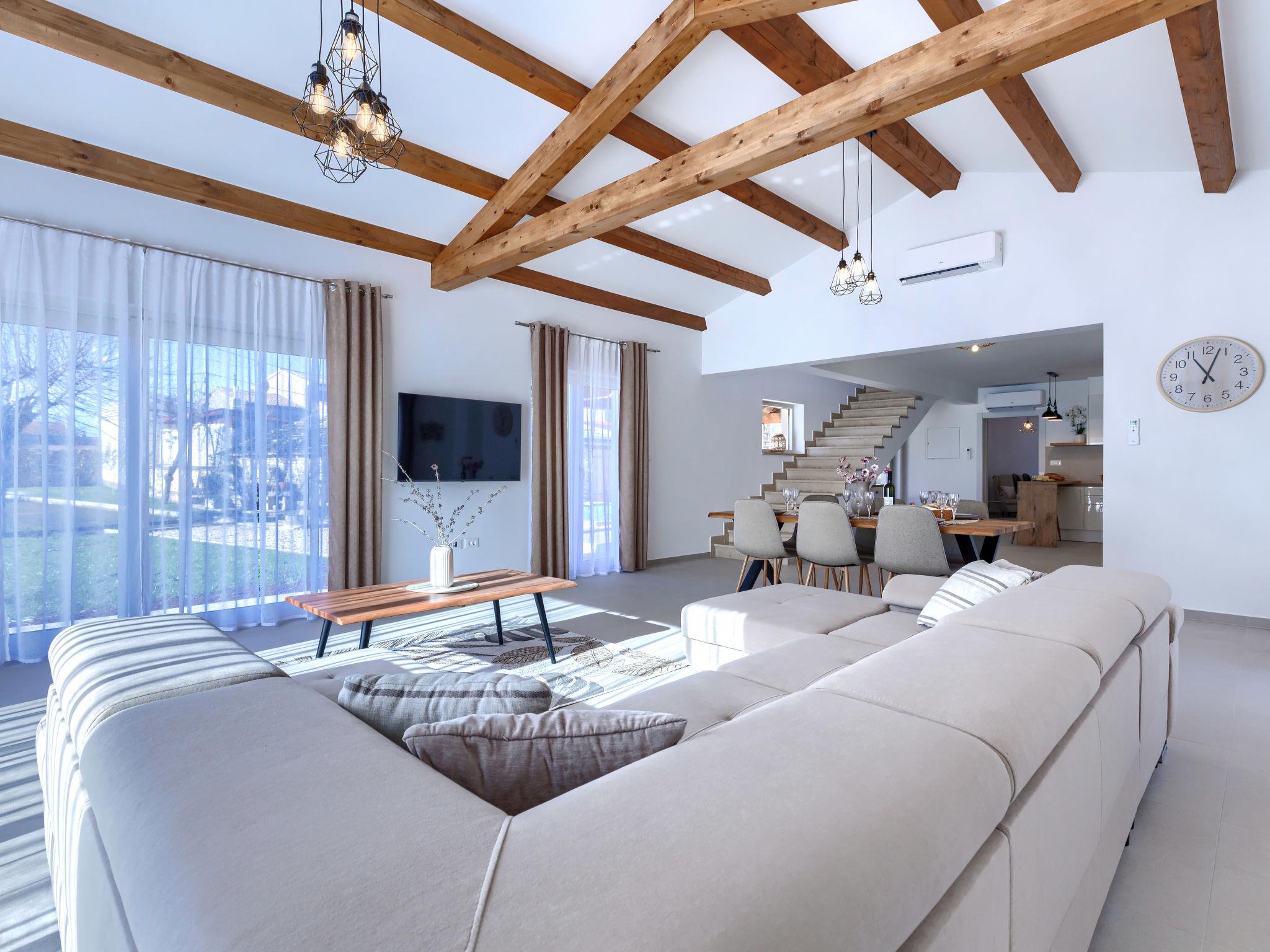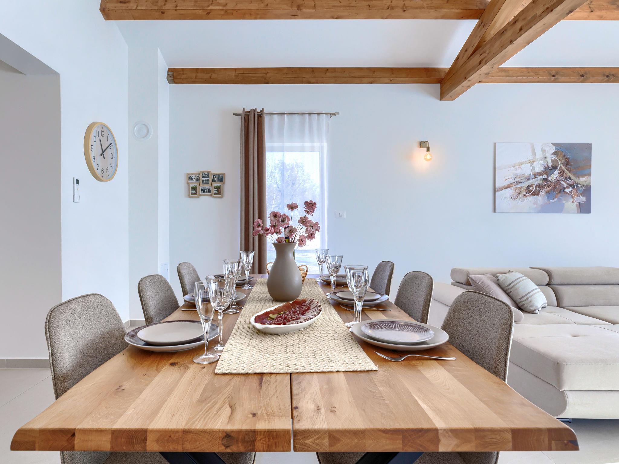 Modern, luxurious villa "Jolanda", 2 storeys, built in 2024. In the hamlet Pamici 4 km from the centre of Žminj, 25 km from the sea, 25 km from the beach. Private: property 7'000 m2 with lawn and trees, swimming pool angular (9 x 4 m, 36 m2, depth 140 cm, seasonal availability: 01.May. - 01.Oct.) with internal staircase. Outdoor shower, barbecue, barbecue house, children's playground (swing). In the house: internet access, washing machine. Parking (for 4 cars) at the house on the premises. Shop 2.8 km, supermarket 2.8 km, restaurant 3 km, bus stop 3.9 km, pebble beach 25 km. Nearby attractions: adventure park 20 km, zip line 15 km.
