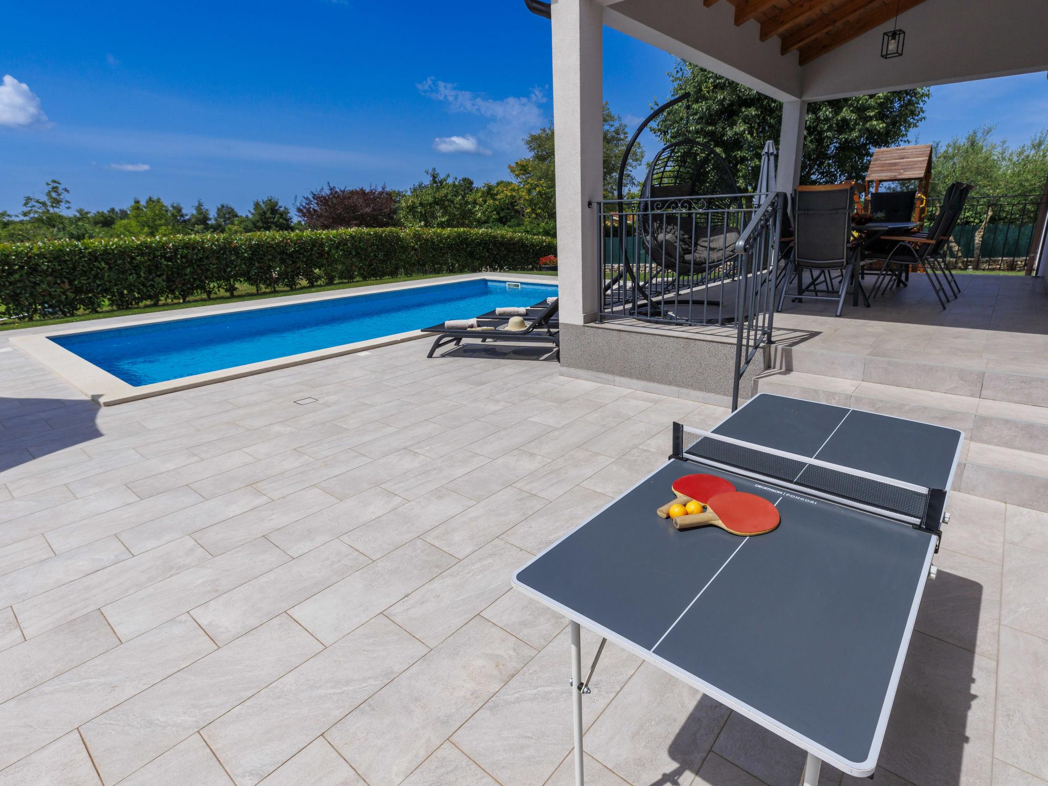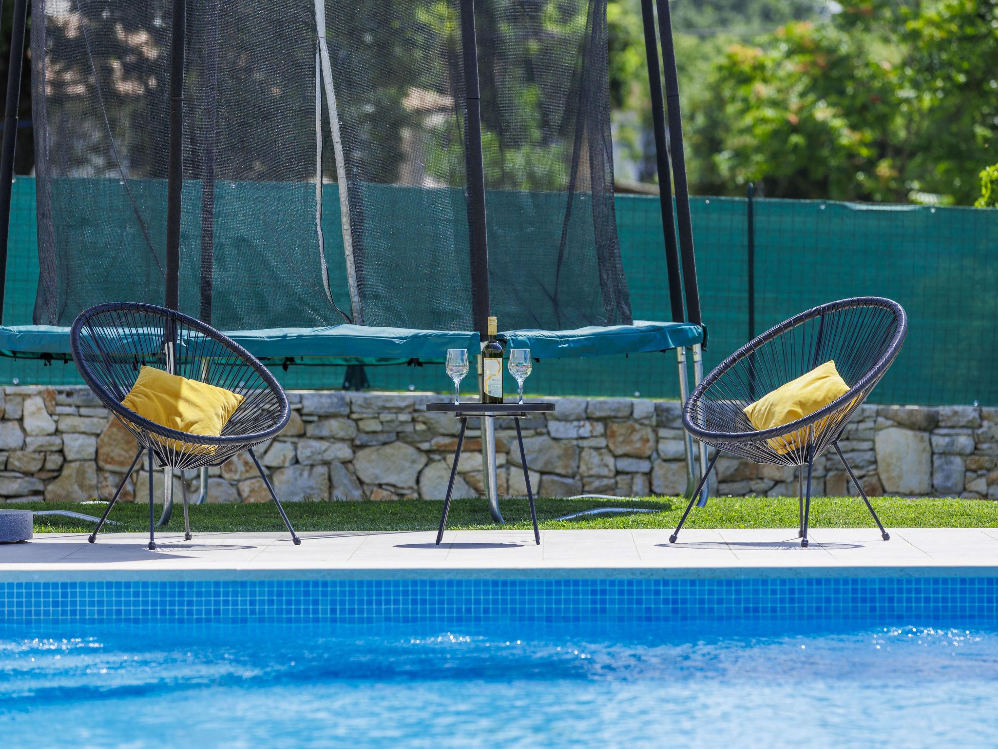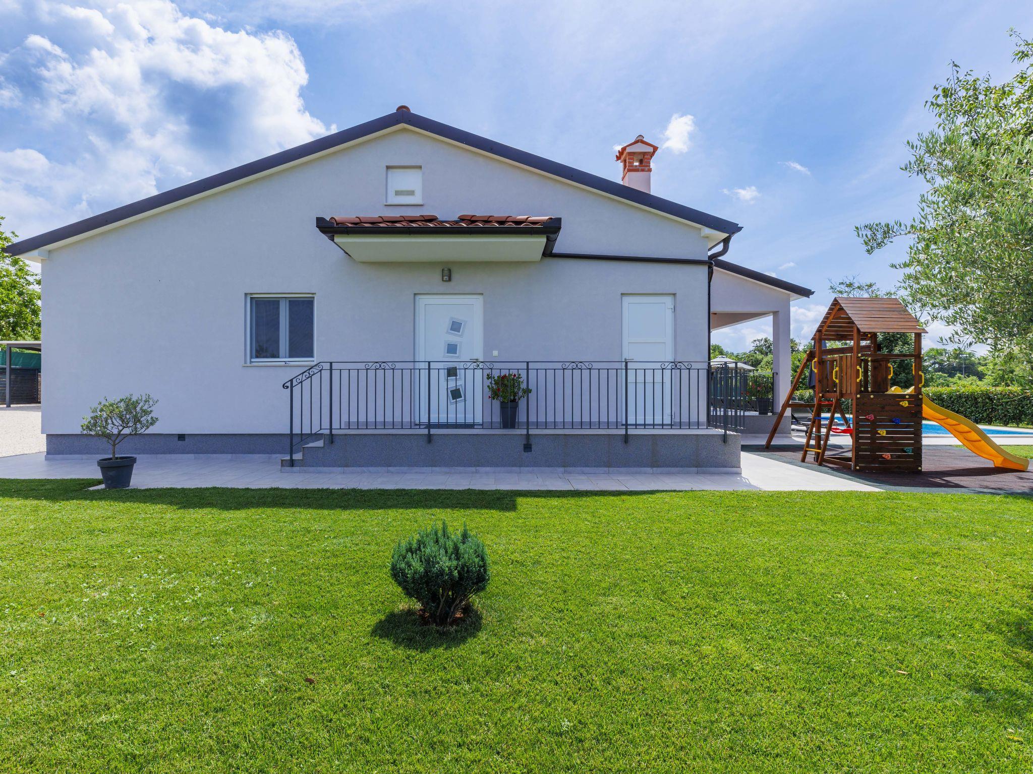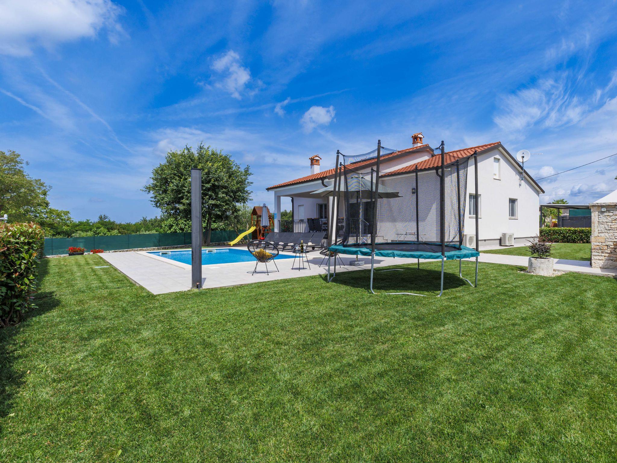 Beautiful single-family house "Villa Veli vrt", built in 2020. In the hamlet Kuhari 2 km from the centre of Žminj, 26 km from the centre of Rovinj, in a quiet, sunny position, 26 km from the sea. Private: property 1'000 m2 (fenced), garden with lawn and wildlife garden, swimming pool angular (8 x 4 m, depth 150 cm, seasonal availability: 01.Apr. - 31.Oct.) with internal staircase. Outdoor shower, barbecue, children's playground (swing). In the house: internet access, trampoline, washing machine. Roofed, parking (for 2 cars) at the house on the premises. Supermarket 1.5 km, restaurant 2 km, bus stop 2.9 km, pebble beach 26 km. Riding stable 10 km, walking paths from the house 100 m, cycle lane 150 m. Nearby attractions: adventure park 20 km, zip line 15 km. Please note: suitable for families. The owner does not accept any youth groups.