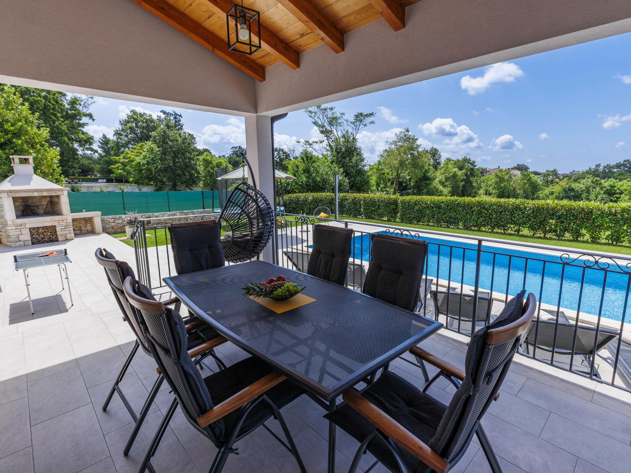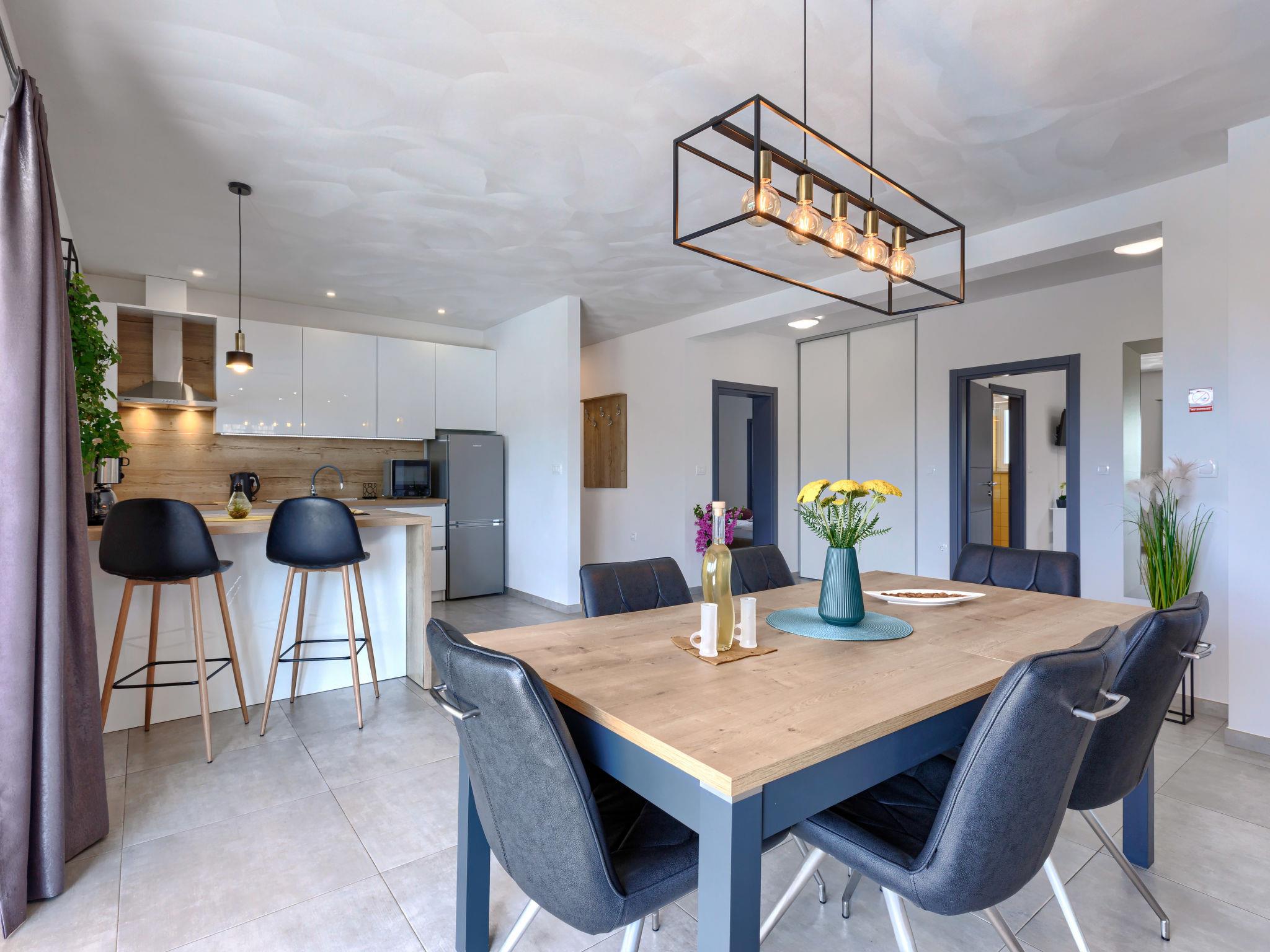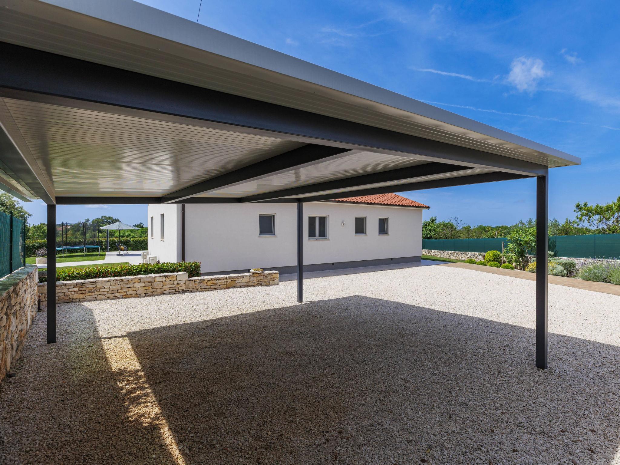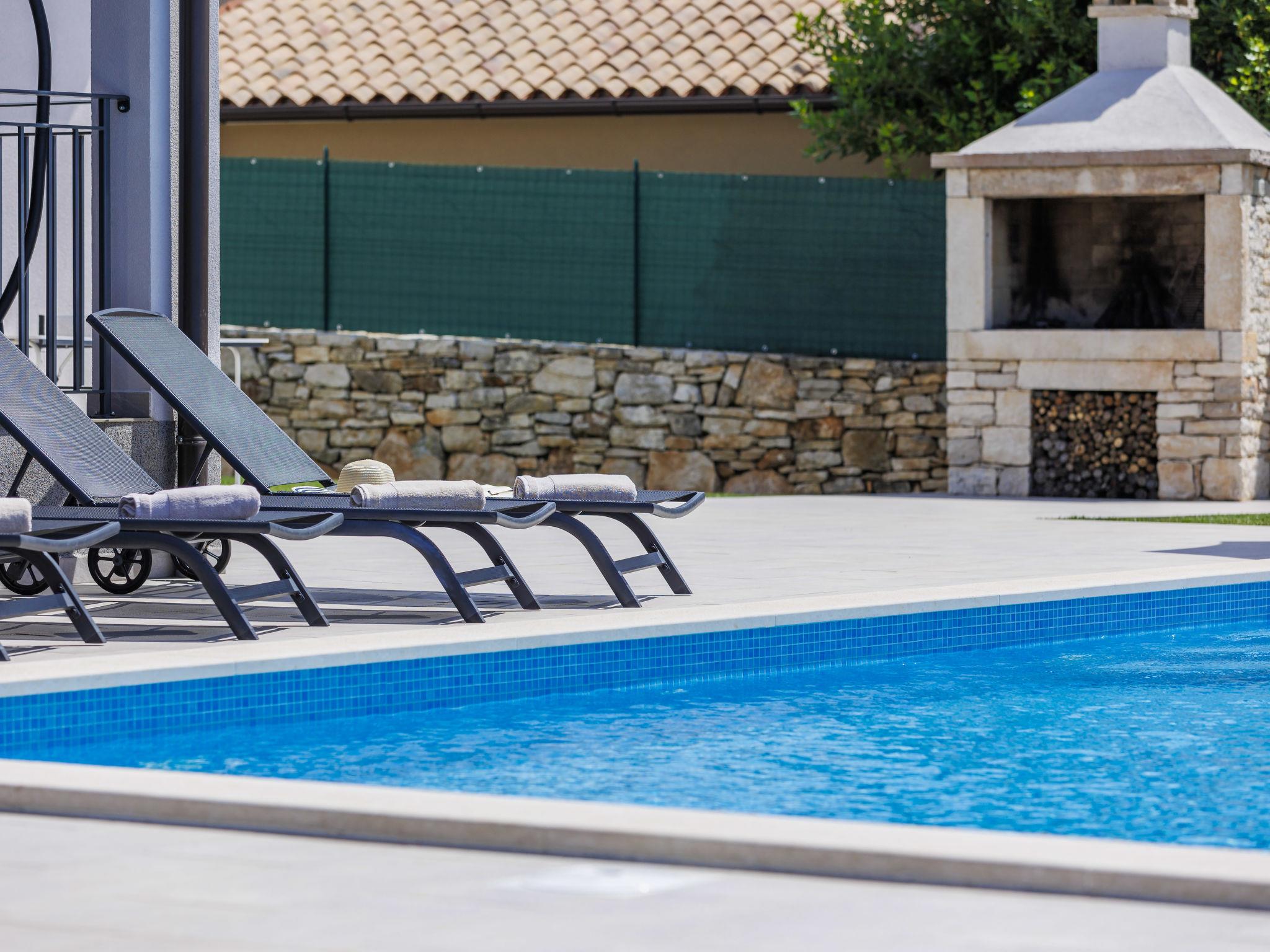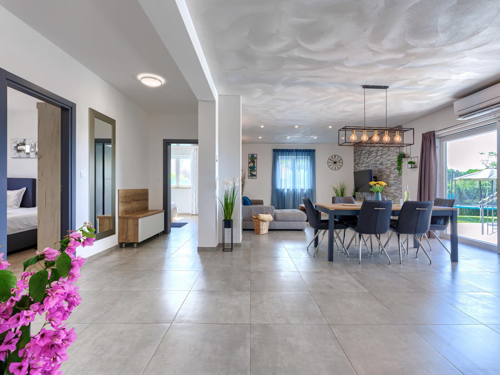 Beautiful single-family house "Villa Veli vrt", built in 2020. In the hamlet Kuhari 2 km from the centre of Žminj, 26 km from the centre of Rovinj, in a quiet, sunny position, 26 km from the sea. Private: property 1'000 m2 (fenced), garden with lawn and wildlife garden, swimming pool angular (8 x 4 m, depth 150 cm, seasonal availability: 01.Apr. - 31.Oct.) with internal staircase. Outdoor shower, barbecue, children's playground (swing). In the house: internet access, trampoline, washing machine. Roofed, parking (for 2 cars) at the house on the premises. Supermarket 1.5 km, restaurant 2 km, bus stop 2.9 km, pebble beach 26 km. Riding stable 10 km, walking paths from the house 100 m, cycle lane 150 m. Nearby attractions: adventure park 20 km, zip line 15 km. Please note: suitable for families. The owner does not accept any youth groups.