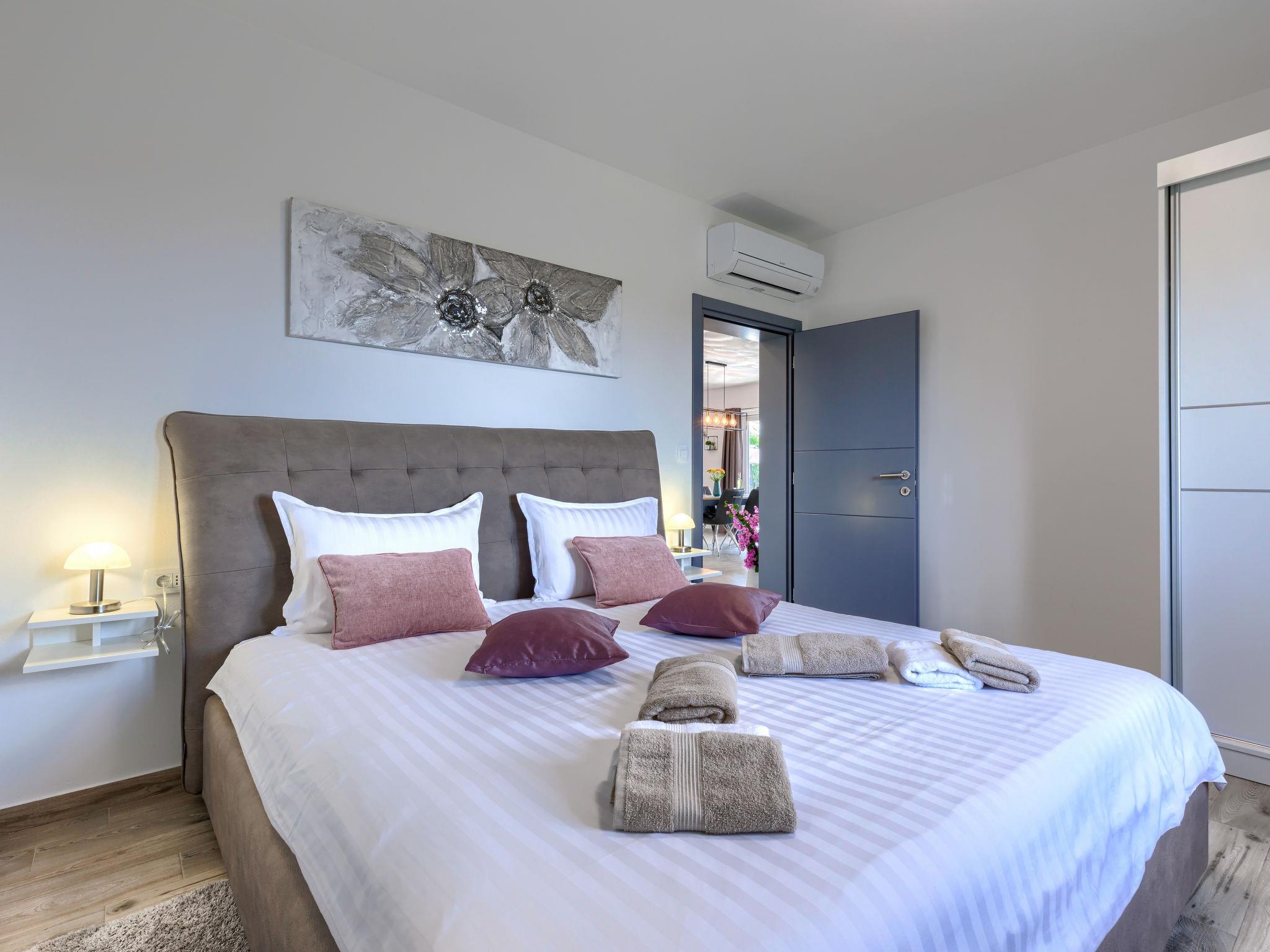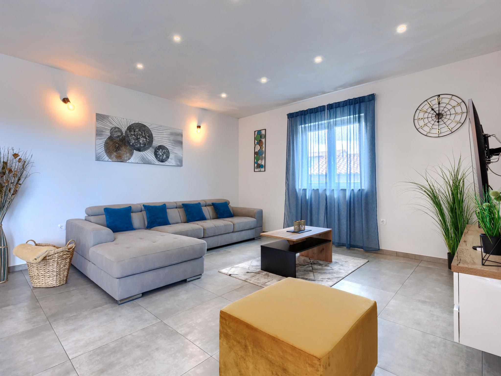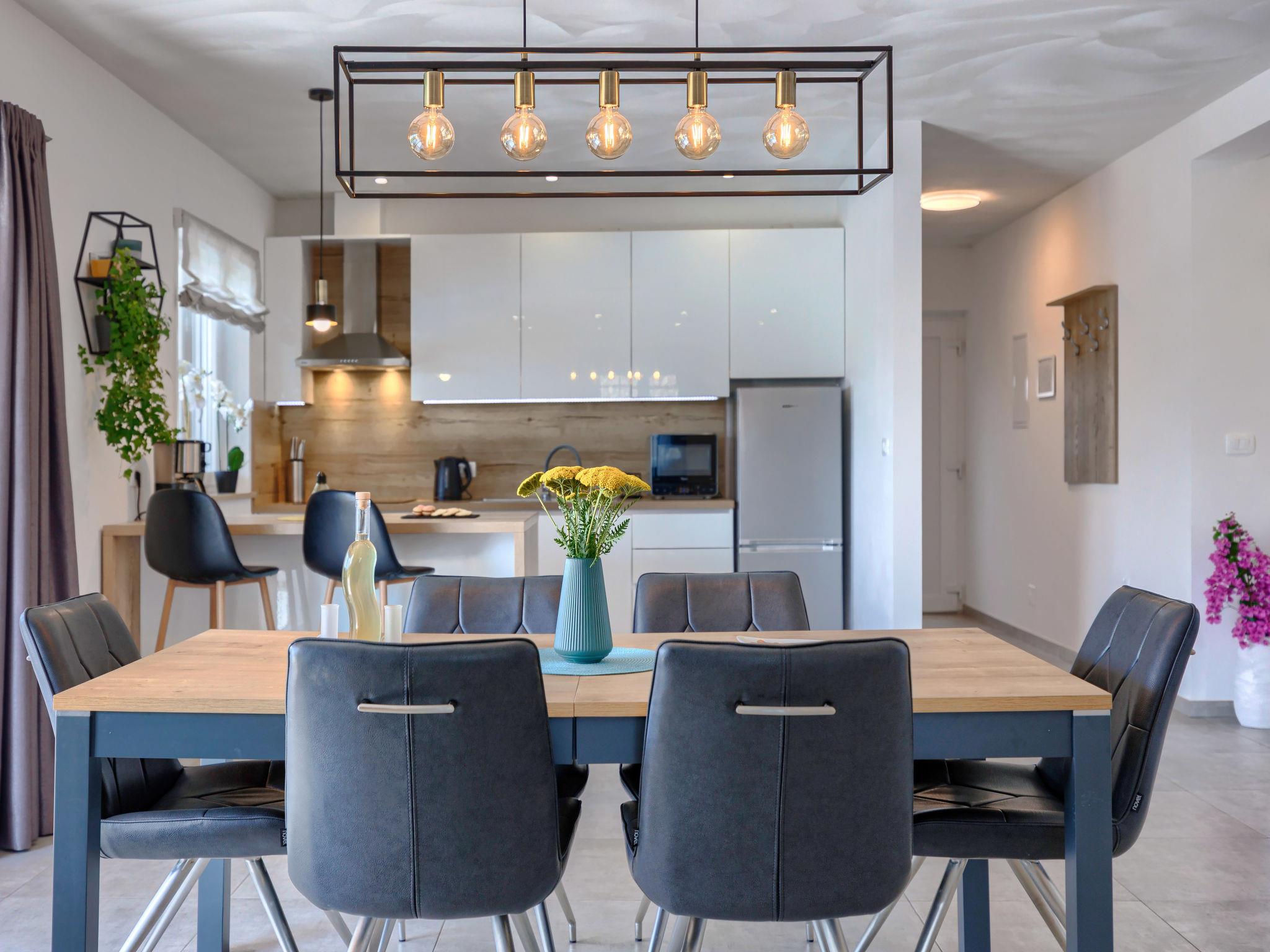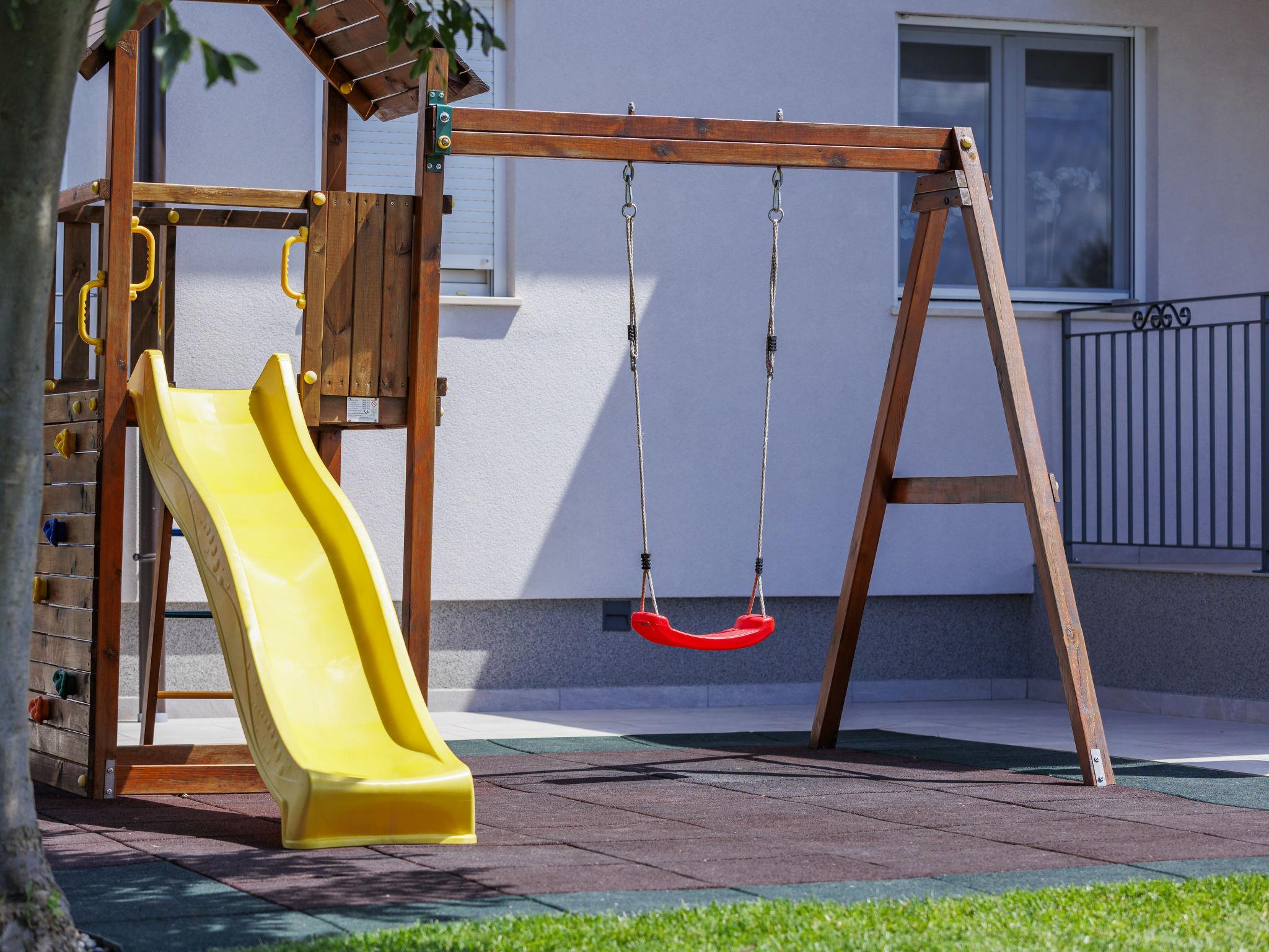 Beautiful single-family house "Villa Veli vrt", built in 2020. In the hamlet Kuhari 2 km from the centre of Žminj, 26 km from the centre of Rovinj, in a quiet, sunny position, 26 km from the sea. Private: property 1'000 m2 (fenced), garden with lawn and wildlife garden, swimming pool angular (8 x 4 m, depth 150 cm, seasonal availability: 01.Apr. - 31.Oct.) with internal staircase. Outdoor shower, barbecue, children's playground (swing). In the house: internet access, trampoline, washing machine. Roofed, parking (for 2 cars) at the house on the premises. Supermarket 1.5 km, restaurant 2 km, bus stop 2.9 km, pebble beach 26 km. Riding stable 10 km, walking paths from the house 100 m, cycle lane 150 m. Nearby attractions: adventure park 20 km, zip line 15 km. Please note: suitable for families. The owner does not accept any youth groups.