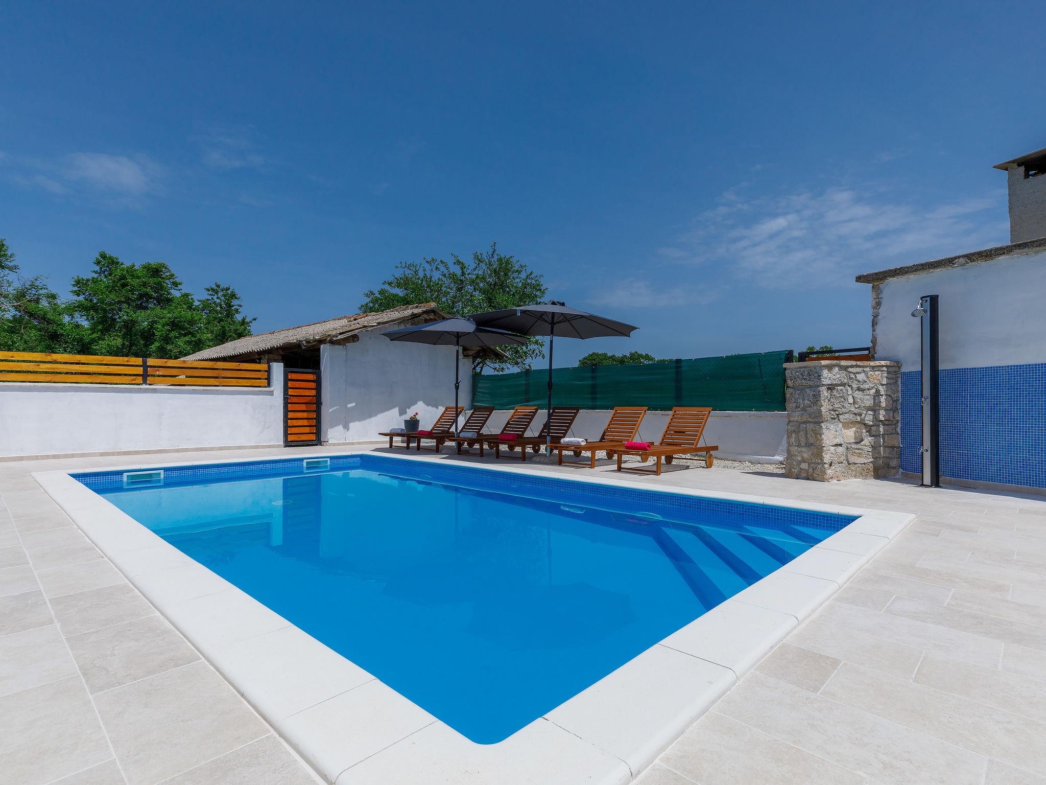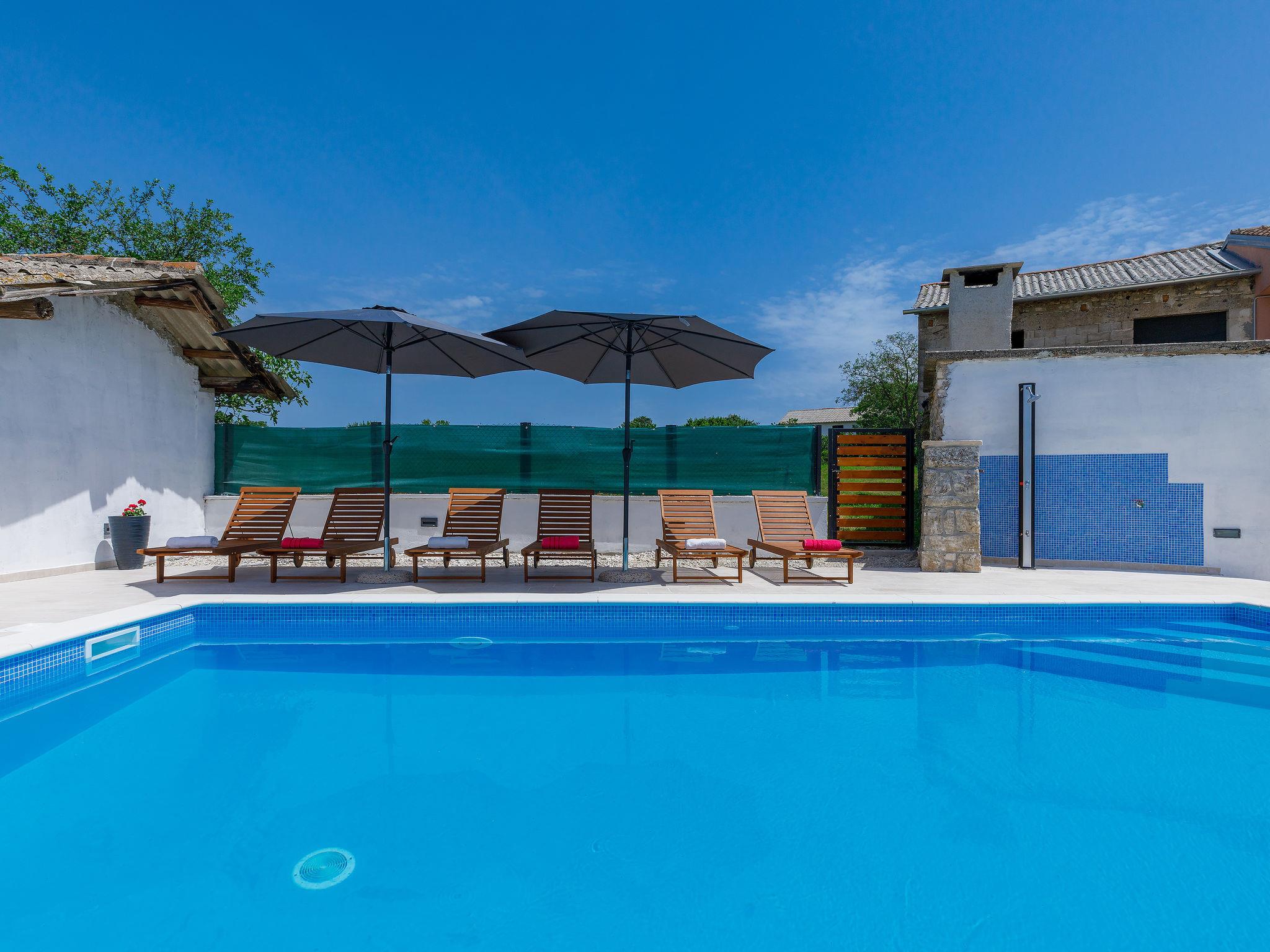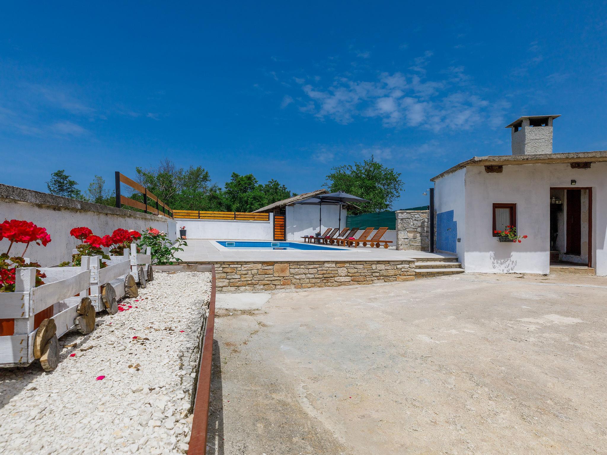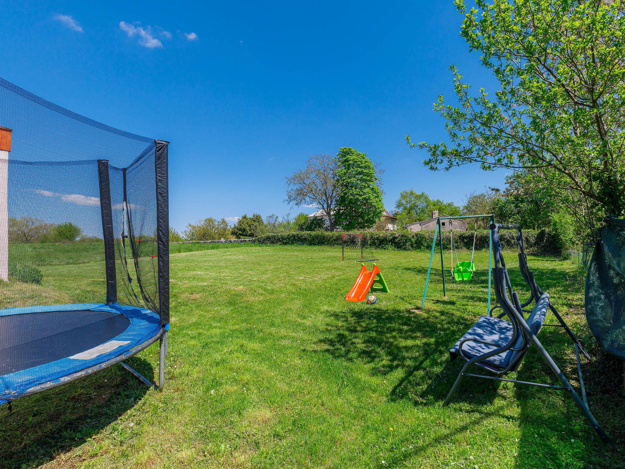 Terraced house "Villa Mate i Kate", 2 storeys. In the hamlet Leprincani 2 km from the centre of Žminj, 25 km from the centre of Rovinj, in a sunny position, 25 km from the sea. Private: property 700 m2, swimming pool angular (8 x 4 m, depth 150 cm, seasonal availability: 01.May. - 01.Oct.) with internal staircase. Outdoor shower, barbecue (swing). In the house: internet access, trampoline, washing machine. Parking (for 2 cars) at the house on the premises. Shop 2.5 km, restaurant 2.5 km, bus stop 2.4 km, pebble beach 25 km. Walking paths from the house 100 m, cycle lane 150 m. Nearby attractions: adventure park 3 km, amusement park 6 km. Please note: suitable for families. The owner does not accept any youth groups.