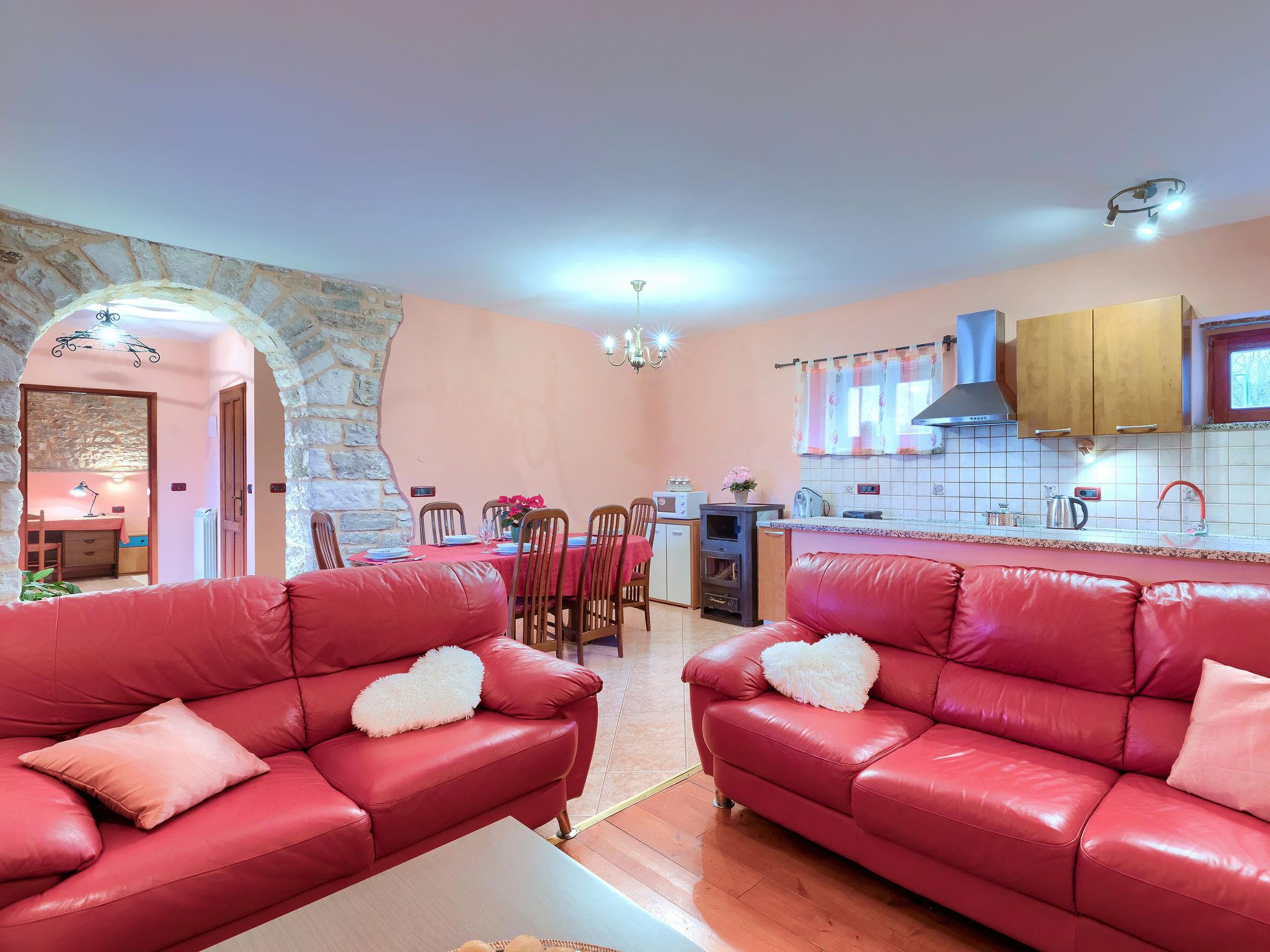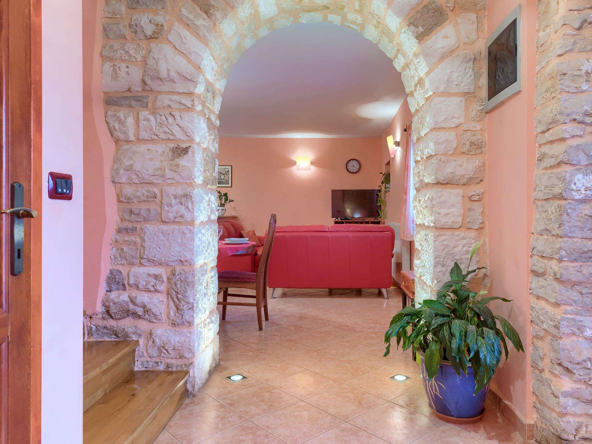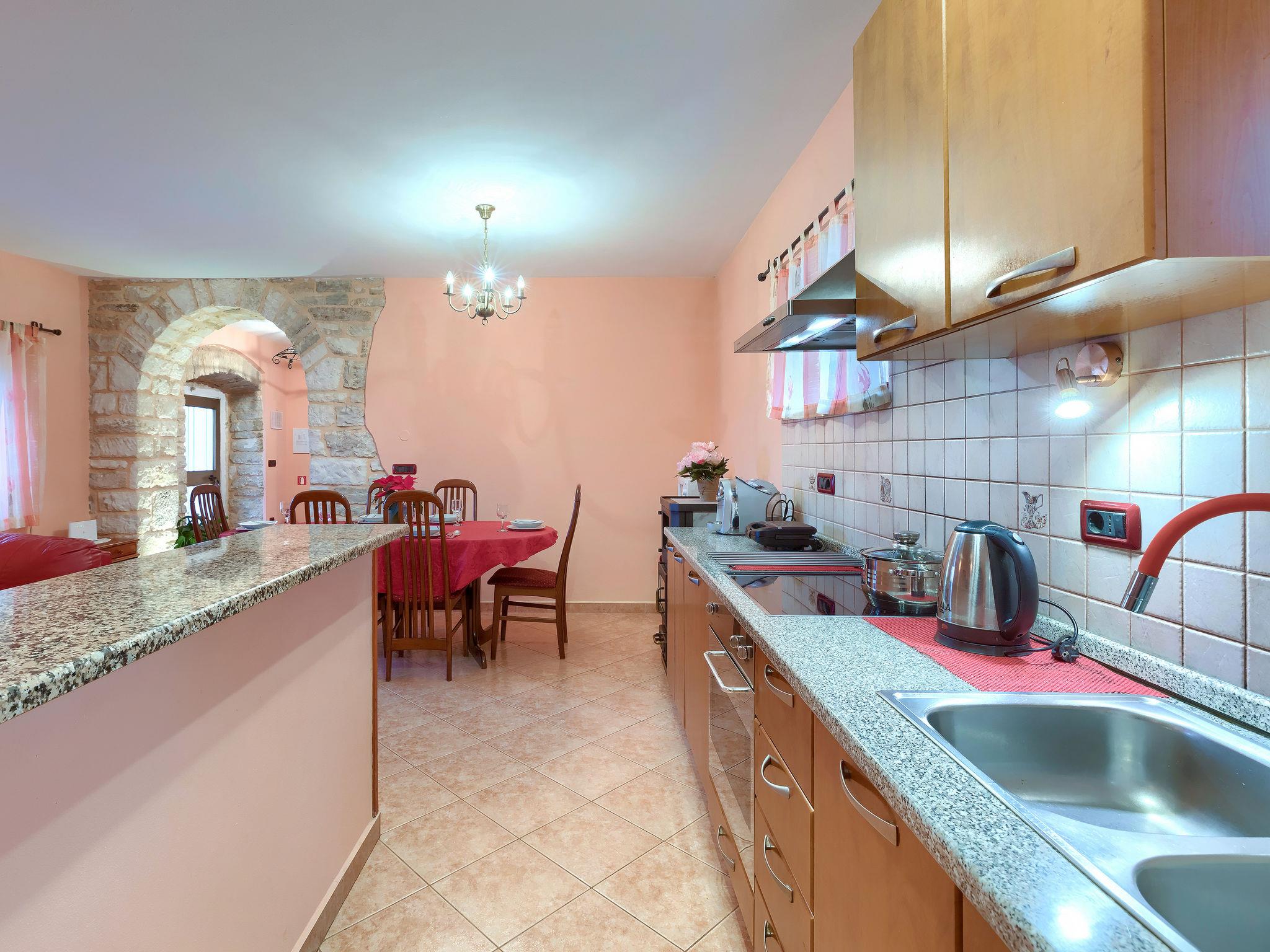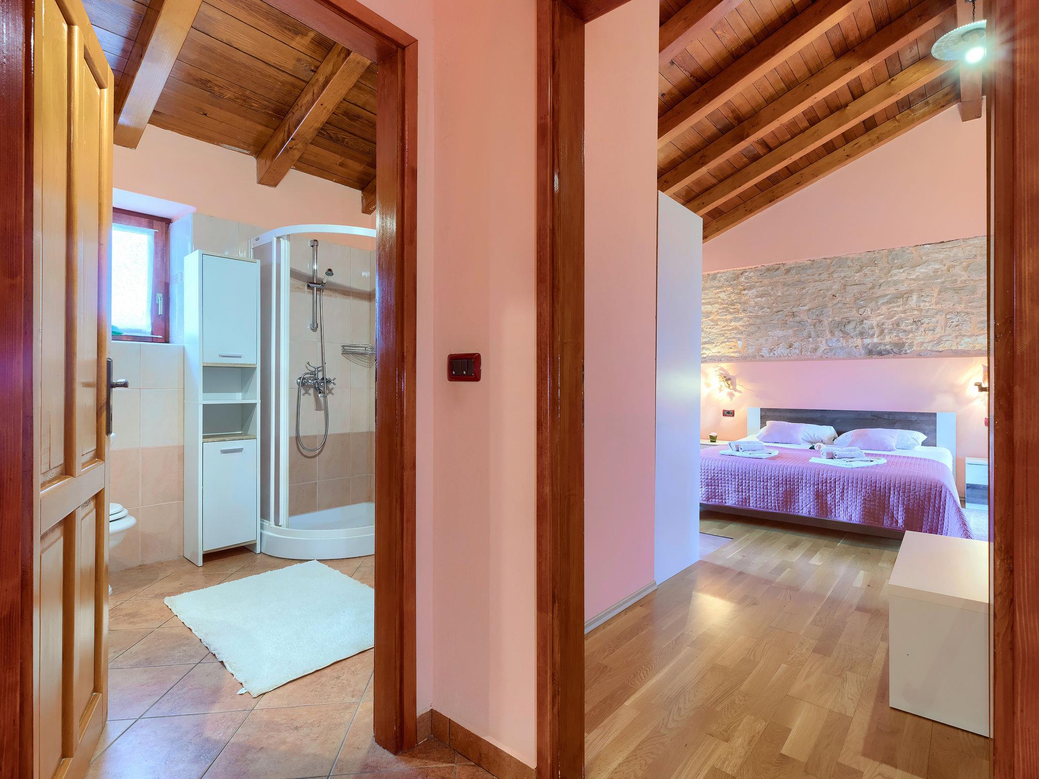 Terraced house "Villa Mate i Kate", 2 storeys. In the hamlet Leprincani 2 km from the centre of Žminj, 25 km from the centre of Rovinj, in a sunny position, 25 km from the sea. Private: property 700 m2, swimming pool angular (8 x 4 m, depth 150 cm, seasonal availability: 01.May. - 01.Oct.) with internal staircase. Outdoor shower, barbecue (swing). In the house: internet access, trampoline, washing machine. Parking (for 2 cars) at the house on the premises. Shop 2.5 km, restaurant 2.5 km, bus stop 2.4 km, pebble beach 25 km. Walking paths from the house 100 m, cycle lane 150 m. Nearby attractions: adventure park 3 km, amusement park 6 km. Please note: suitable for families. The owner does not accept any youth groups.