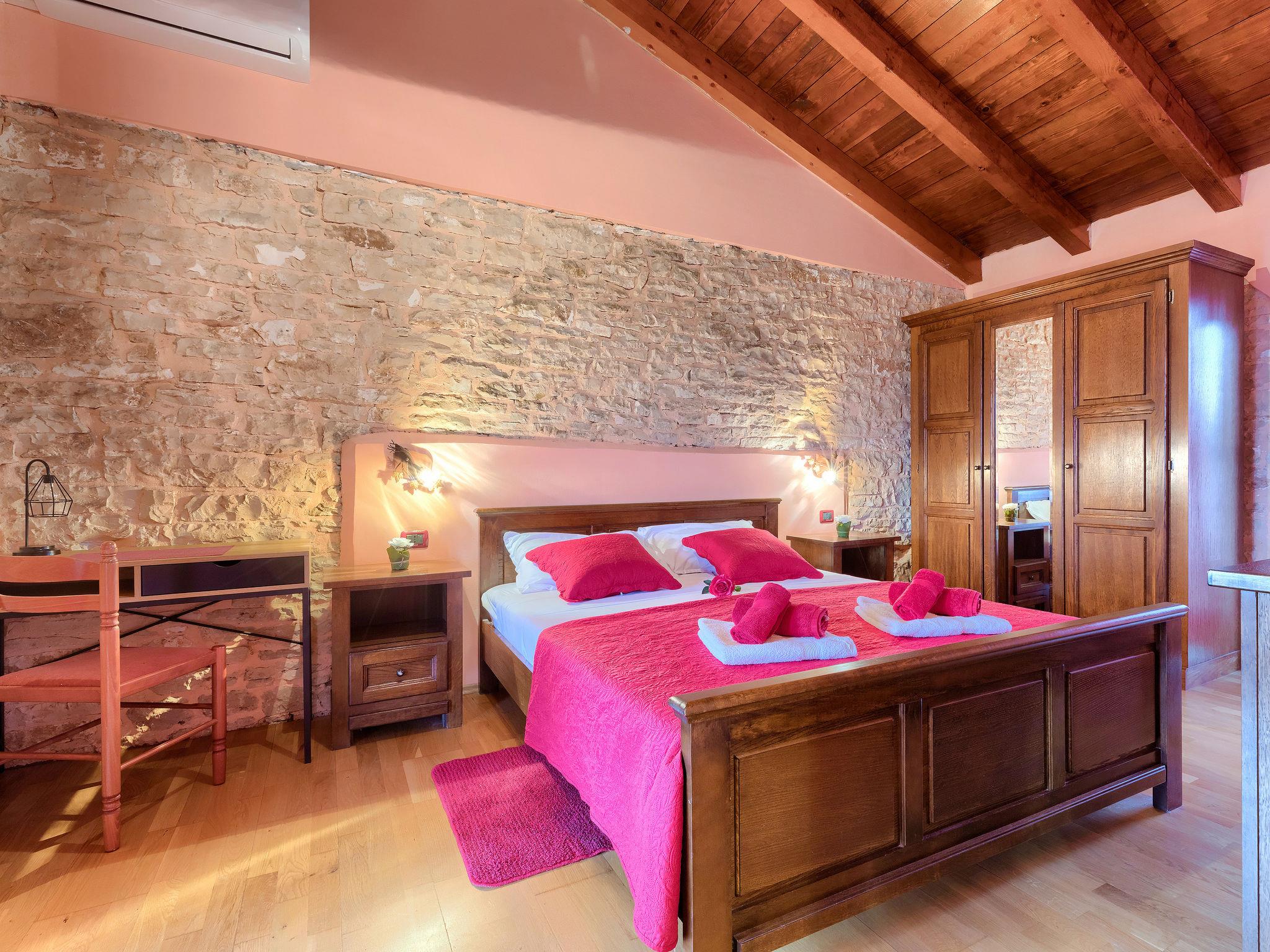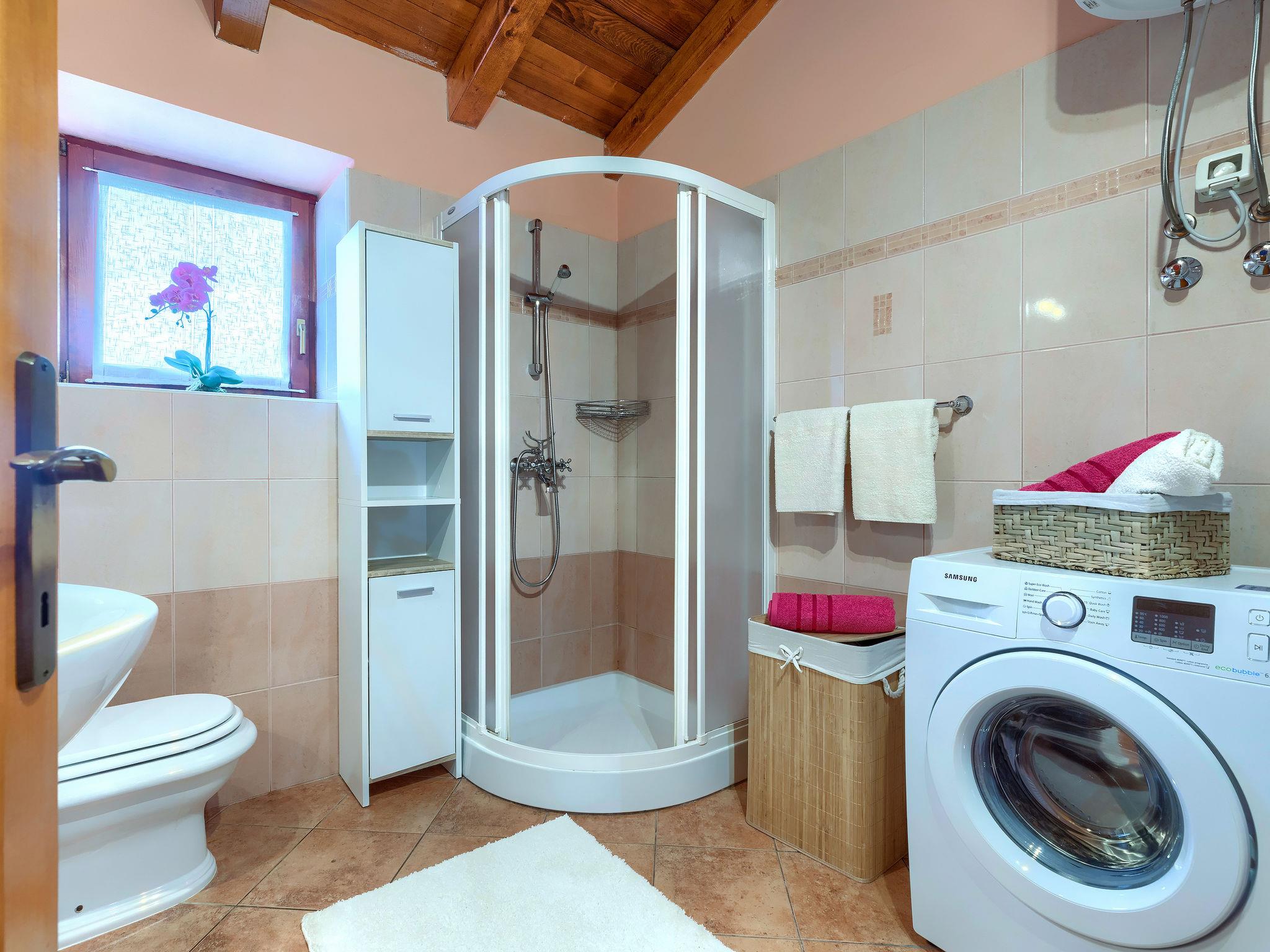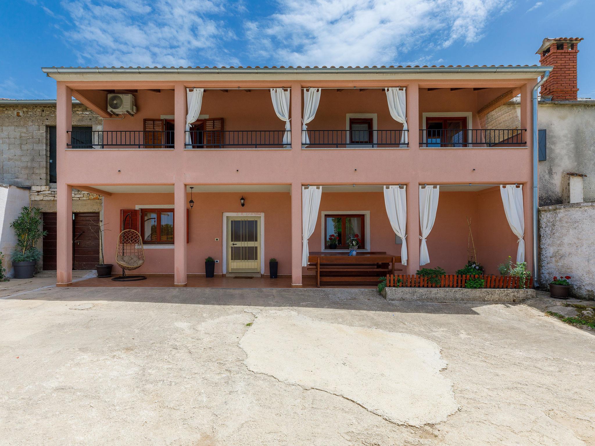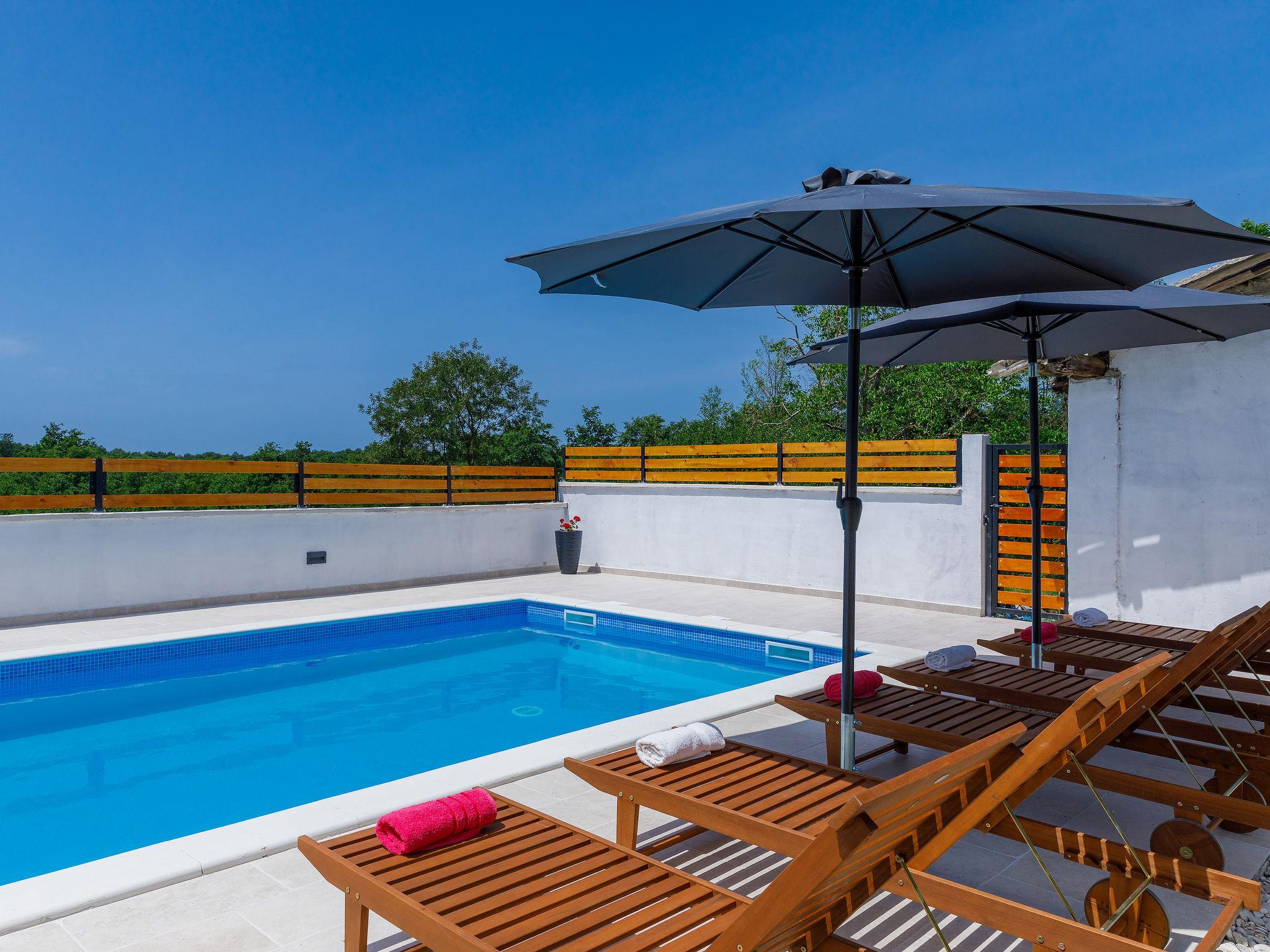 Terraced house "Villa Mate i Kate", 2 storeys. In the hamlet Leprincani 2 km from the centre of Žminj, 25 km from the centre of Rovinj, in a sunny position, 25 km from the sea. Private: property 700 m2, swimming pool angular (8 x 4 m, depth 150 cm, seasonal availability: 01.May. - 01.Oct.) with internal staircase. Outdoor shower, barbecue (swing). In the house: internet access, trampoline, washing machine. Parking (for 2 cars) at the house on the premises. Shop 2.5 km, restaurant 2.5 km, bus stop 2.4 km, pebble beach 25 km. Walking paths from the house 100 m, cycle lane 150 m. Nearby attractions: adventure park 3 km, amusement park 6 km. Please note: suitable for families. The owner does not accept any youth groups.