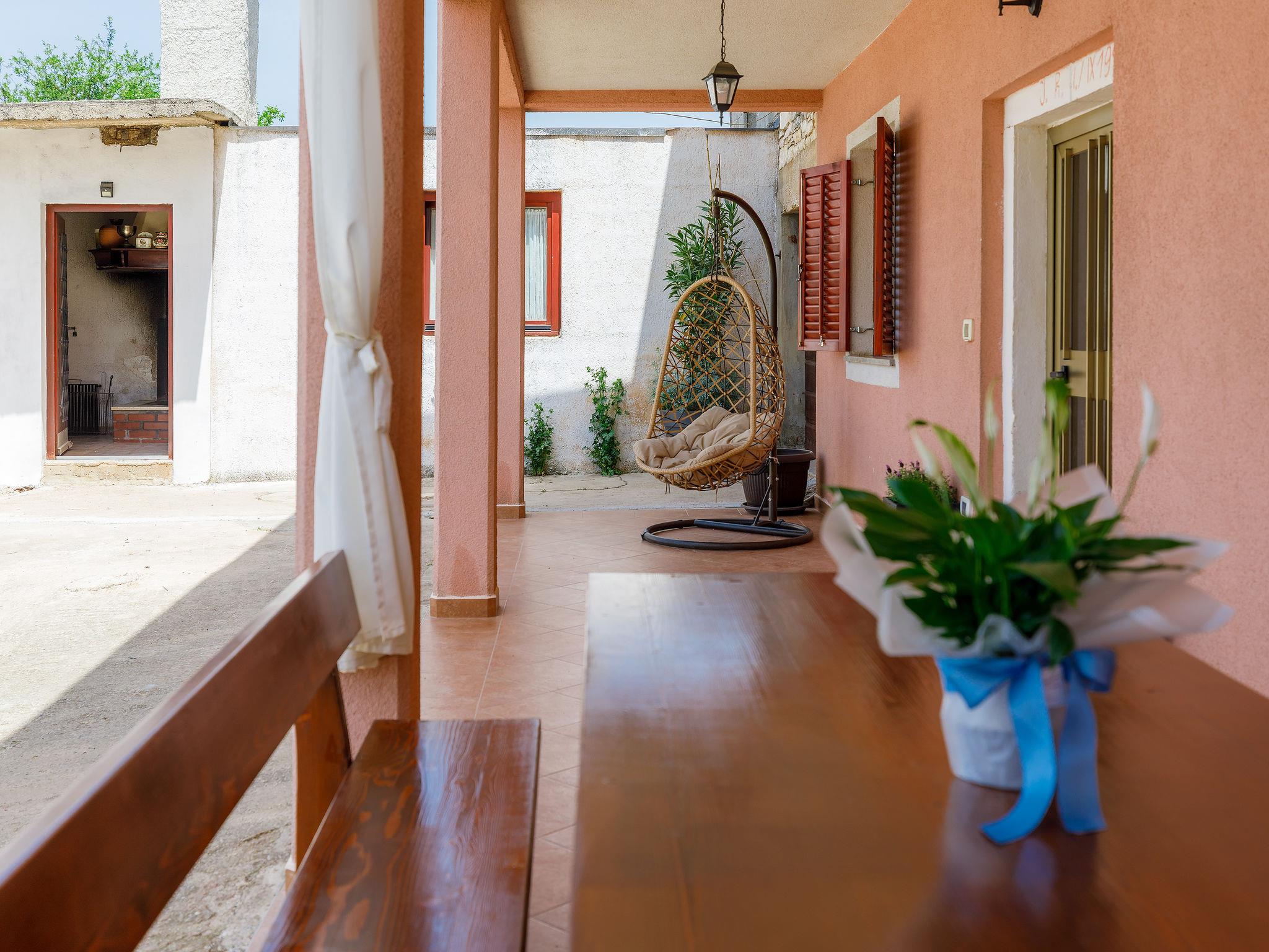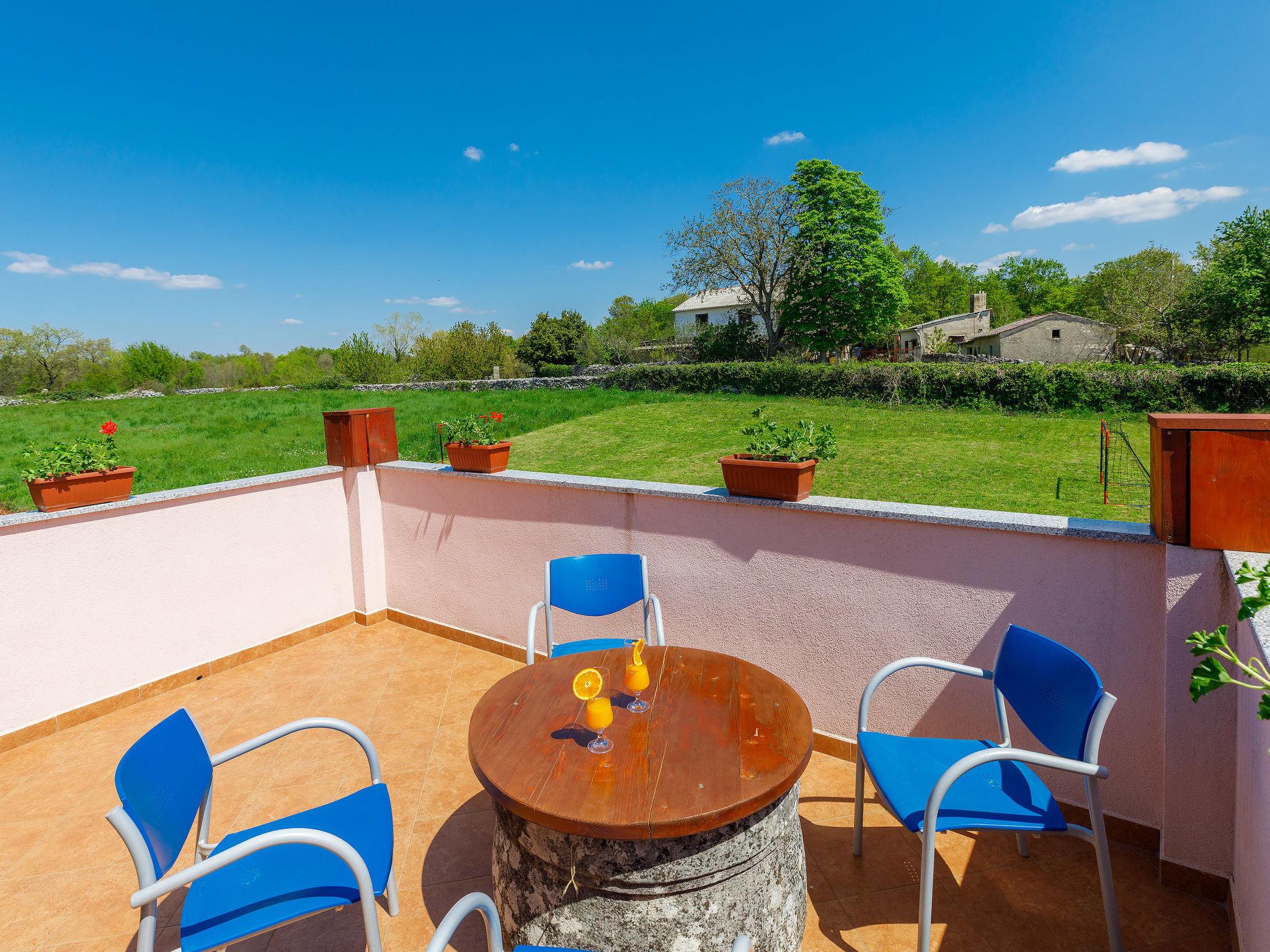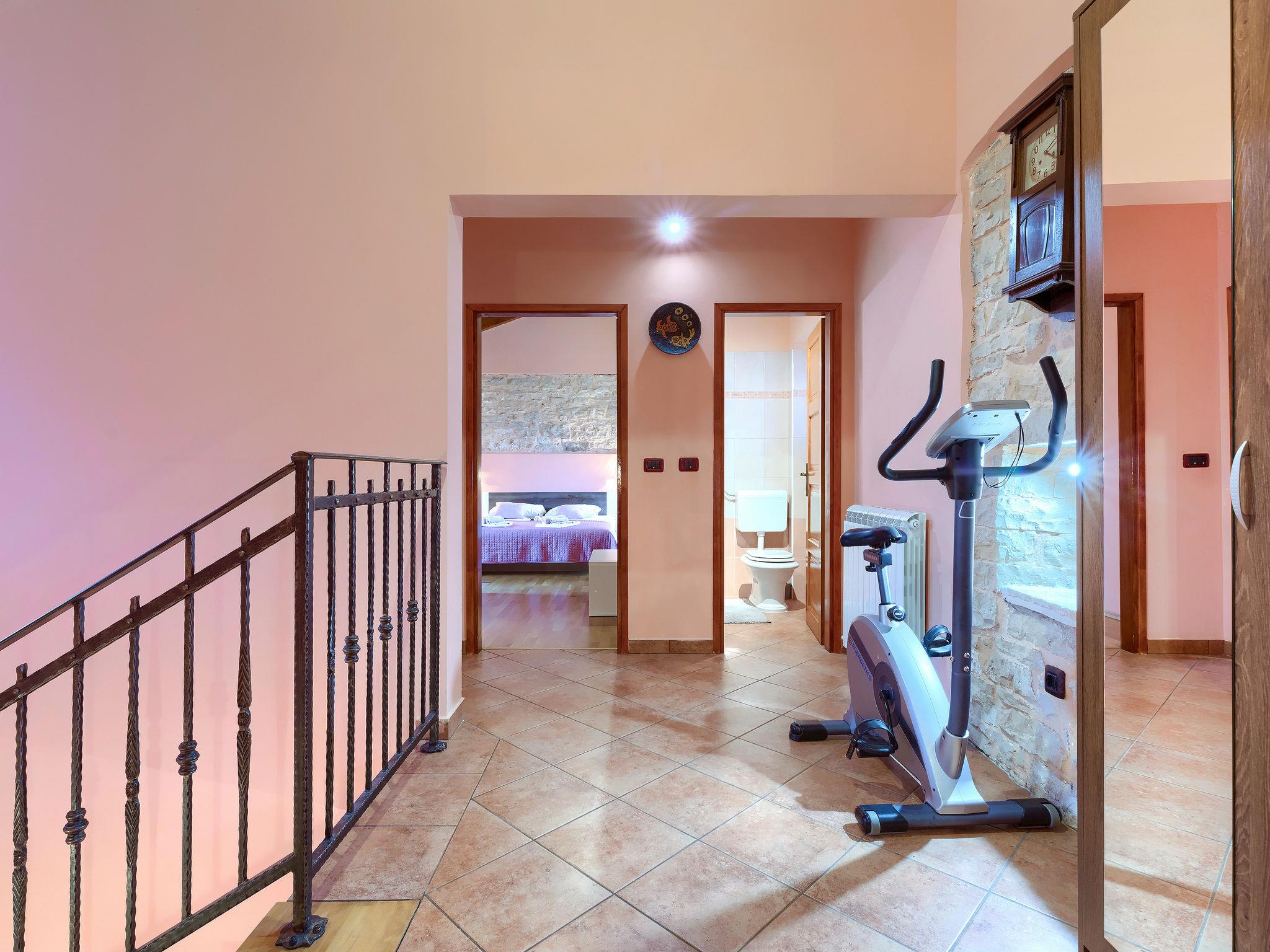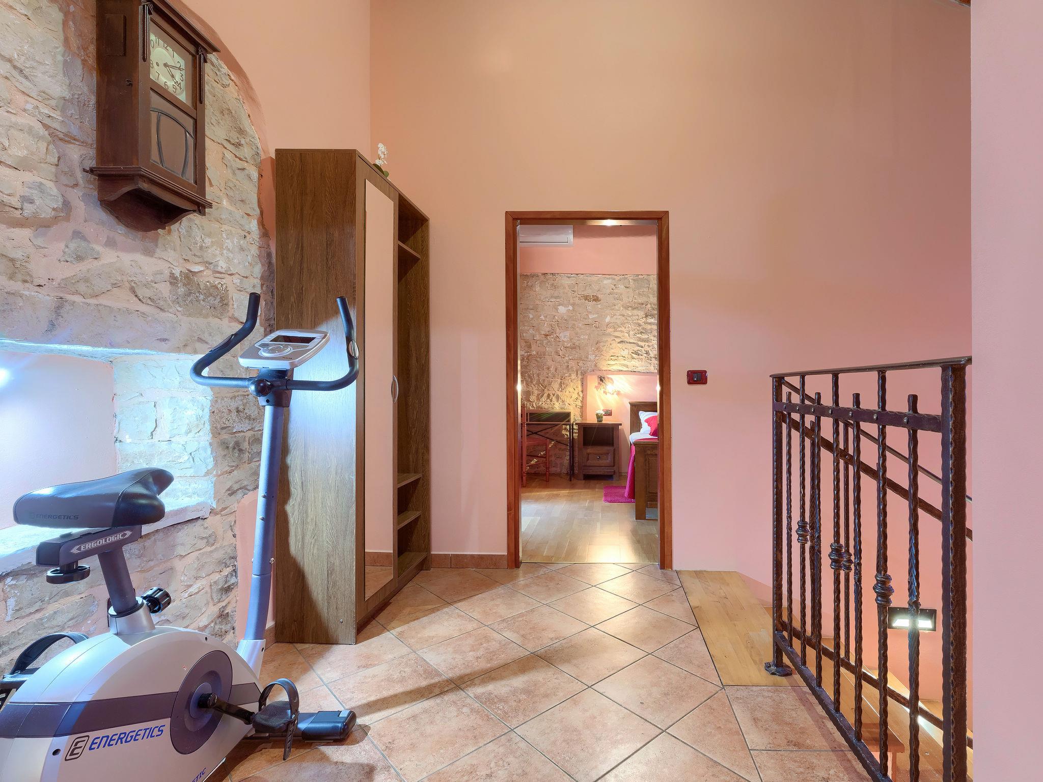 Terraced house "Villa Mate i Kate", 2 storeys. In the hamlet Leprincani 2 km from the centre of Žminj, 25 km from the centre of Rovinj, in a sunny position, 25 km from the sea. Private: property 700 m2, swimming pool angular (8 x 4 m, depth 150 cm, seasonal availability: 01.May. - 01.Oct.) with internal staircase. Outdoor shower, barbecue (swing). In the house: internet access, trampoline, washing machine. Parking (for 2 cars) at the house on the premises. Shop 2.5 km, restaurant 2.5 km, bus stop 2.4 km, pebble beach 25 km. Walking paths from the house 100 m, cycle lane 150 m. Nearby attractions: adventure park 3 km, amusement park 6 km. Please note: suitable for families. The owner does not accept any youth groups.