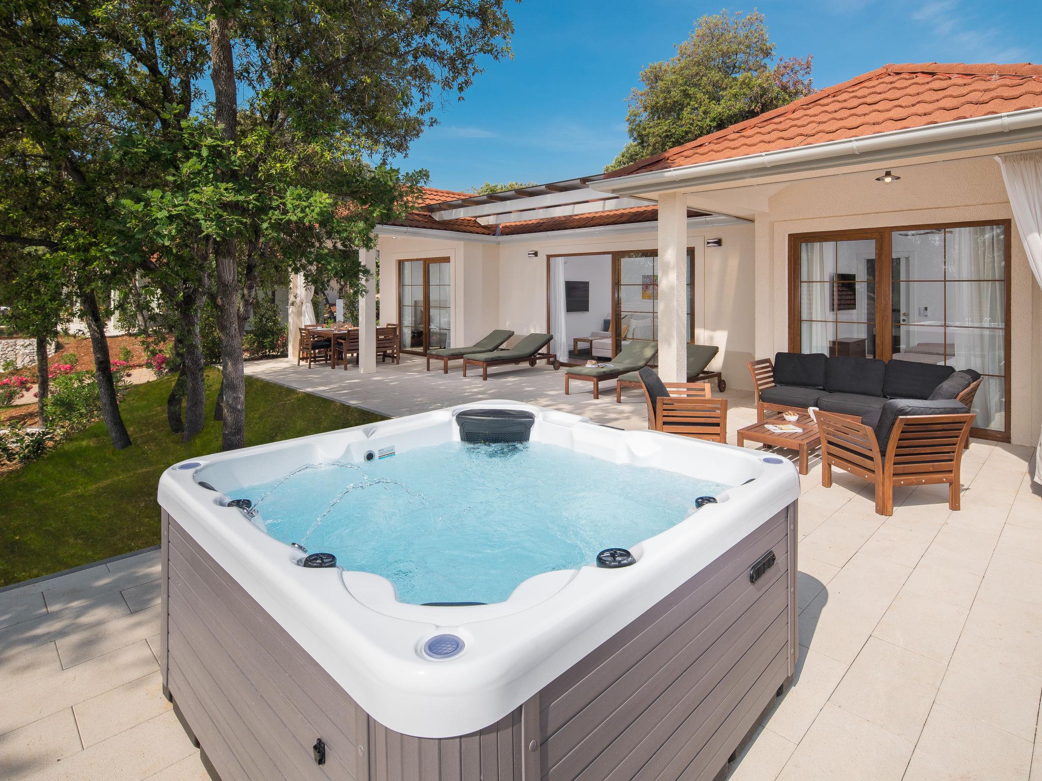 "Luxury Bay Villa with private hot tub", 3-room villa 67 m2. Beautiful and modern furnishings: living/dining room with 1 sofabed (88 cm, length 260 cm), satellite TV. Exit to the terrace. 1 room with 1 french bed (200 cm, length 220 cm), shower/WC. 1 room with 2 beds (100 cm, length 220 cm), shower/WC. Open kitchen (oven, dishwasher, 4 ceramic glass hob hotplates, toaster, kettle, microwave, electric coffee machine). Heating. 2 terraces 20 m2, covered terrace 35 m2. Terrace furniture, barbecue (portable), deck chairs (4). Facilities: washing machine, safe, iron, hair dryer. Internet (WiFi, free). Please note: suitable for families. Non-smoking house. The property is one of a type of property or apartment. The mobil homes are situated 70 - 150 m from the sea and the beach.