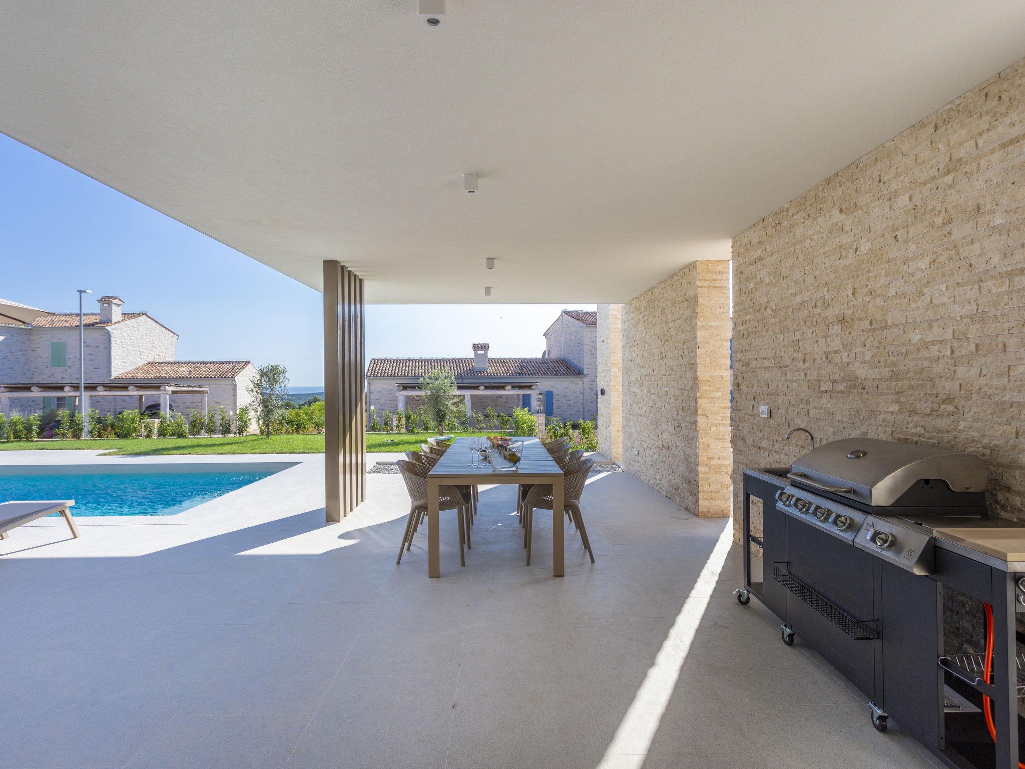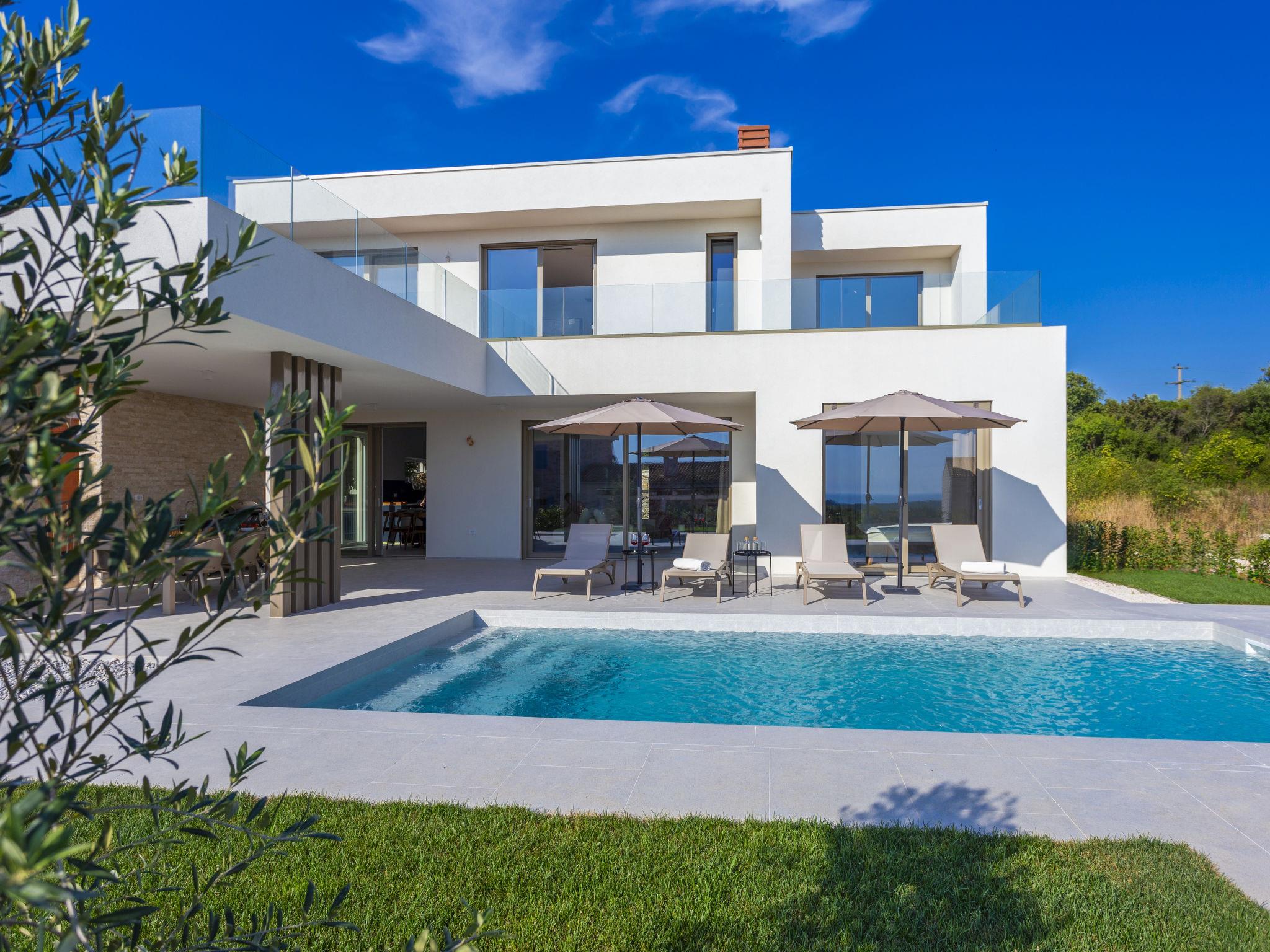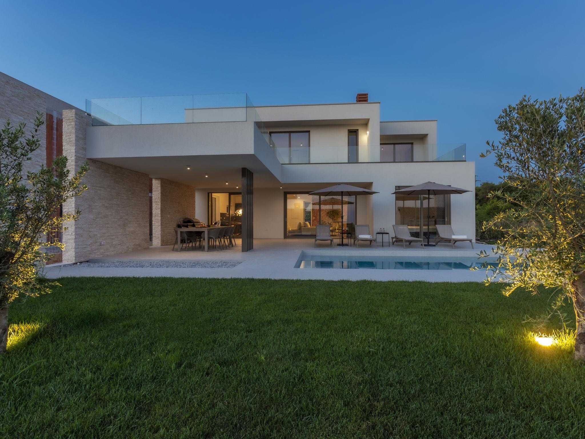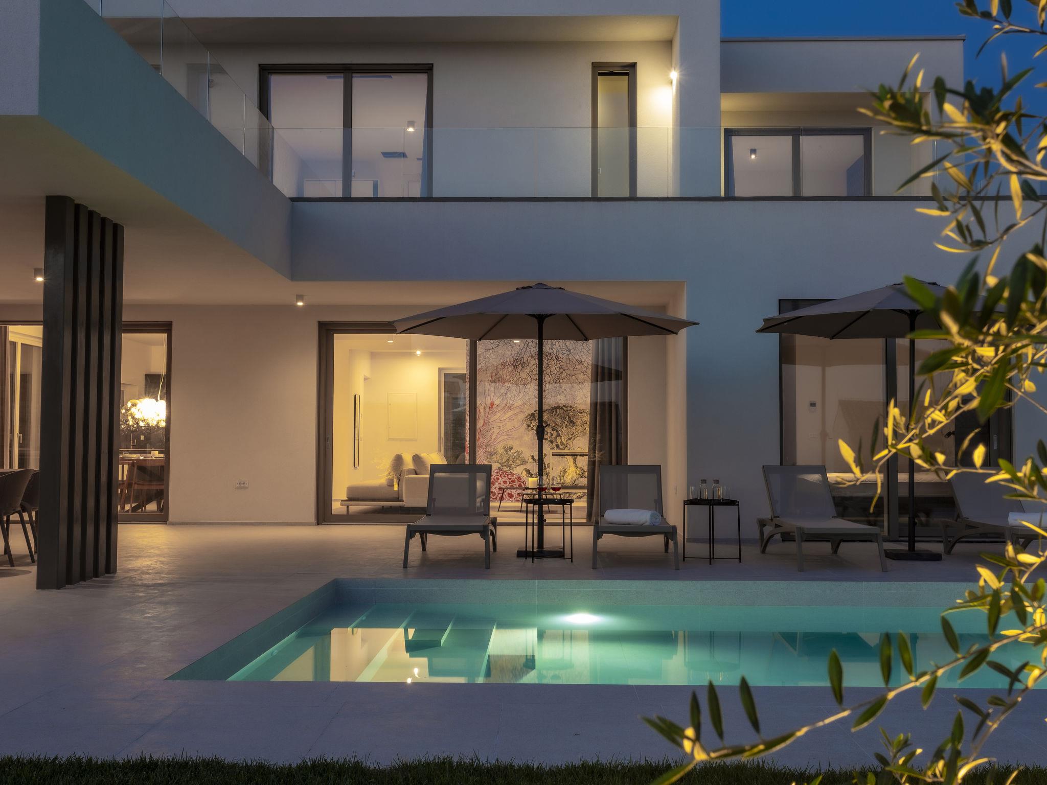 Very modern, beautiful villa "Design Emily White", 2 storeys. In the hamlet Cubani 3 km from the centre of Bale, in a sunny position residential area (villas), 6 km from the sea, 6 km from the beach. Private: property 690 m2 (fenced) with lawn, swimming pool angular (8 x 4 m, depth 140 cm, seasonal availability: 01.Apr. - 01.Nov.) with internal staircase. Outdoor shower, terrace (20 m2), garden furniture, barbecue. In the house: internet access, air conditioning, washing machine. Parking (for 3 cars) at the house on the premises. Grocery 3 km, restaurant 3 km, bus stop 3 km, pebble beach 6 km. The owner does not accept any youth groups.