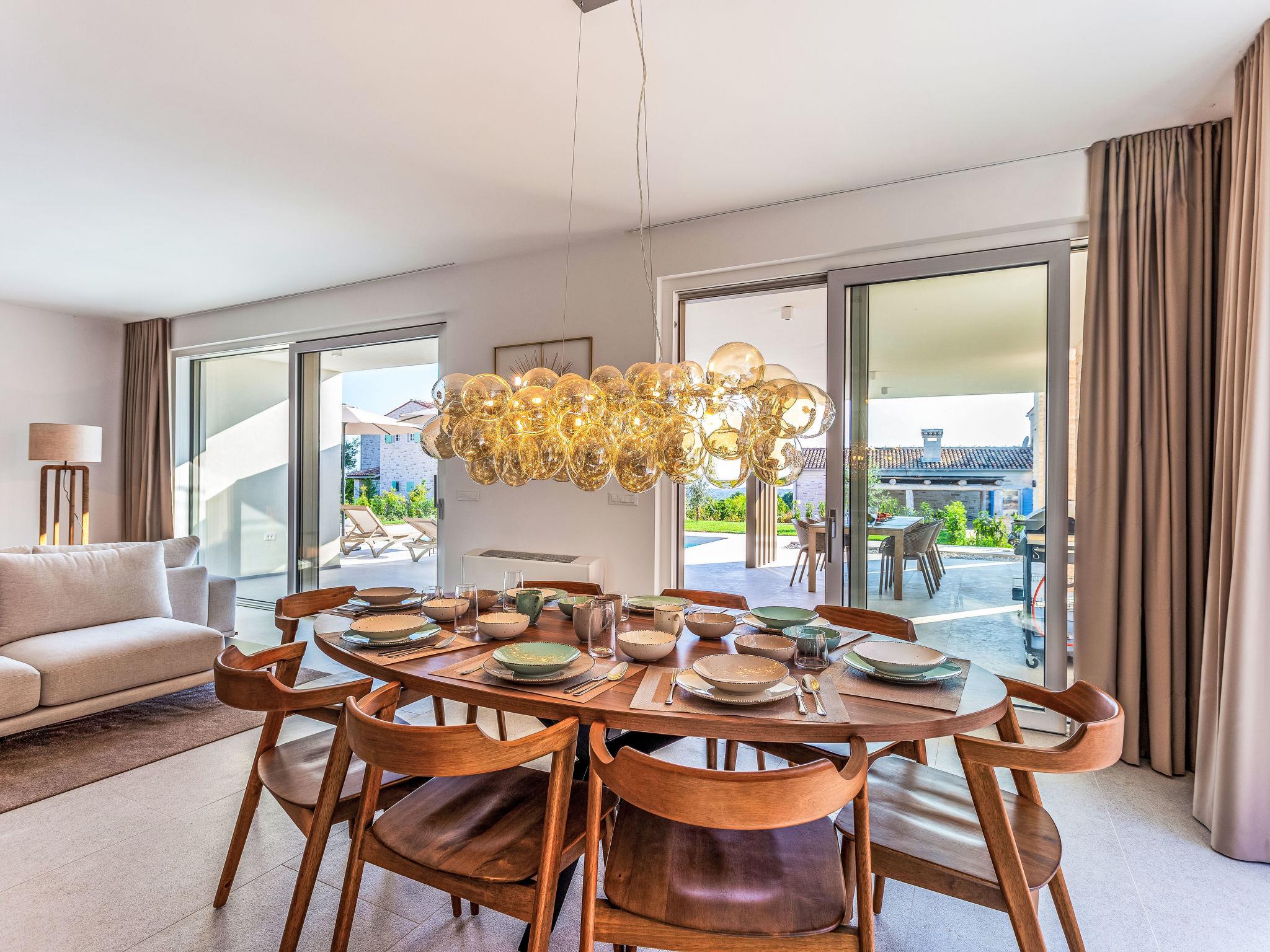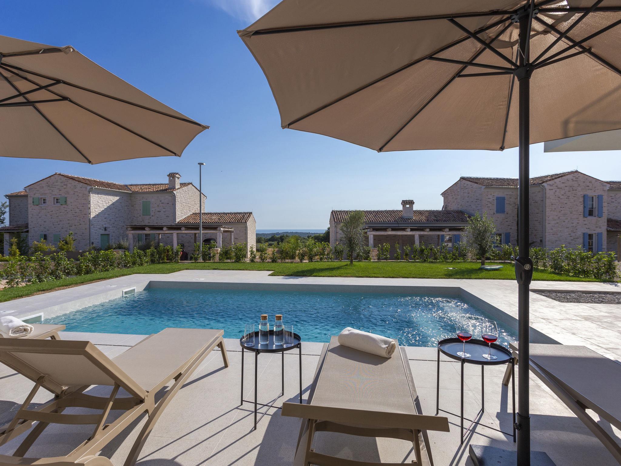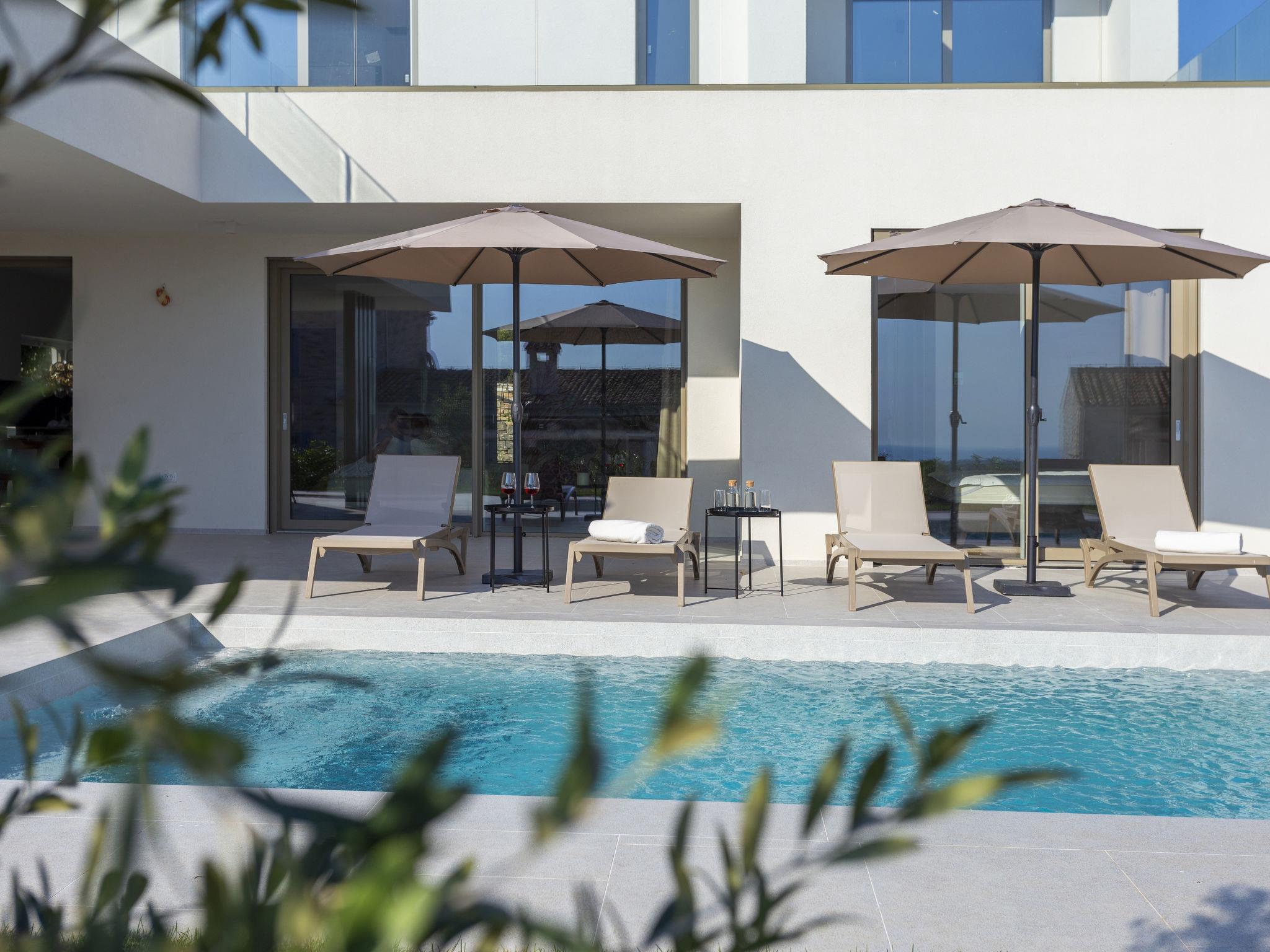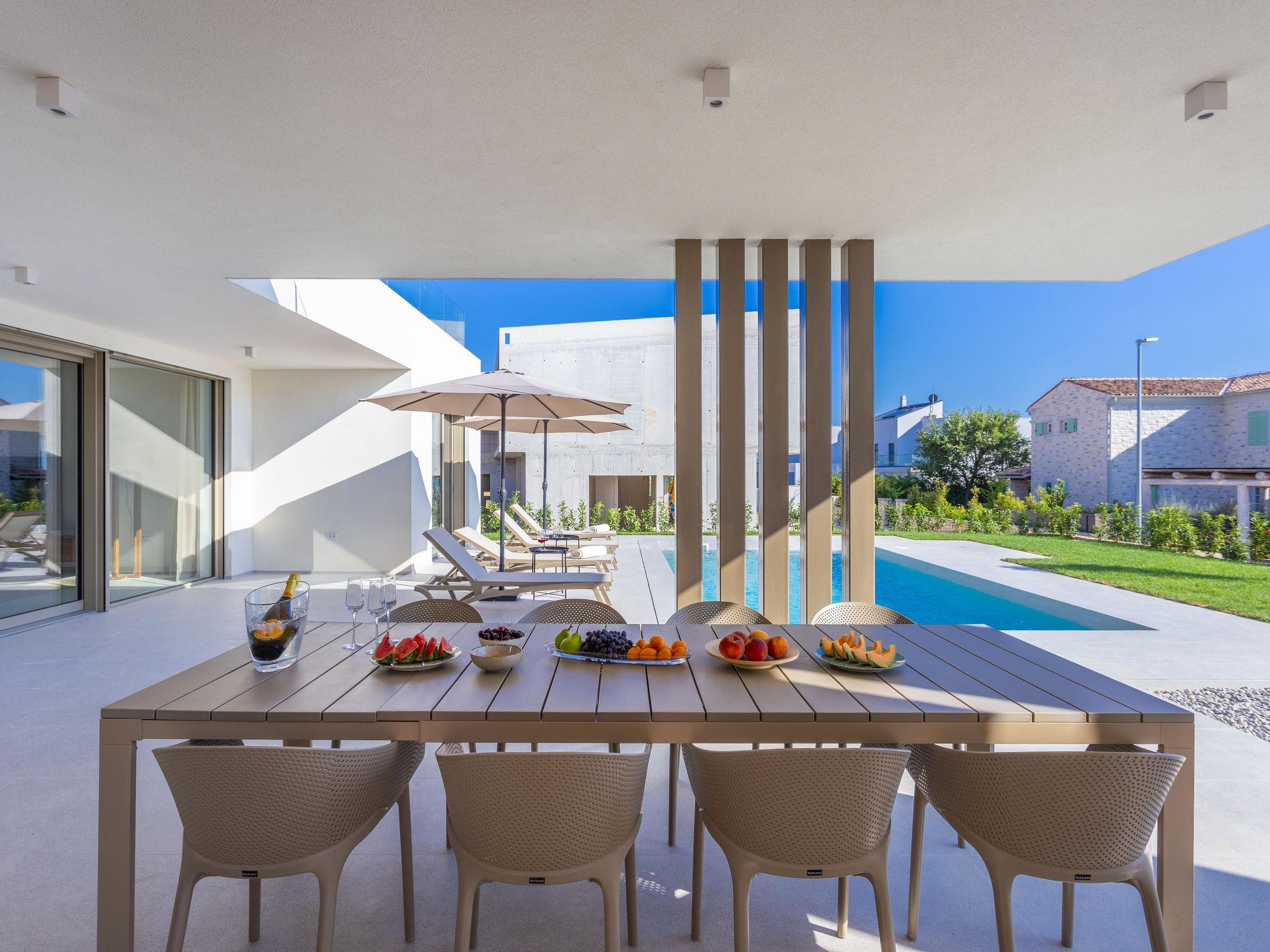 Very modern, beautiful villa "Design Emily White", 2 storeys. In the hamlet Cubani 3 km from the centre of Bale, in a sunny position residential area (villas), 6 km from the sea, 6 km from the beach. Private: property 690 m2 (fenced) with lawn, swimming pool angular (8 x 4 m, depth 140 cm, seasonal availability: 01.Apr. - 01.Nov.) with internal staircase. Outdoor shower, terrace (20 m2), garden furniture, barbecue. In the house: internet access, air conditioning, washing machine. Parking (for 3 cars) at the house on the premises. Grocery 3 km, restaurant 3 km, bus stop 3 km, pebble beach 6 km. The owner does not accept any youth groups.