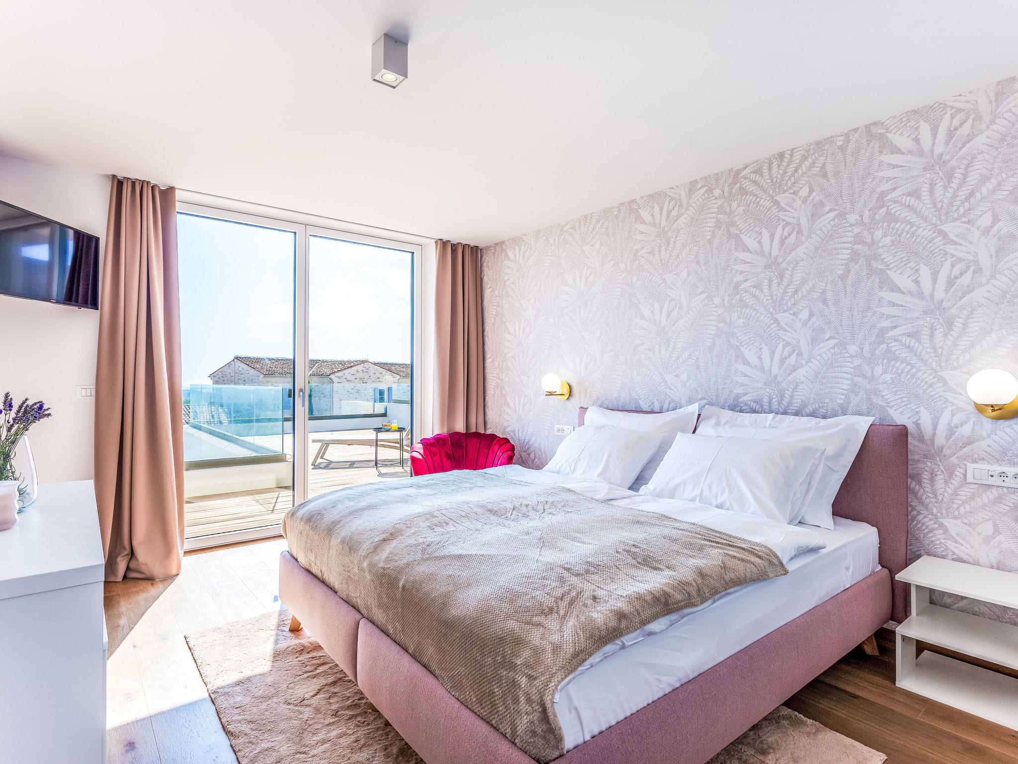 5-room villa 229 m2 on 2 levels. Very luxurious and tasteful furnishings: living/dining room with satellite TV (flat screen). Exit to the terrace, to the swimming pool. 1 room with 1 double bed (2 x 90 cm, length 200 cm), shower/WC and satellite TV (flat screen). Exit to the terrace, to the swimming pool. Open kitchen (oven, dishwasher, 4 induction hot plates, toaster, kettle, freezer, electric coffee machine). Sep. WC. Forced-air heating. Upper floor: 3 rooms, each room with 1 double bed (2 x 90 cm, length 200 cm), shower/WC and satellite TV (flat screen). Exit to the terrace. Deck chairs. Beautiful view of the sea and the swimming pool. Facilities: safe, children's high chair, baby cot, hair dryer. Internet (WiFi, free). Please note: non-smoking house.