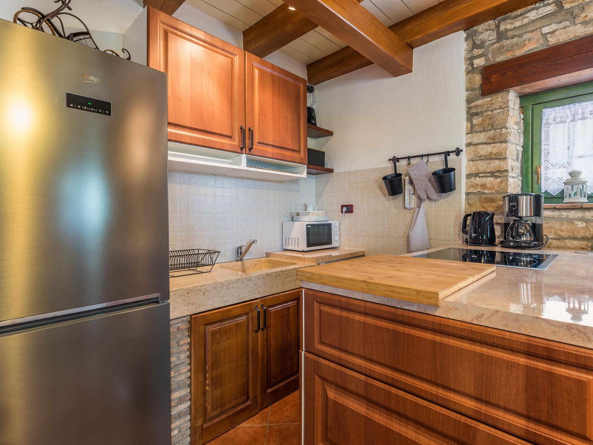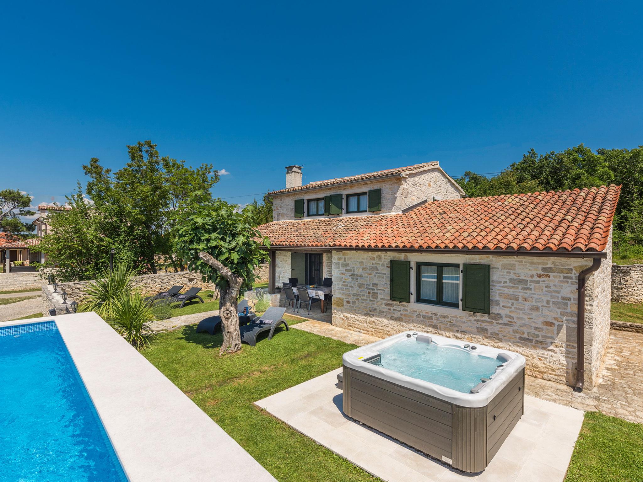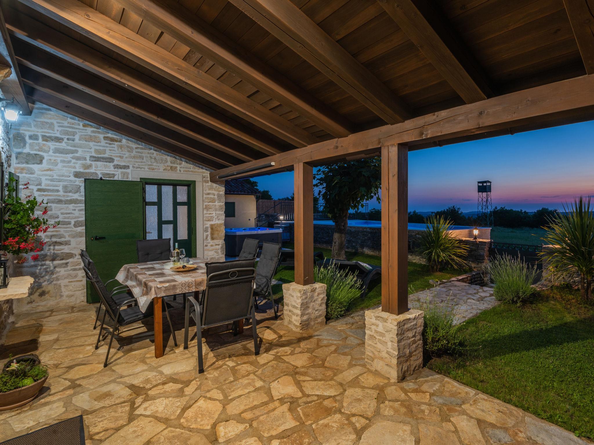 Old single-family house "Villa Ana Rita", 2 storeys, renovated in 2018. 900 m from the centre of Kanfanar, in a quiet, sunny position, 8 km from the sea, in a cul-de-sac. Private: property 400 m2 (fenced), garden with lawn, swimming pool angular, heated (8 x 3 m, 26 m2, depth 150 cm, seasonal availability: 01.May. - 31.Oct.) with internal staircase. Outdoor shower, hot tub, table tennis, terrace (25 m2), garden furniture, barbecue. In the house: internet access, storage room for bicycles, washing machine. Parking (for 4 cars) at the house on the premises. Shop 900 m, supermarket 1 km, restaurant 1 km, bus stop 950 m, pebble beach 18 km. Surf school 18 km, sailing school 18 km, tennis 5 km, riding stable 5 km, walking paths from the house 20 m, cycle lane 40 m. It is necessary to announce 7 days in advance if the pool heating is required.