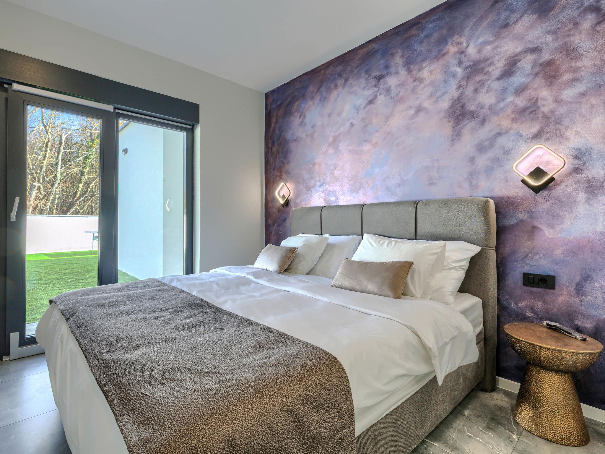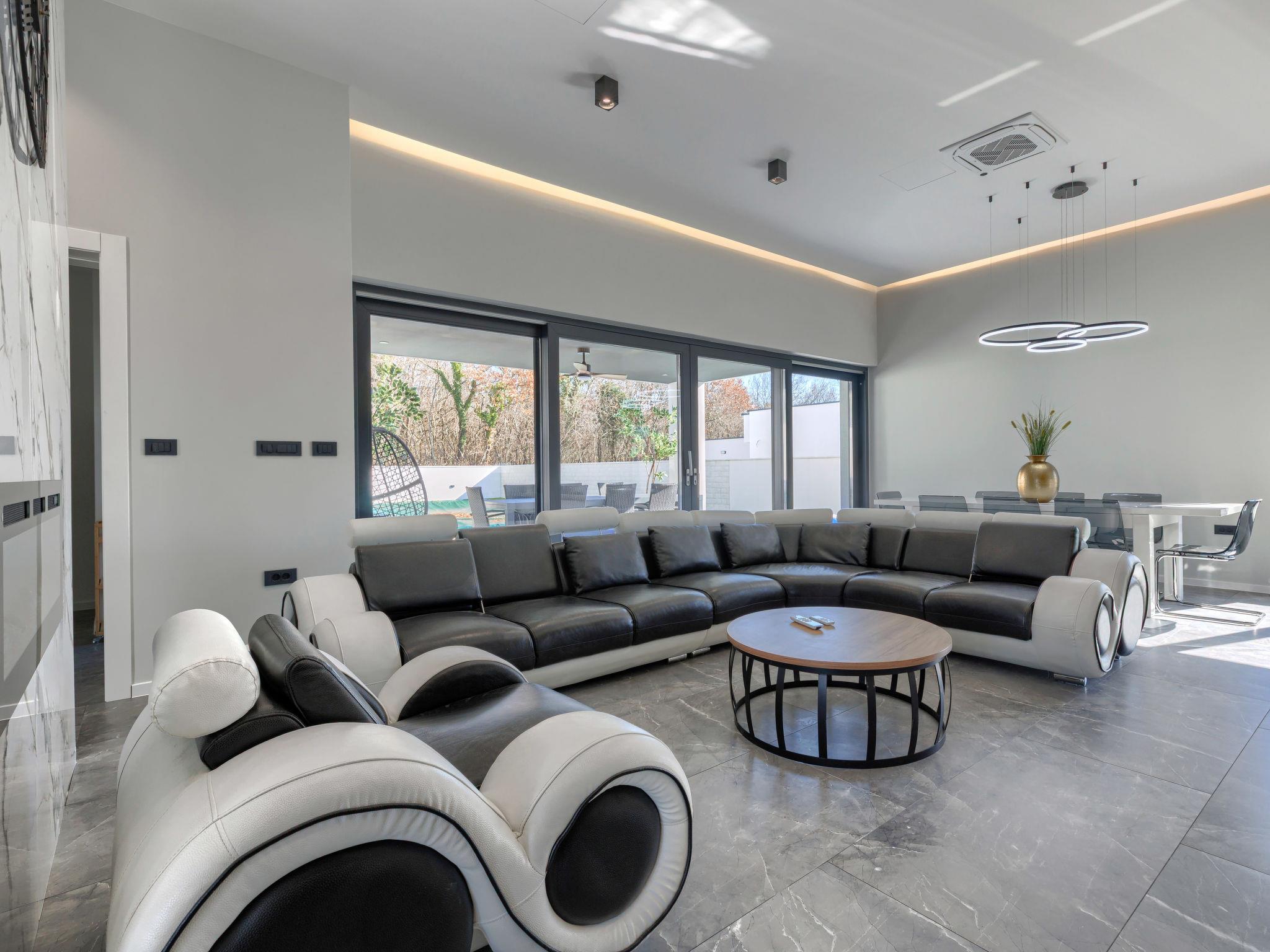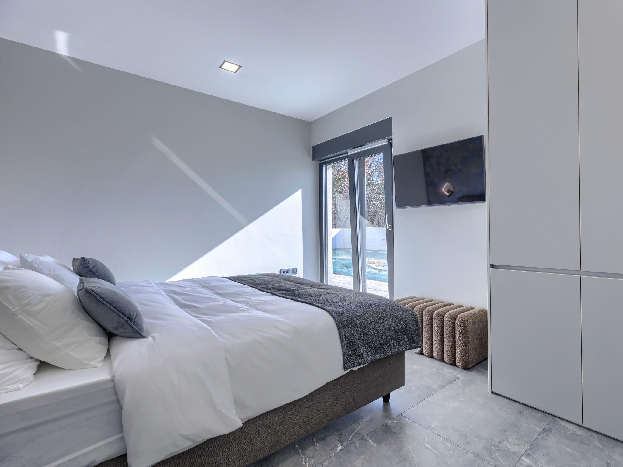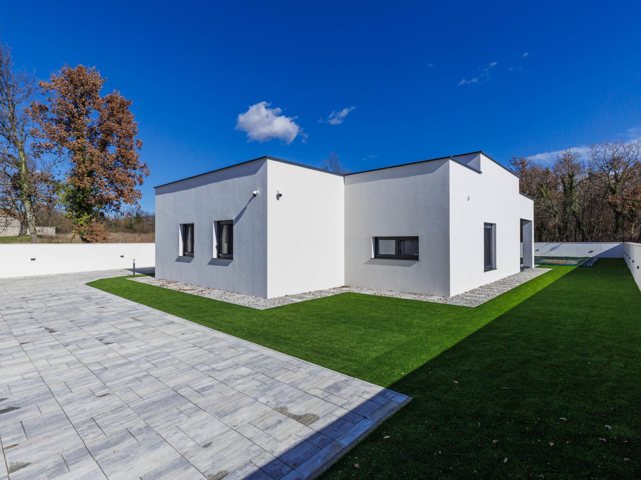 Modern villa "De Karlo", built in 2025. In the hamlet Ladici 9 km from the centre of Kanfanar, 26 km from the centre of Rovinj, 26 km from the sea, 26 km from the beach. Private: property 908 m2 (fenced), swimming pool angular, heated (11 x 5 m, 55 m2, depth 140 cm, seasonal availability: 01.Mar. - 01.Dec.) with internal staircase and salt-electrolysis pool-cleaning system. Hot tub, pool house with fridge, shower and WC, table tennis, terrace (20 m2), garden furniture, barbecue. In the house: internet access, sauna, washing machine. Parking (for 4 cars) at the house on the premises. Shop 9 km, restaurant 5 km, bus stop 3 km, pebble beach 26 km. Groups of teenagers on request only. Swimming pool heated (extra). It is necessary to announce 7 days in advance if the pool heating is required.