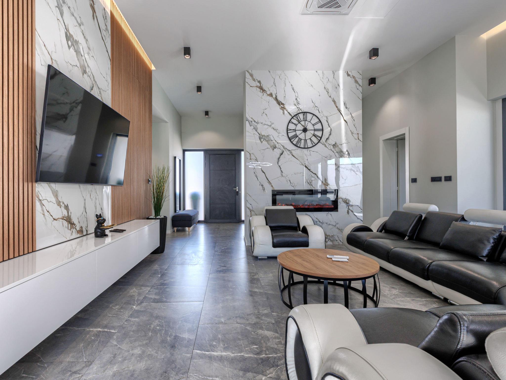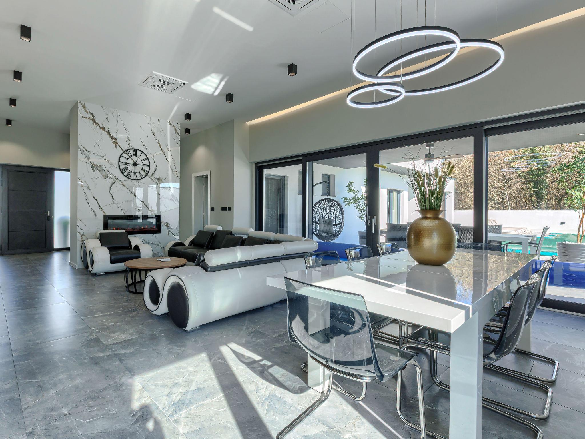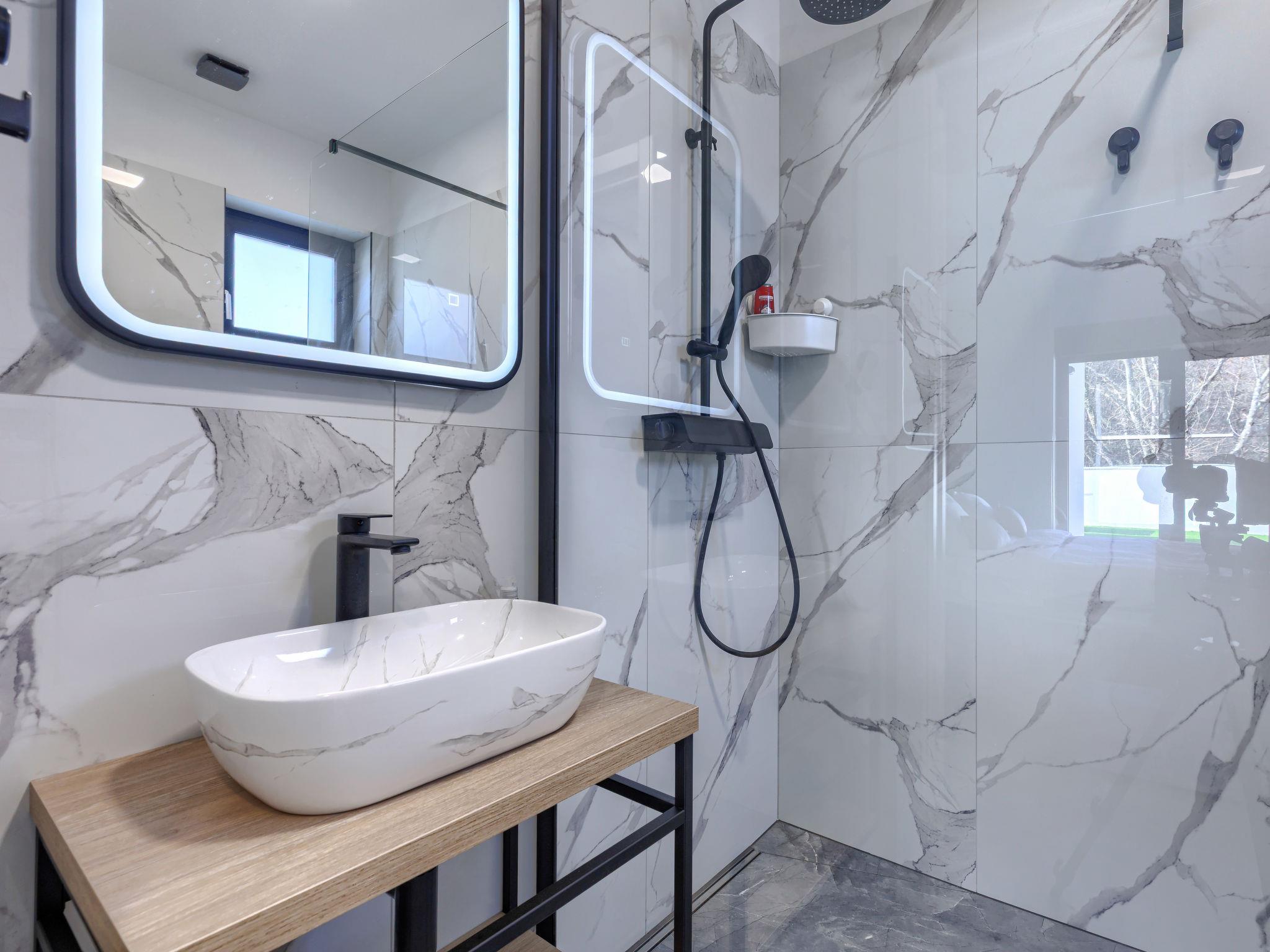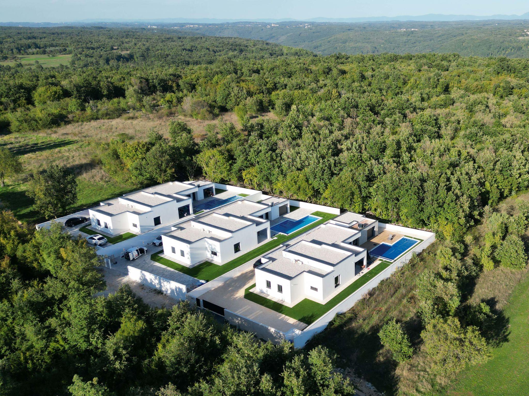 Modern villa "De Karlo", built in 2025. In the hamlet Ladici 9 km from the centre of Kanfanar, 26 km from the centre of Rovinj, 26 km from the sea, 26 km from the beach. Private: property 908 m2 (fenced), swimming pool angular, heated (11 x 5 m, 55 m2, depth 140 cm, seasonal availability: 01.Mar. - 01.Dec.) with internal staircase and salt-electrolysis pool-cleaning system. Hot tub, pool house with fridge, shower and WC, table tennis, terrace (20 m2), garden furniture, barbecue. In the house: internet access, sauna, washing machine. Parking (for 4 cars) at the house on the premises. Shop 9 km, restaurant 5 km, bus stop 3 km, pebble beach 26 km. Groups of teenagers on request only. Swimming pool heated (extra). It is necessary to announce 7 days in advance if the pool heating is required.