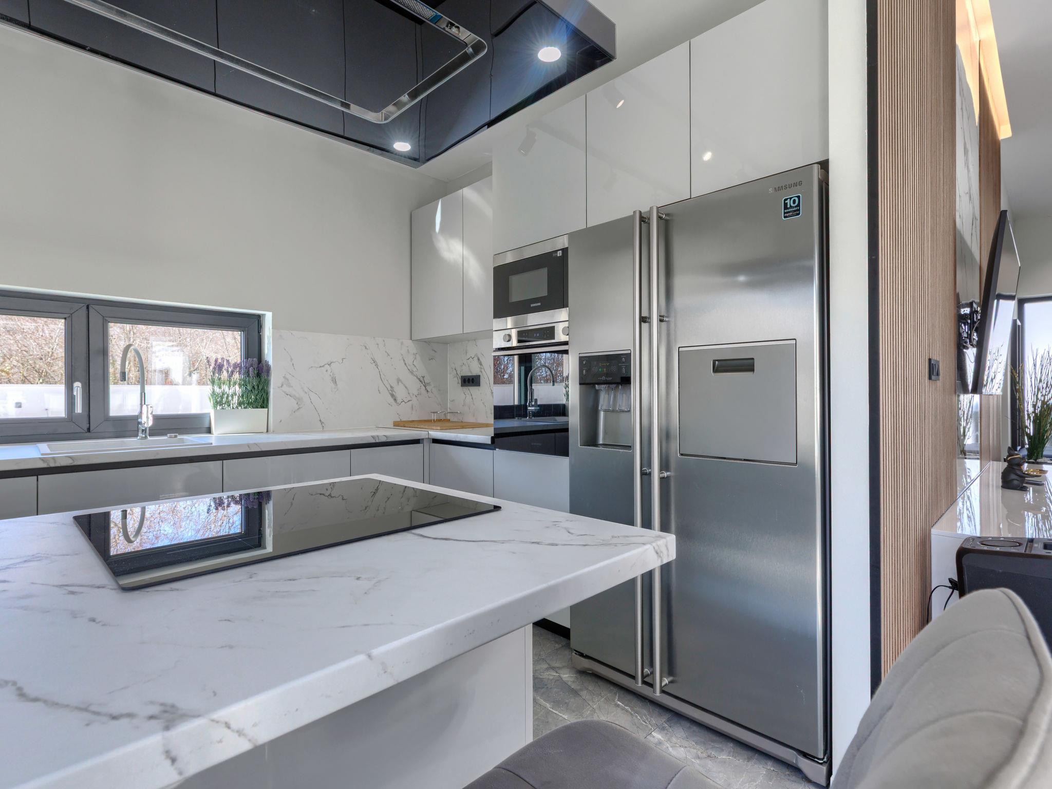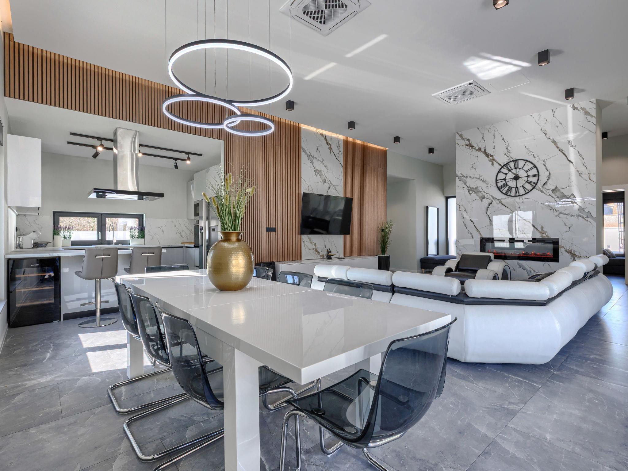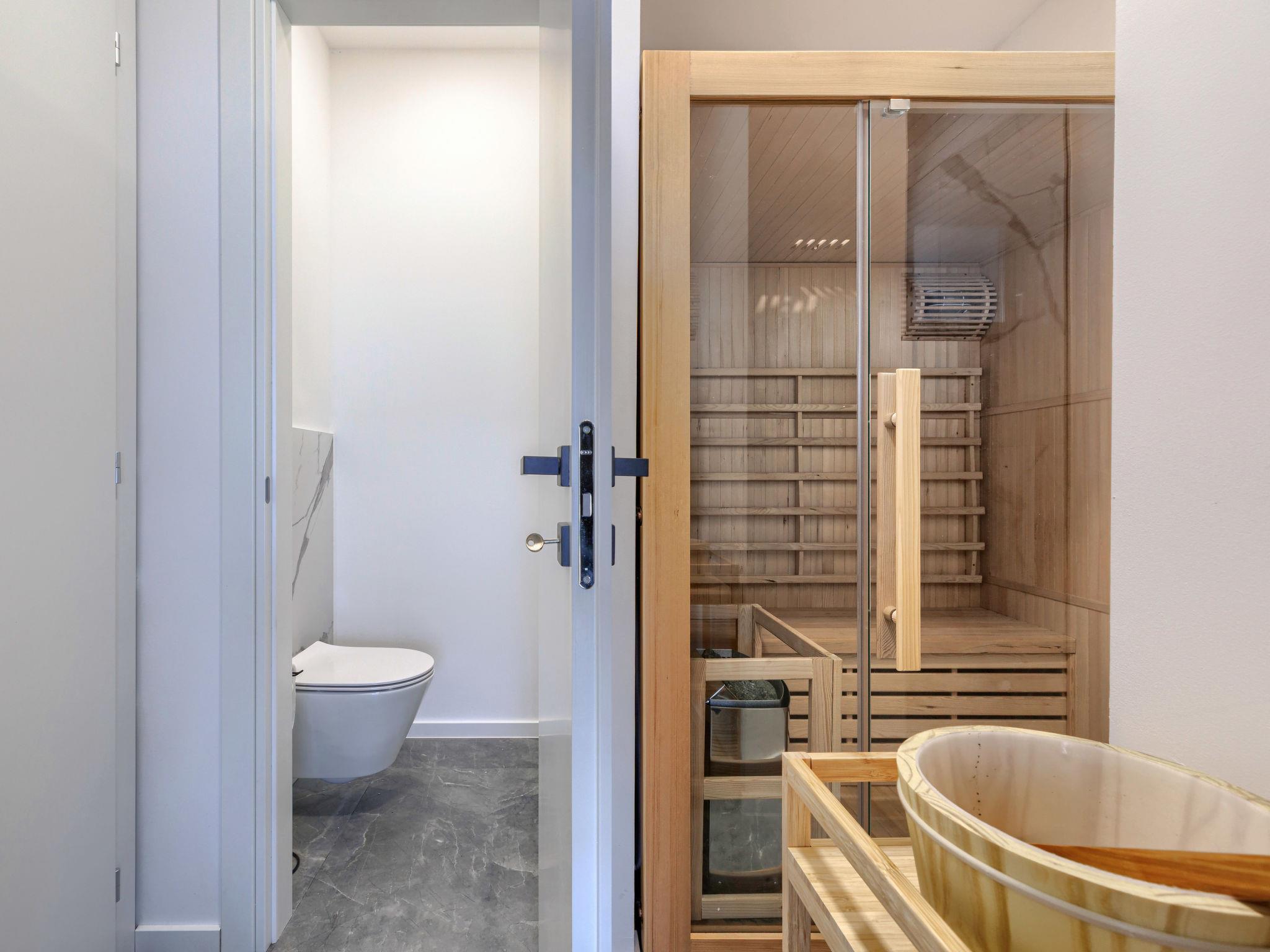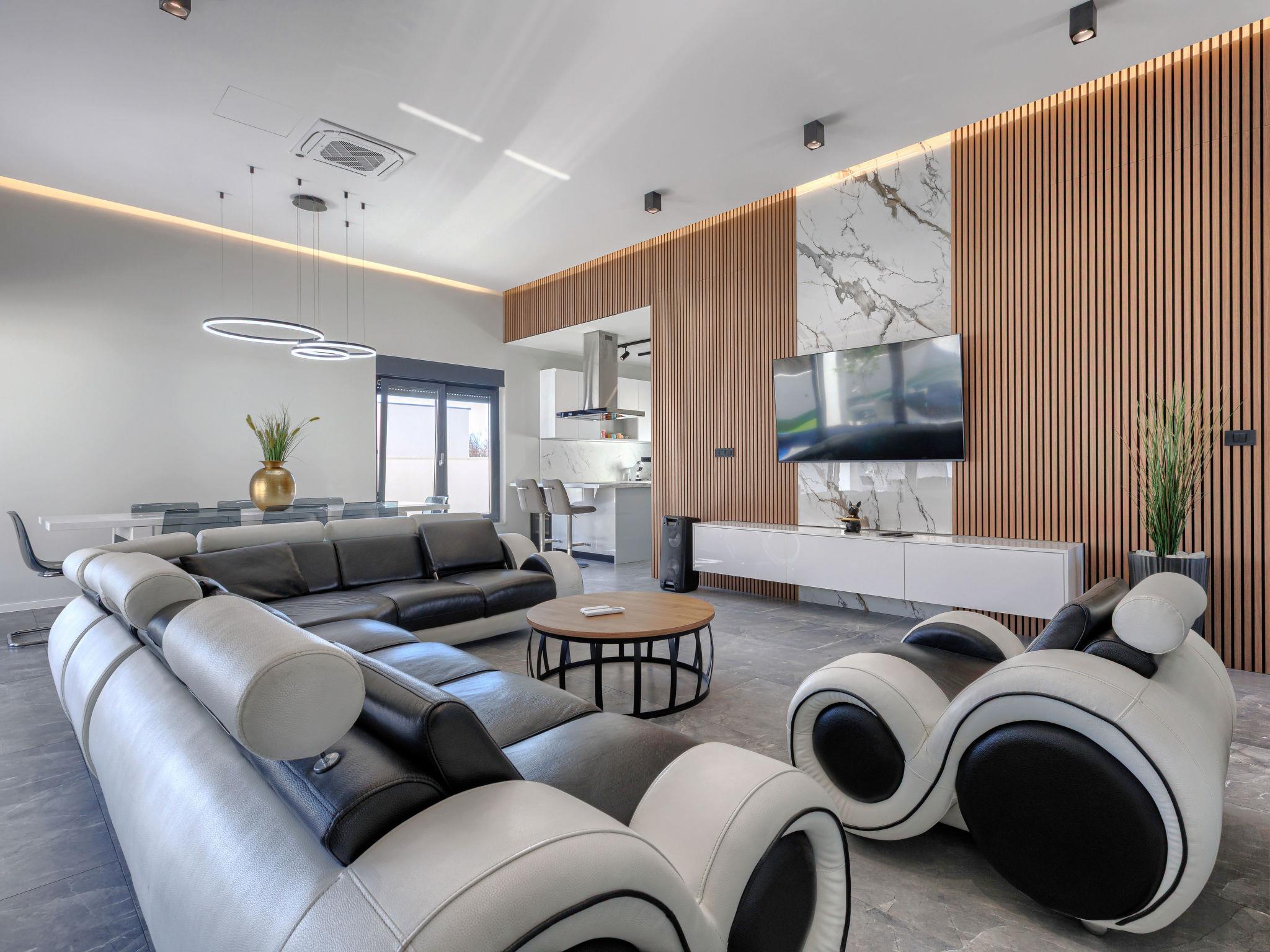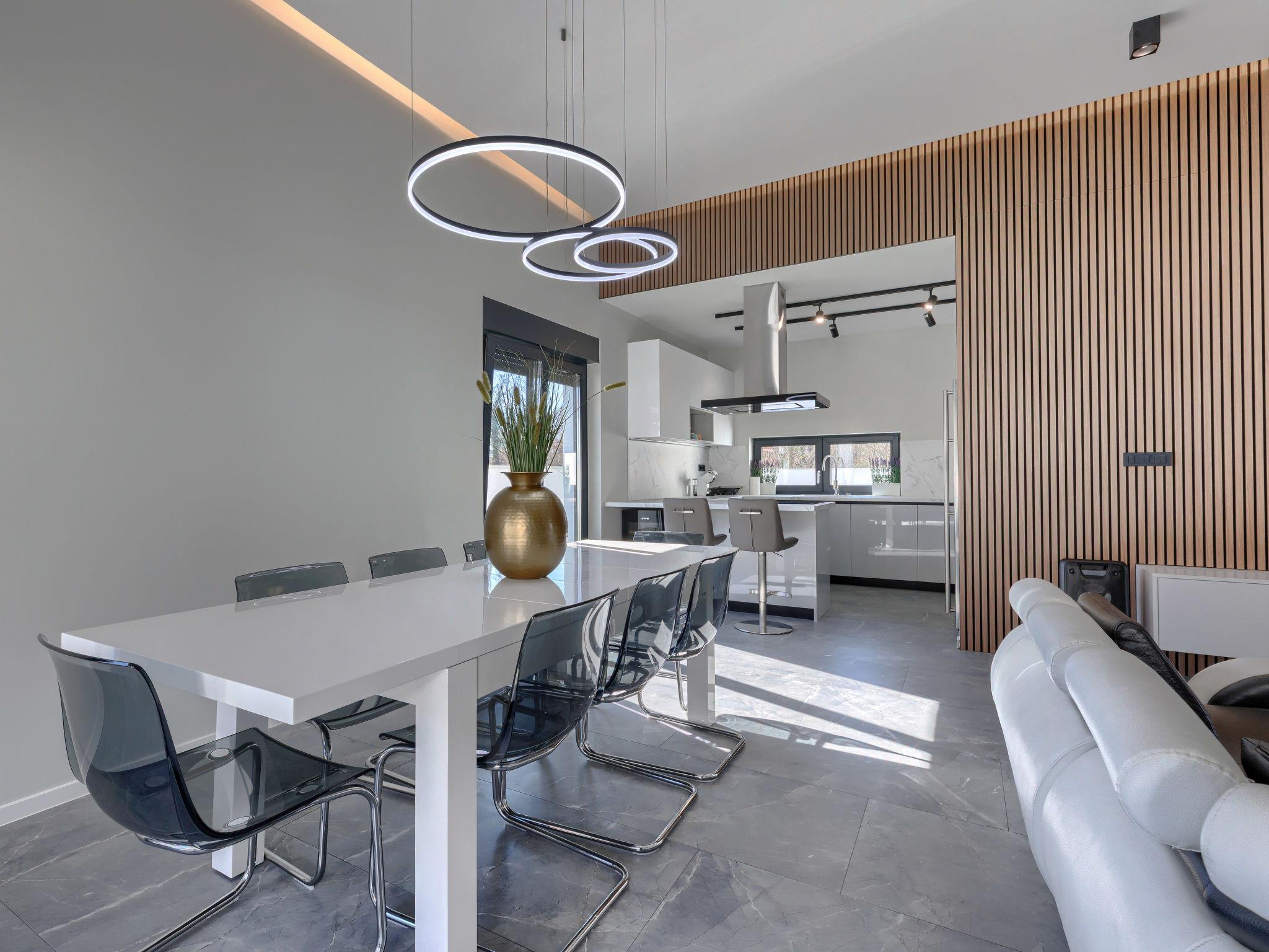 Modern villa "De Karlo", built in 2025. In the hamlet Ladici 9 km from the centre of Kanfanar, 26 km from the centre of Rovinj, 26 km from the sea, 26 km from the beach. Private: property 908 m2 (fenced), swimming pool angular, heated (11 x 5 m, 55 m2, depth 140 cm, seasonal availability: 01.Mar. - 01.Dec.) with internal staircase and salt-electrolysis pool-cleaning system. Hot tub, pool house with fridge, shower and WC, table tennis, terrace (20 m2), garden furniture, barbecue. In the house: internet access, sauna, washing machine. Parking (for 4 cars) at the house on the premises. Shop 9 km, restaurant 5 km, bus stop 3 km, pebble beach 26 km. Groups of teenagers on request only. Swimming pool heated (extra). It is necessary to announce 7 days in advance if the pool heating is required.