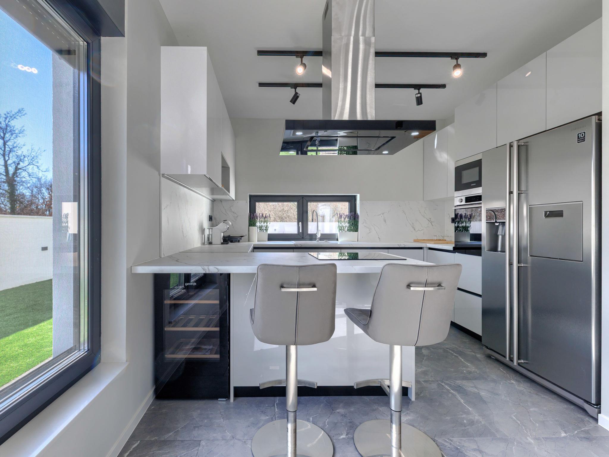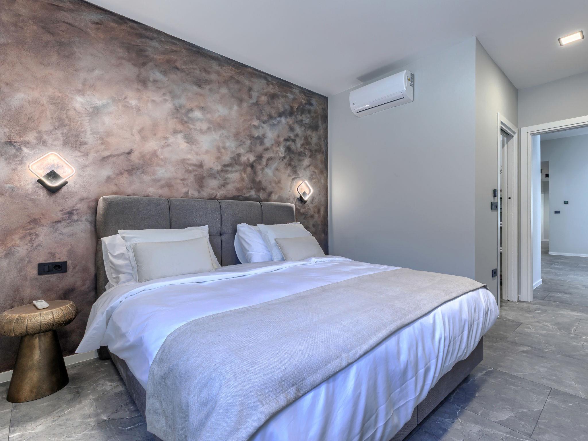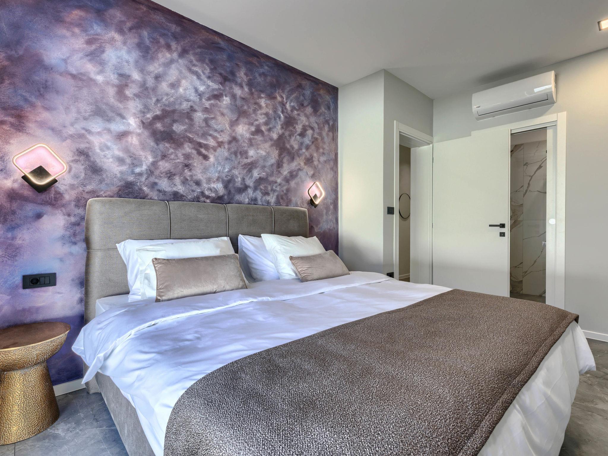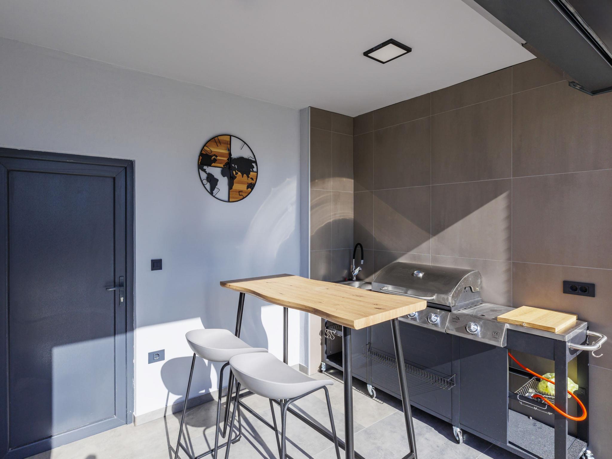 Modern villa "De Karlo", built in 2025. In the hamlet Ladici 9 km from the centre of Kanfanar, 26 km from the centre of Rovinj, 26 km from the sea, 26 km from the beach. Private: property 908 m2 (fenced), swimming pool angular, heated (11 x 5 m, 55 m2, depth 140 cm, seasonal availability: 01.Mar. - 01.Dec.) with internal staircase and salt-electrolysis pool-cleaning system. Hot tub, pool house with fridge, shower and WC, table tennis, terrace (20 m2), garden furniture, barbecue. In the house: internet access, sauna, washing machine. Parking (for 4 cars) at the house on the premises. Shop 9 km, restaurant 5 km, bus stop 3 km, pebble beach 26 km. Groups of teenagers on request only. Swimming pool heated (extra). It is necessary to announce 7 days in advance if the pool heating is required.