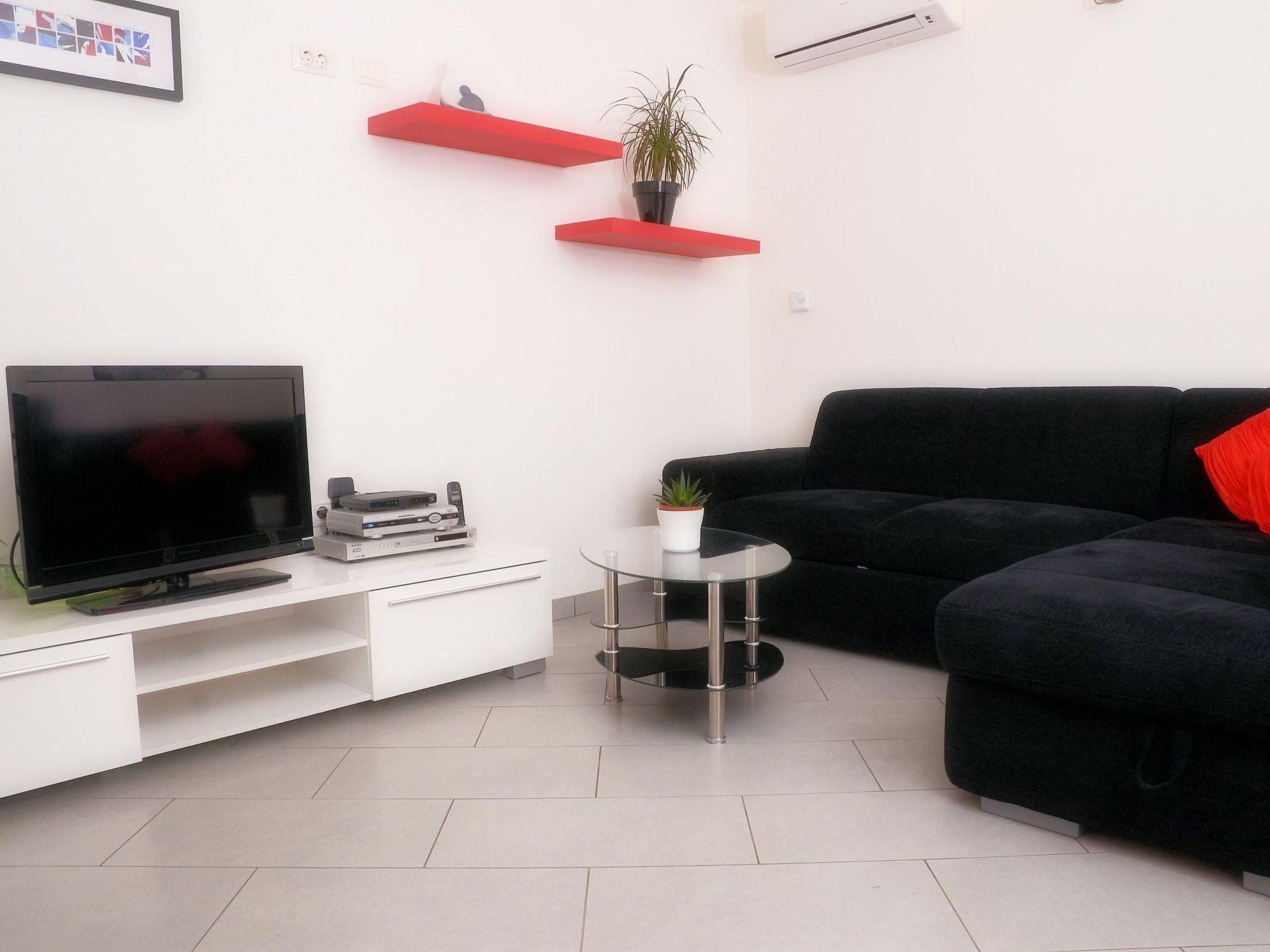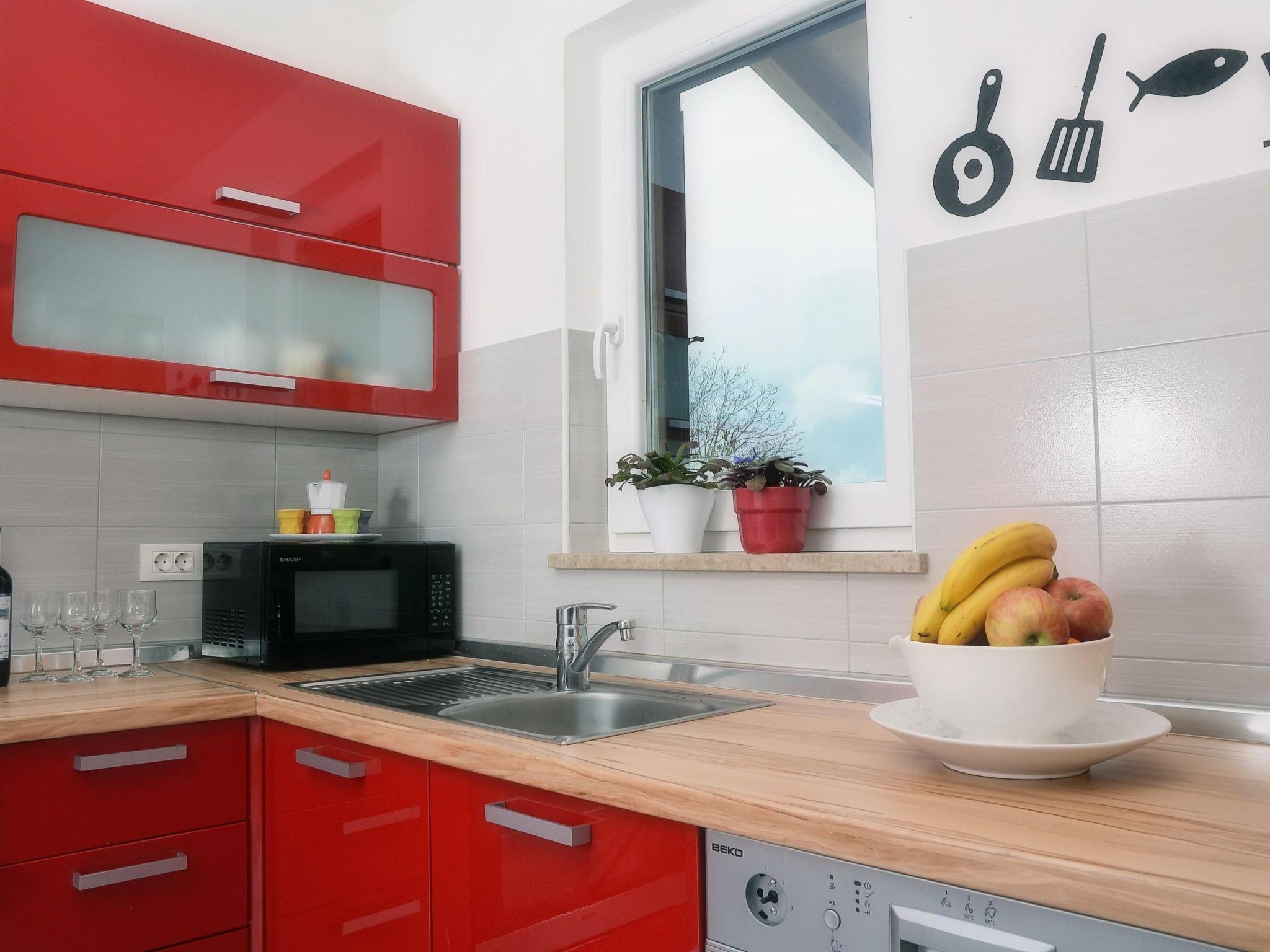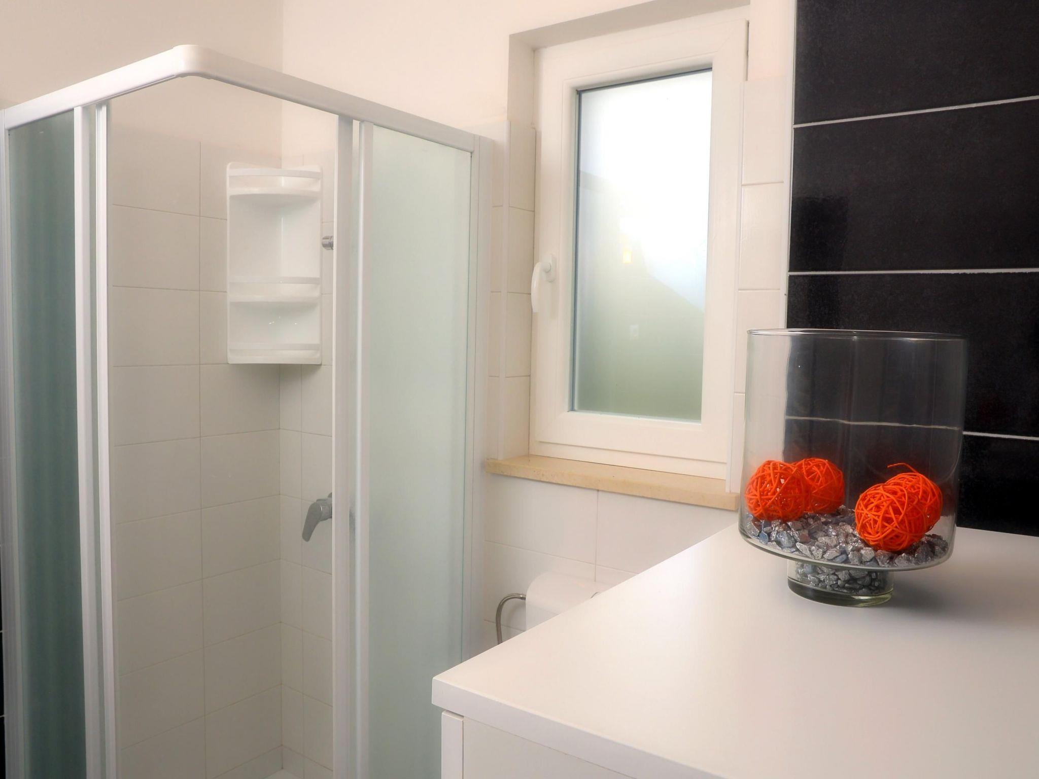 The holiday home is spread over two floors and consists of a kitchen-living room, two bedrooms and two bathrooms. On the ground floor are the kitchen-living room and one of the bathrooms, while on the upper floor are the two bedrooms and the second bathroom. The large kitchen-living room is divided into a living and dining area. The living area, with its large corner sofa (which can be used as a sofa bed) and flat-screen TV, invites one to spend pleasant evenings watching TV, while the dining area, with its dining table and kitchenette, allows one to share meals. The fully equipped kitchenette includes a gas cooker, oven and dishwasher. The bedrooms each have a 180x210 cm double bed and one of the rooms also has a sofa bed. The two bathrooms are equipped with a shower and hairdryer. The holiday home also has air conditioning and Wi-Fi access.