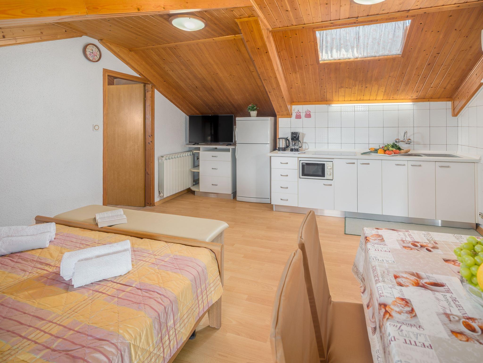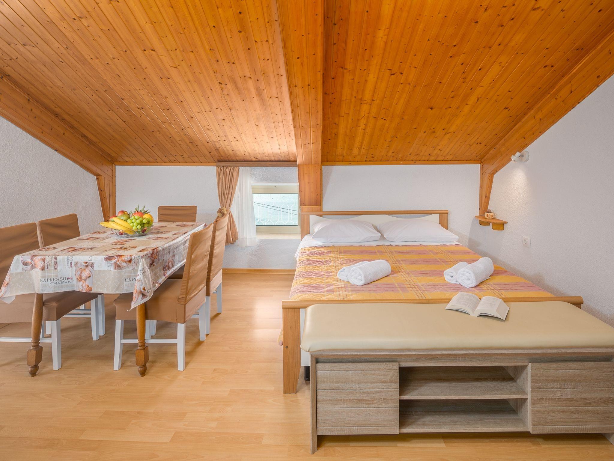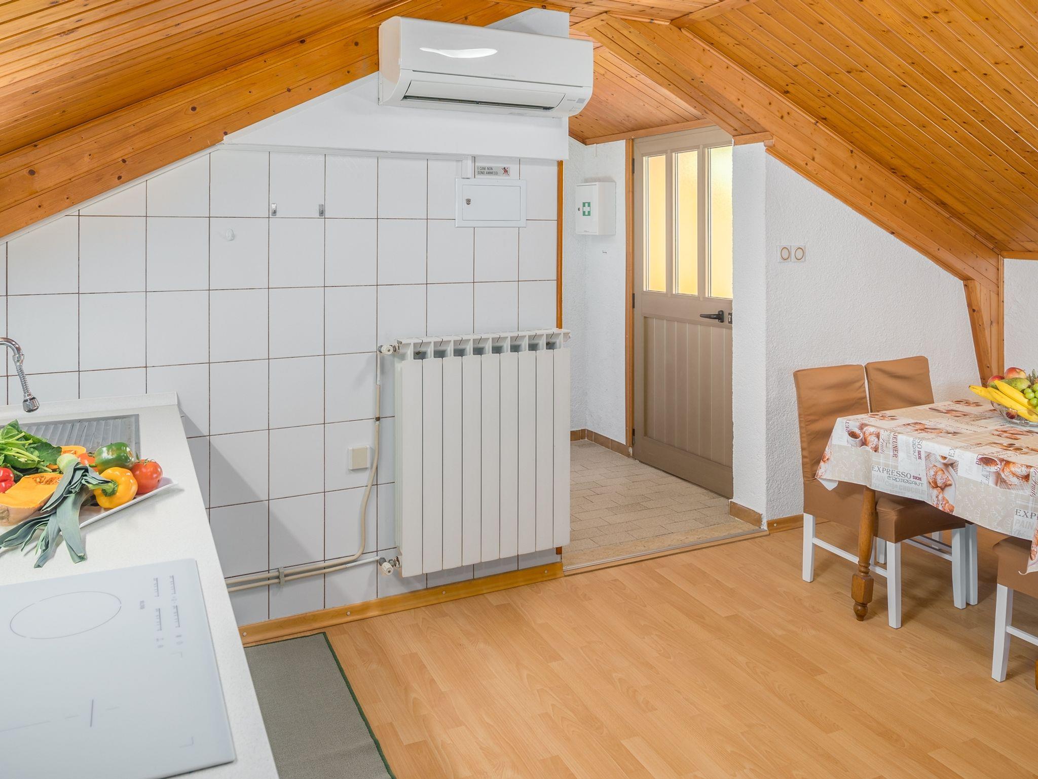 Ferienwohnung bietet Platz für 4 Gäste. Die Betten sind in Schlafzimmern, die es 1 gibt, und in Wohnzimmer, innerhalb einer Gesamtfläche von 58m2, angeordnet. Die Gäste haben eine eigene Terrasse zur Verfügung, auf der sie in warmen Sommernächten genießen können. Das Apartment bietet Meerblick. In der Unterkunftseinheit besteht die Möglichkeit des Mitbringens von Haustieren gegen Aufpreis. IM PREIS INBEGRIFFEN: Kurtaxe, Endreinigung, Klimatisierung, Zentralheizung, Parkplatz, Internet, Föhn. VERBINDLICHE ZUSÄTZLICHE KOSTEN: Aufzahlung für Kurzaufenthalte (prozentualer Zuschlag pro Nächtigungsanzahl: 30% - 1, 20% - 2, 10% - 3). UNVERBINDLICHE ZUSÄTZLICHE KOSTEN: Wäschewaschen (3,00 € Waschen), Haustiere (10,00 € pro Nacht), Zusatzbett (10,00 € pro Nacht). Die Verfügbarkeit zusätzlicher Dienstleistungen in Ihrem reservierten Termin und die Preise derselben (falls nicht aufgeführt) müssen im Voraus überprüft werden. Zusätzliche Dienstleistungen die in der Zahlungsaufforderung nicht aufgeführt sind werden direkt beim Vermieter bezahlt, angenommen der Gast nutzt auch diese.