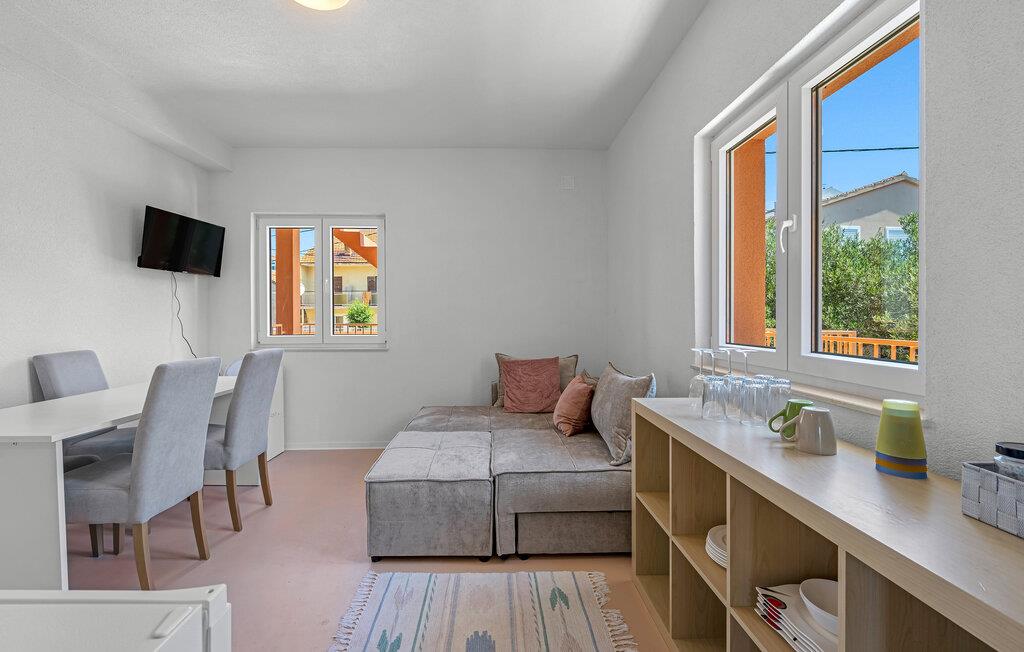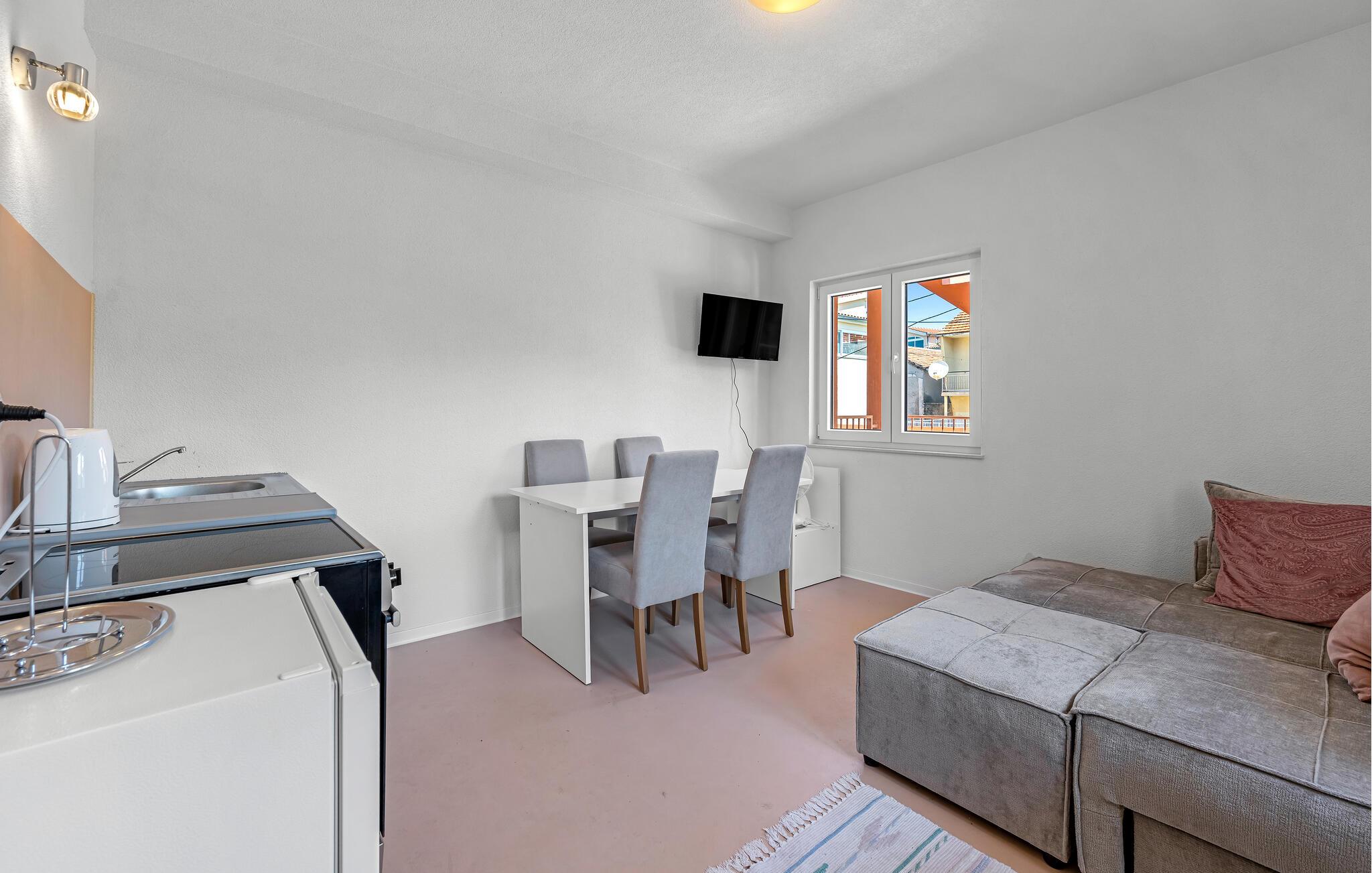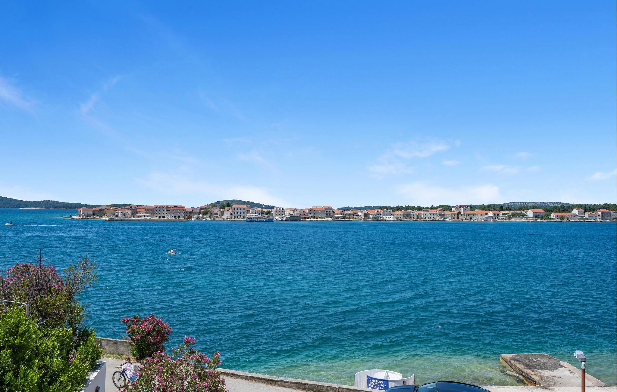 Denne lyse og smagfulde ferielejlighed ligger så tæt på stranden, at I næsten vil tænke på det turkise havvand uden for jeres hoveddør som jeres badekar. Fremtryll middelhavsretter i det åbne køkken, planlæg jeres aktiviteter i den hyggelige opholdsstue, og stream en god serie på den komfortable sofa efter en solskinsdag.