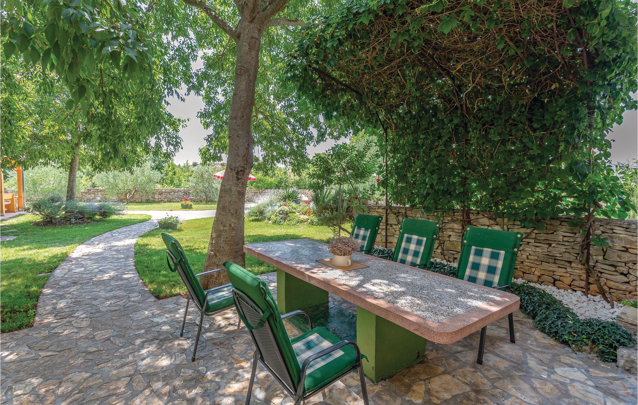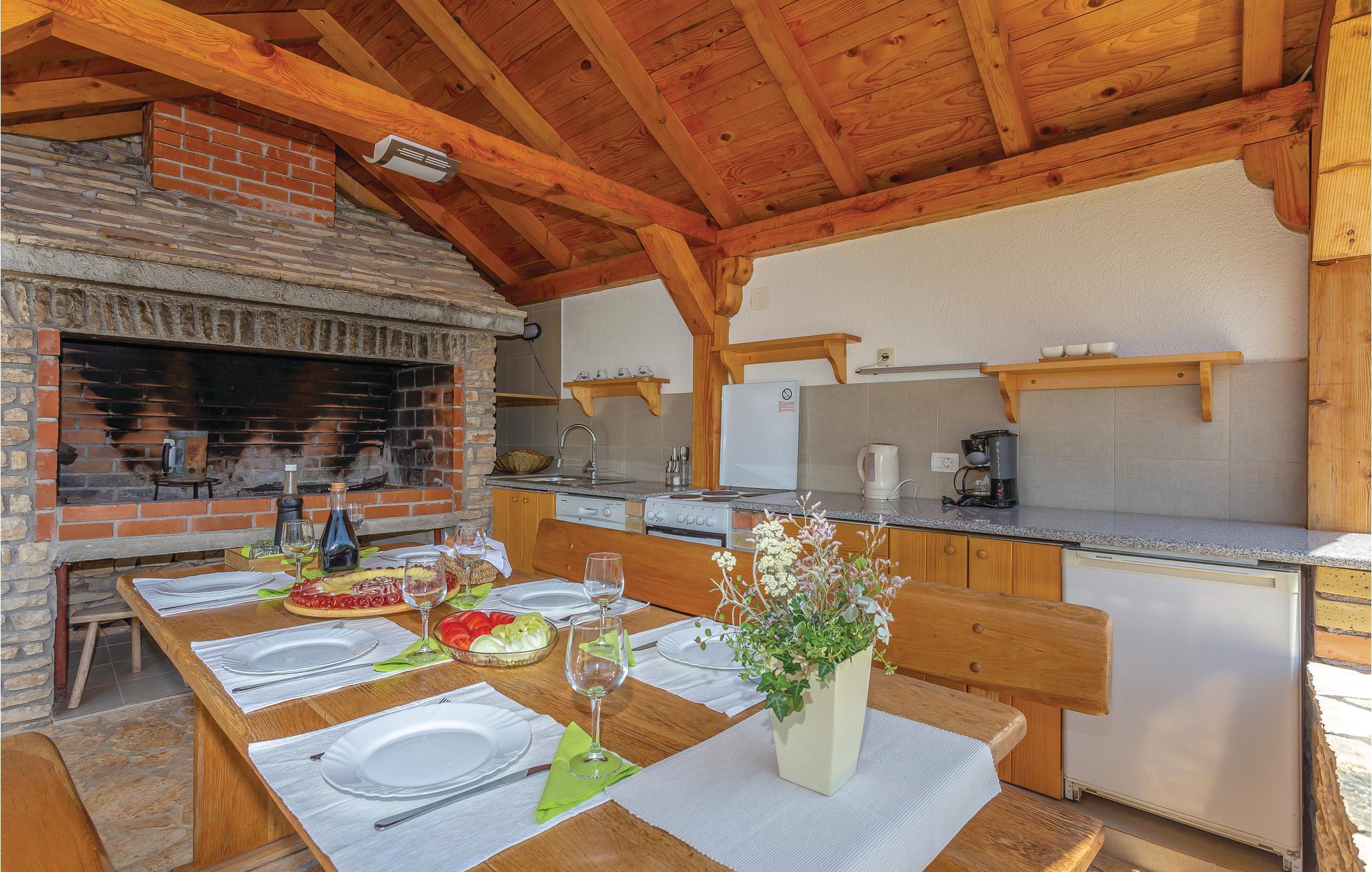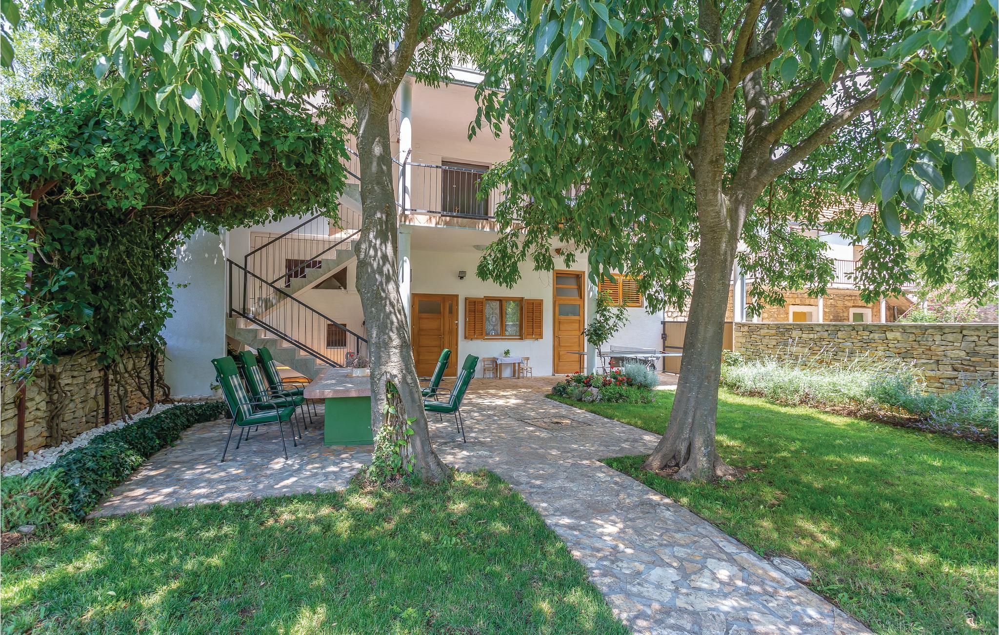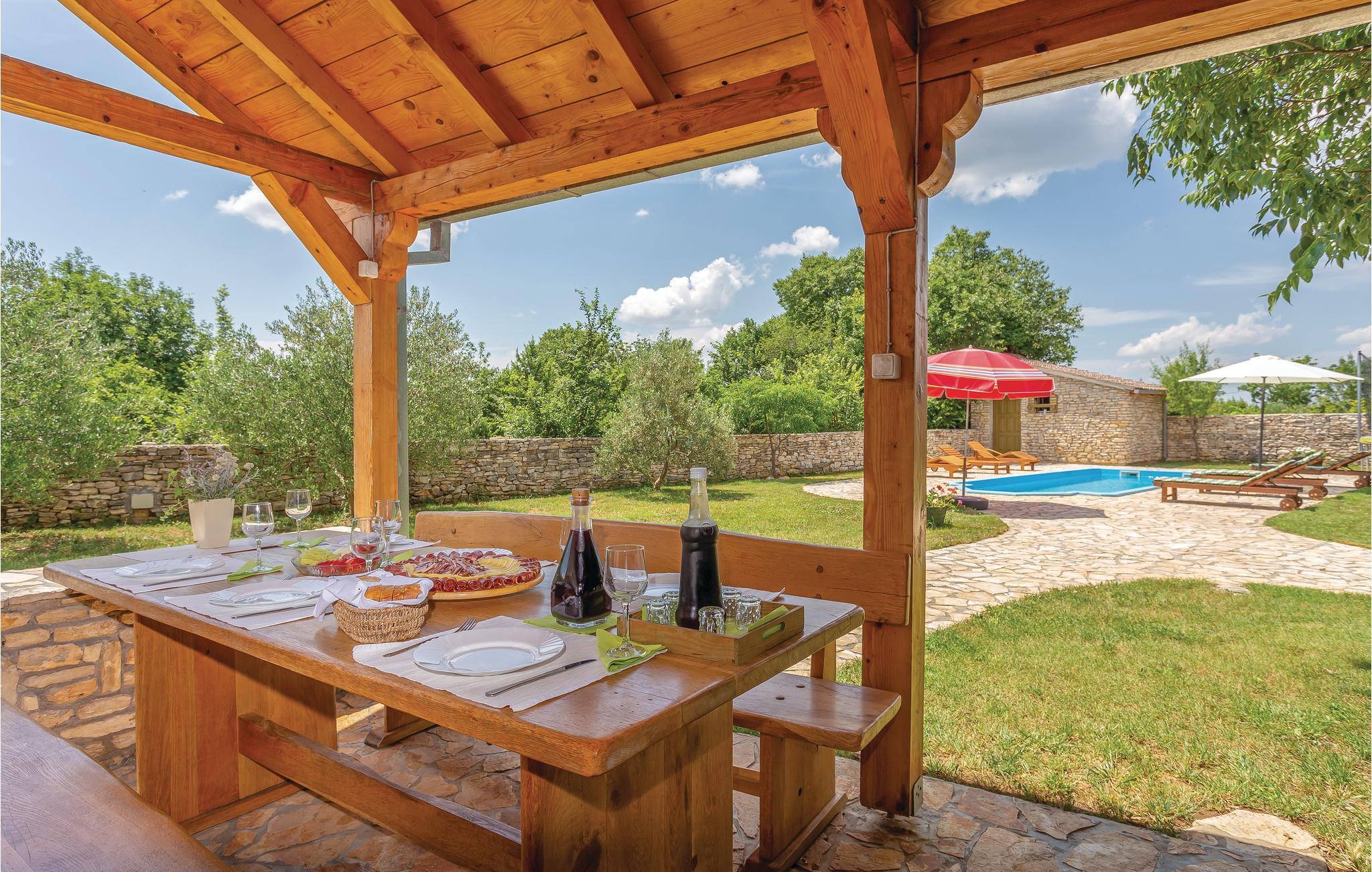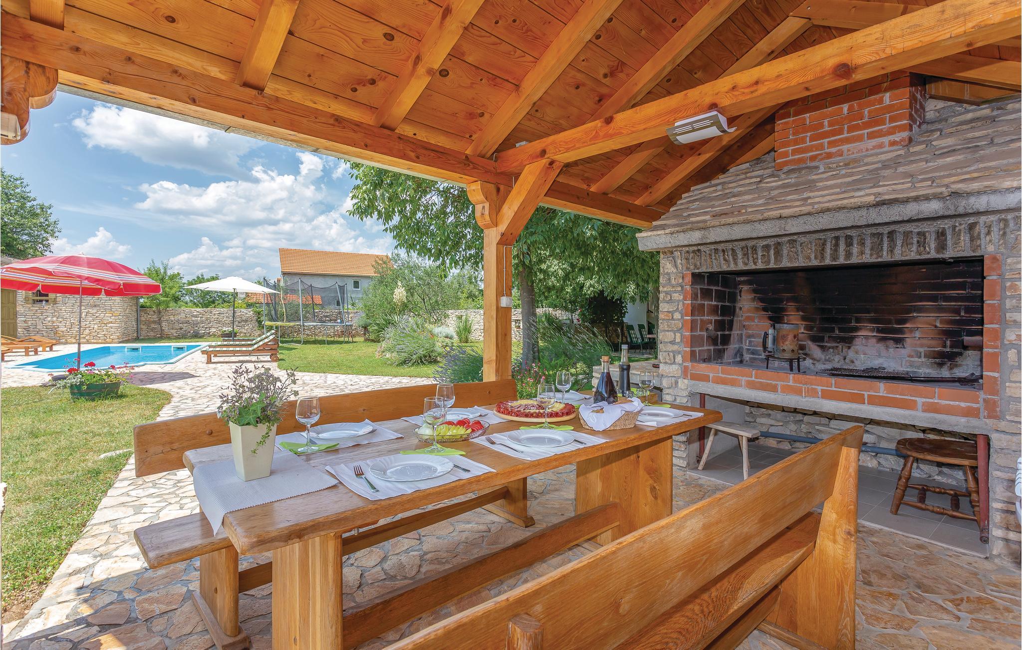 Dette dejlige feriehus består af to etager, der er forbundet af en udvendig trappe. Der er ikke vindue i soveværelse 3 - se skitsen. Foruden den store gård med pool og pavillon er der en grillplads, hvor I kan tilberede aftensmaden med lækre lokale specialiteter. Huset er omgivet af en have, hvor I må plukke sæsonens frugt. I må også gerne arbejde med ved oliven-, kirsebær- og mandelhøsten, som ejeren organiserer. Den lille by ligger 5 km fra nationalparken Krka, som I kan nå på cykel. Husejeren stiller gerne cykler til rådighed.